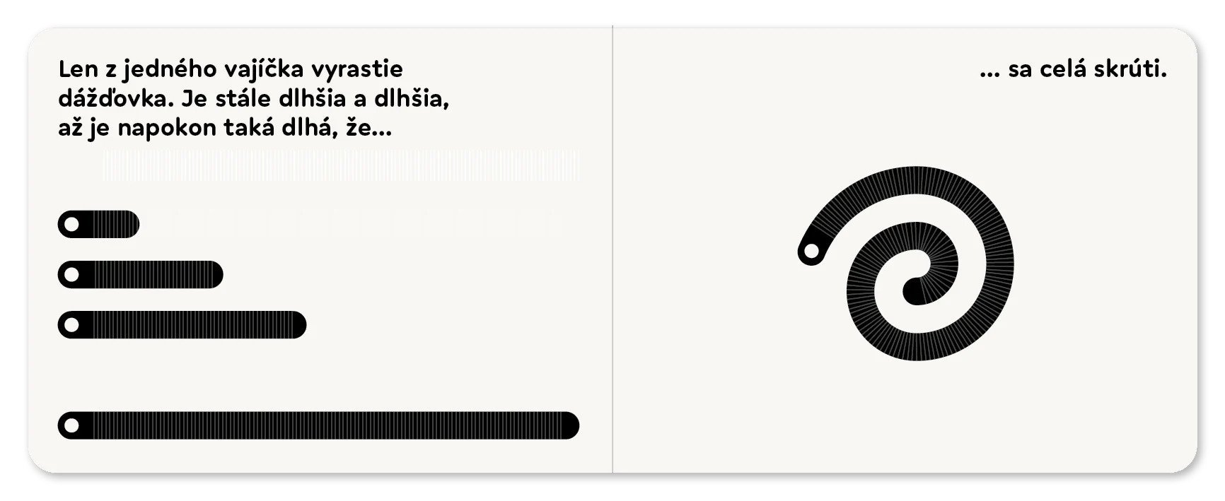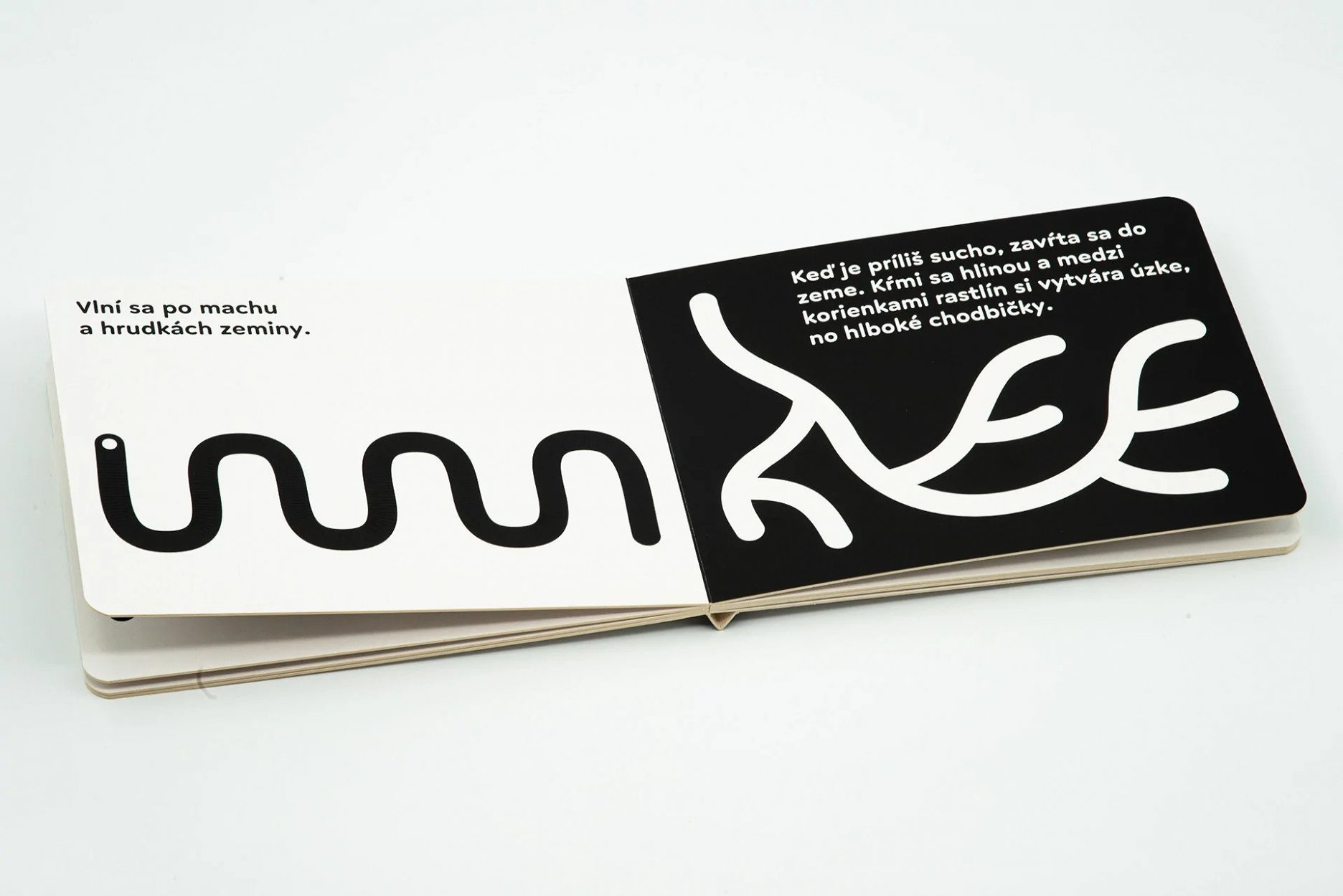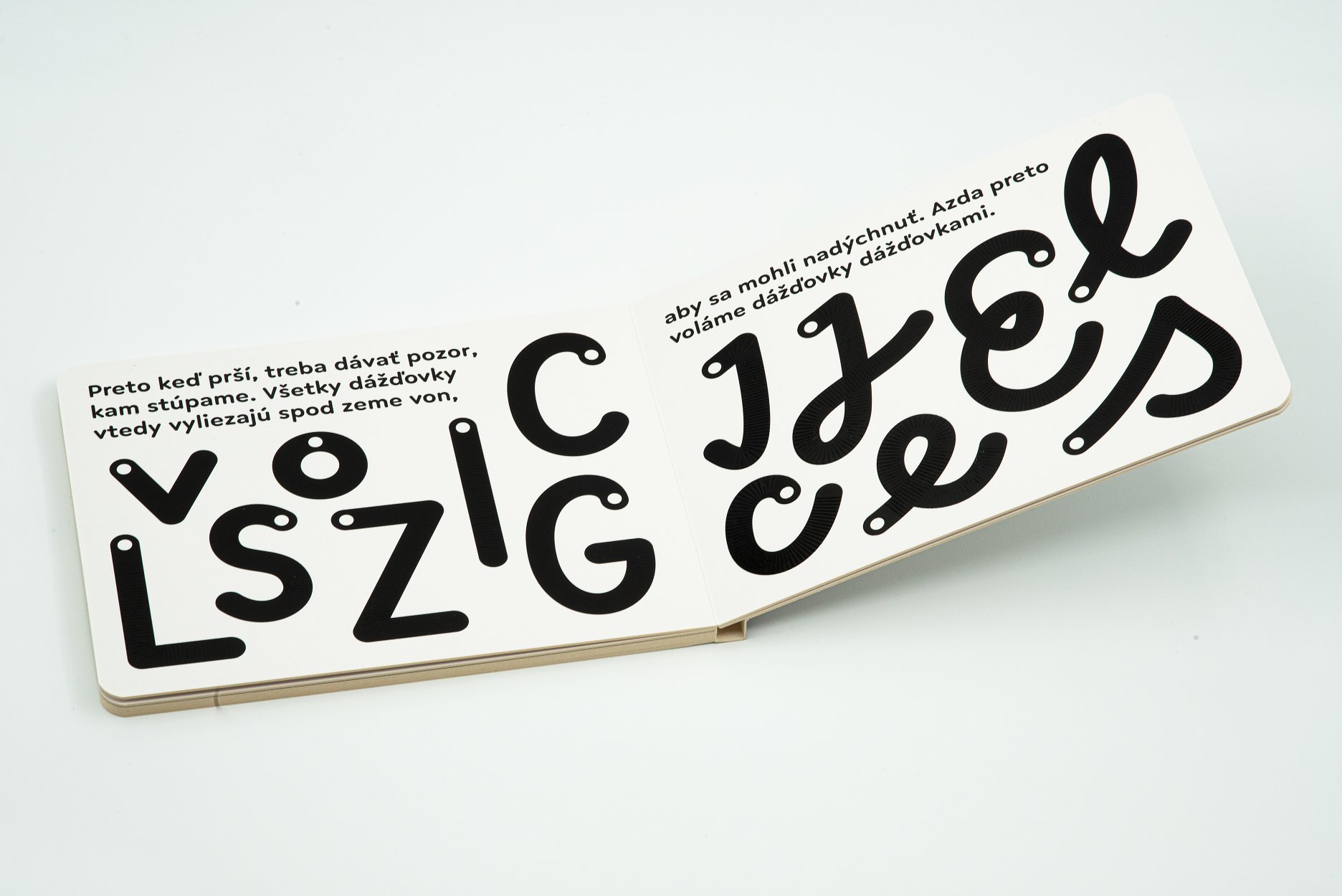 Príbeh o tom, ako žijú dážďovky a prečo sa vlastne nazývajú dážďovkami. Prvky, ktoré knižka obsahuje sú inšpirované Montessori pomôckami a motorickými tabuľkami na rozvíjanie jemnej motoriky. Najmenšie deti sa zoznámia s prvými písmenami a ich tvarmi. Stačí prstom či dvoma jemne ťahať po dážďovkách. Ich povrch vytvára pri nadmernom tlaku určitý odpor. Knižka je určená pre viaceré vekové kategórie. Bábätká, ktoré vnímajú len čiernu a bielu farbu a obľubujú geometrické tvary. Deti od približne tretieho roku života, ktoré sa spontánne zaujímajú o písanie a čítanie. Väčšie deti predškolského až školského veku, ktoré už písanie cielene trénujú. Okrem toho je samotný príbeh vhodný pre začínajúcich čitateľov. Textu nie je veľa, a keď deti dokážu prečítať celú knižku, dodá im to odvahu i motiváciu.
