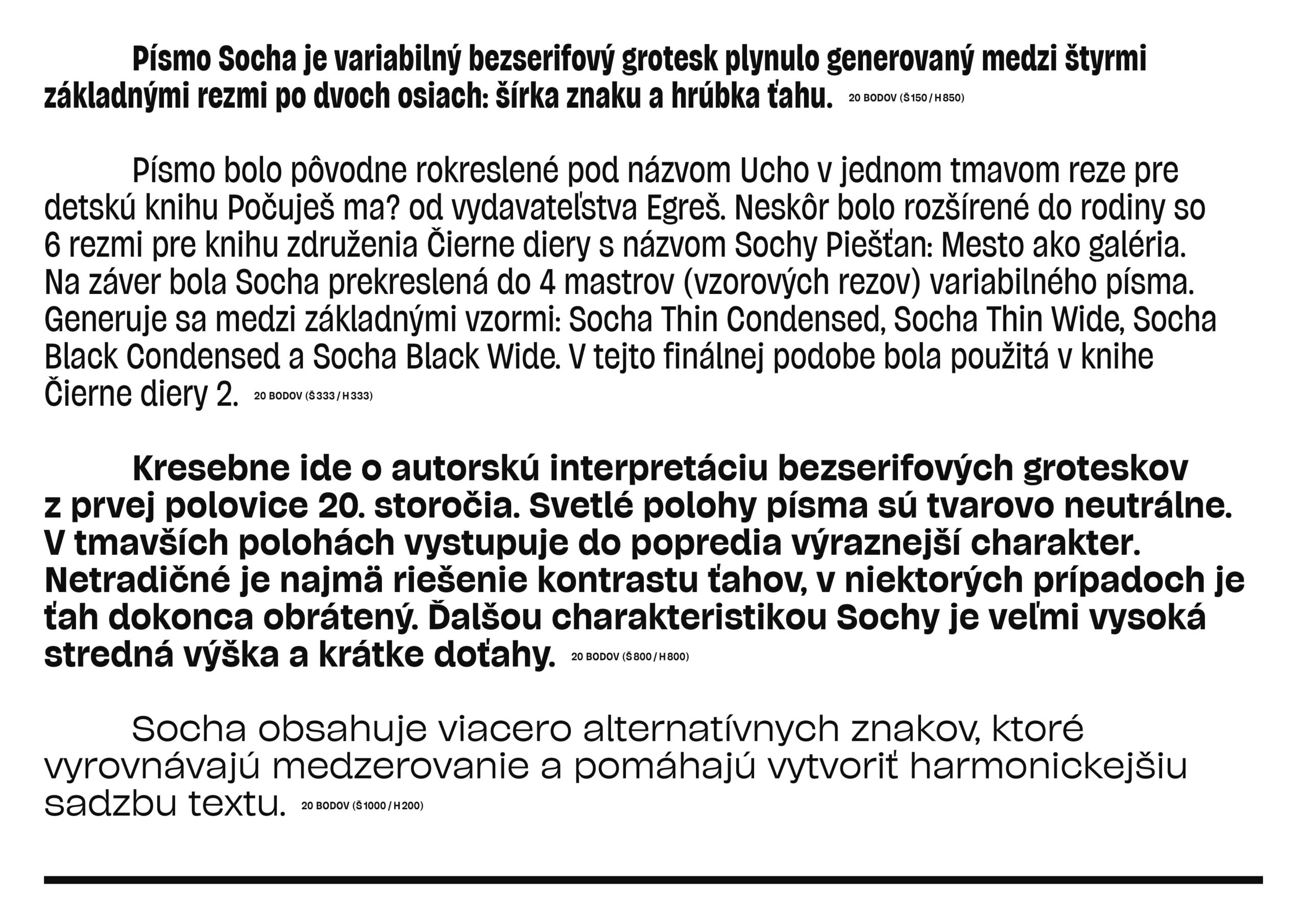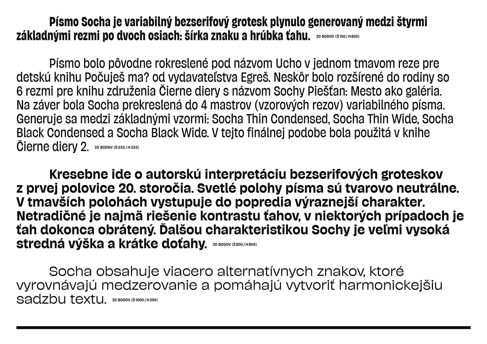 Socha je variabilné písmo generované medzi štyrmi základnými rezmi po dvoch osiach - šírka znaku a hrúbka ťahu. Písmo bolo pôvodne nakreslené pod názvom Ucho v jednom reze pre detskú knihu. Neskôr bolo rozšírené na 6 rezov pre knihu Sochy Piešťan: Mesto ako galéria. Na záver bolo prekreslené do 4 mastrov variabilného písma. V tejto podobe bolo použité v knihe Čierne diery 2. Socha je autorská interpretácia bezserifových groteskov z prvej polovice 20. storočia. Svetlé rezy sú tvarovo neutrálne. V tmavších vystupuje do popredia výraznejší charakter. Netradičné je riešenie kontrastu ťahov, niekde je ťah obrátený. Socha má vysokú strednú výšku a krátke doťahy. Obsahuje viacero alternatívnych znakov, ktoré pomáhajú vytvoriť harmonickejšiu sadzbu textu.