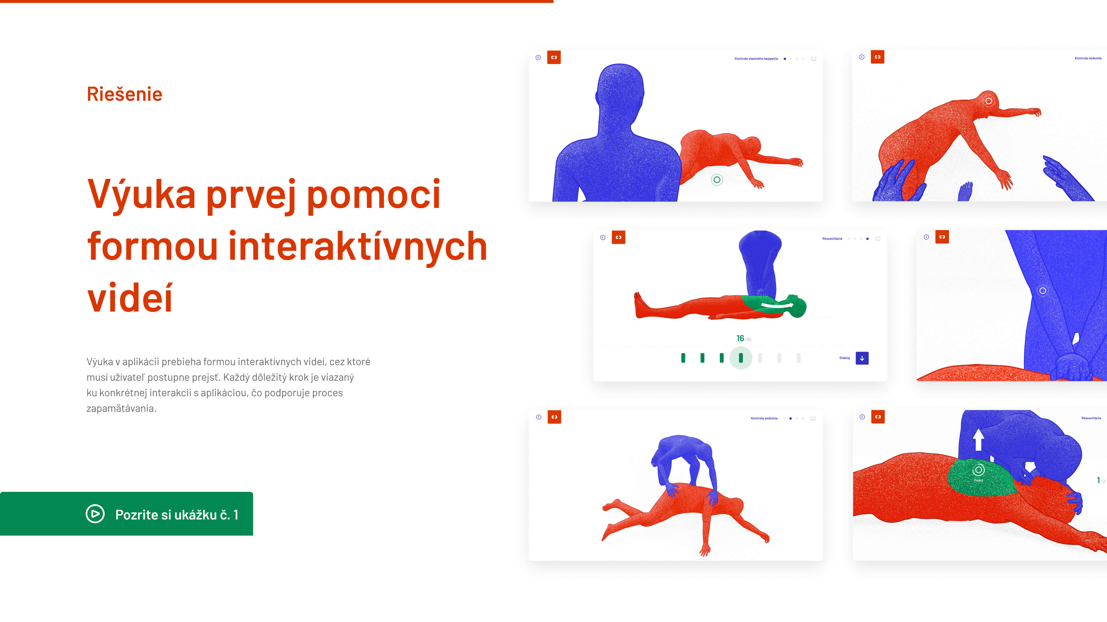 Prvú pomoc, aj napriek jej životnej dôležitosti, ovláda na Slovensku len 5% ľudí. Cieľom tejto bakalárskej práce bolo preto nájsť spôsob, ako lepšie vyučovať, motivovať a pomôcť ľuďom k získaniu znalostí o prvej pomoci v interaktívnom online prostredí. Pre tento cieľ navrhol Adrián Gubrica interaktívnu online aplikáciu, založenú na výuke formou interaktívnych videí, ktorú dopĺňajú moderné gamifikačné a microlearningové prvky. Súčasťou riešenia je aj adaptívna mobilná aplikácia, ktorá slúži ako rýchla pomoc. Celú aplikáciu zastrešuje logo v tvare ohnivka, inšpirované citátom „Záchranná reťaz je len tak silná, ako jej najslabšie ohnivko,“ ktoré najlepšie vystihuje zmysel prvej pomoci. Aplikácia bola navrhnutá na základe užívateľského výskumu a rozhovorov s odborníkmi z oblasti záchranných služieb.