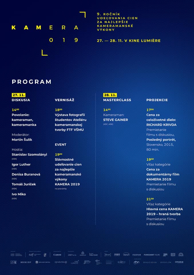 Cenu KAMERA 2019 za najlepší kameramanský výkon organizuje raz za dva roky Asociácia slovenských kameramanov (ASK). Program podujatia sa začal 27. novembra a potrvá do nasledujúceho dňa v Kine Lumière.