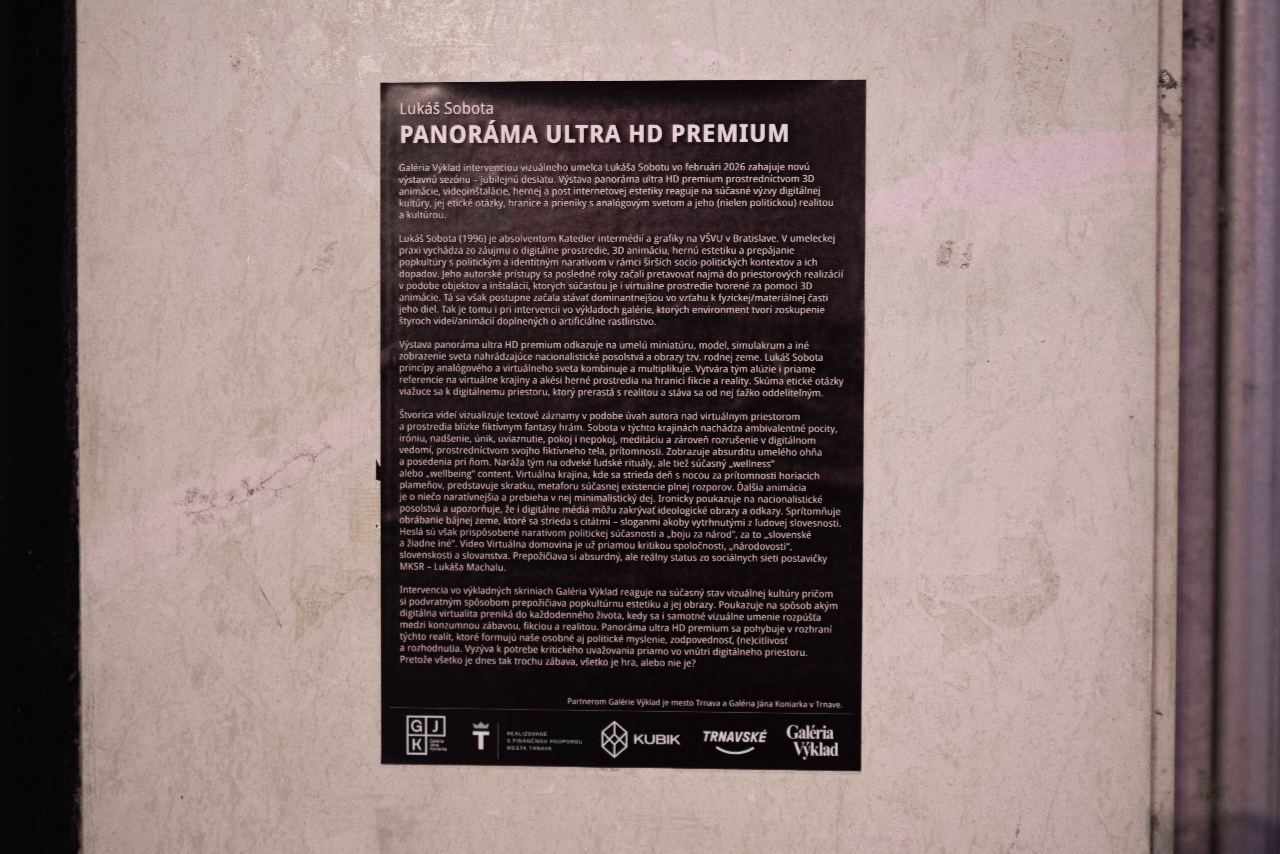 Galéria Výklad intervenciou vizuálneho umelca Lukáša Sobotu vo februári 2026 zahájila novú výstavnú sezónu – jubilejnú desiatu. Výstava panoráma ultra HD premium prostredníctvom 3D animácie, videoinštalácie, hernej a postinternetovej estetiky reaguje na súčasné výzvy digitálnej kultúry, jej etické otázky, hranice a prieniky s analógovým svetom a jeho (nielen politickou) realitou a kultúrou.