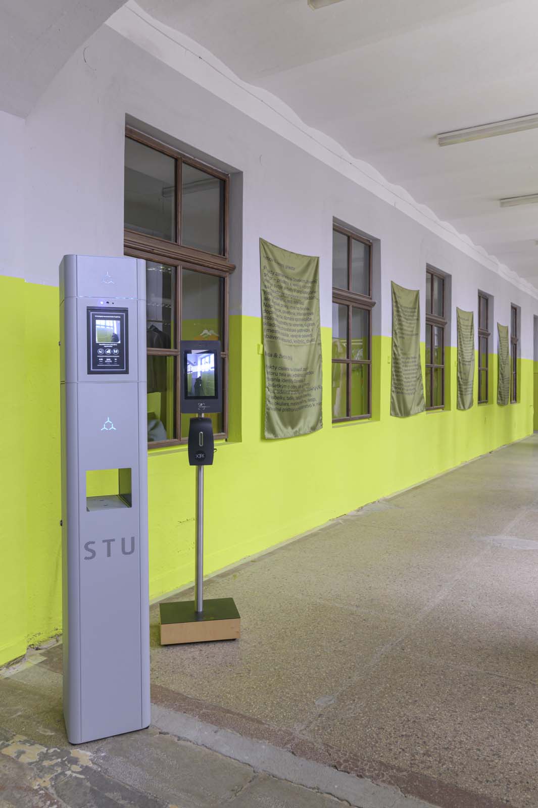 Inovatívne zariadenie na epidemiologickú prevenciu určené pre miesta s hromadným výskytom osôb, ktoré vďaka inovatívnym technológiám nahrádza chemické dezinfekčné procesy. Funkcie modulárneho dezinfekčného stojana sú škálovateľné (senzoricky riadená bezdotyková dezinfekcia rúk a vzduchu inovatívnymi technológiami, meranie teploty osôb, informačná funkcia) a boli navrhnuté s dôrazom na dlhodobé využitie, a to vďaka vymeniteľnosti funkcií a zníženému environmentálnemu vplyvu. Projekt využíva diamantové nanotechnológie na elektrolýzu vody a fotokatalýzu vzduchu. Projekt je výsledkom interdisciplinárnej spolupráce Fakulty architektúry a dizajnu a Fakulty elektrotechniky a informatiky Slovenskej technickej univerzity a iniciatívy COVID COLAB.