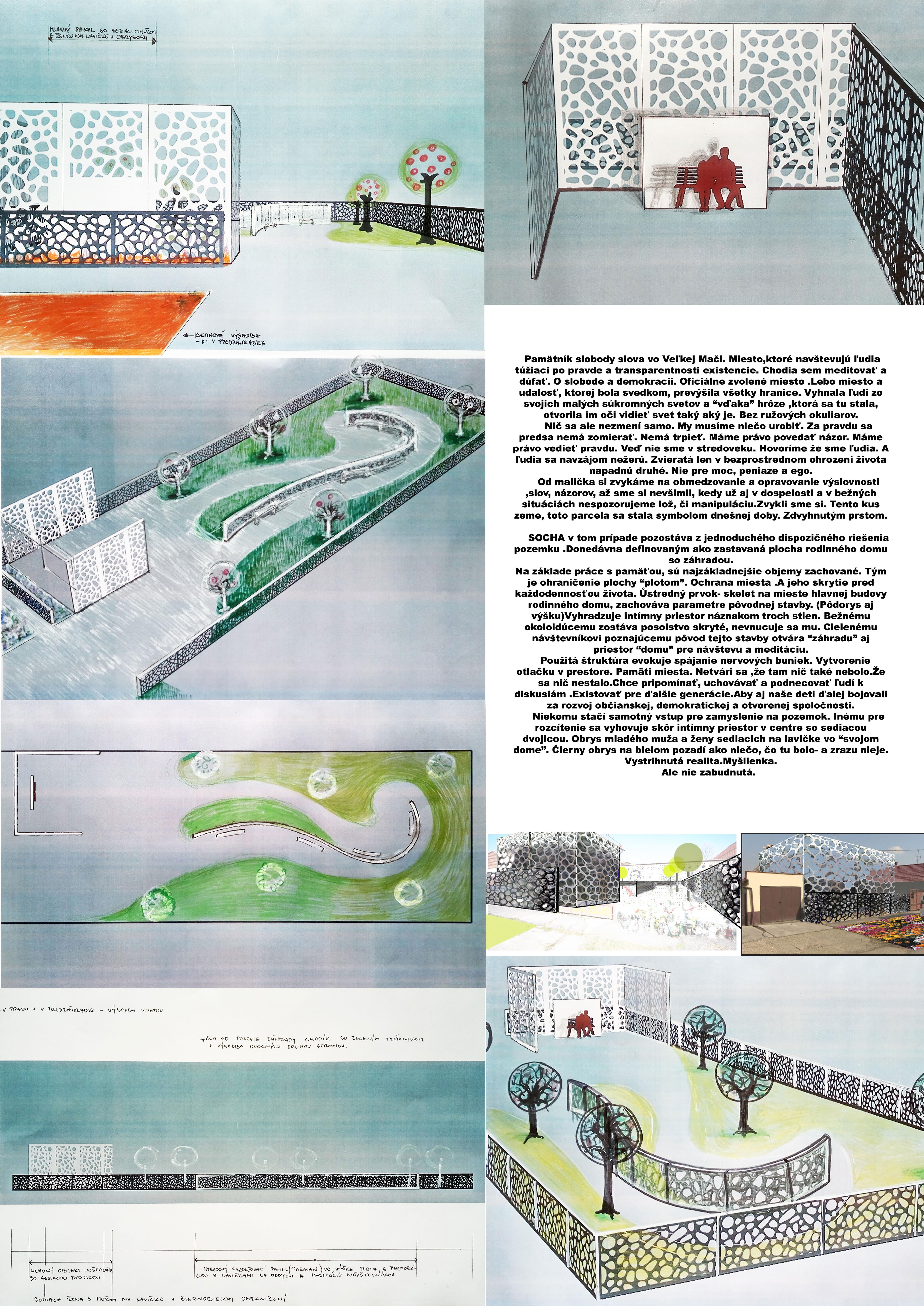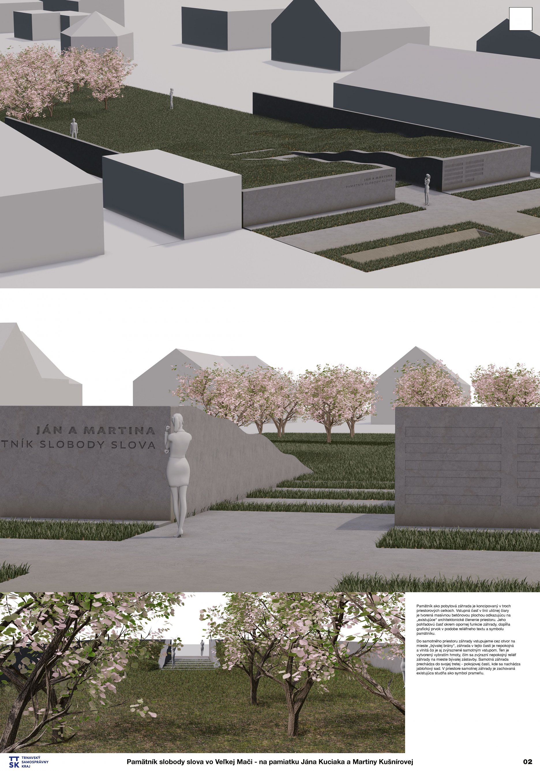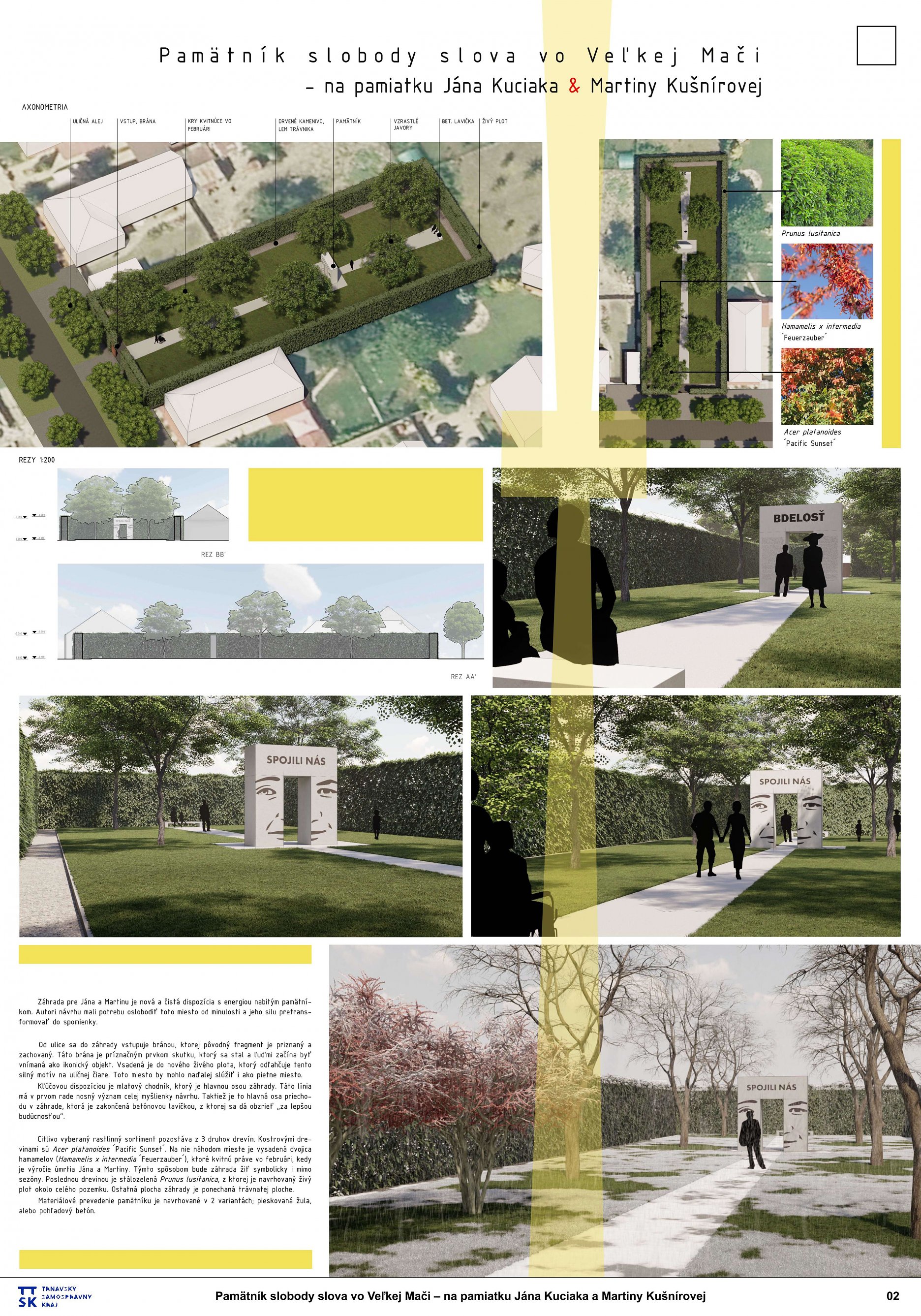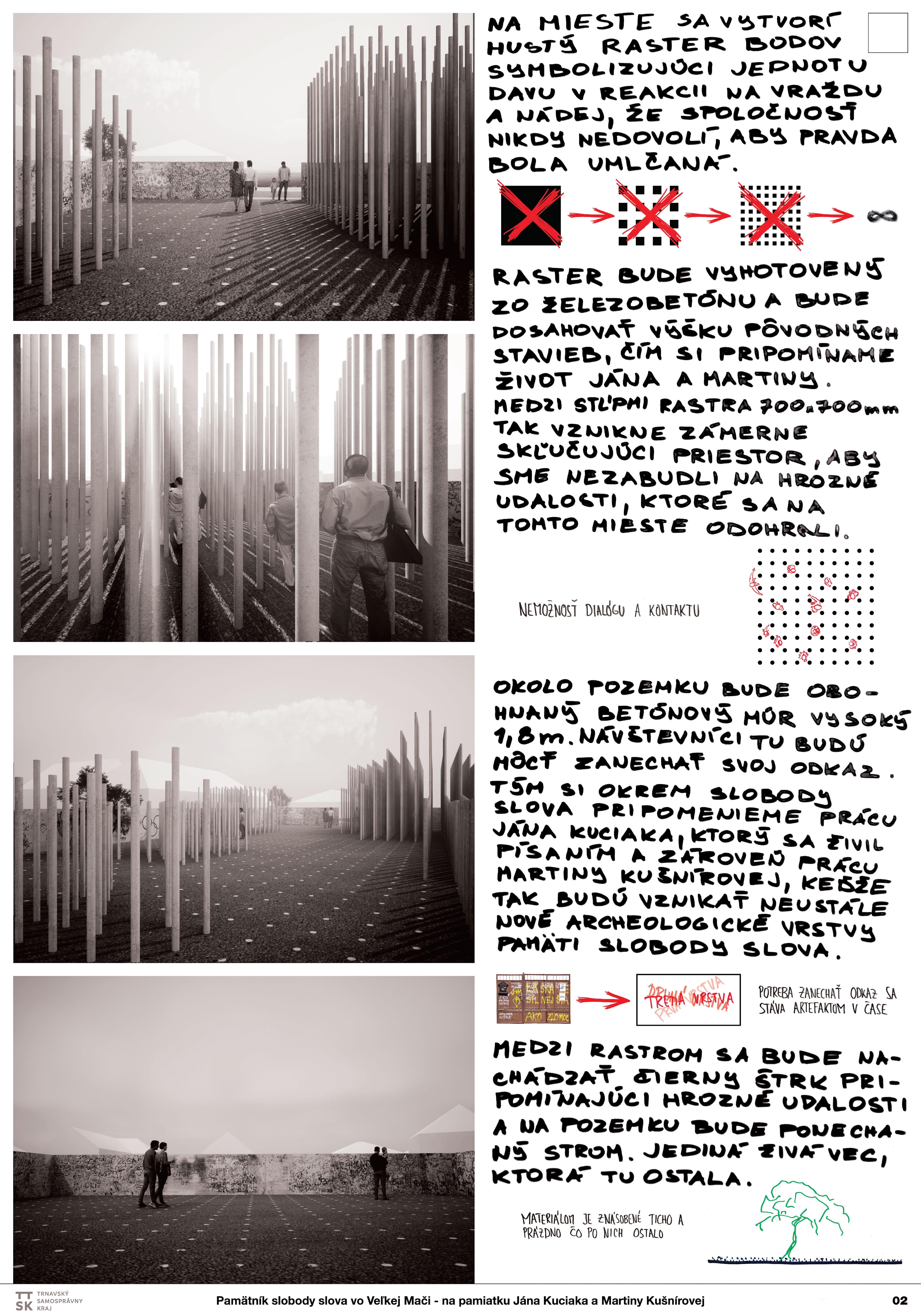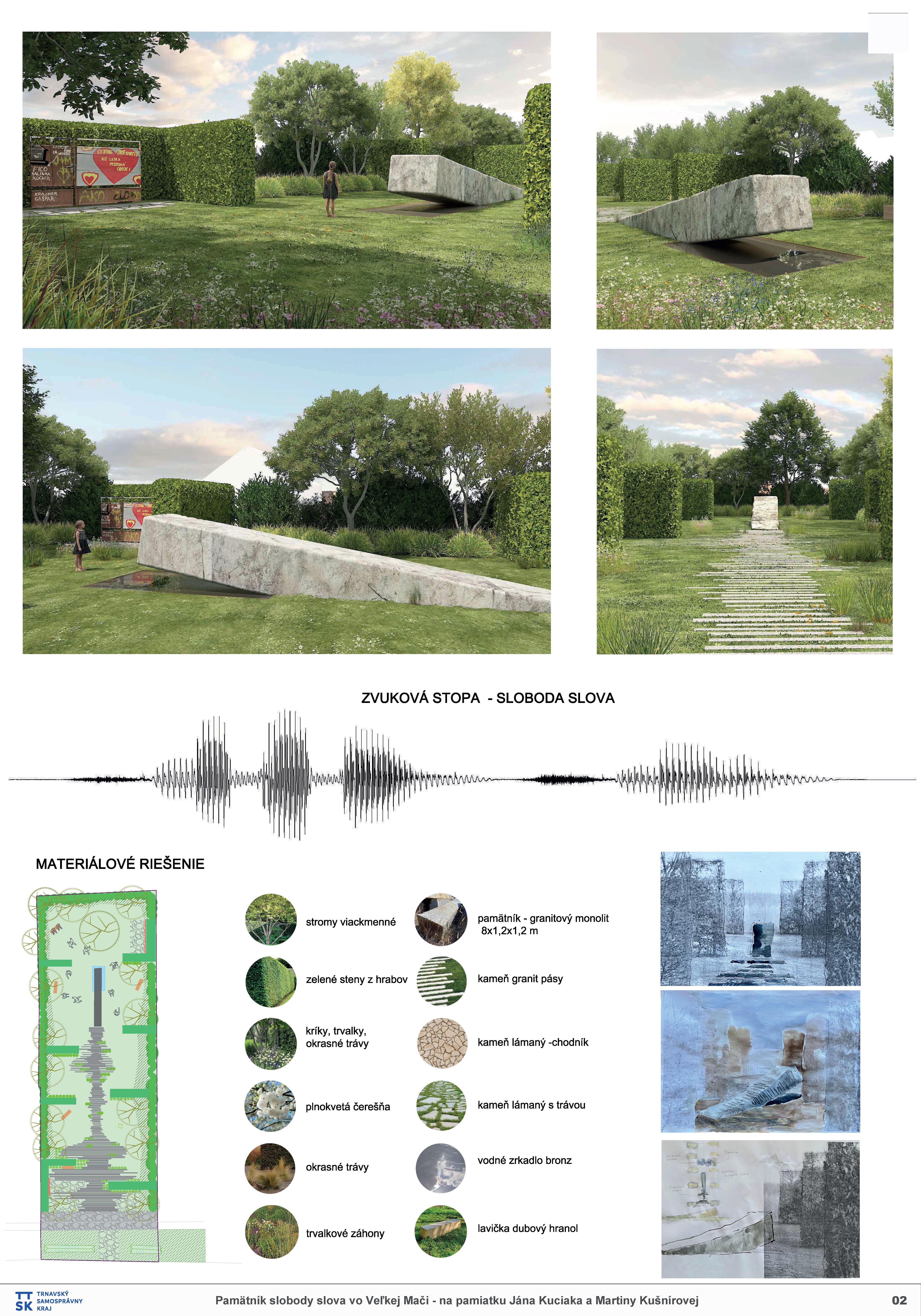 Návrh používa viacero motívov k stvárneniu pamätníka pričom najvýraznejší je zhmotnením audio stopy slov “sloboda slova” do tvaru chodníka, ktorý ústi do granitového bloku. Prítomnosť vody pod blokom vizuálne odľahčuje ťaživý moment padnutého monumentu. Pozitívne je vnímaná práca s otvorenosťou a prehľadnosťou prírodného priestoru. Nelogická sa však javí kompozícia zelene, ktorá rigidne a formálne v segmentoch živého plota priestor člení stenami. Umiestnenie pôvodnej vstupnej brány do návrhu je vítané, no jej pozícia v rohu pozemku pôsobí náhodne a bez kontextu. Celkovo je pamätník tvorený viacerými motívmi, ktorým chýba vzájomné prepojenie.