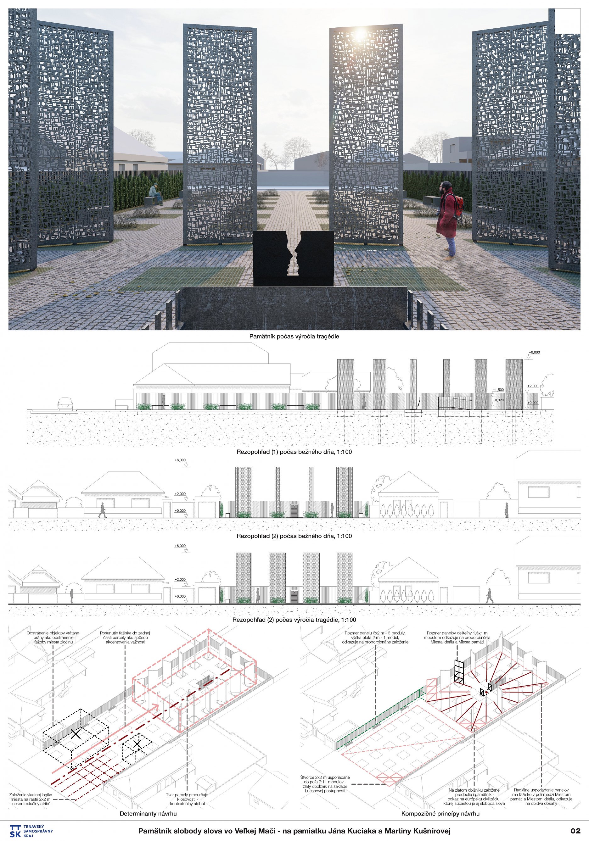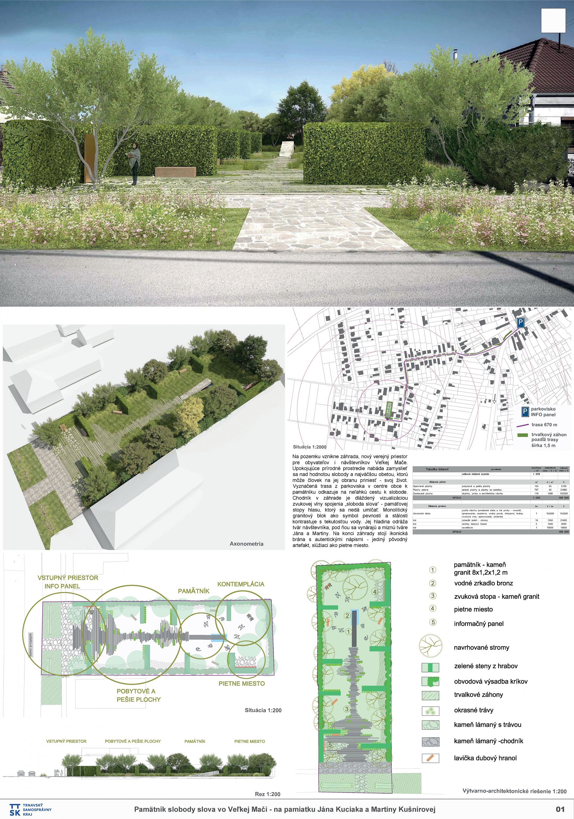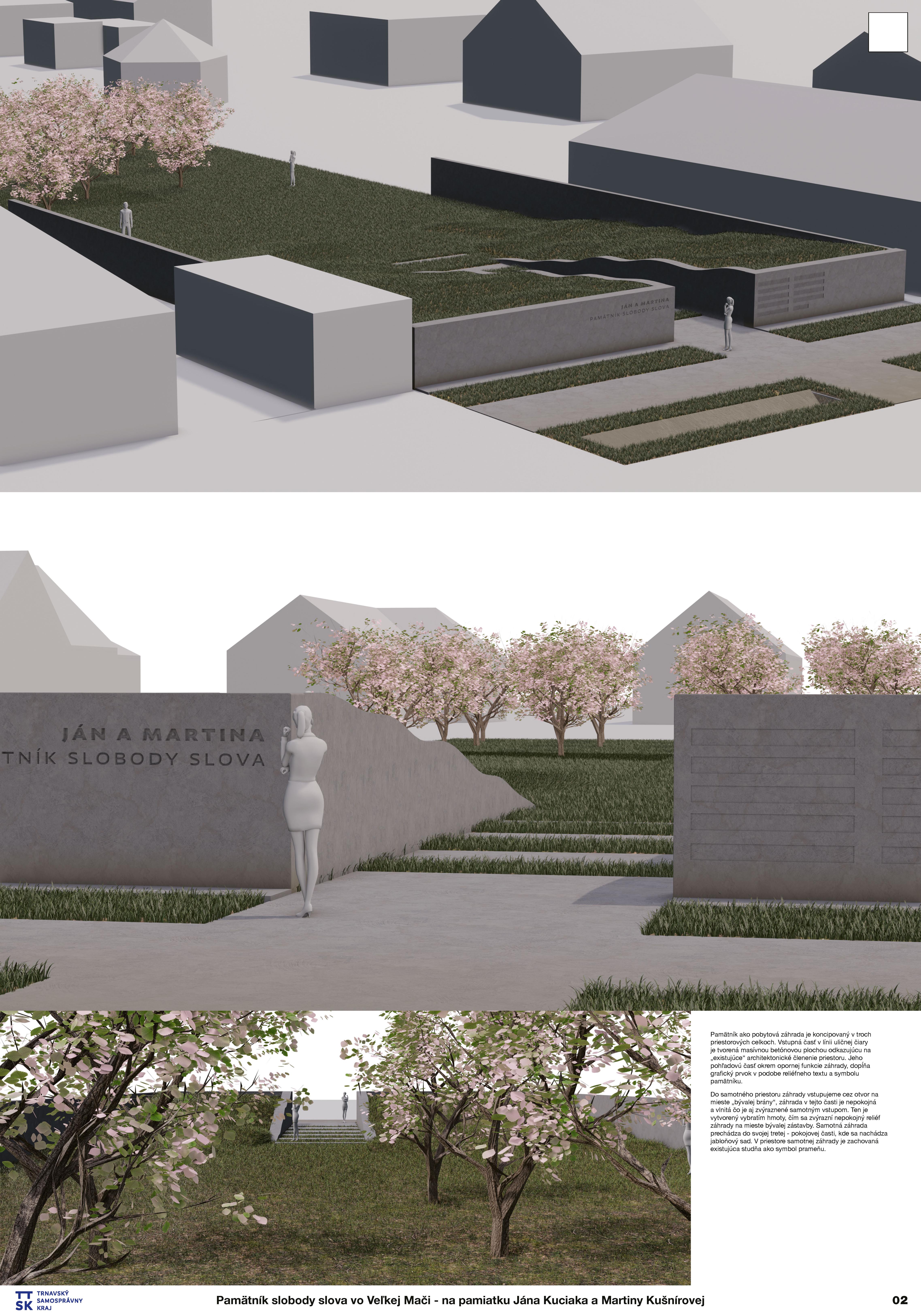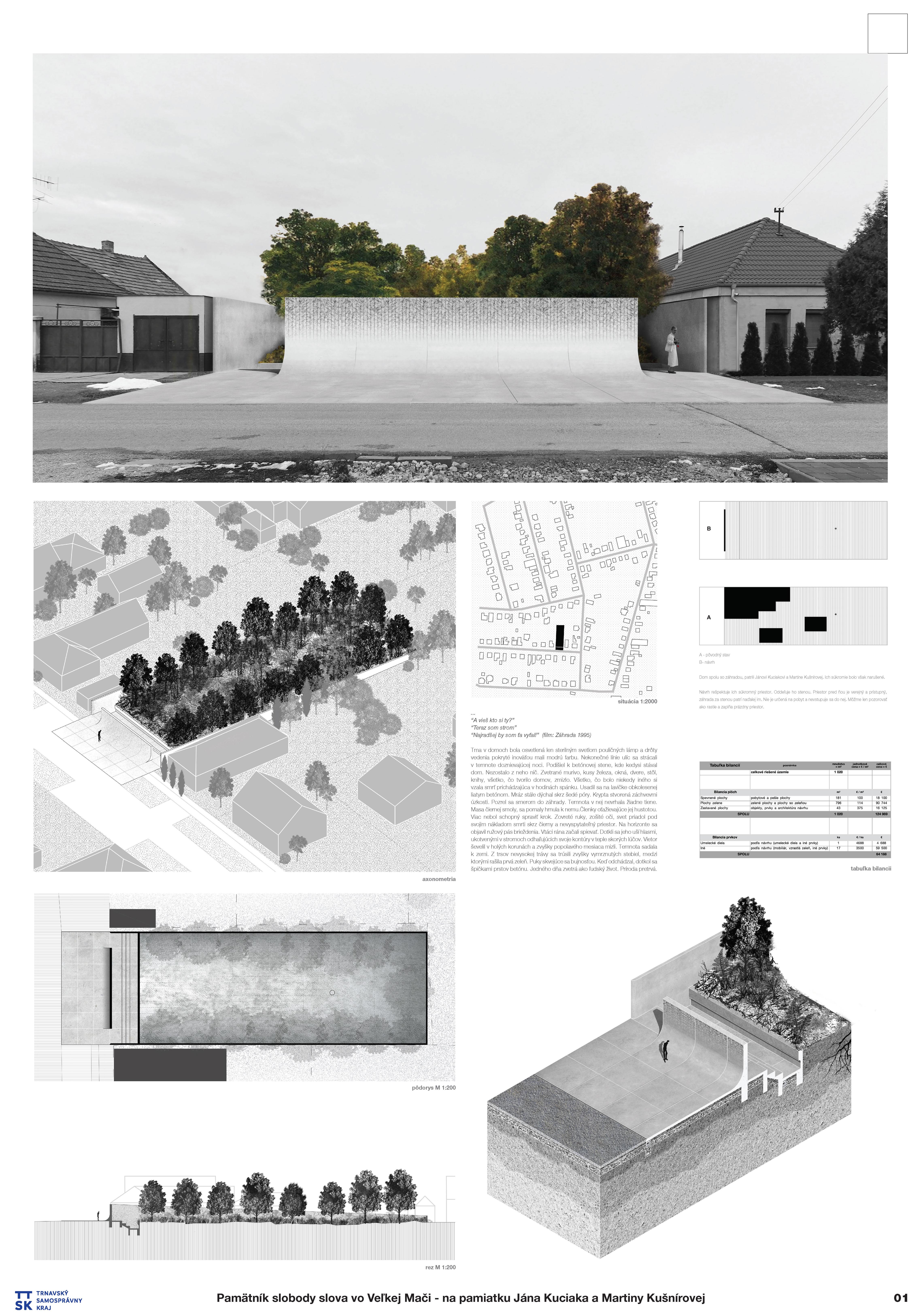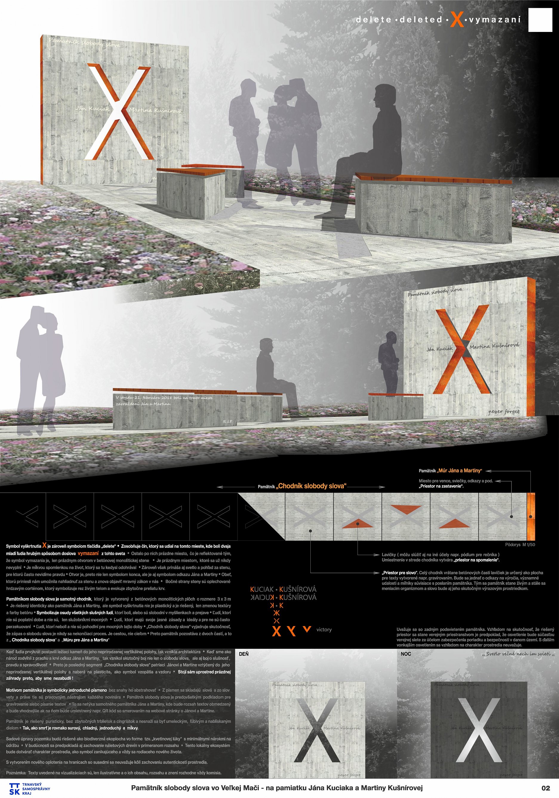 Návrh používa viacero motívov k stvárneniu pamätníka pričom najvýraznejší je zhmotnením audio stopy slov “sloboda slova” do tvaru chodníka, ktorý ústi do granitového bloku. Prítomnosť vody pod blokom vizuálne odľahčuje ťaživý moment padnutého monumentu. Pozitívne je vnímaná práca s otvorenosťou a prehľadnosťou prírodného priestoru. Nelogická sa však javí kompozícia zelene, ktorá rigidne a formálne v segmentoch živého plota priestor člení stenami. Umiestnenie pôvodnej vstupnej brány do návrhu je vítané, no jej pozícia v rohu pozemku pôsobí náhodne a bez kontextu. Celkovo je pamätník tvorený viacerými motívmi, ktorým chýba vzájomné prepojenie.