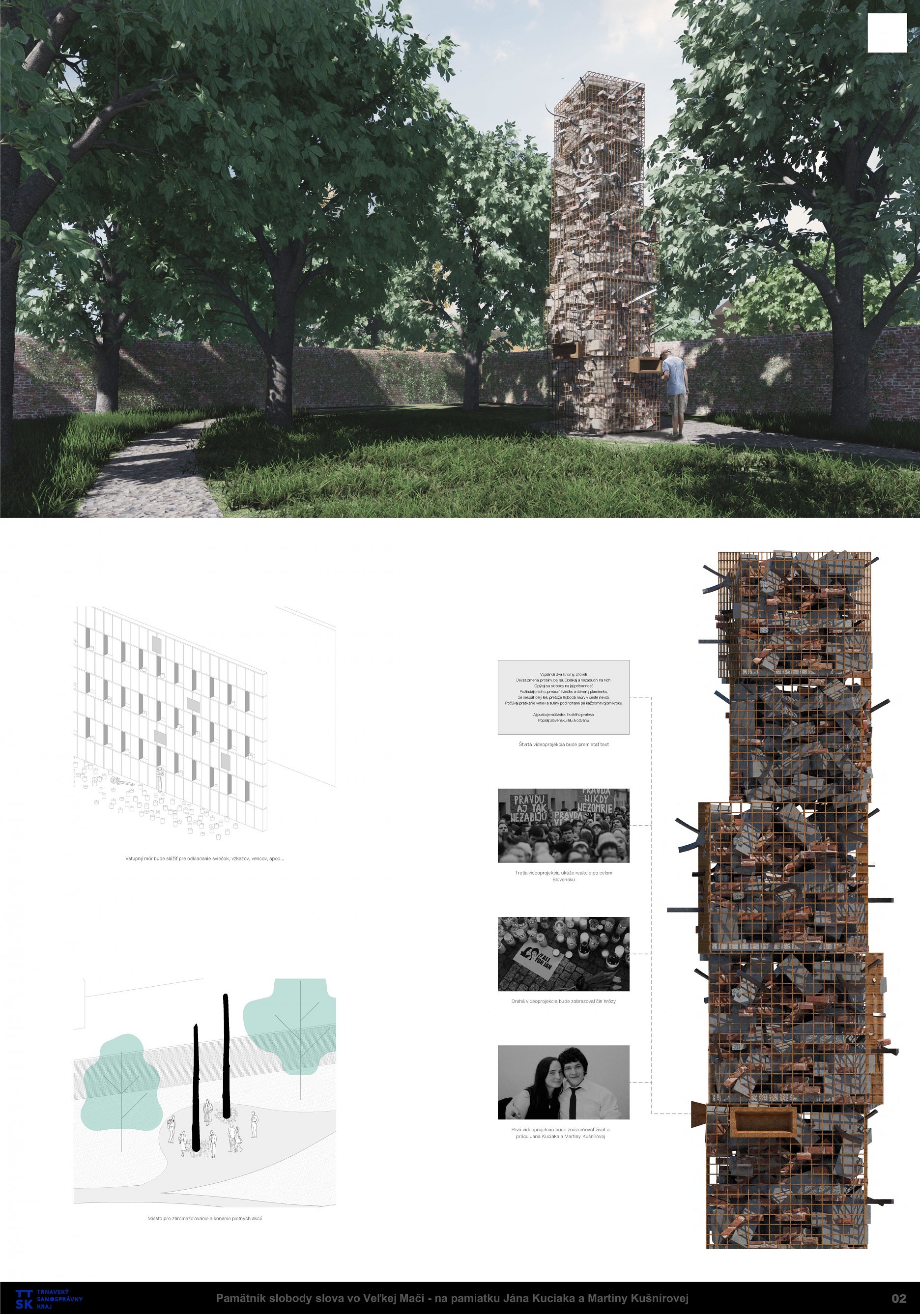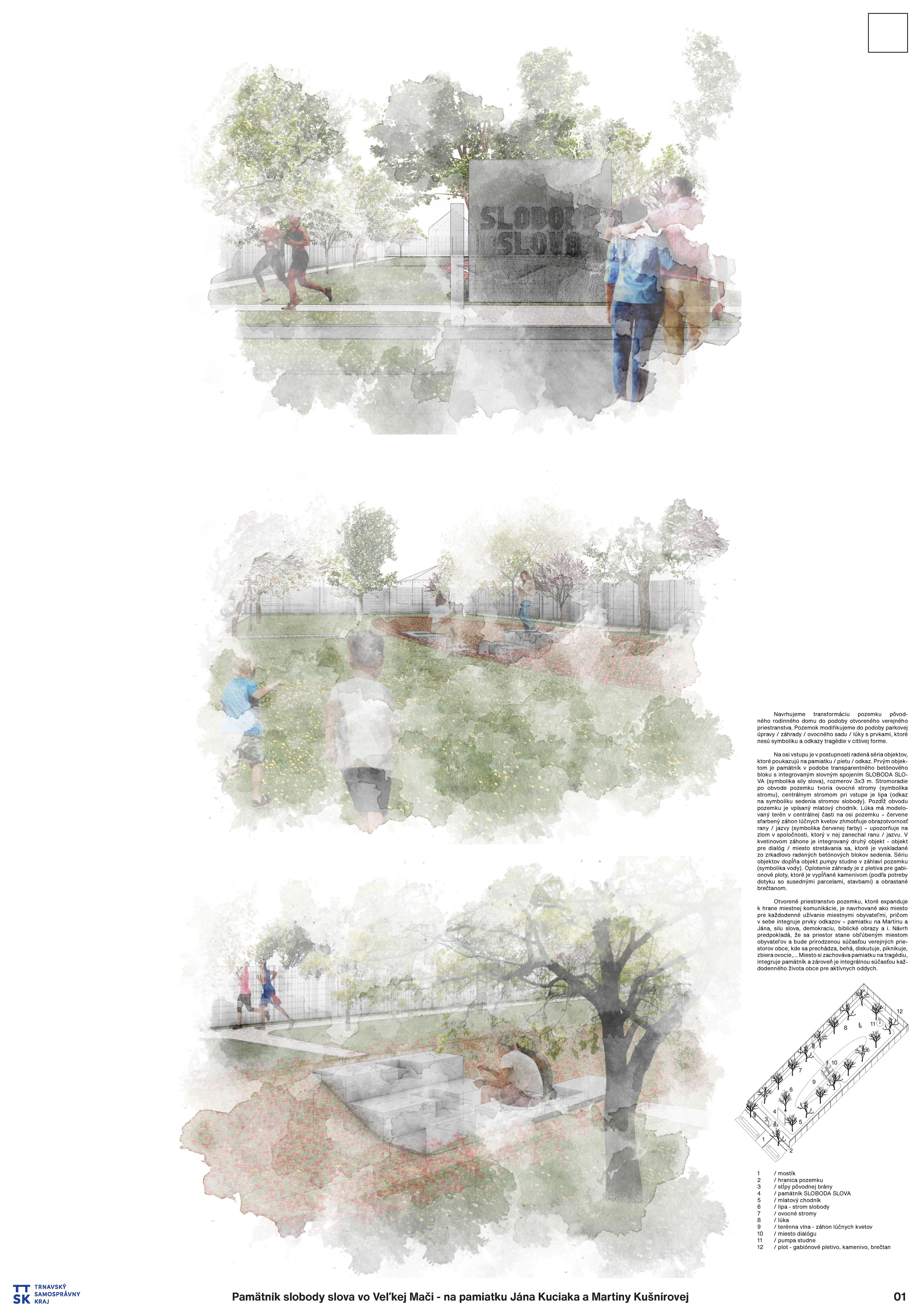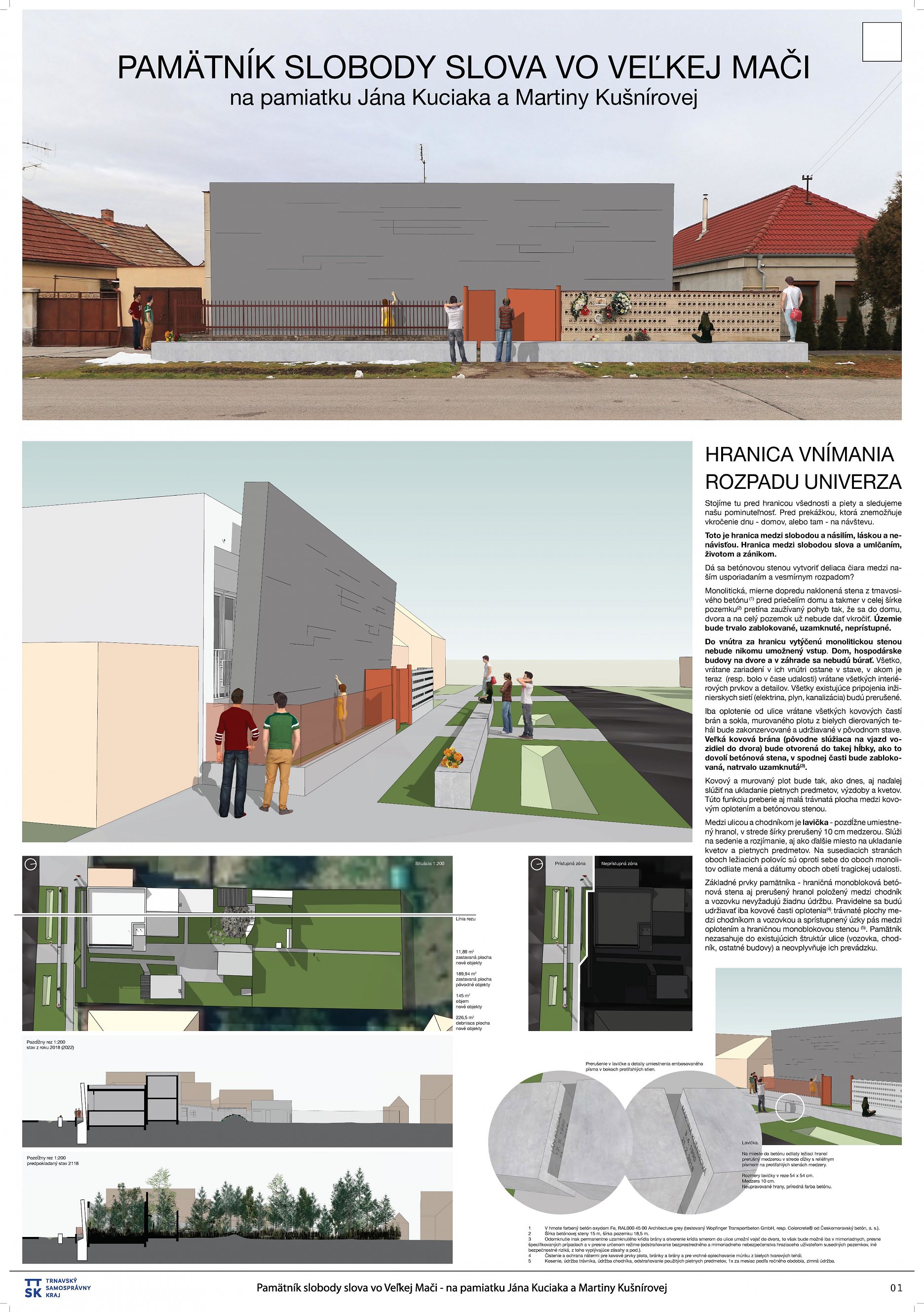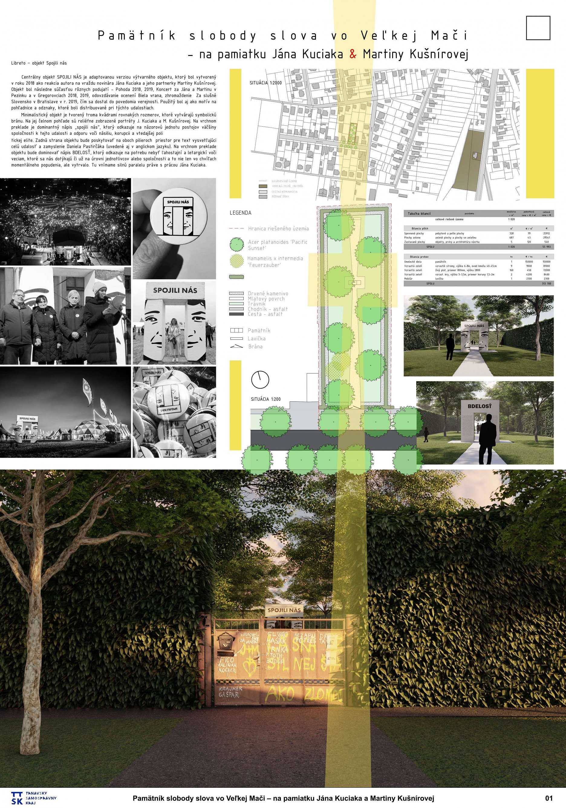 Návrh používa viacero motívov k stvárneniu pamätníka pričom najvýraznejší je zhmotnením audio stopy slov “sloboda slova” do tvaru chodníka, ktorý ústi do granitového bloku. Prítomnosť vody pod blokom vizuálne odľahčuje ťaživý moment padnutého monumentu. Pozitívne je vnímaná práca s otvorenosťou a prehľadnosťou prírodného priestoru. Nelogická sa však javí kompozícia zelene, ktorá rigidne a formálne v segmentoch živého plota priestor člení stenami. Umiestnenie pôvodnej vstupnej brány do návrhu je vítané, no jej pozícia v rohu pozemku pôsobí náhodne a bez kontextu. Celkovo je pamätník tvorený viacerými motívmi, ktorým chýba vzájomné prepojenie.