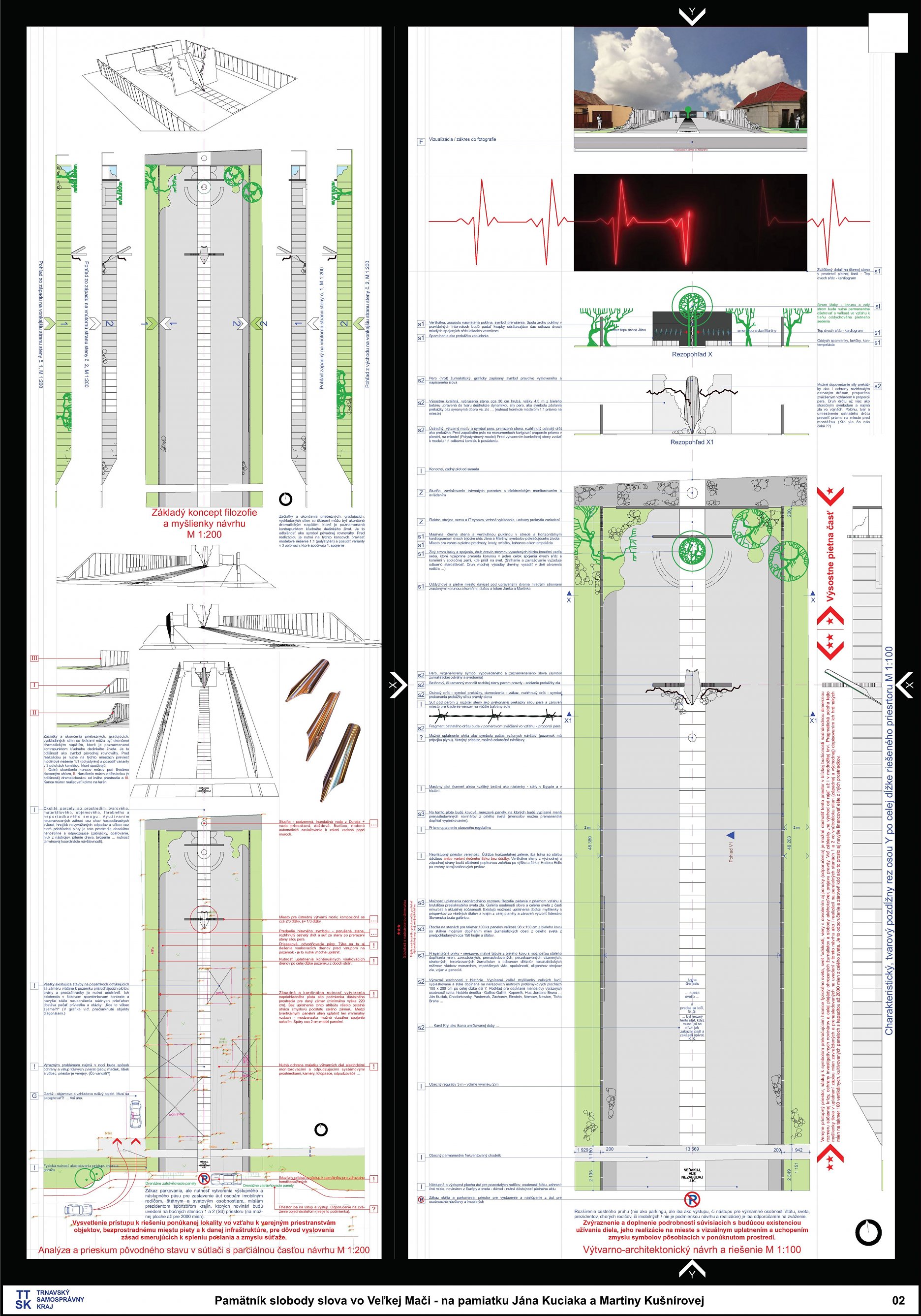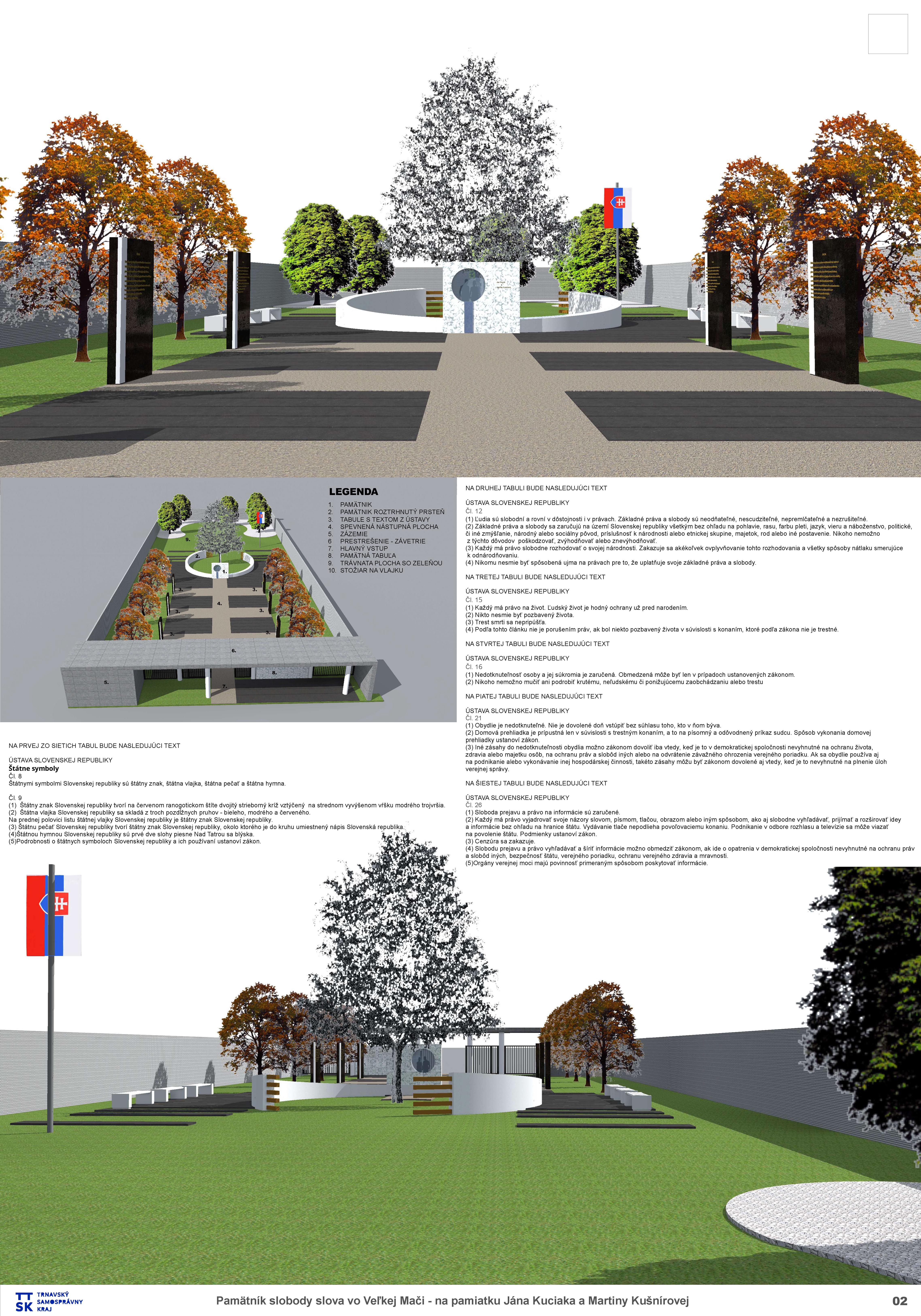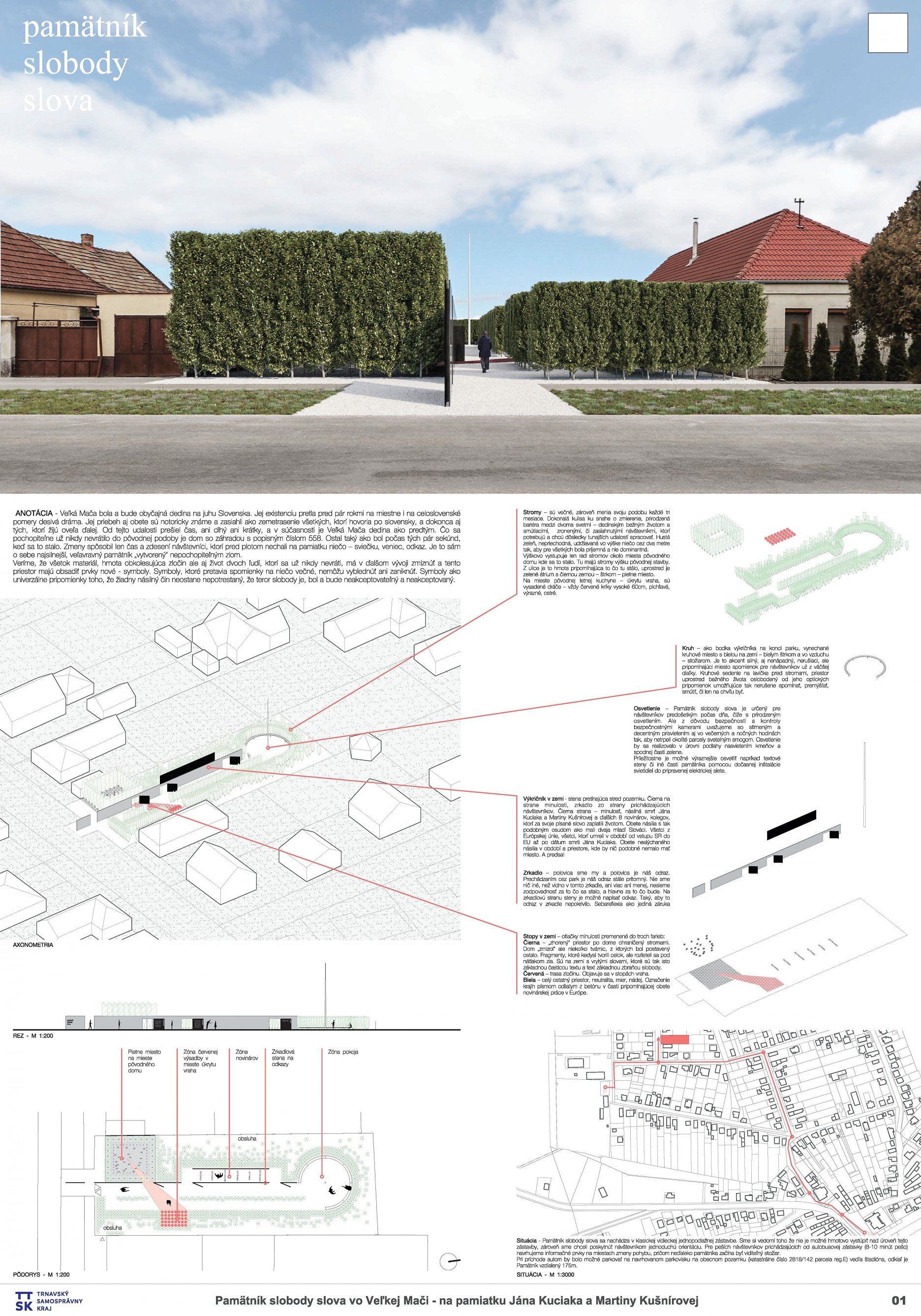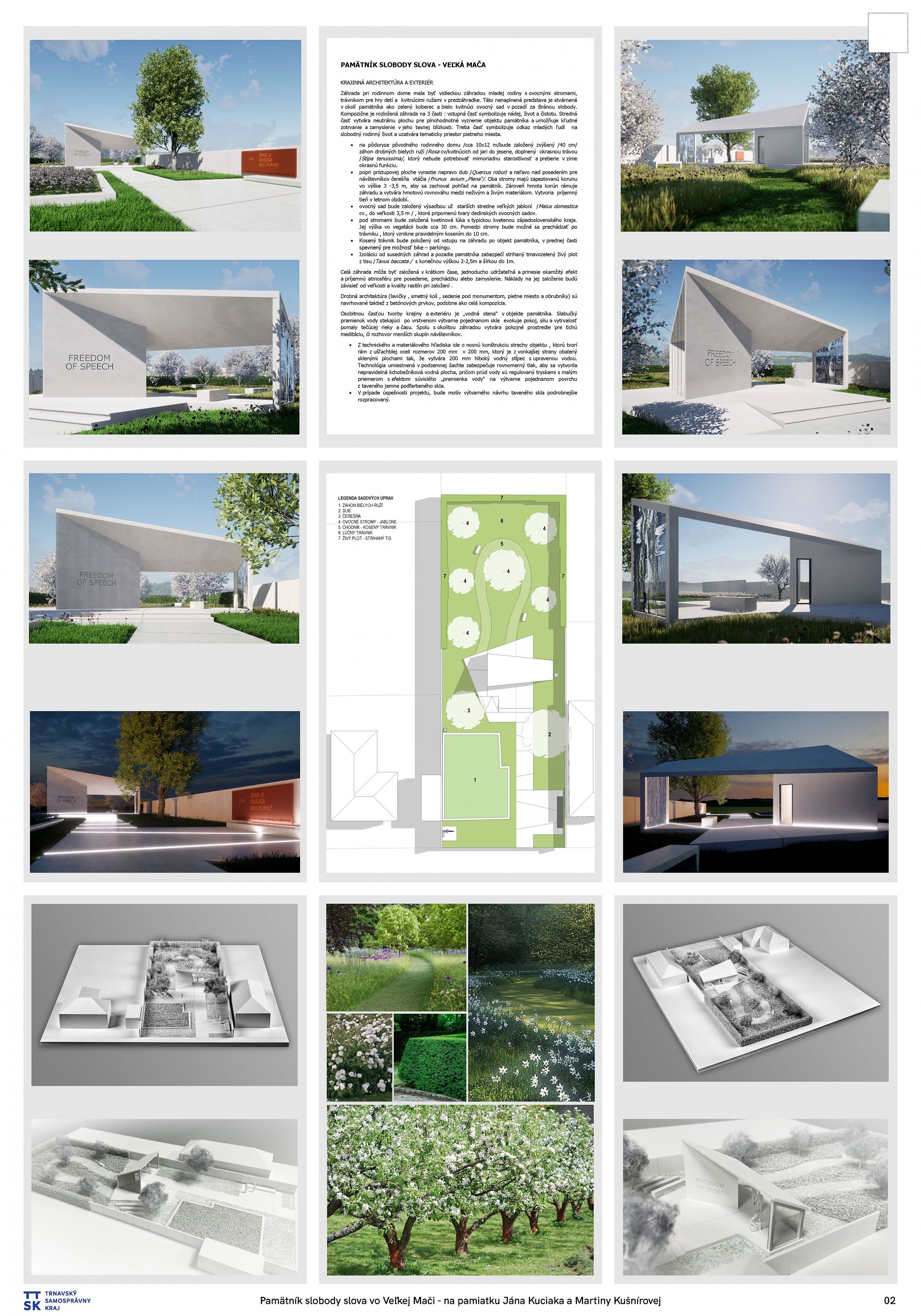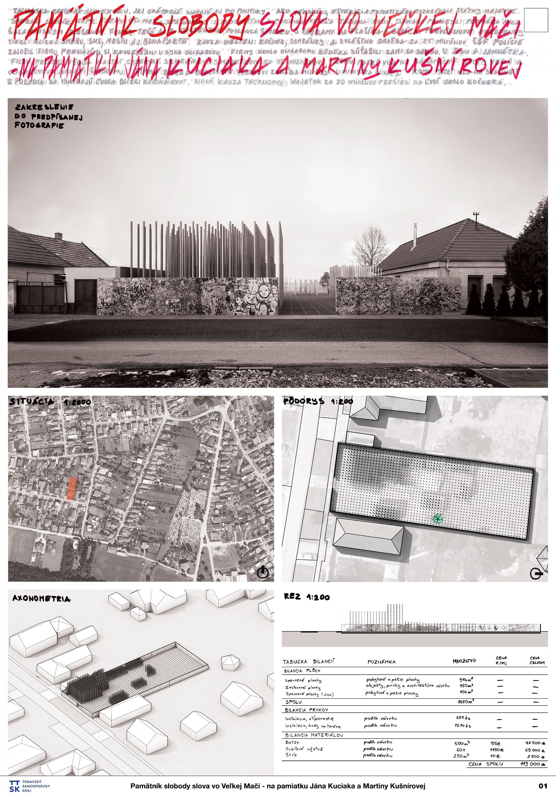 Návrh používa viacero motívov k stvárneniu pamätníka pričom najvýraznejší je zhmotnením audio stopy slov “sloboda slova” do tvaru chodníka, ktorý ústi do granitového bloku. Prítomnosť vody pod blokom vizuálne odľahčuje ťaživý moment padnutého monumentu. Pozitívne je vnímaná práca s otvorenosťou a prehľadnosťou prírodného priestoru. Nelogická sa však javí kompozícia zelene, ktorá rigidne a formálne v segmentoch živého plota priestor člení stenami. Umiestnenie pôvodnej vstupnej brány do návrhu je vítané, no jej pozícia v rohu pozemku pôsobí náhodne a bez kontextu. Celkovo je pamätník tvorený viacerými motívmi, ktorým chýba vzájomné prepojenie.