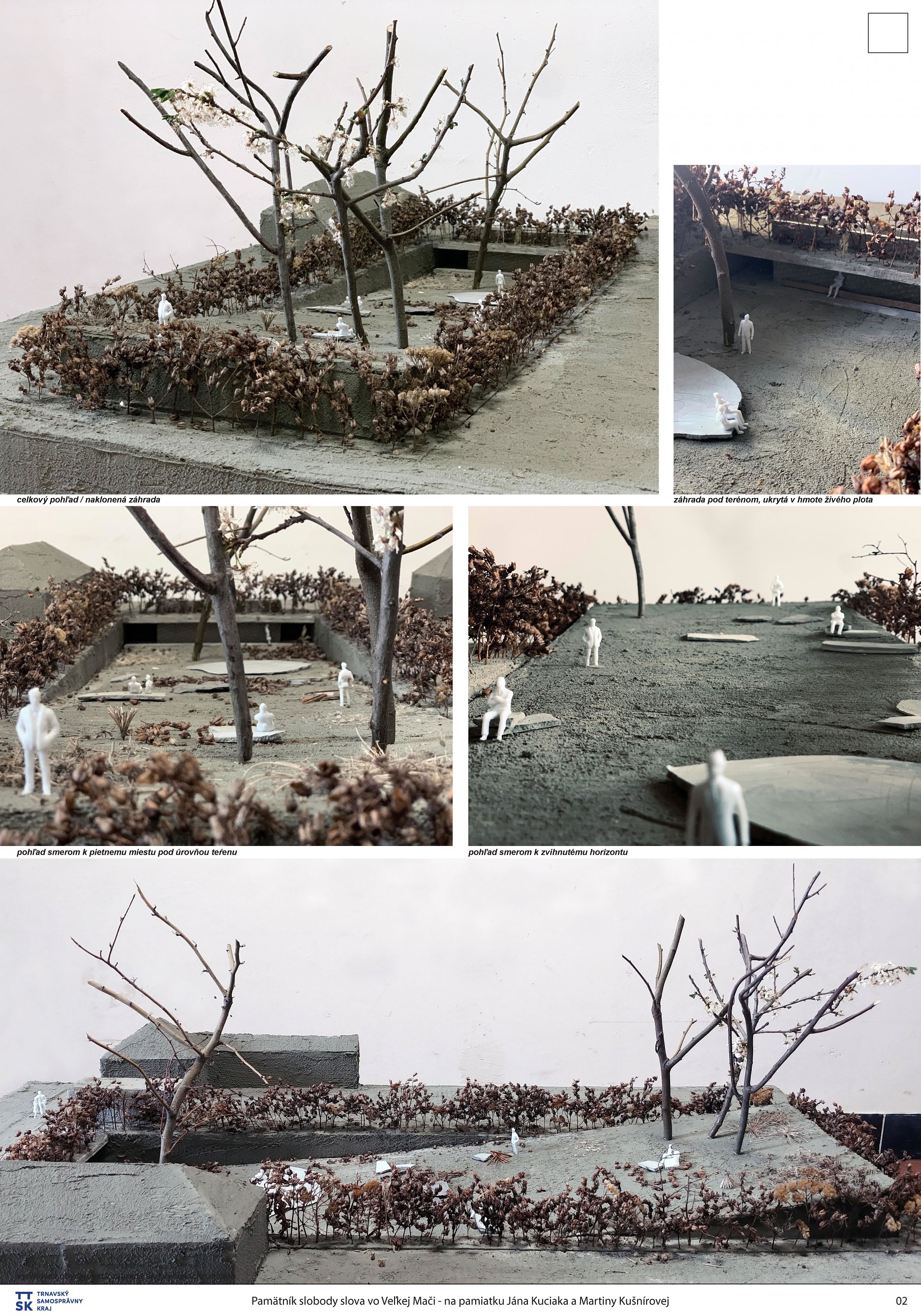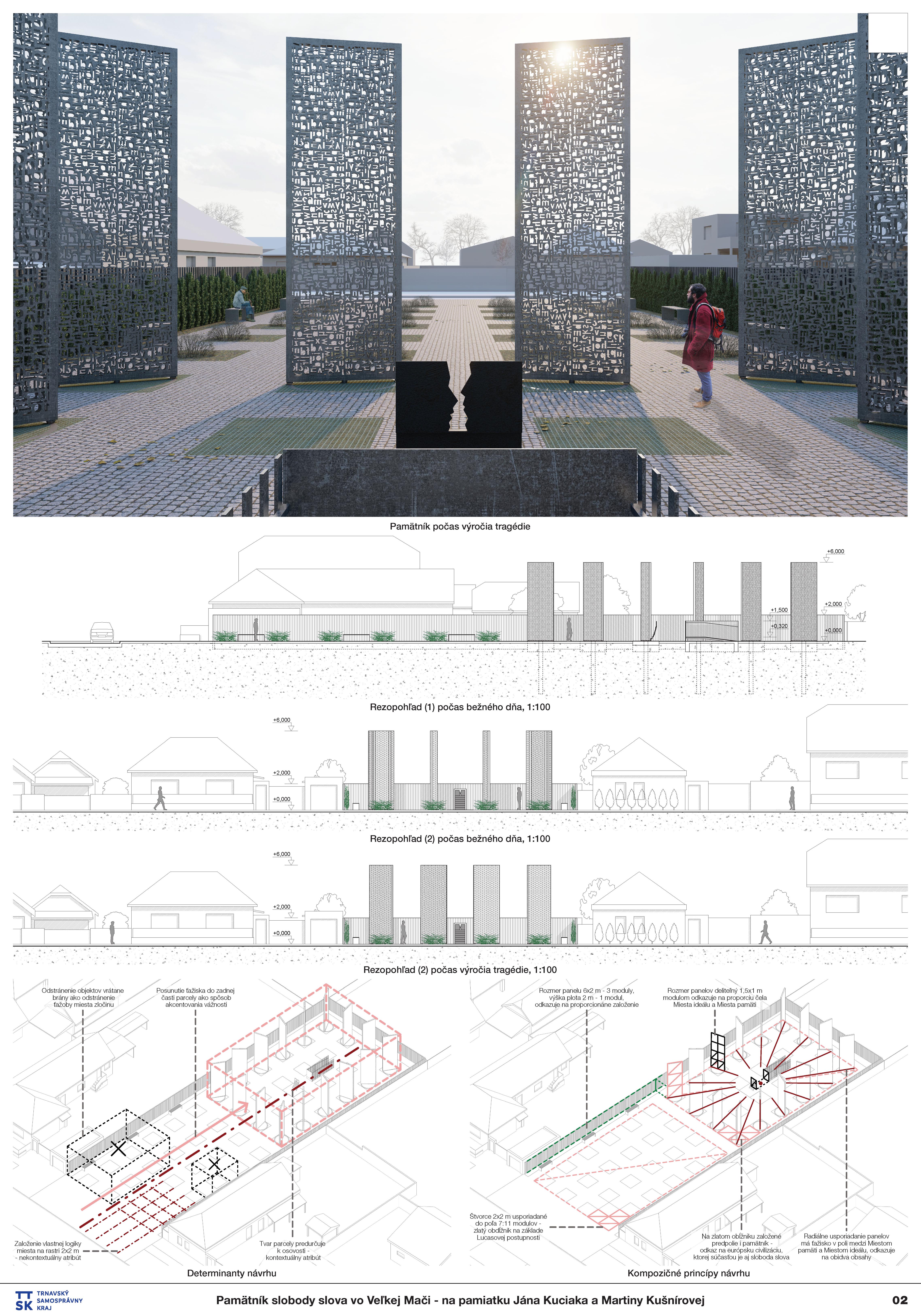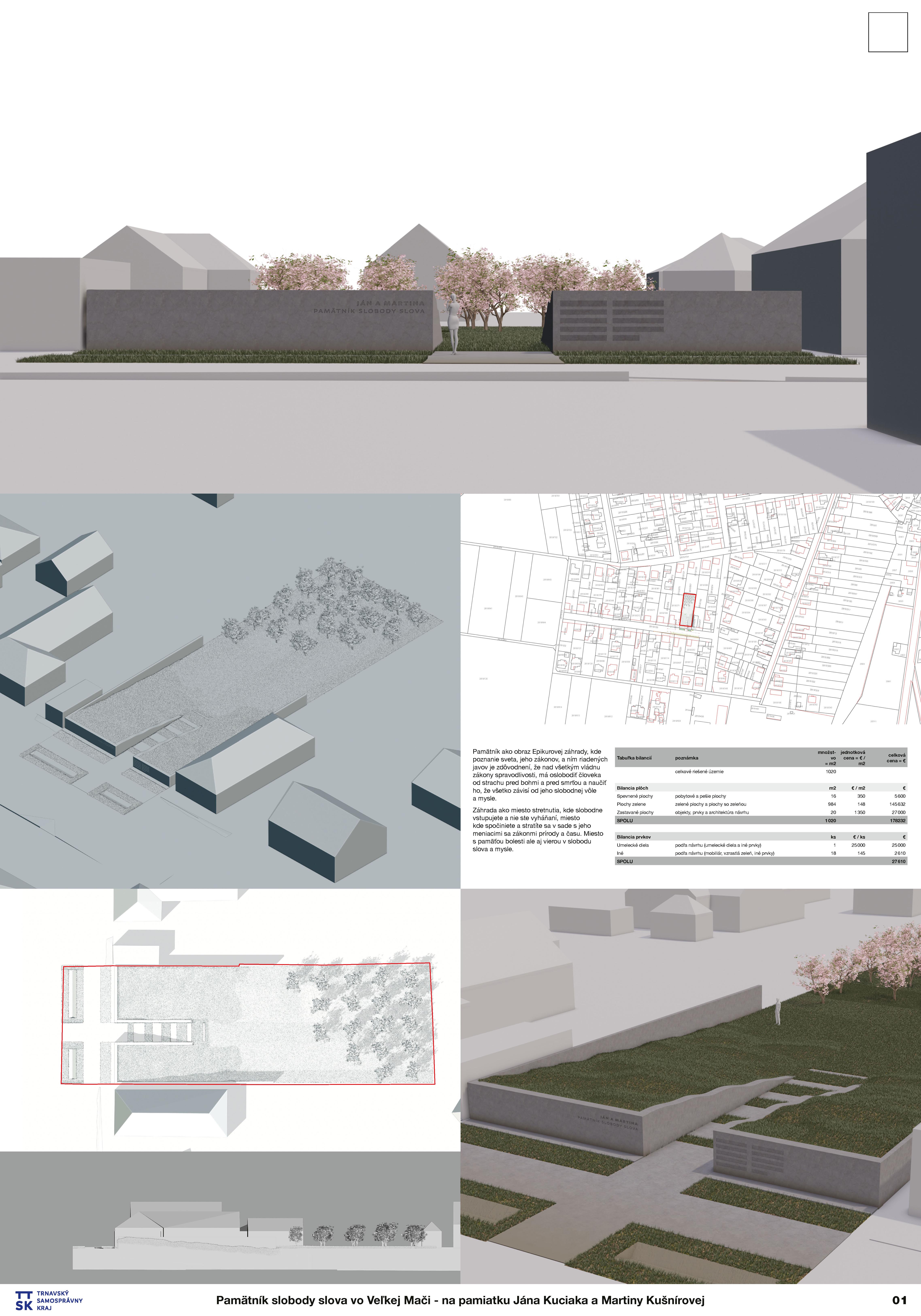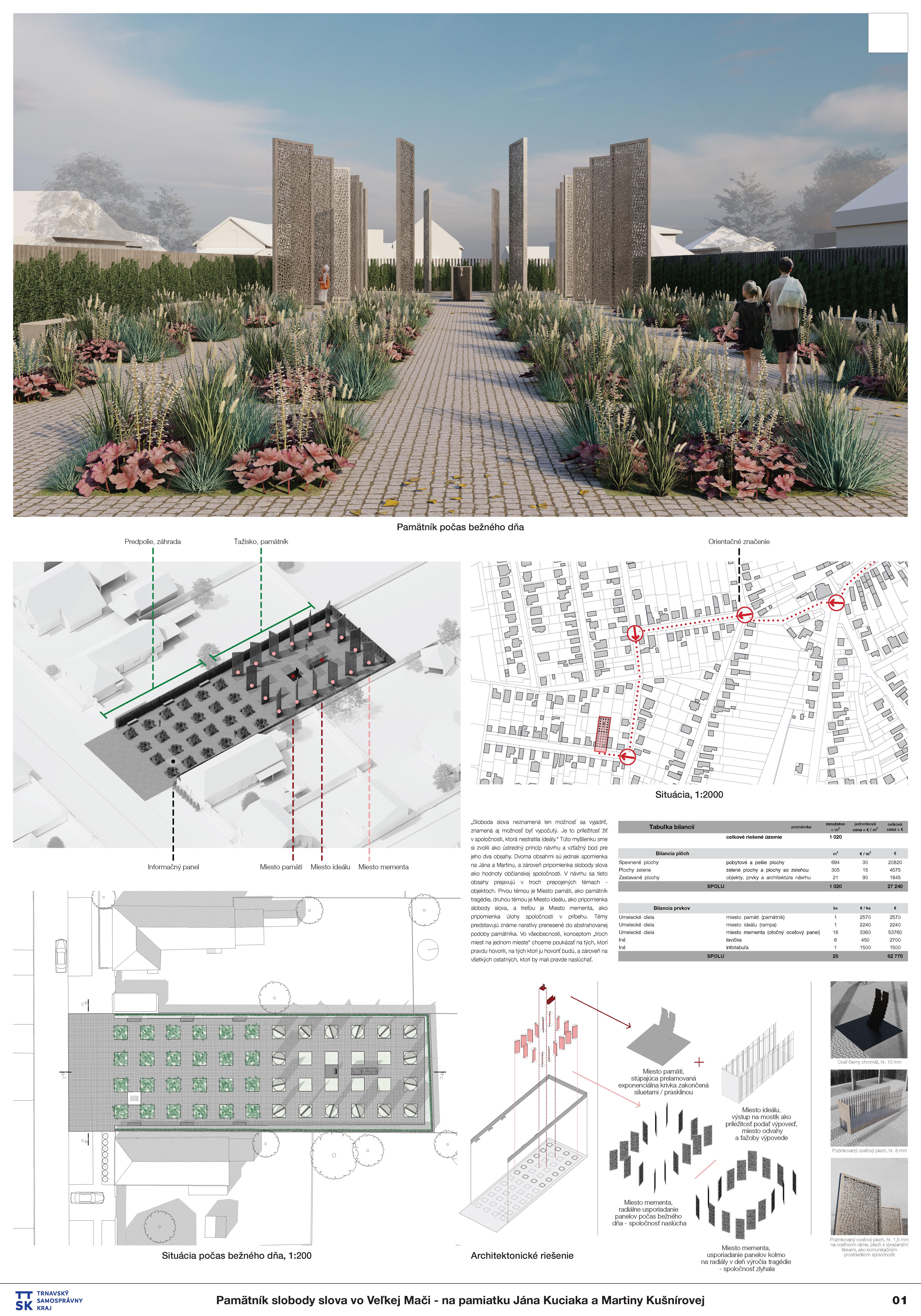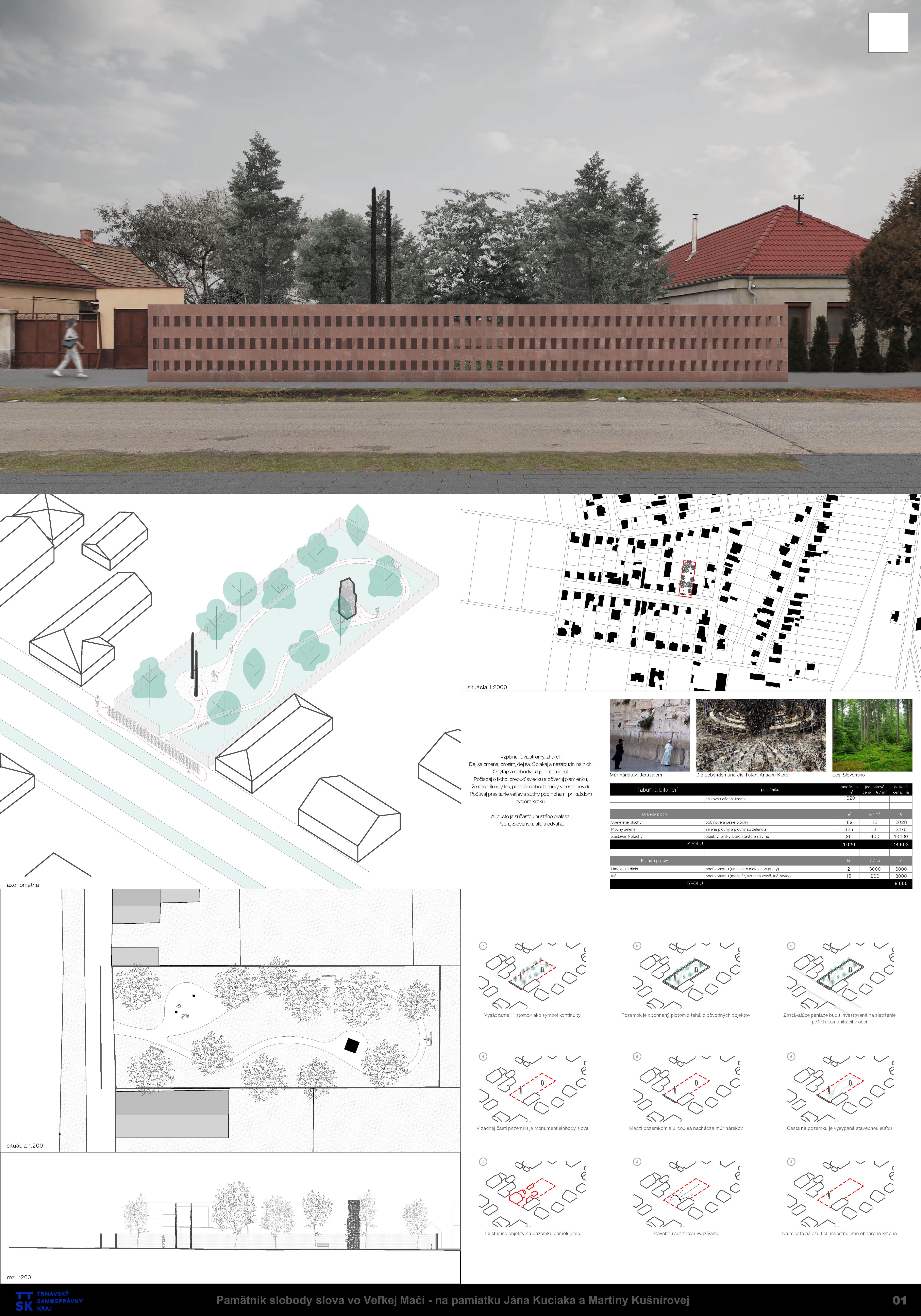 Návrh používa viacero motívov k stvárneniu pamätníka pričom najvýraznejší je zhmotnením audio stopy slov “sloboda slova” do tvaru chodníka, ktorý ústi do granitového bloku. Prítomnosť vody pod blokom vizuálne odľahčuje ťaživý moment padnutého monumentu. Pozitívne je vnímaná práca s otvorenosťou a prehľadnosťou prírodného priestoru. Nelogická sa však javí kompozícia zelene, ktorá rigidne a formálne v segmentoch živého plota priestor člení stenami. Umiestnenie pôvodnej vstupnej brány do návrhu je vítané, no jej pozícia v rohu pozemku pôsobí náhodne a bez kontextu. Celkovo je pamätník tvorený viacerými motívmi, ktorým chýba vzájomné prepojenie.