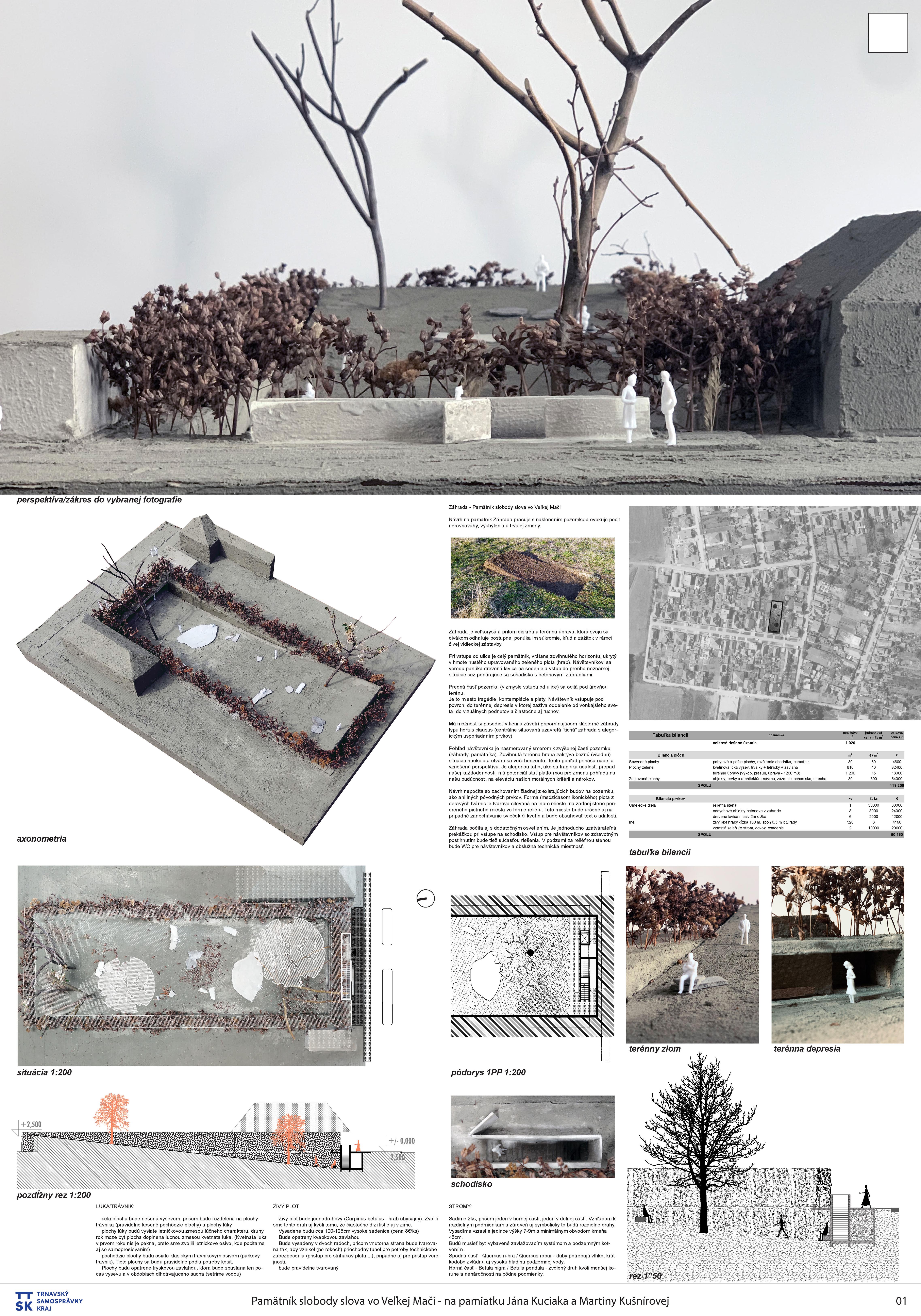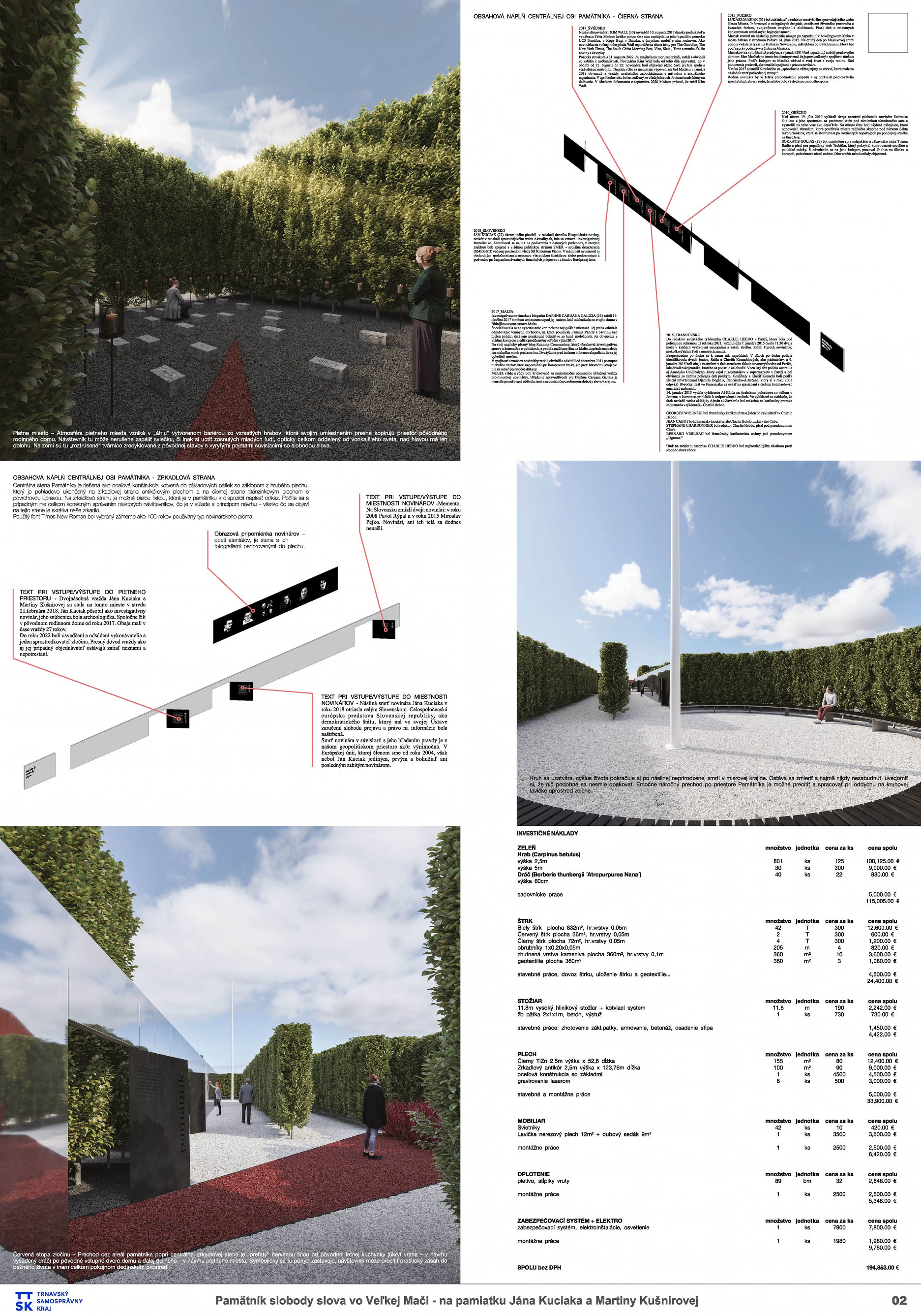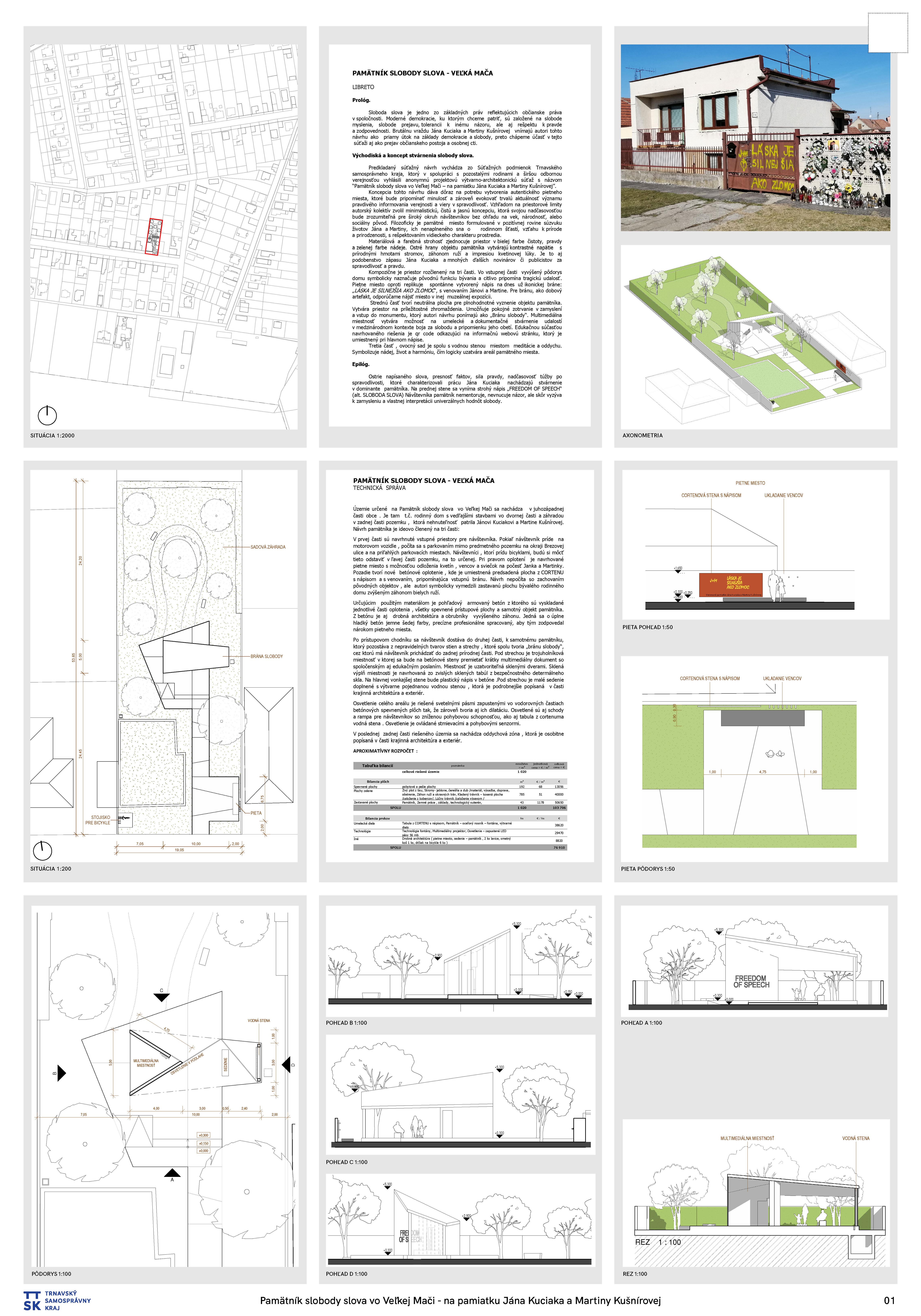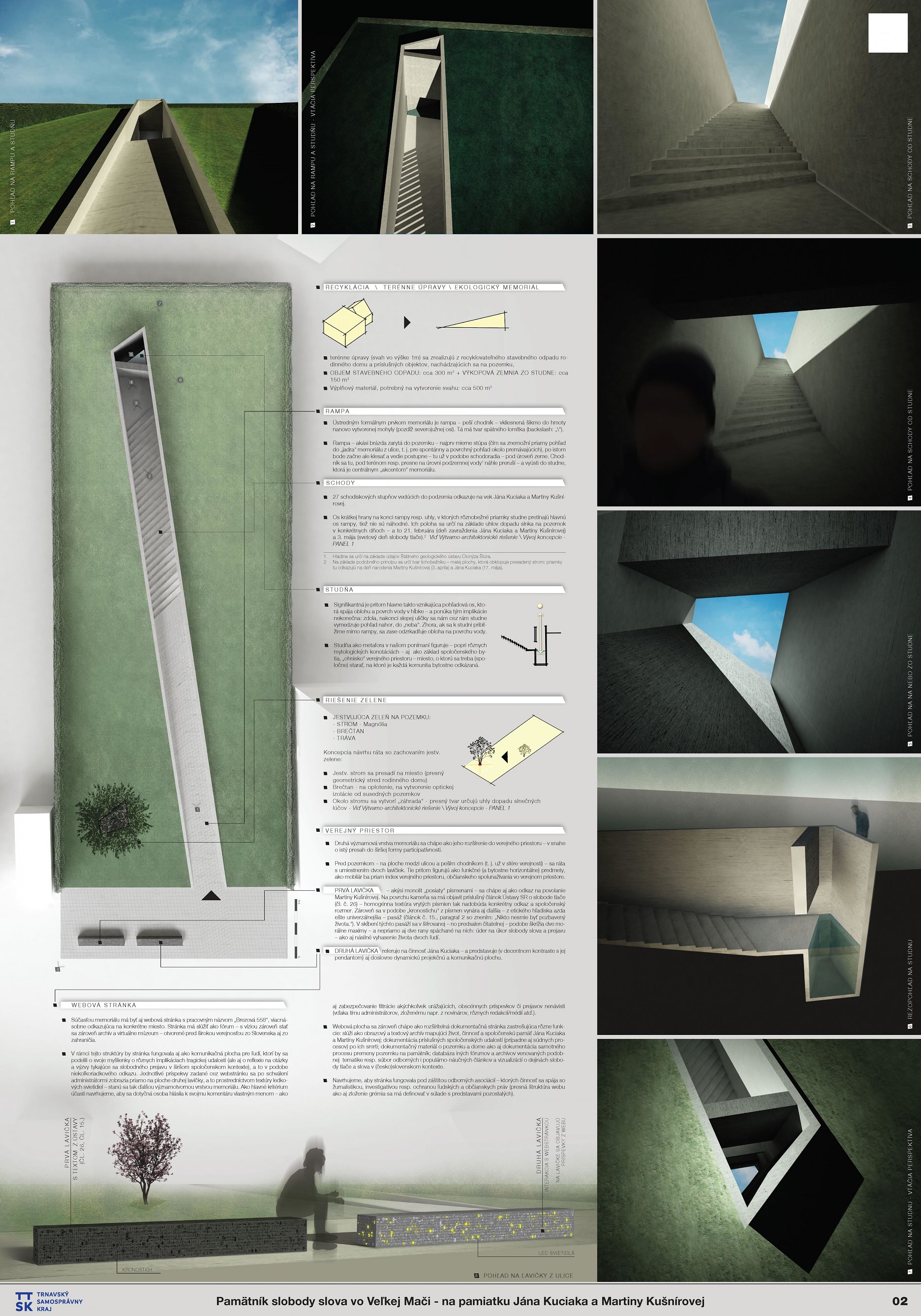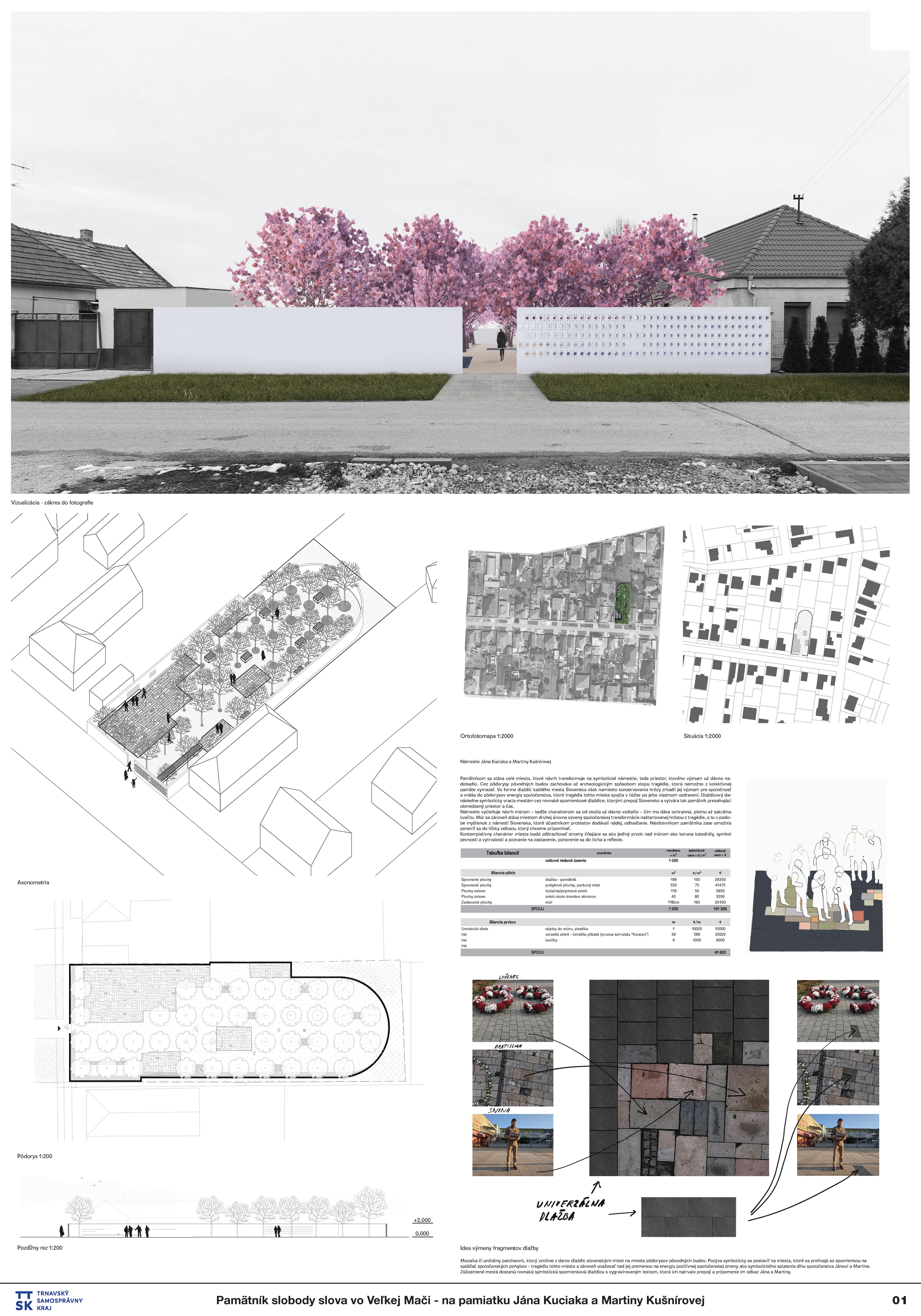 Návrh používa viacero motívov k stvárneniu pamätníka pričom najvýraznejší je zhmotnením audio stopy slov “sloboda slova” do tvaru chodníka, ktorý ústi do granitového bloku. Prítomnosť vody pod blokom vizuálne odľahčuje ťaživý moment padnutého monumentu. Pozitívne je vnímaná práca s otvorenosťou a prehľadnosťou prírodného priestoru. Nelogická sa však javí kompozícia zelene, ktorá rigidne a formálne v segmentoch živého plota priestor člení stenami. Umiestnenie pôvodnej vstupnej brány do návrhu je vítané, no jej pozícia v rohu pozemku pôsobí náhodne a bez kontextu. Celkovo je pamätník tvorený viacerými motívmi, ktorým chýba vzájomné prepojenie.