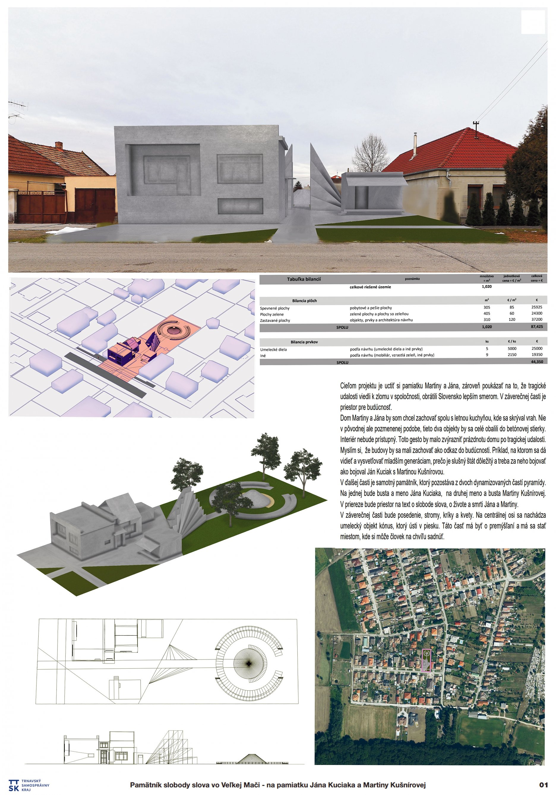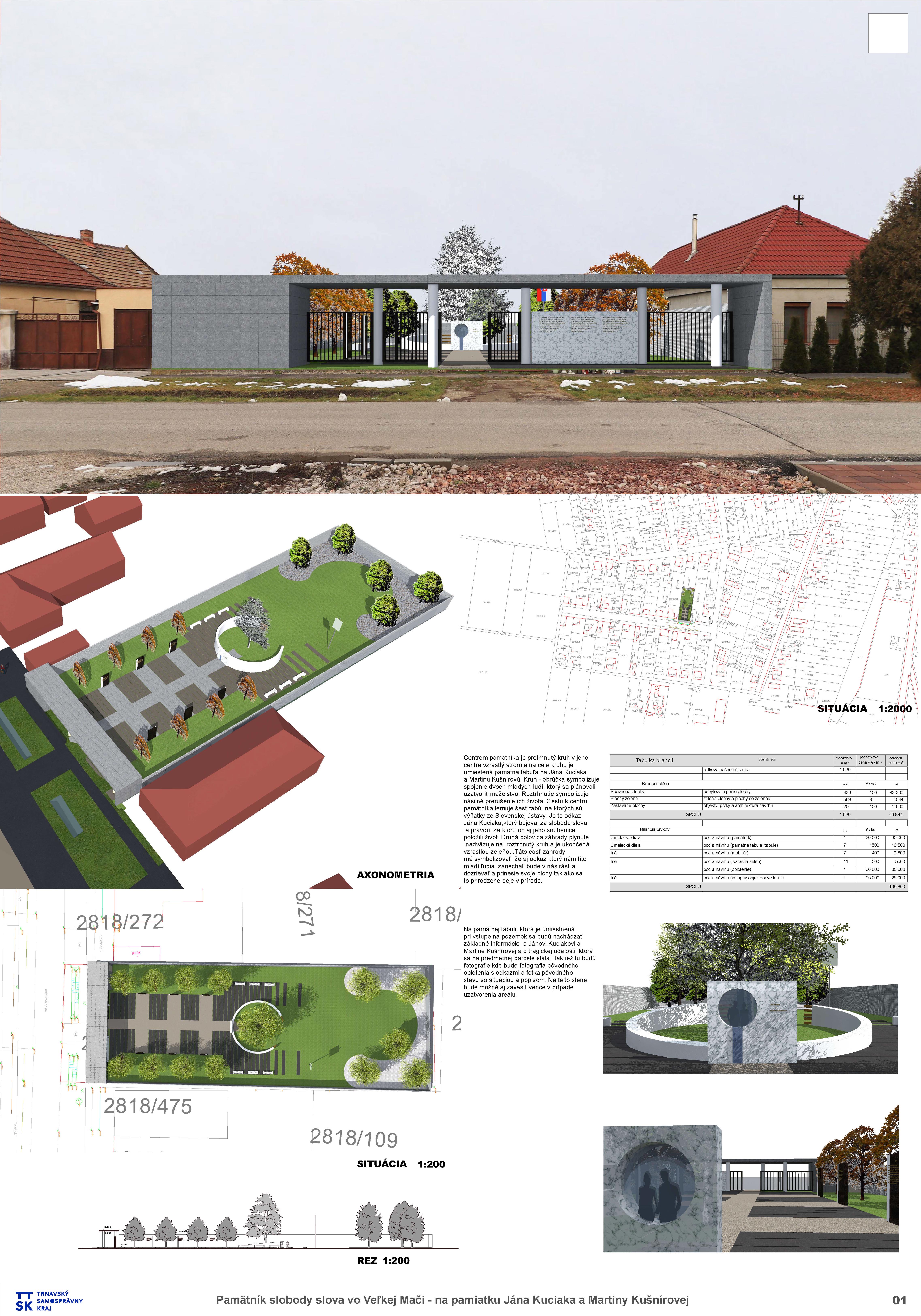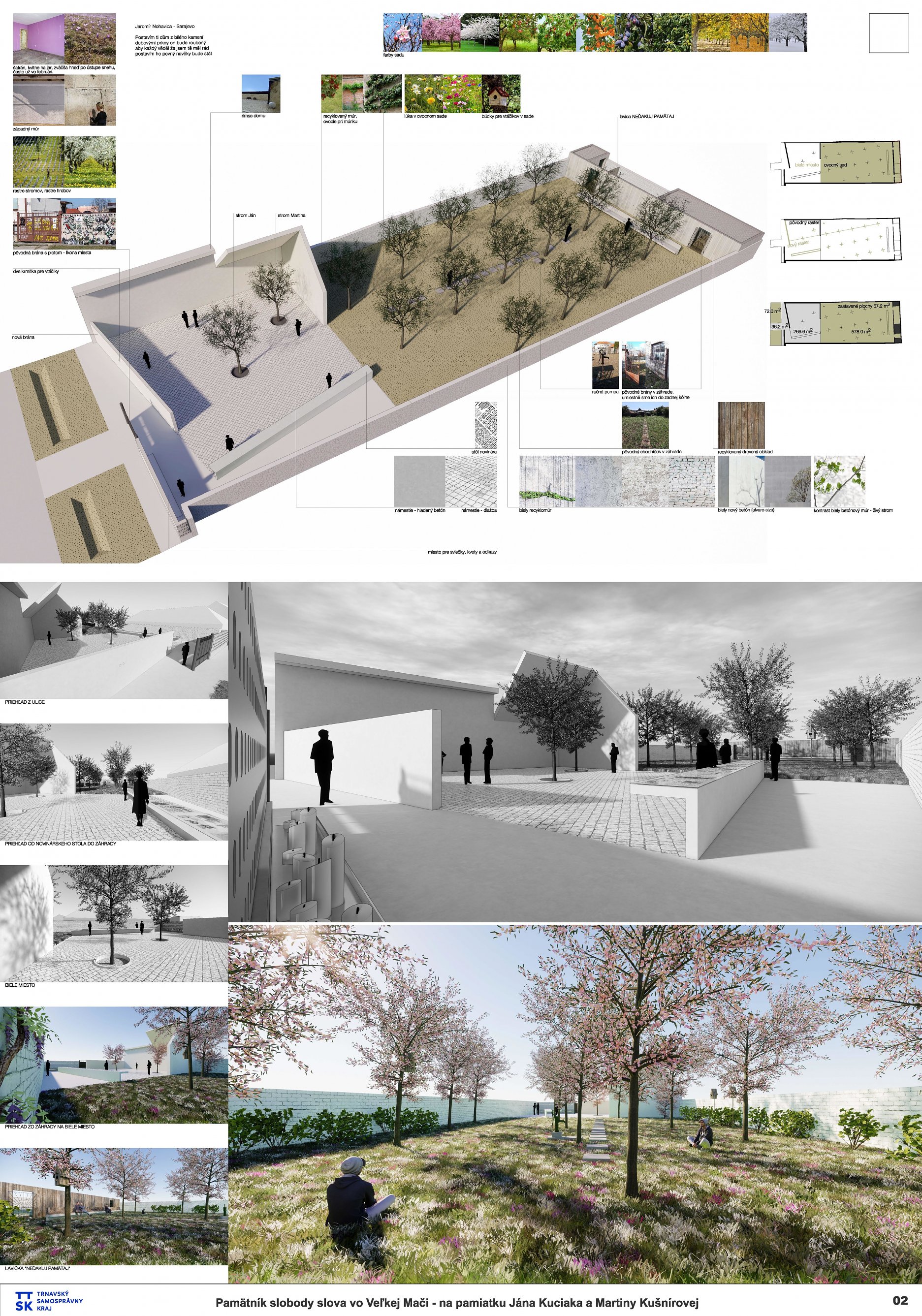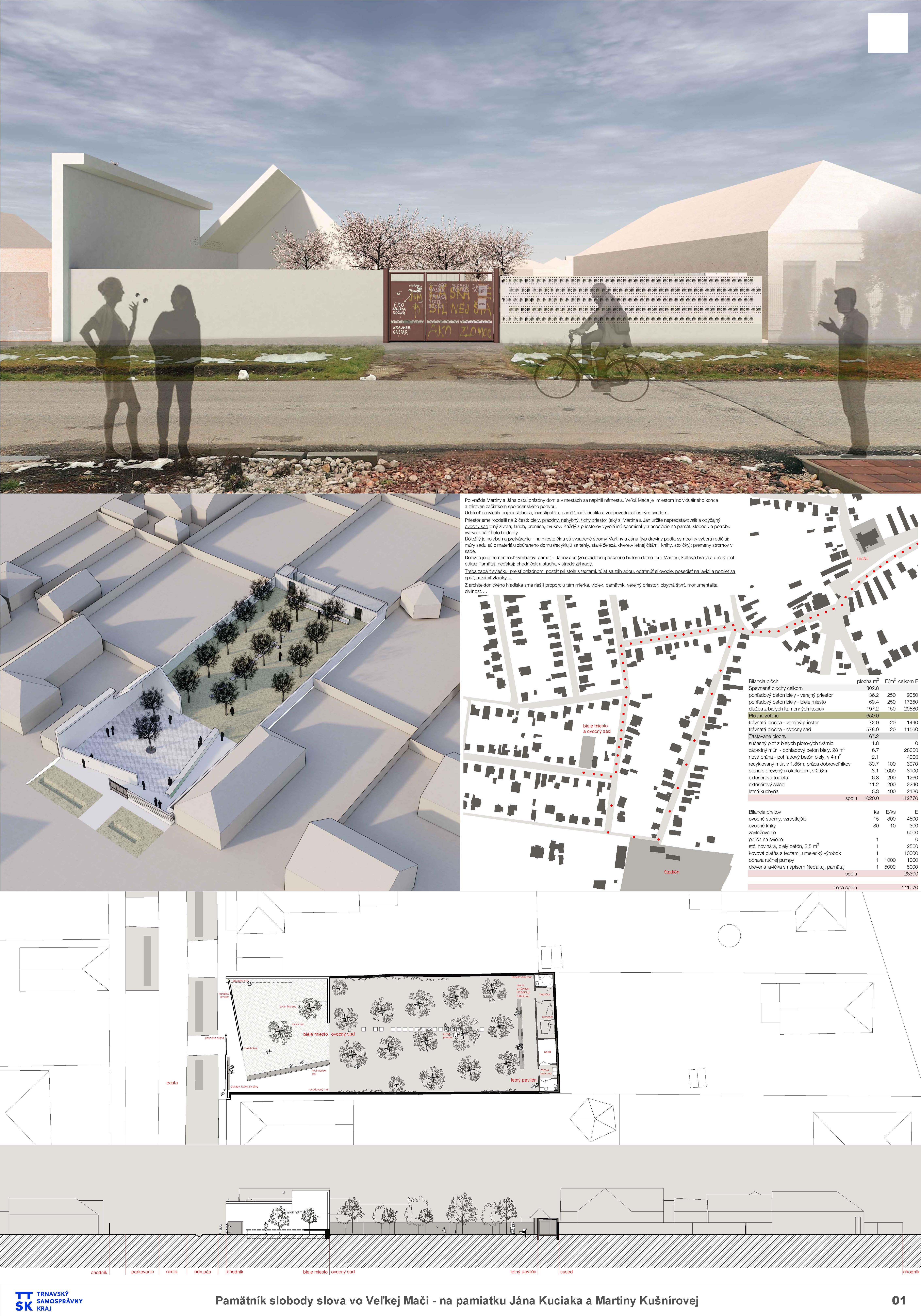 Návrh používa viacero motívov k stvárneniu pamätníka pričom najvýraznejší je zhmotnením audio stopy slov “sloboda slova” do tvaru chodníka, ktorý ústi do granitového bloku. Prítomnosť vody pod blokom vizuálne odľahčuje ťaživý moment padnutého monumentu. Pozitívne je vnímaná práca s otvorenosťou a prehľadnosťou prírodného priestoru. Nelogická sa však javí kompozícia zelene, ktorá rigidne a formálne v segmentoch živého plota priestor člení stenami. Umiestnenie pôvodnej vstupnej brány do návrhu je vítané, no jej pozícia v rohu pozemku pôsobí náhodne a bez kontextu. Celkovo je pamätník tvorený viacerými motívmi, ktorým chýba vzájomné prepojenie.