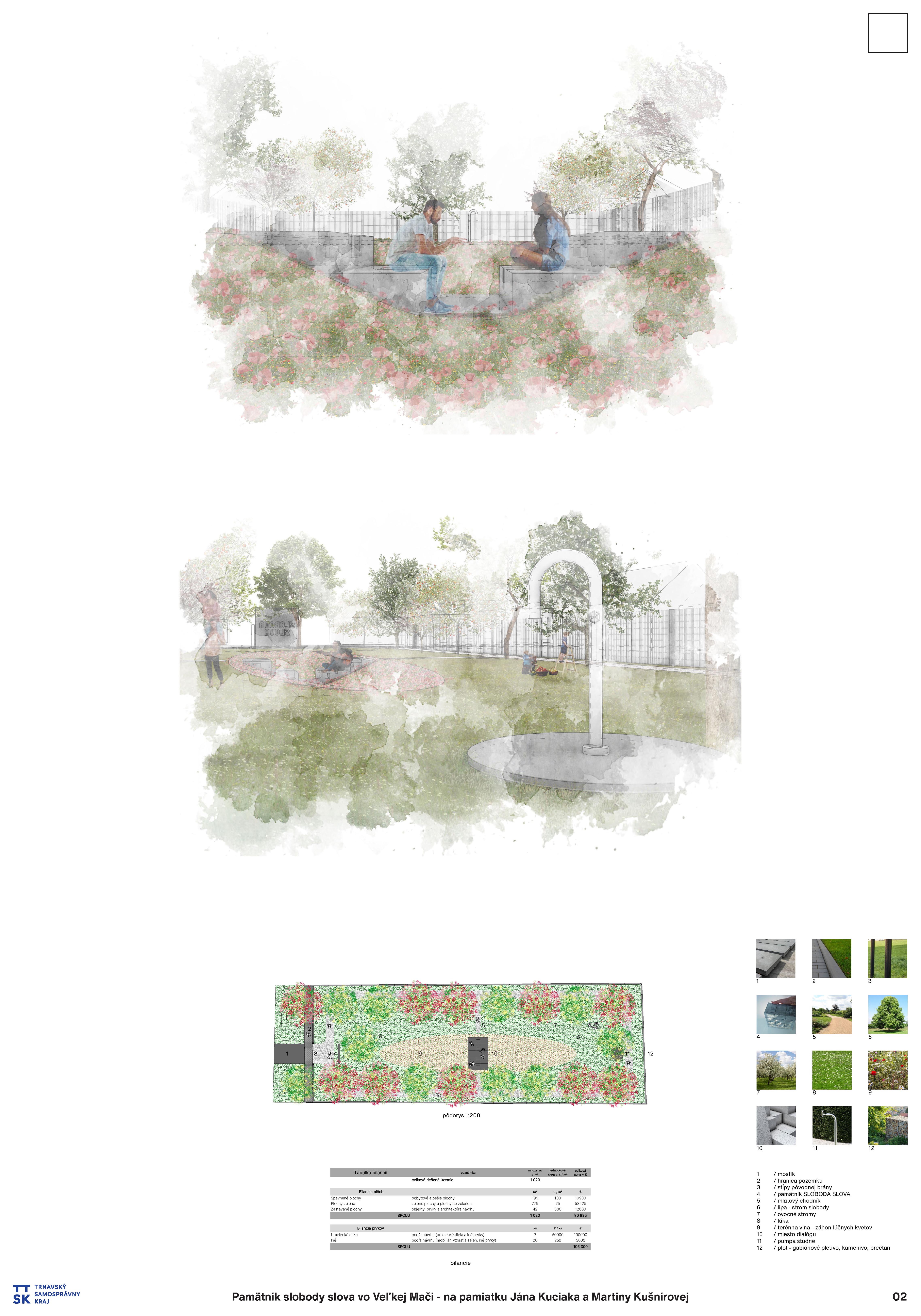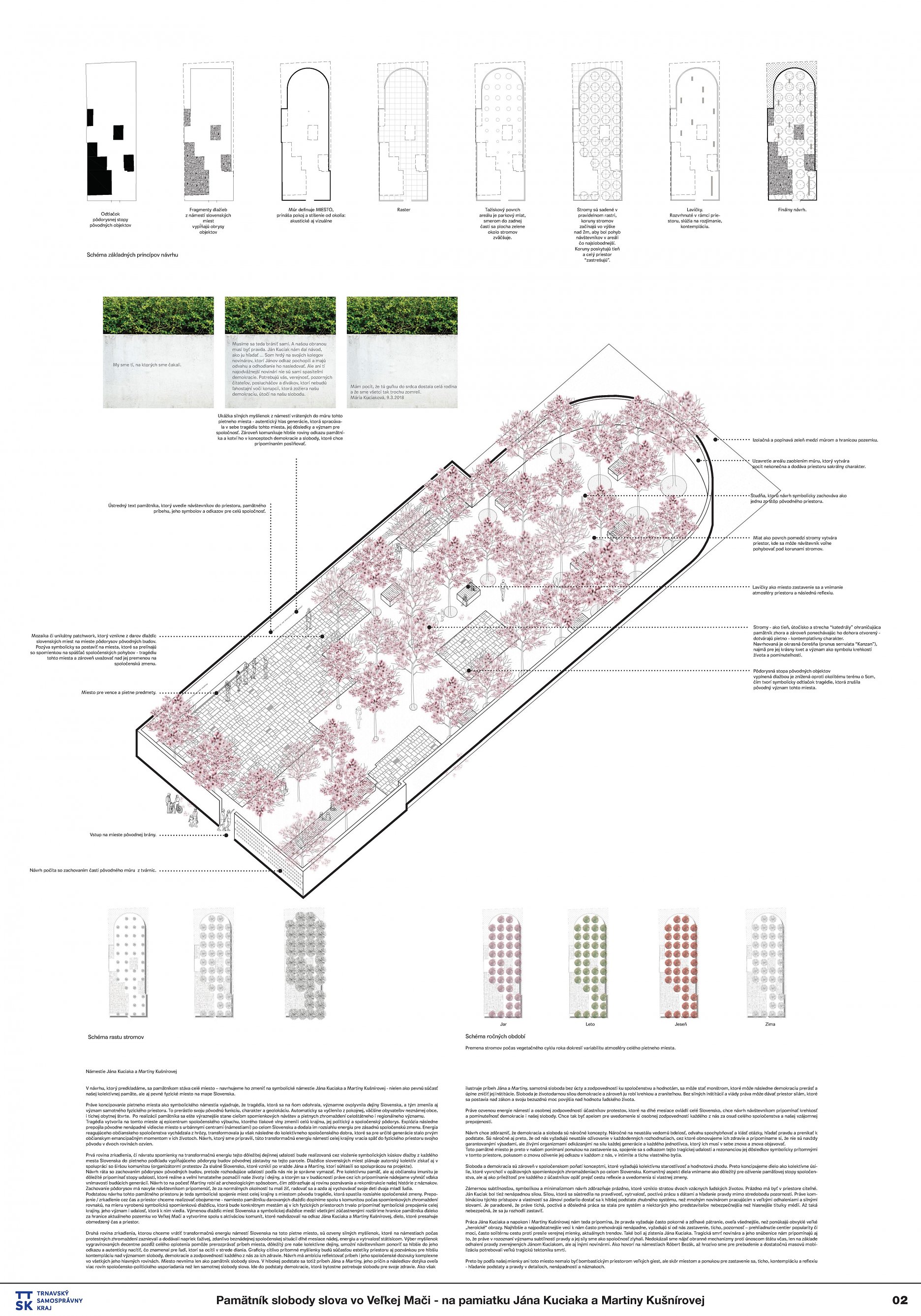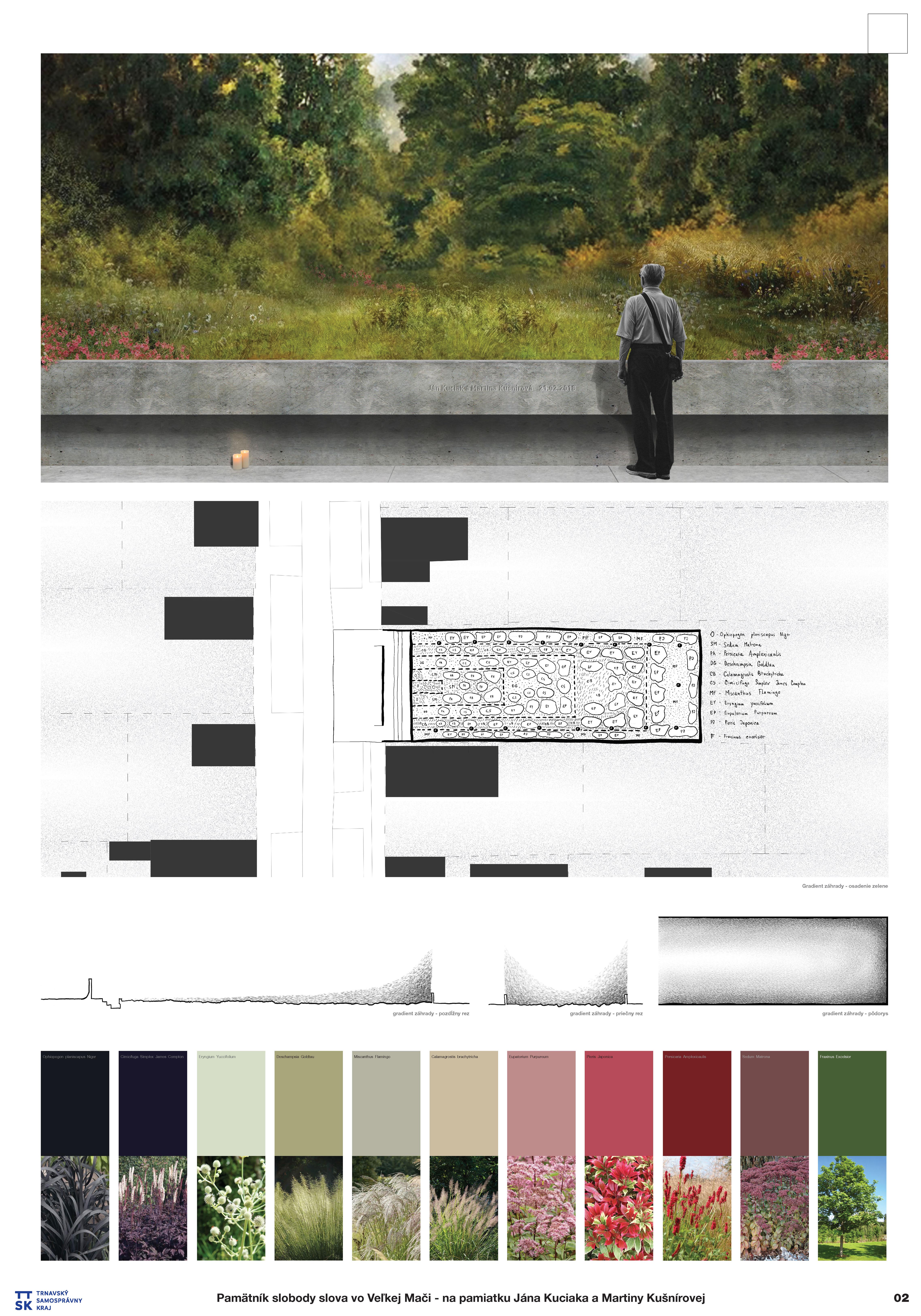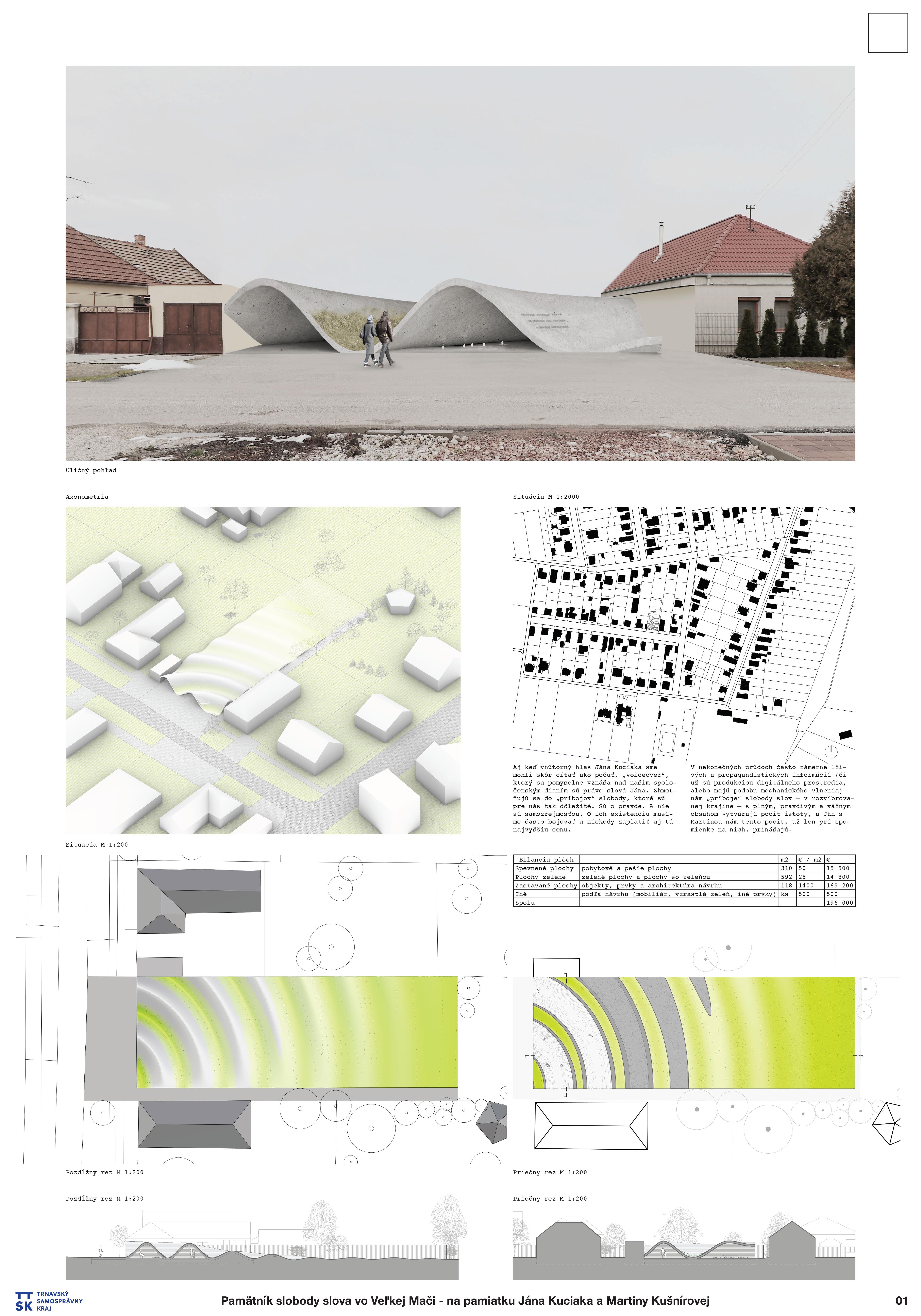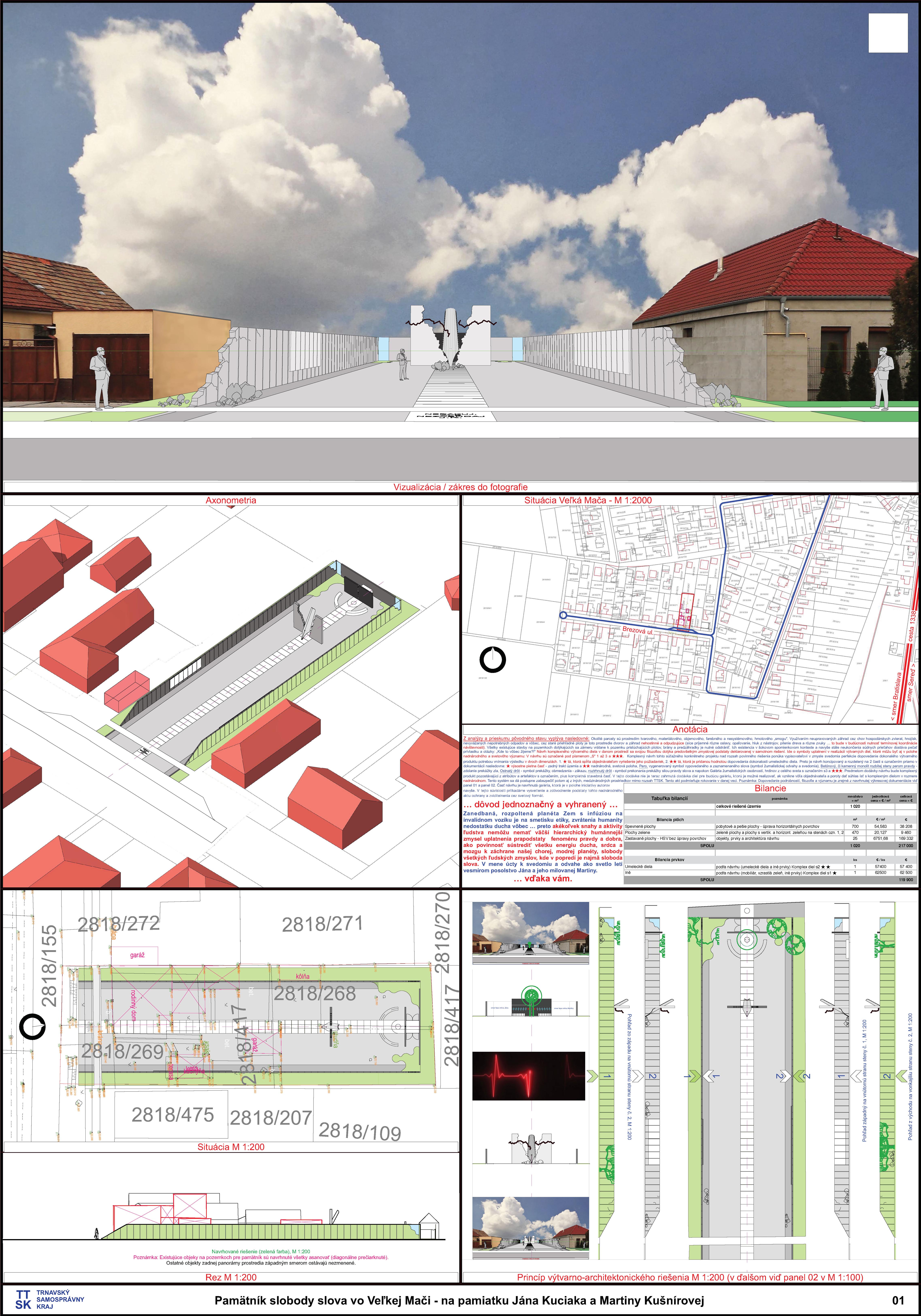 Návrh používa viacero motívov k stvárneniu pamätníka pričom najvýraznejší je zhmotnením audio stopy slov “sloboda slova” do tvaru chodníka, ktorý ústi do granitového bloku. Prítomnosť vody pod blokom vizuálne odľahčuje ťaživý moment padnutého monumentu. Pozitívne je vnímaná práca s otvorenosťou a prehľadnosťou prírodného priestoru. Nelogická sa však javí kompozícia zelene, ktorá rigidne a formálne v segmentoch živého plota priestor člení stenami. Umiestnenie pôvodnej vstupnej brány do návrhu je vítané, no jej pozícia v rohu pozemku pôsobí náhodne a bez kontextu. Celkovo je pamätník tvorený viacerými motívmi, ktorým chýba vzájomné prepojenie.