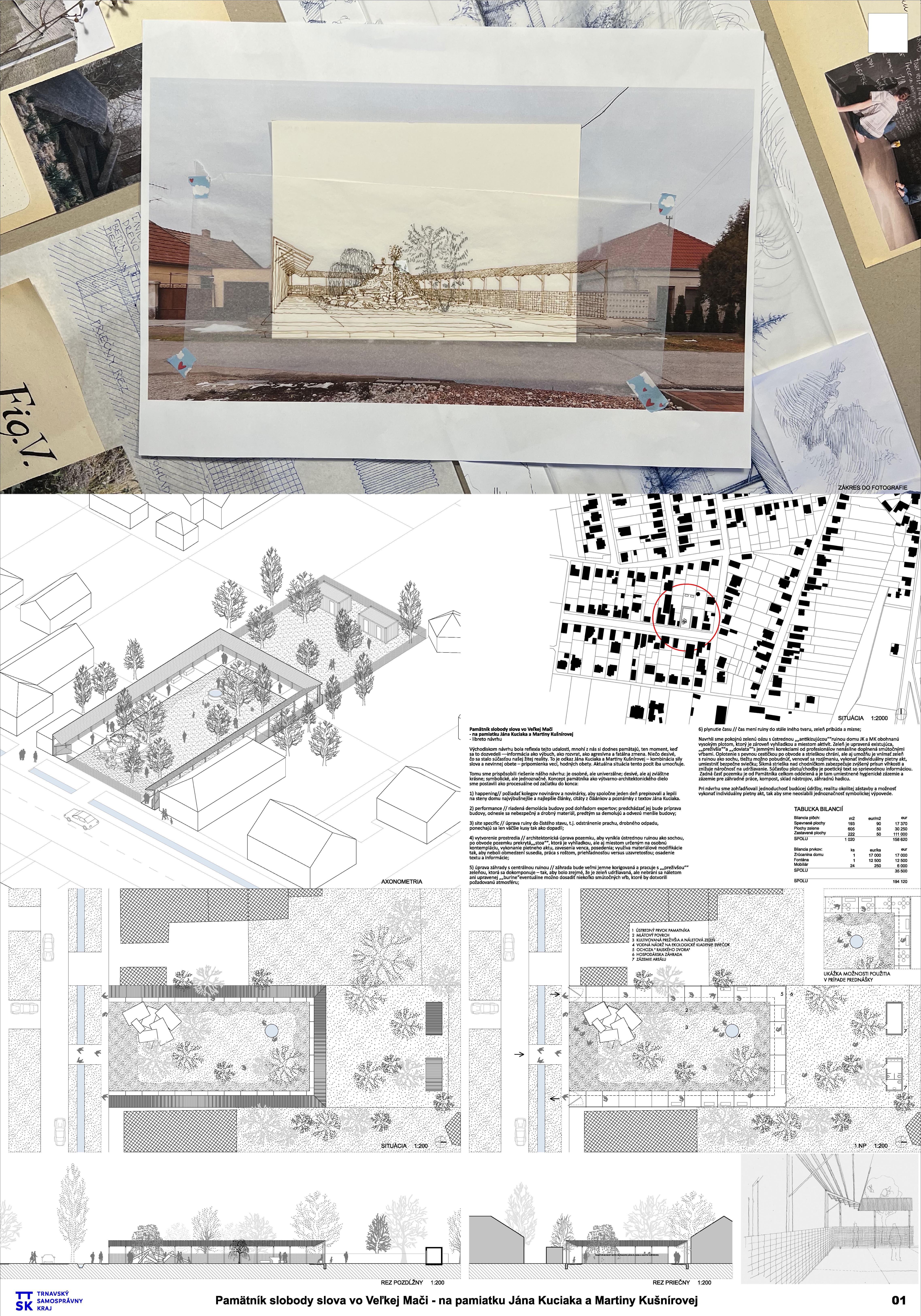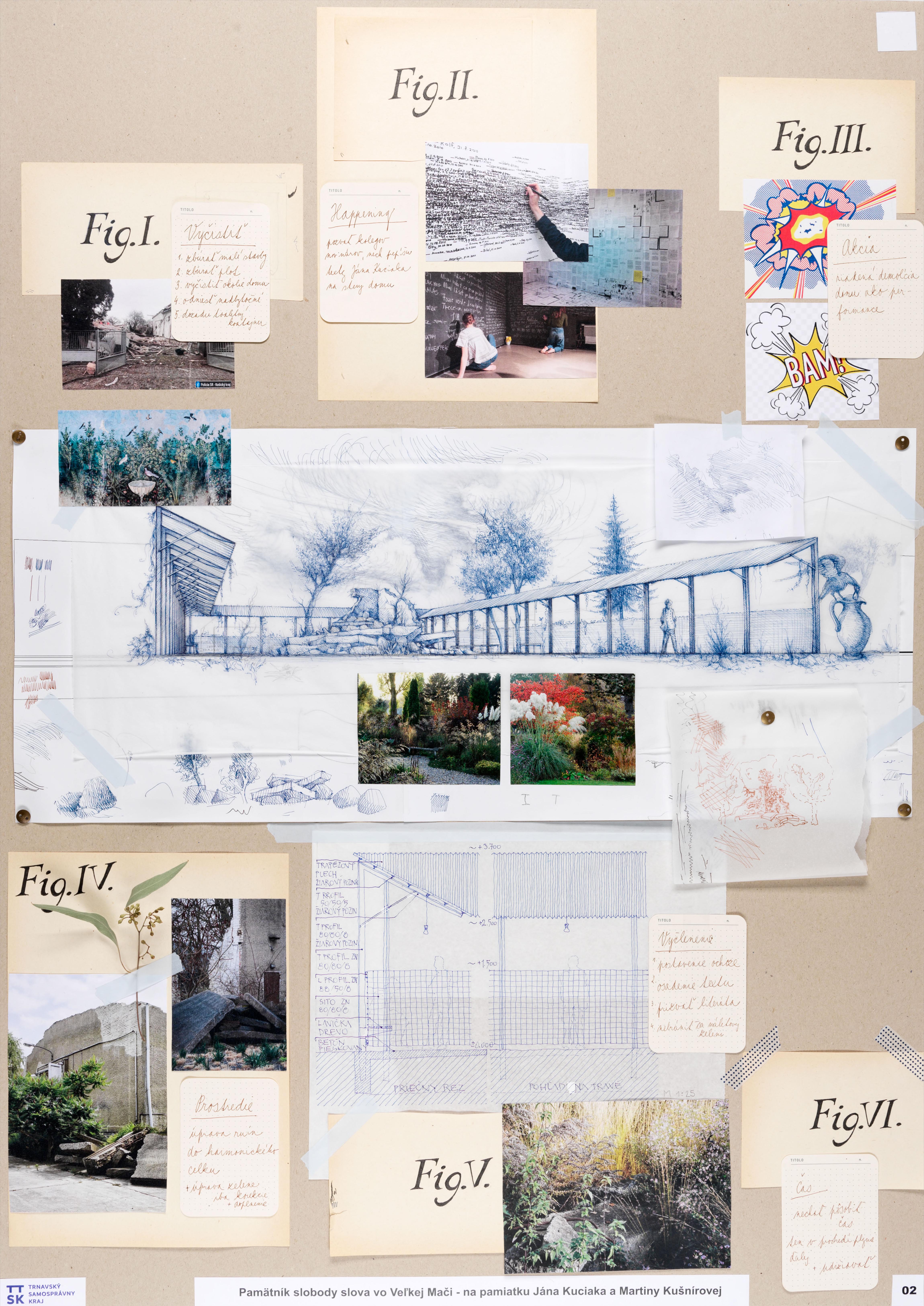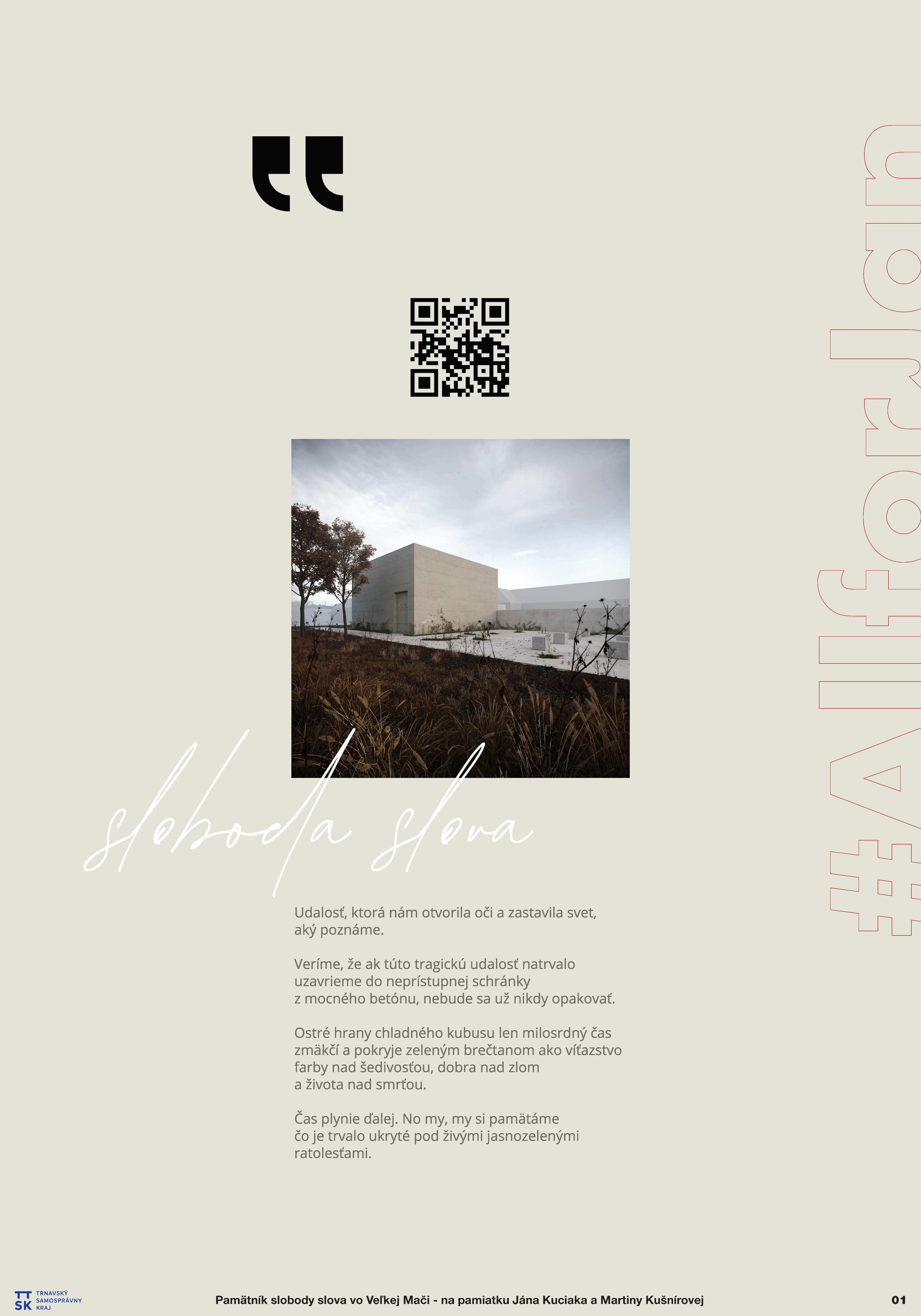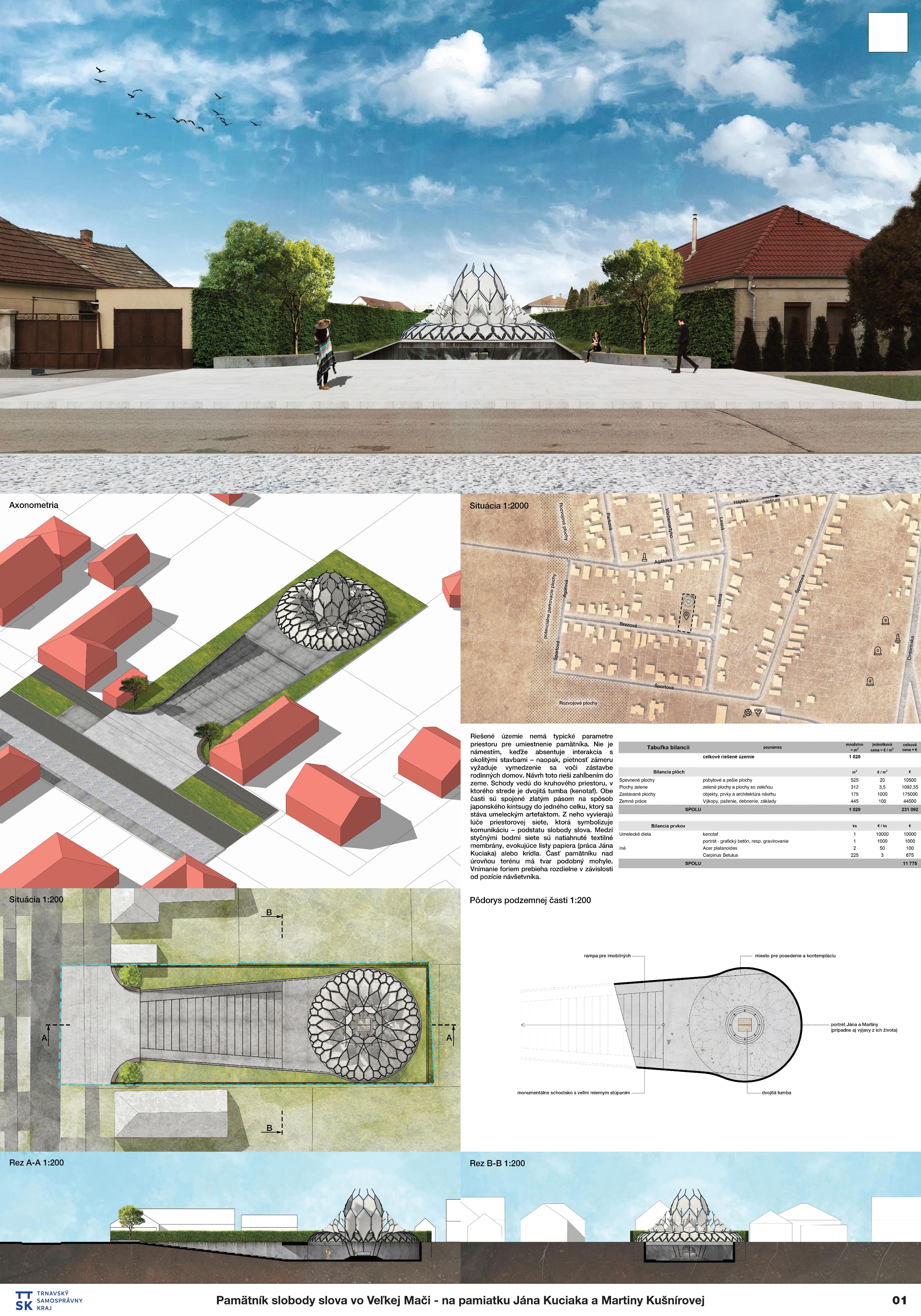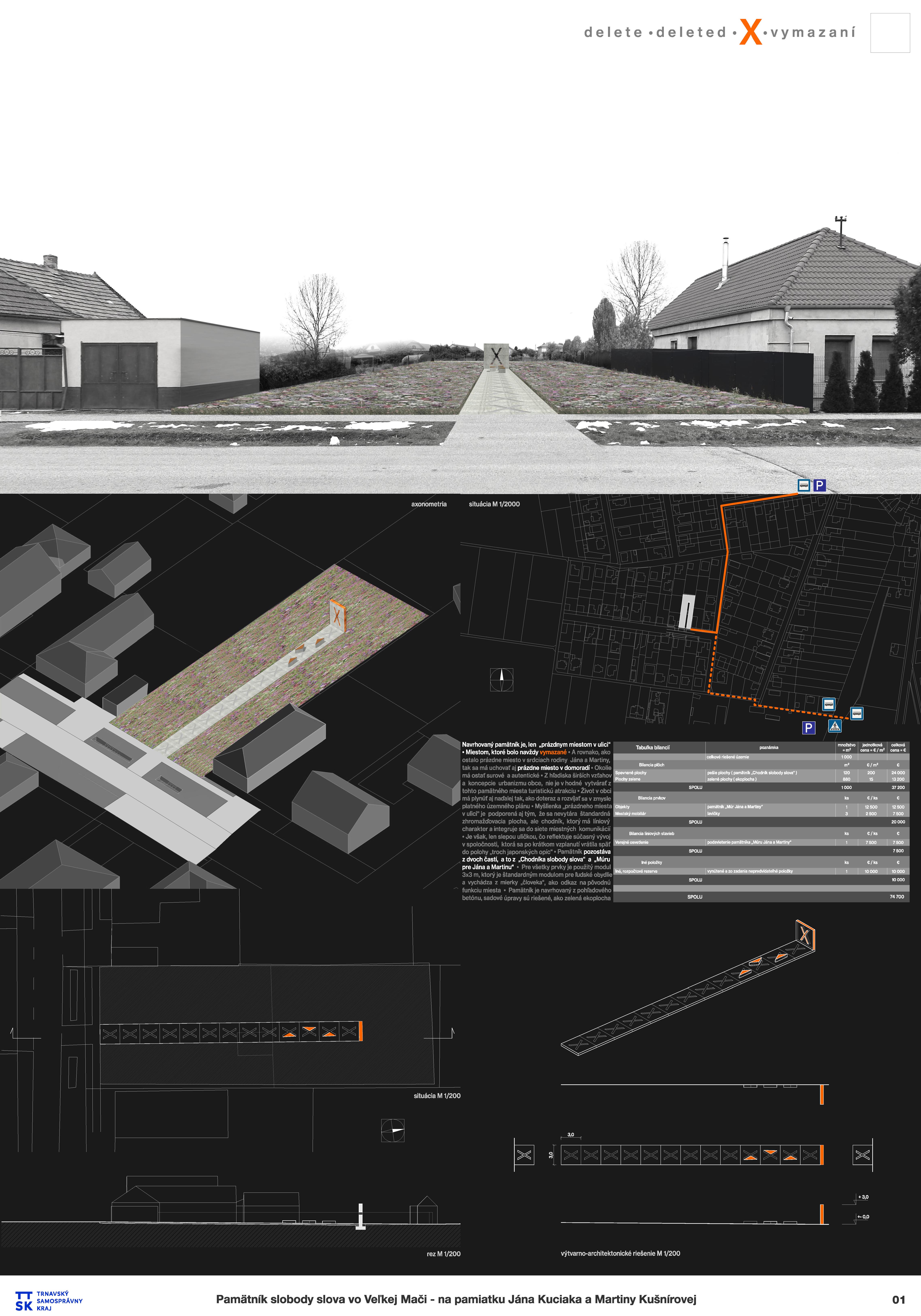 Návrh používa viacero motívov k stvárneniu pamätníka pričom najvýraznejší je zhmotnením audio stopy slov “sloboda slova” do tvaru chodníka, ktorý ústi do granitového bloku. Prítomnosť vody pod blokom vizuálne odľahčuje ťaživý moment padnutého monumentu. Pozitívne je vnímaná práca s otvorenosťou a prehľadnosťou prírodného priestoru. Nelogická sa však javí kompozícia zelene, ktorá rigidne a formálne v segmentoch živého plota priestor člení stenami. Umiestnenie pôvodnej vstupnej brány do návrhu je vítané, no jej pozícia v rohu pozemku pôsobí náhodne a bez kontextu. Celkovo je pamätník tvorený viacerými motívmi, ktorým chýba vzájomné prepojenie.