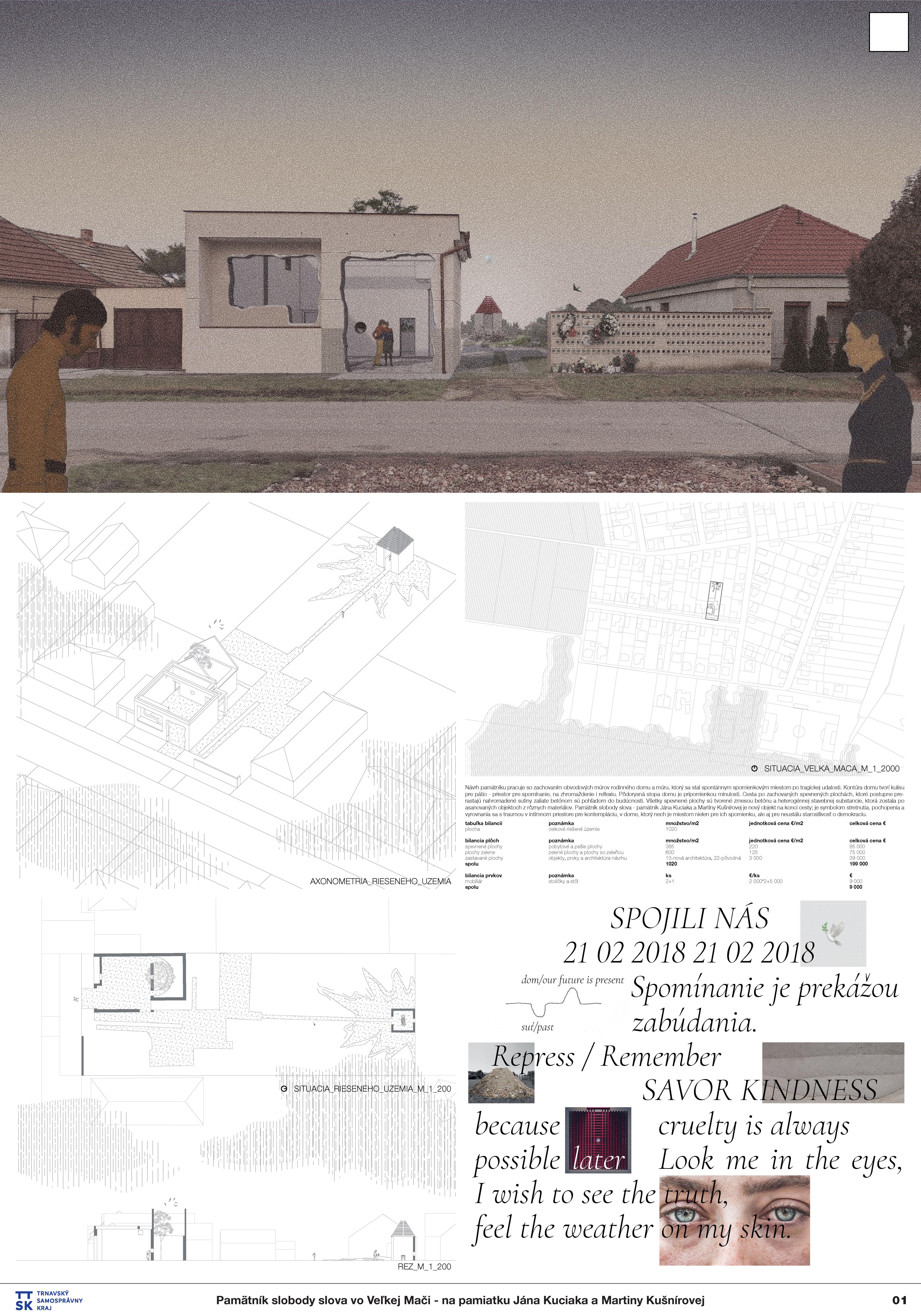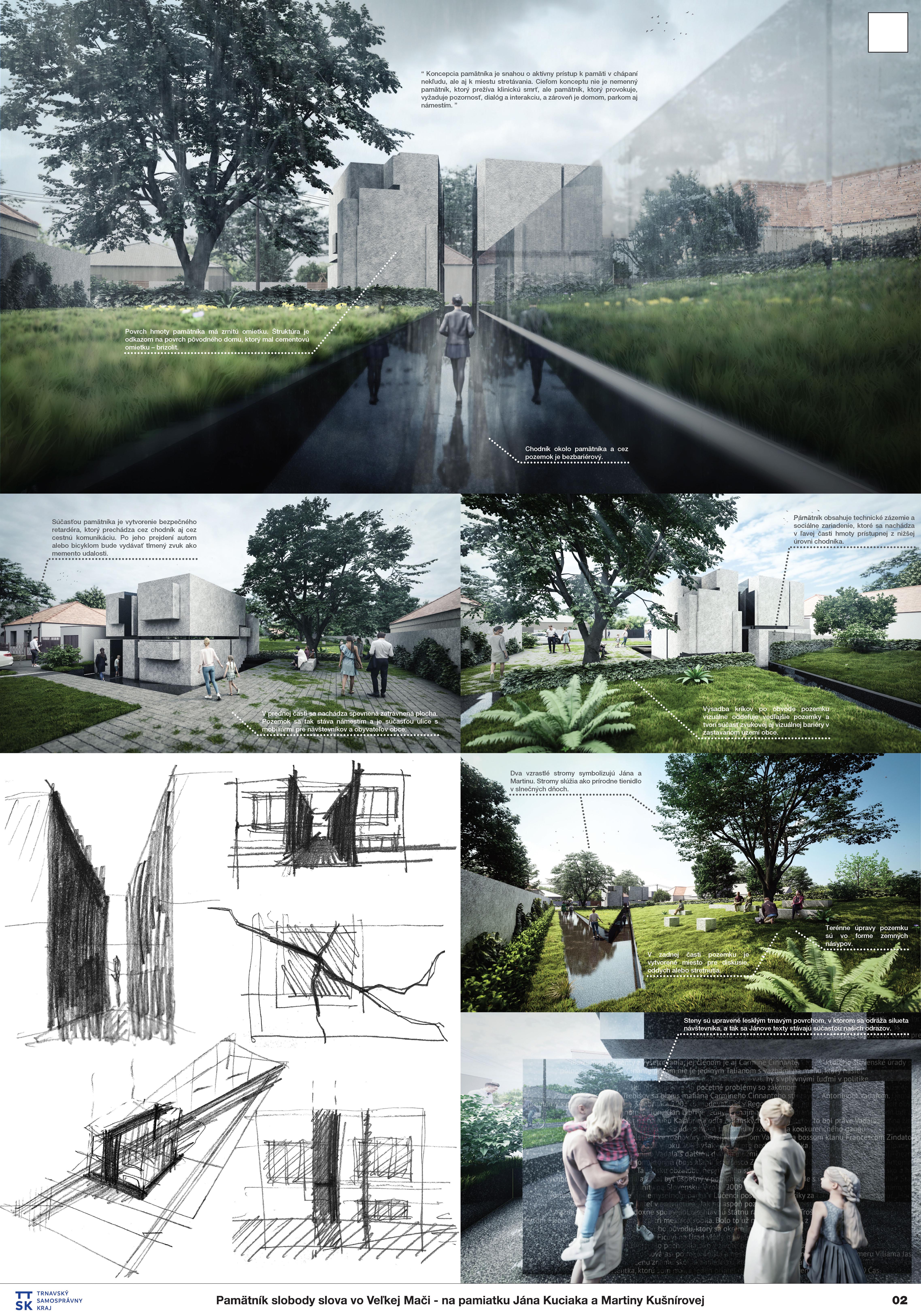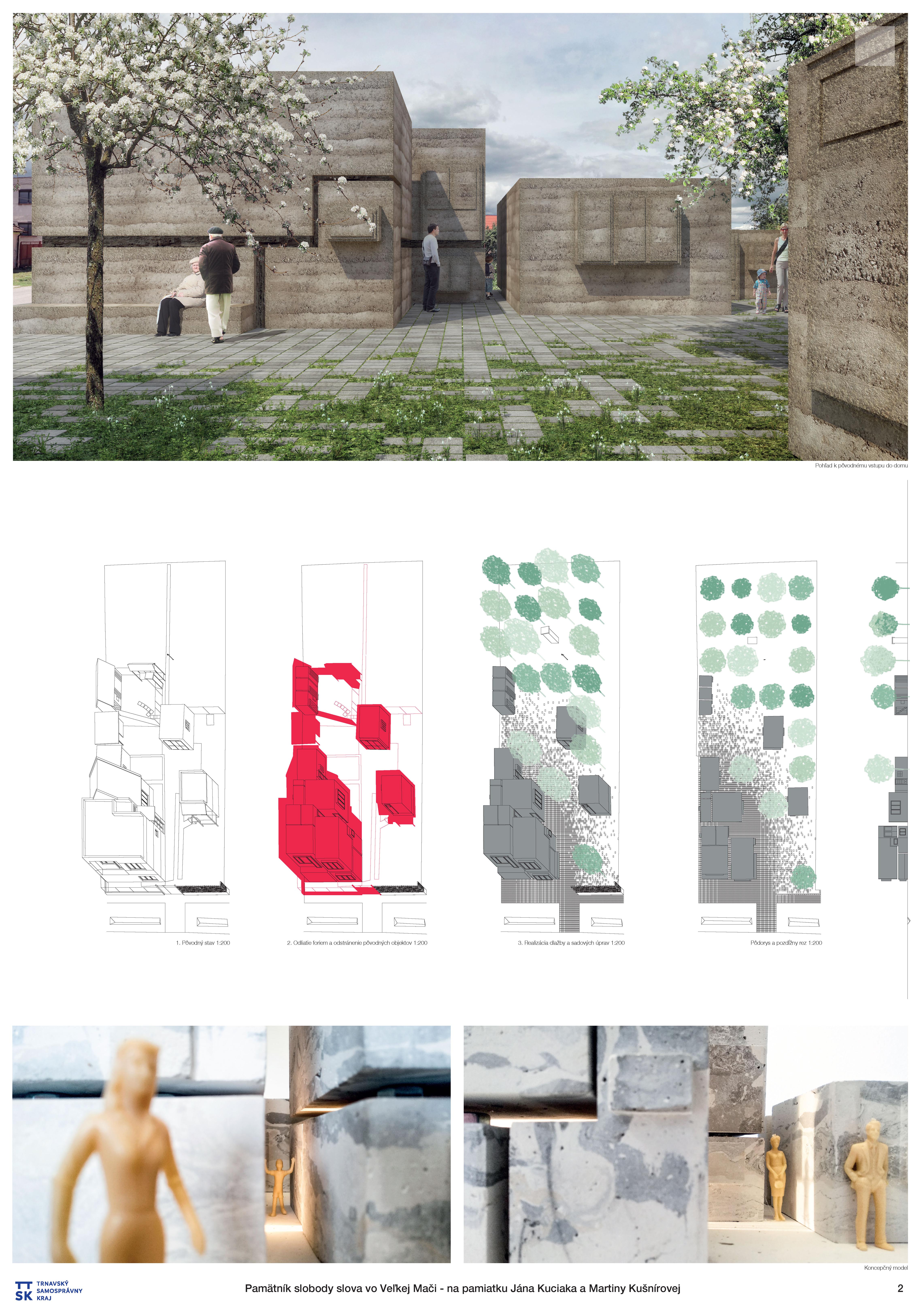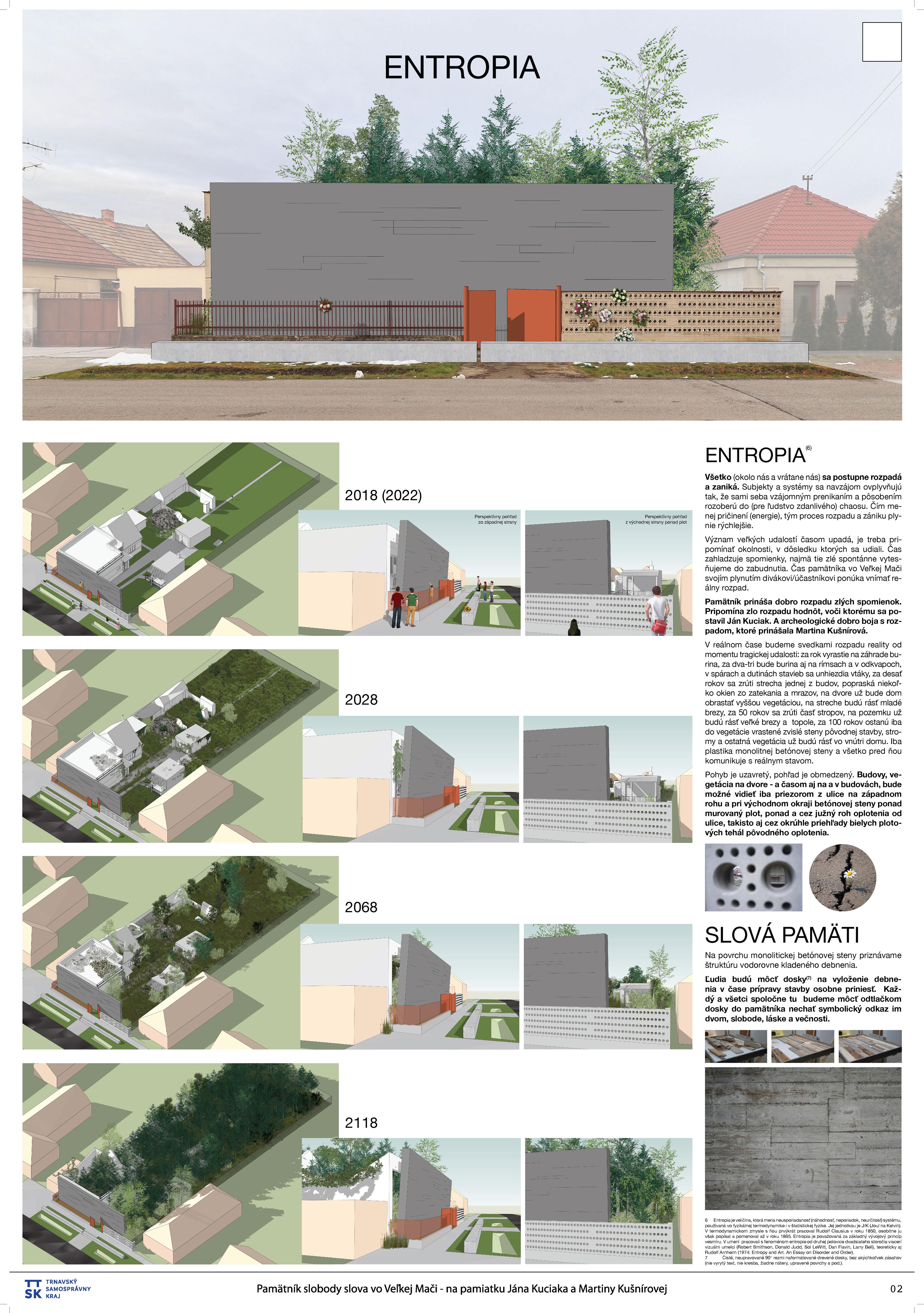 Koncept ako transformácia objektov a riešeného územia vo forme inverzných odliatkov, na ktoré sú použité recykláty materiálov z miest, kde sa odohrávali demonštrácie súvisiace s tragickou udalosťou. Tieto existujúce objekty akoby vo svojej novej podobe stuhli v hrôze času. Zostávajú nepriechodné, dostupné len pre chladný dotyk betónu. Ekologicko-participatívny prístup, postupného odlievania a celkového riešenia pamätníku má veľký spoločenský presah. Stvárnený je aj do gradientu dlažby, ktorá sa stráca v záhrade a plynulo prechádza do extenzívnej zelene s ovocným sadom, v ktorom je možné sa prejsť a spomínať. Nový verejný priestor má prehľadný a sociálny rozmer. Kontext územia je rešpektovaný, keďže zostali objekty zachované i keď v inej podobe, ale forma použitia materiálu pôsobí až príliš monumentálne a ťaživo. Návrh poukazuje na minulé udalosti a zachováva pamäť objektov a miesta. Čím trocha opomína pohľad do budúcnosti, ktorá nám chce byť inšpiráciou a motiváciou. Otázne je taktiež zachovanie všetkých existujúcich objektov, ako napr. hospodárske objekty či garáž, ktoré nemajú takú symbolickú pamäť a hodnotu. V danom koncepte sa javí nad rámec aj zachovanie časti uličného oplotenia v pôvodnom stave.