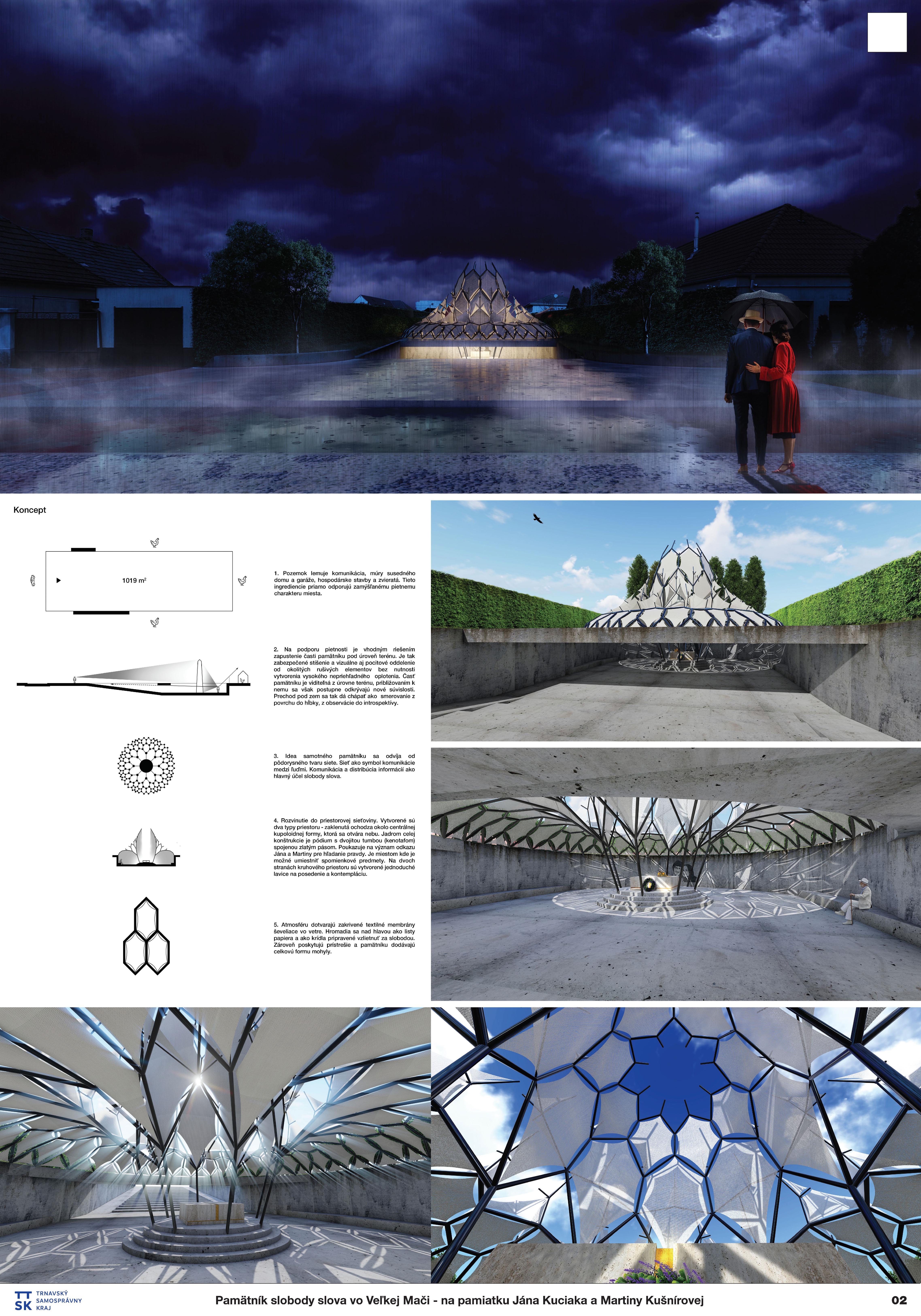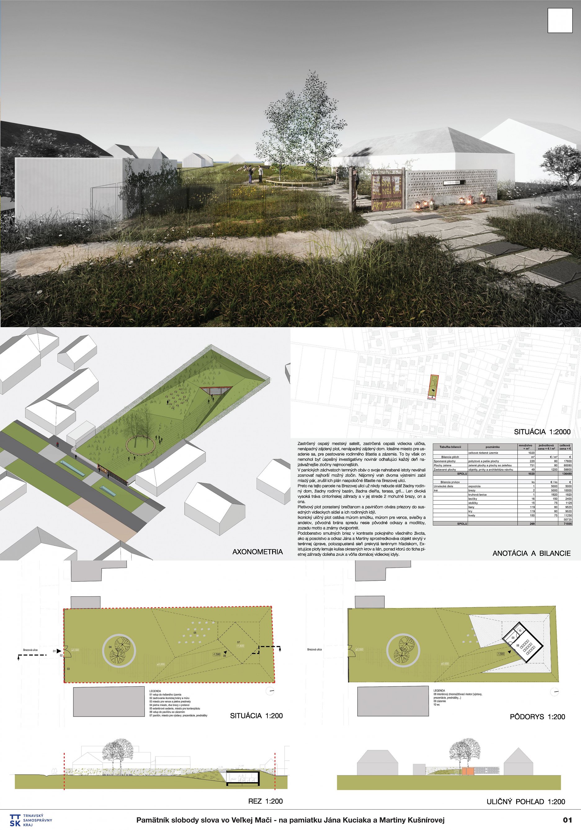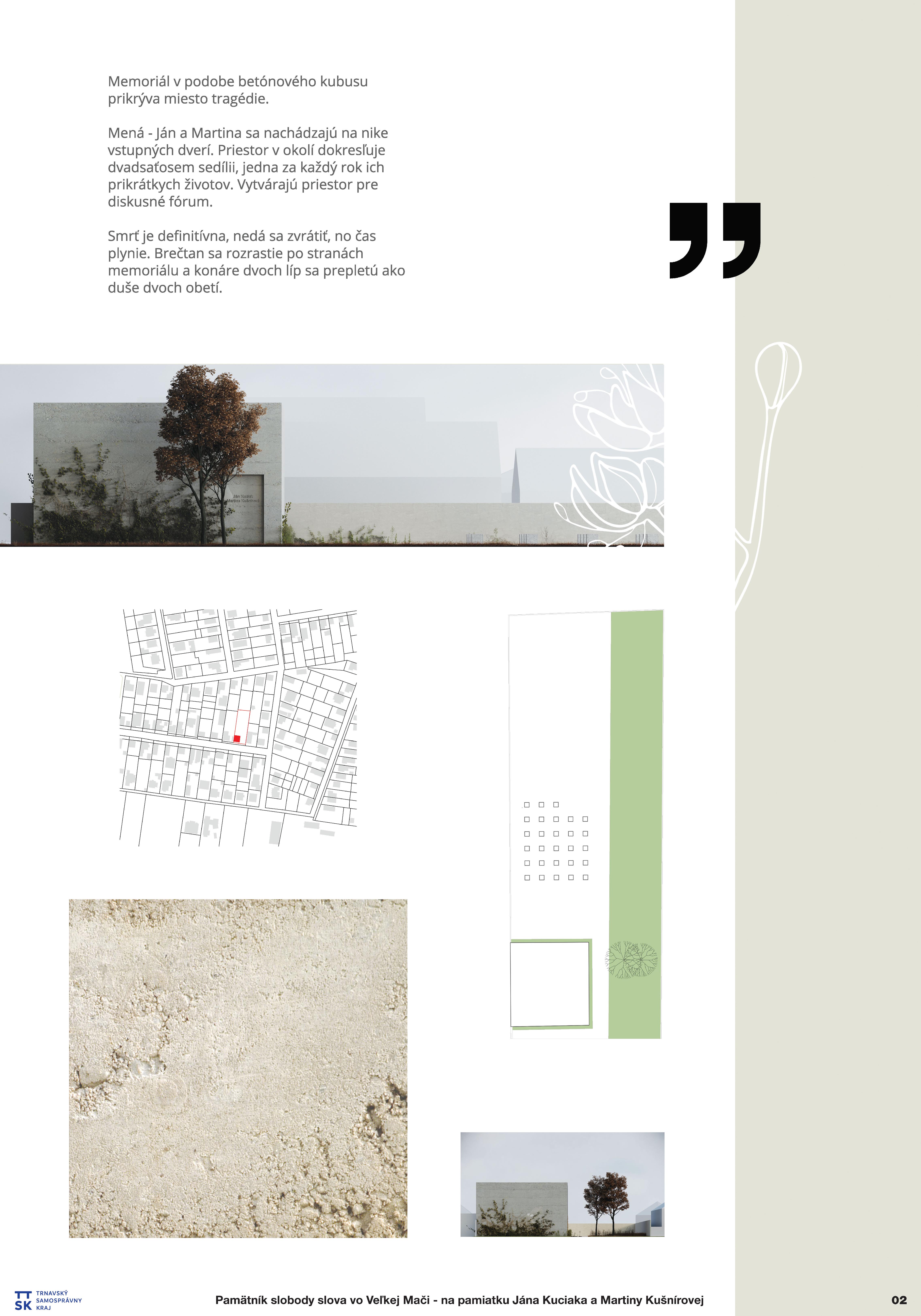 Koncept ako transformácia objektov a riešeného územia vo forme inverzných odliatkov, na ktoré sú použité recykláty materiálov z miest, kde sa odohrávali demonštrácie súvisiace s tragickou udalosťou. Tieto existujúce objekty akoby vo svojej novej podobe stuhli v hrôze času. Zostávajú nepriechodné, dostupné len pre chladný dotyk betónu. Ekologicko-participatívny prístup, postupného odlievania a celkového riešenia pamätníku má veľký spoločenský presah. Stvárnený je aj do gradientu dlažby, ktorá sa stráca v záhrade a plynulo prechádza do extenzívnej zelene s ovocným sadom, v ktorom je možné sa prejsť a spomínať. Nový verejný priestor má prehľadný a sociálny rozmer. Kontext územia je rešpektovaný, keďže zostali objekty zachované i keď v inej podobe, ale forma použitia materiálu pôsobí až príliš monumentálne a ťaživo. Návrh poukazuje na minulé udalosti a zachováva pamäť objektov a miesta. Čím trocha opomína pohľad do budúcnosti, ktorá nám chce byť inšpiráciou a motiváciou. Otázne je taktiež zachovanie všetkých existujúcich objektov, ako napr. hospodárske objekty či garáž, ktoré nemajú takú symbolickú pamäť a hodnotu. V danom koncepte sa javí nad rámec aj zachovanie časti uličného oplotenia v pôvodnom stave.