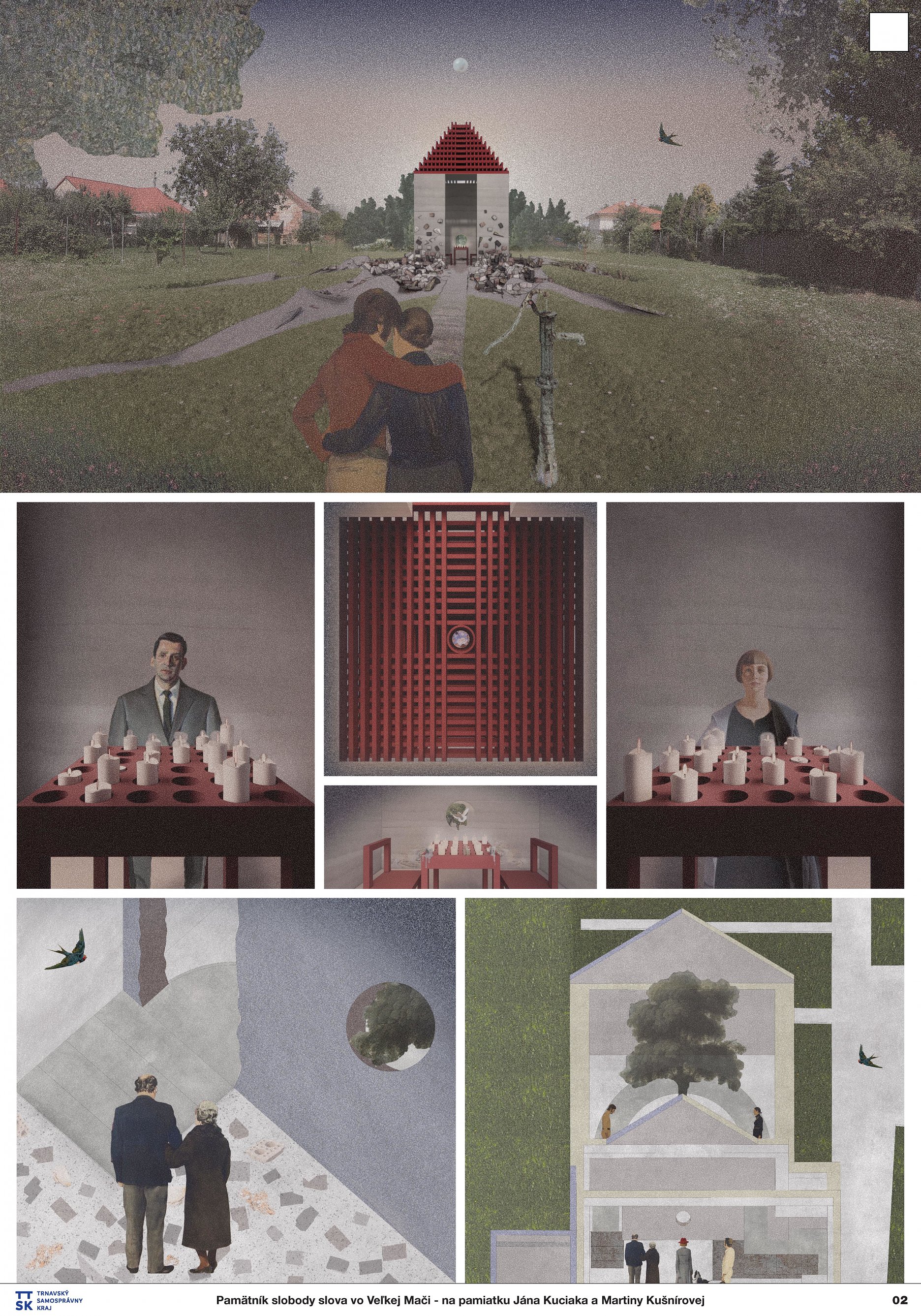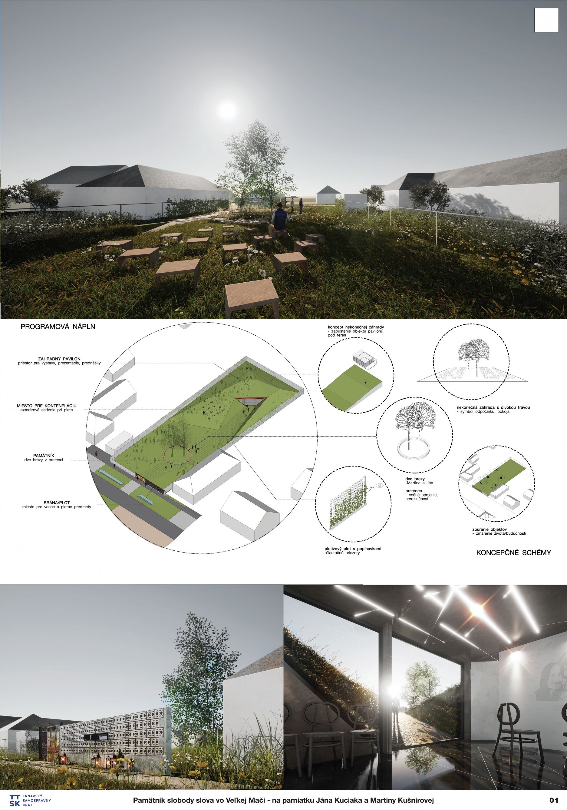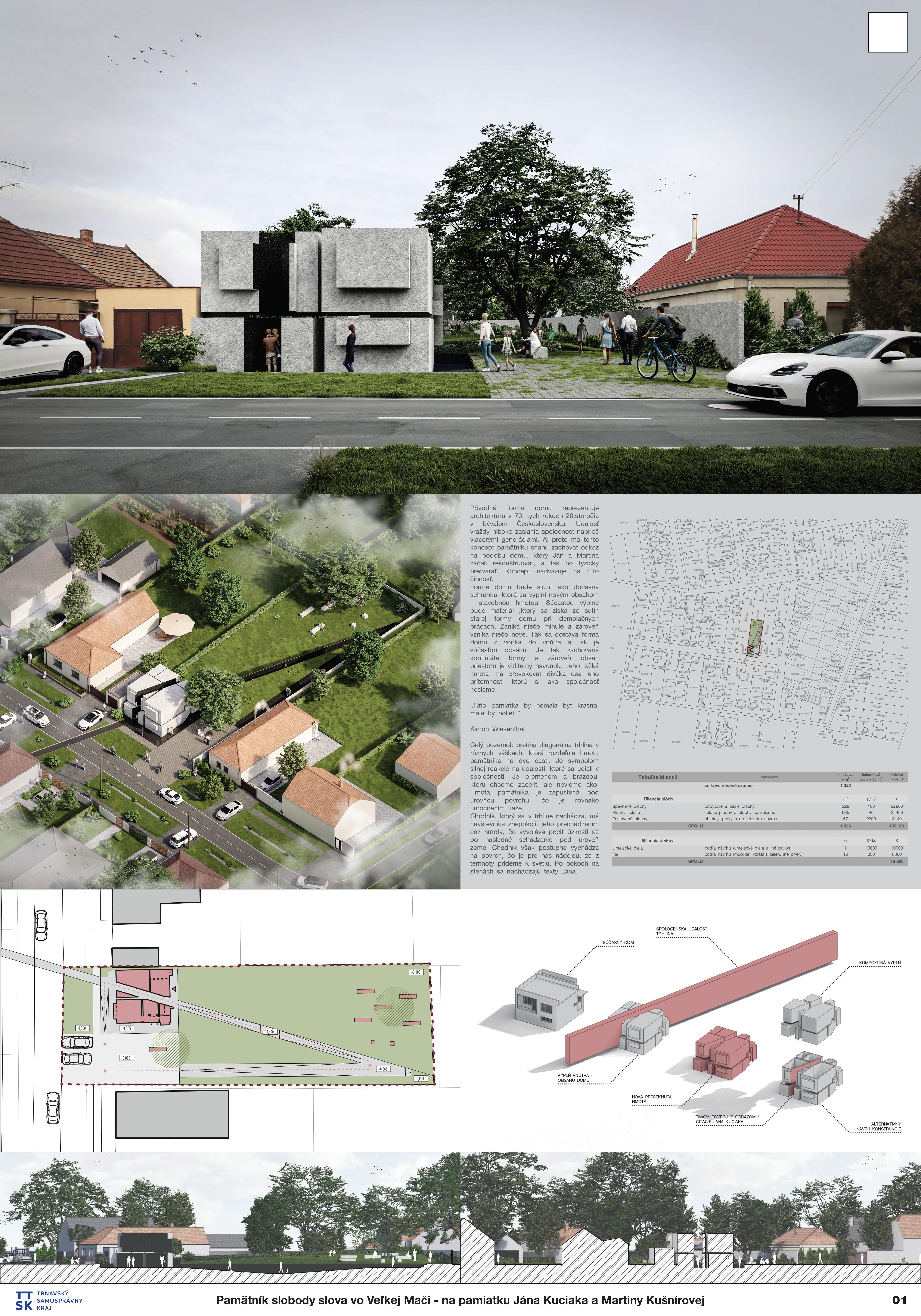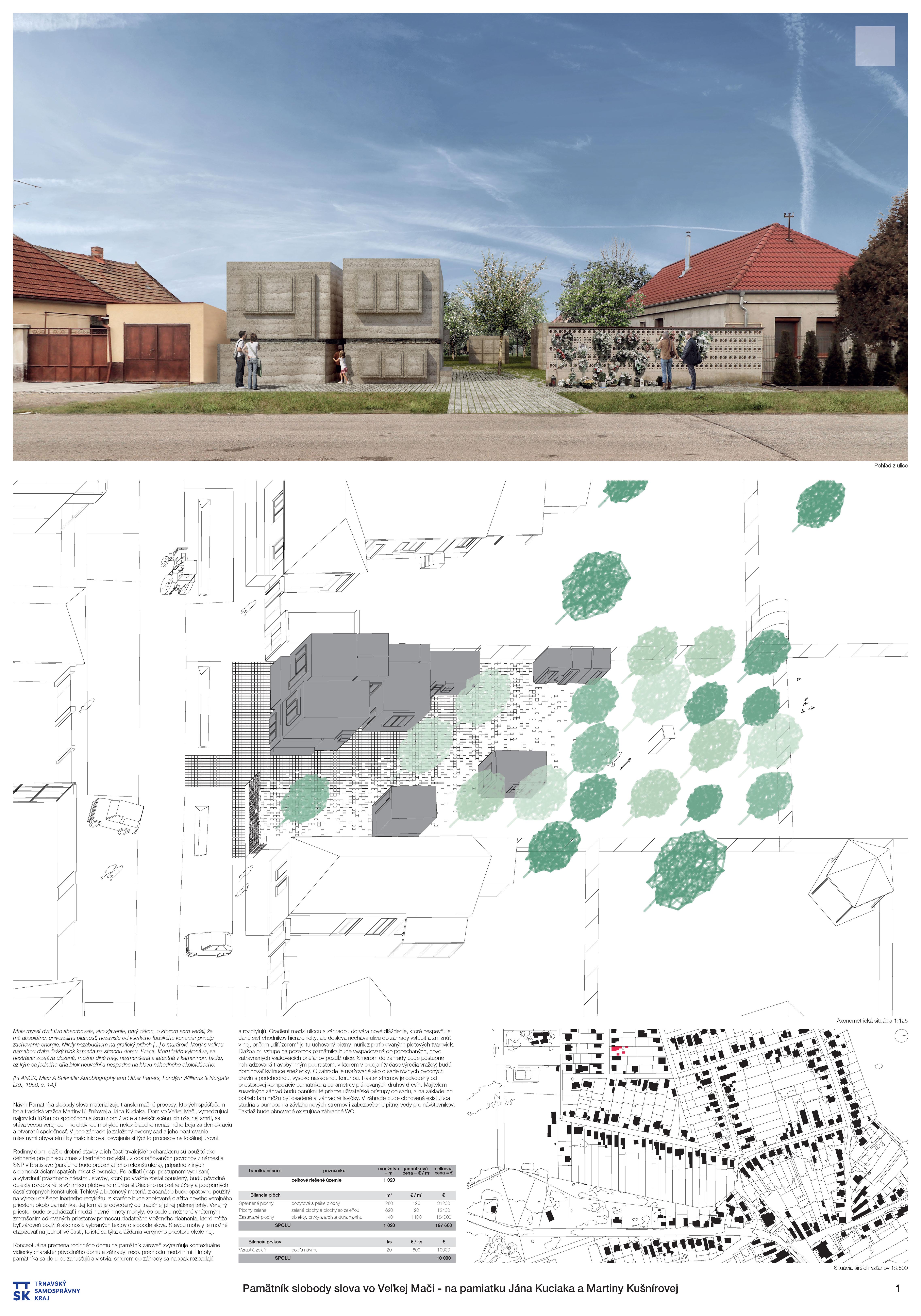 Koncept ako transformácia objektov a riešeného územia vo forme inverzných odliatkov, na ktoré sú použité recykláty materiálov z miest, kde sa odohrávali demonštrácie súvisiace s tragickou udalosťou. Tieto existujúce objekty akoby vo svojej novej podobe stuhli v hrôze času. Zostávajú nepriechodné, dostupné len pre chladný dotyk betónu. Ekologicko-participatívny prístup, postupného odlievania a celkového riešenia pamätníku má veľký spoločenský presah. Stvárnený je aj do gradientu dlažby, ktorá sa stráca v záhrade a plynulo prechádza do extenzívnej zelene s ovocným sadom, v ktorom je možné sa prejsť a spomínať. Nový verejný priestor má prehľadný a sociálny rozmer. Kontext územia je rešpektovaný, keďže zostali objekty zachované i keď v inej podobe, ale forma použitia materiálu pôsobí až príliš monumentálne a ťaživo. Návrh poukazuje na minulé udalosti a zachováva pamäť objektov a miesta. Čím trocha opomína pohľad do budúcnosti, ktorá nám chce byť inšpiráciou a motiváciou. Otázne je taktiež zachovanie všetkých existujúcich objektov, ako napr. hospodárske objekty či garáž, ktoré nemajú takú symbolickú pamäť a hodnotu. V danom koncepte sa javí nad rámec aj zachovanie časti uličného oplotenia v pôvodnom stave.