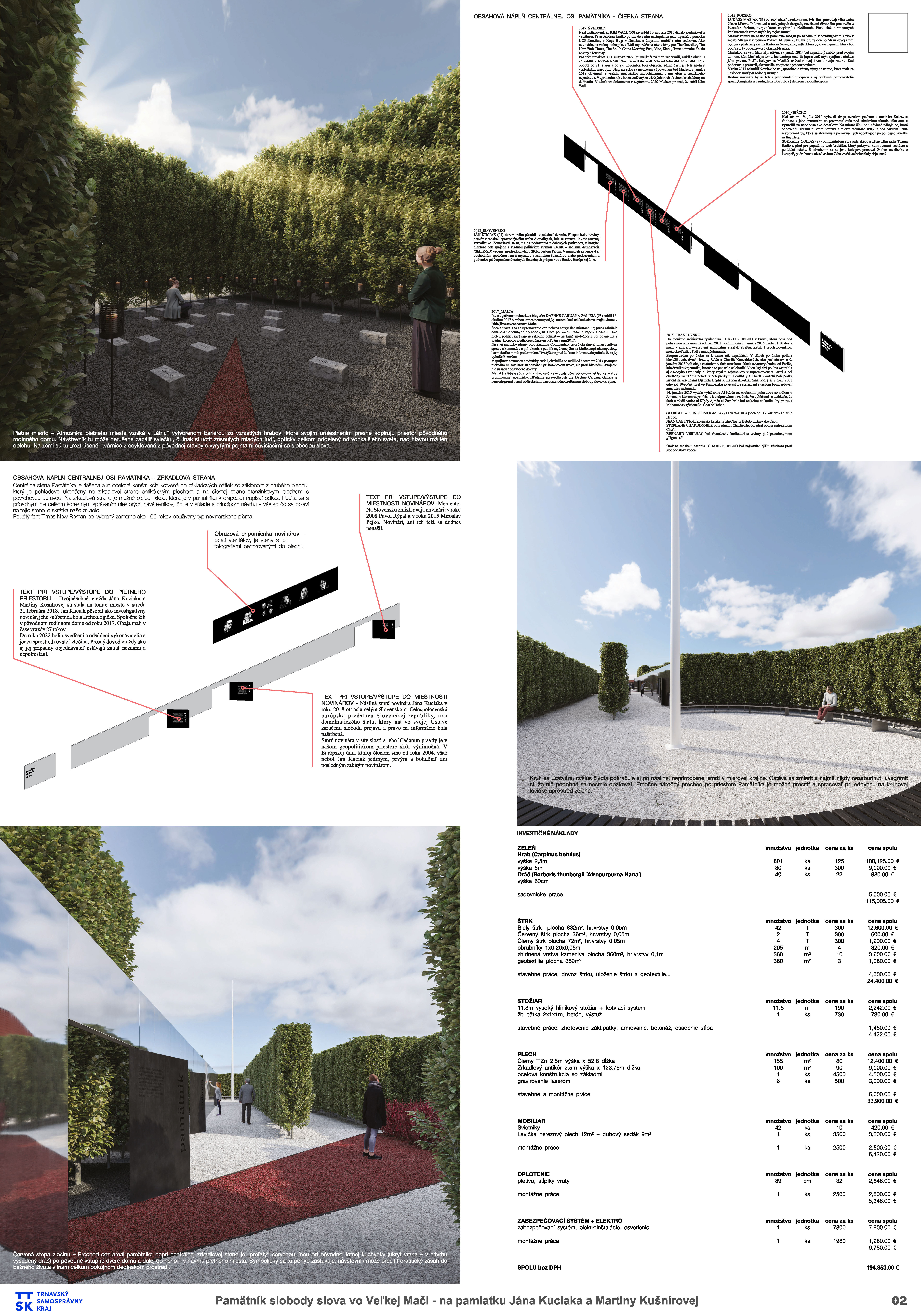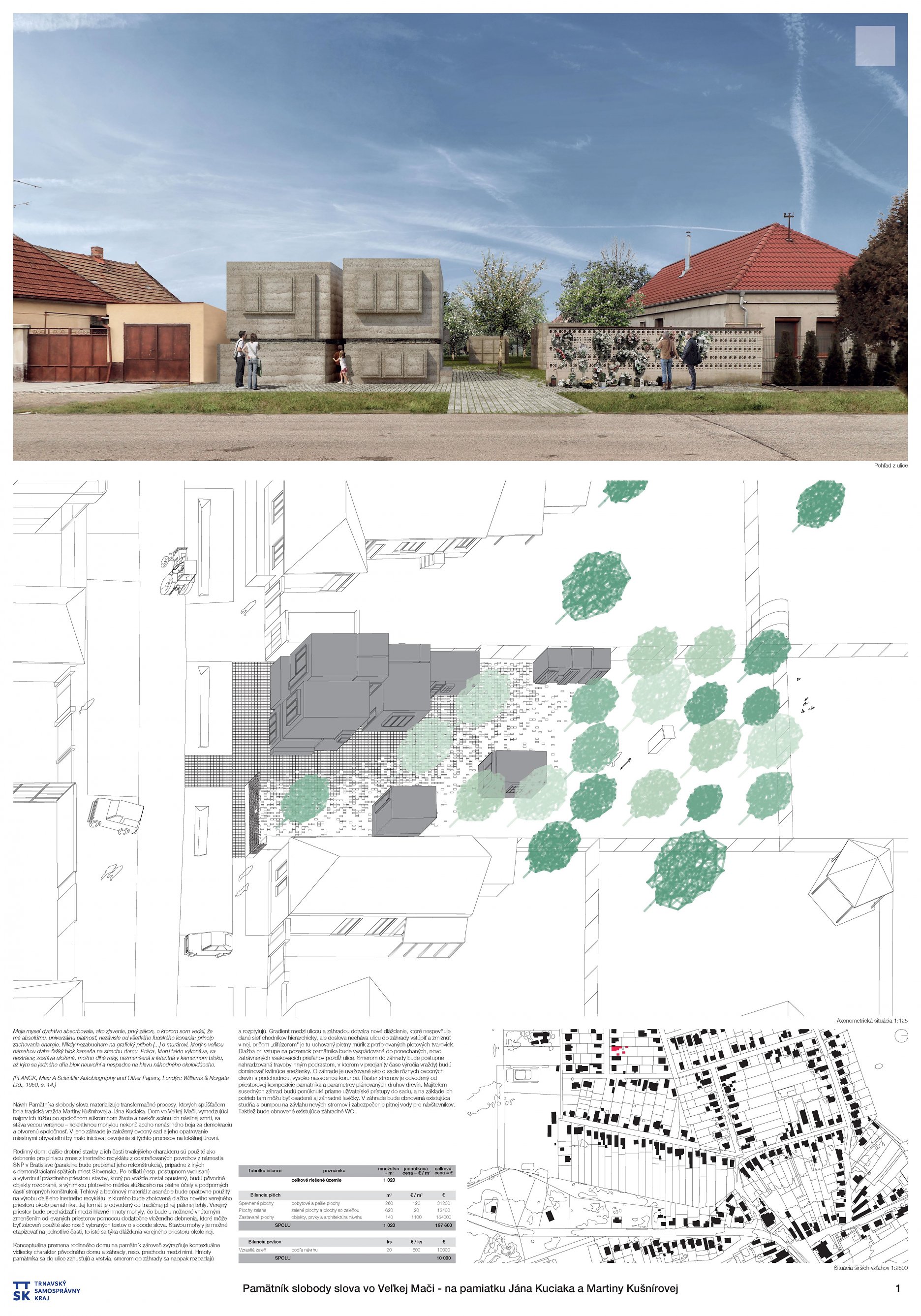 Súkromie ako nedotknuteľný priestor, ktorý rešpektuje právo nebyť videný. Minimalistický koncept si osvojil tému súkromia, ktorá zostáva čitateľná aj stvárnením pamätníka. Celý priestor riešeného územia je venovaný záhrade, ktorá je tvorená vybranou skladbou rastlín a drevín. Nejedná sa tak o neudržiavaný prales, ale vedome komponovanú zelenú záhradu, ktorá má vytvárať bariéru nepriepustnosti, ochranu súkromia do ktorej sa nedá vstúpiť fyzicky, len duševne. Koncept, ktorý je blízky Japonským záhradám. Verejne prístupný tak zostáva nástup na riešené územie, ktoré je tvorené od uličnej strany betónovou stenou s čiastočne zapustenou spevnenou plochou, umiestnenou za ňou. Aj tu je viditeľná práca s rešpektovaním súkromia návštevníkov, ktorí sa rozhodnú pamätník navštíviť, a ktorí zostanú skrytí od uličných pohľadov. Betónová línia ohraničujúca hustú záhradu ešte viac zvýrazňuje jej neprístupnosť. Jednoduché riešenie dvoch materiálových rovín betónu a zelene vytvára priestor pre kontempláciu aj zhromažďovanie. Zároveň kompozícia udržuje líniu stavebnej čiary a atraktívne opticky nadväzuje na okolitú zástavbu. Betónové oplotenie striktne ohraničuje záhradu od susedných pozemkov, čím väčšmi zdôrazňuje deliacu hranu intimity. Celkovo ale riešenie napriek citlivému konceptu vytvára príliš veľké množstvo neprístupných miest. Vzniká otázka dlhodobej udržateľnosti návrhu, ktorému chýba vizuálna kontrola a môže podliehať znehodnocovaniu. Chýba vizuálne označenie pamätníka vo vstupnej časti.