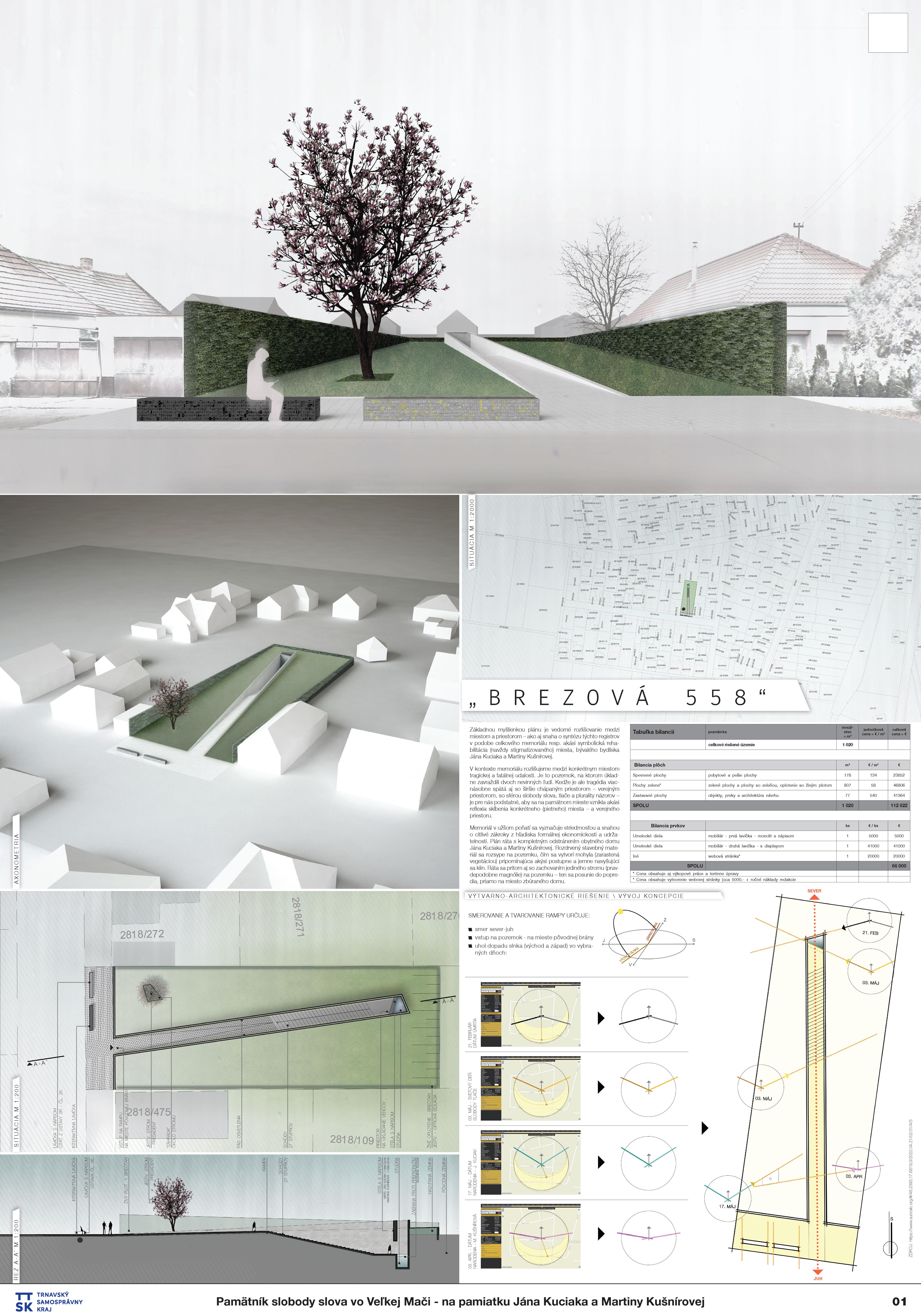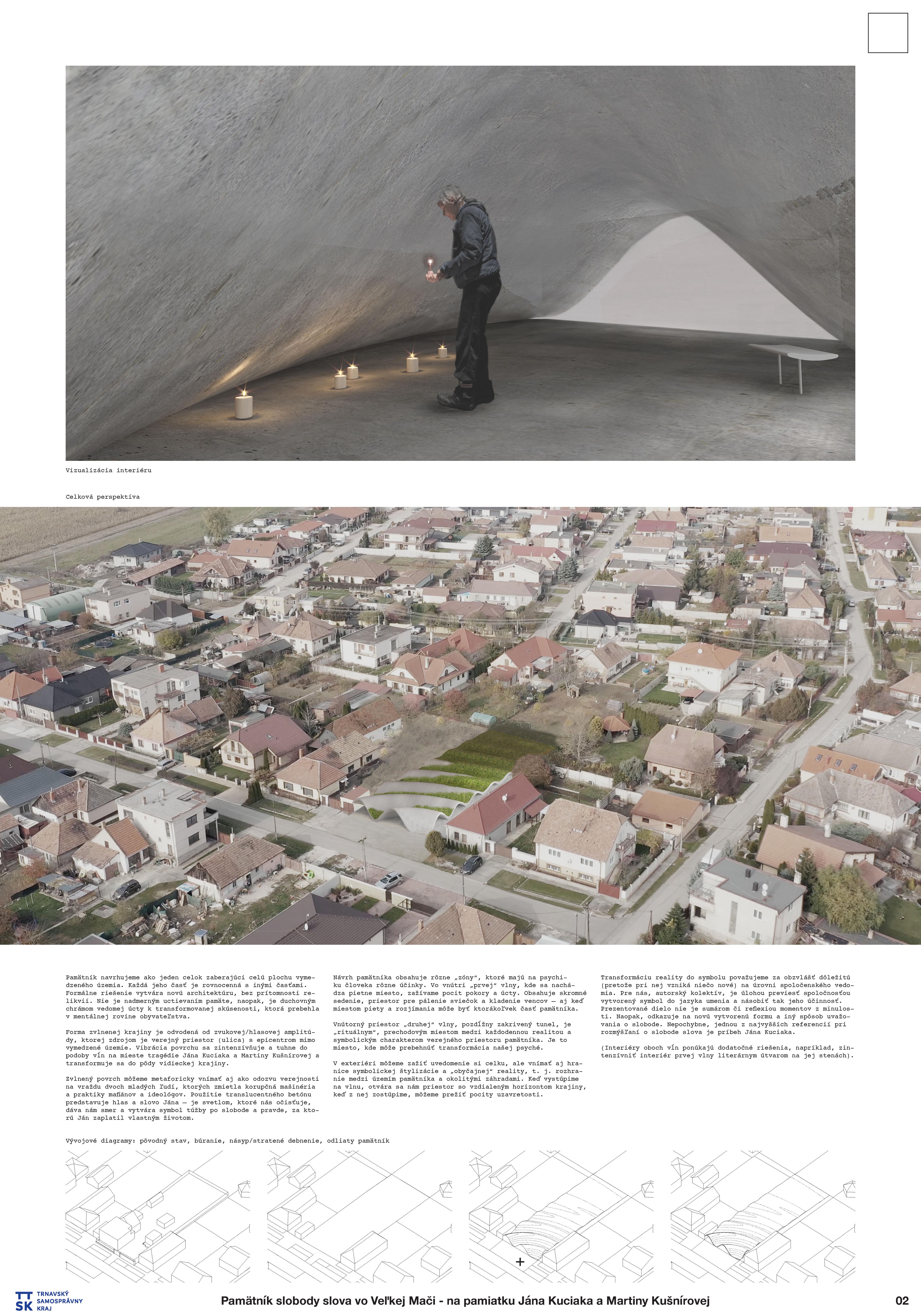 Naklonenie, nerovnováha a vychýlenie sú hlavnou symbolikou a konceptom návrhu, ktorý prezentuje jednoduché a silné gesto k tragickej udalosti. Na jednej strane berie, ale na druhej pridáva. Zrozumiteľný jazyk práce s terénom vytvára niekoľko rovín priestorového prežitia. Z ulice takmer neviditeľný, len s náznakom nového horizontu na opačnej strane pozemku. Betónový objekt hlavného vstupu so zázemím vytvára v území obce veľmi citlivý zásah s minimálnou výškou do úrovne zábradlia so zelenou kulisou živého plota. Možnosť takýto priestor v prípade potreby uzatvoriť je vnímané pozitívne. Samotný pamätník, resp. jeho komponenty, umne pracujú s veľkorysou záhradou a atmosférami, ktoré je možné zažiť aj v nepriaznivom počasí. V zapustenej časti pamätníka môže návštevník ľahko zabudnúť na okolie v ktorom sa nachádza a v závetrí kontemplovať. Zdvihnutá záhrada zas ponúka opak a otvára nový pohľad do budúcnosti. Takto prístupné plochy majú spoločenský presah a potenciál. Aj napriek vizuálne osobitej a expresívnej prezentácií návrhu je pamätník jednoznačnou a príťažlivou odpoveďou na podobu pamätníka v zástavbe rodinných domov. Nedomyslené je konštrukčné riešenie naklonenej záhrady a materiálové riešenie týchto oporných plôch, ktoré ju budú v teréne tvarovať. Otázna je aj bezpečnosť pohybu návštevníkov a súkromia okolitých objektov, na okraji zdvihnutej záhrady. Jasný nebol ani účel použitia veľkých kamenných prvkov v rámci záhrady, resp. je potrebné doplniť návrh mobiliáru. Súťažný návrh má silný koncept. Treba však detailne dopracovať konštrukčné a materiálové riešenia prvkov a objektov. Chýba vizuálne označenie pamätníka vo vstupnej časti a riešenie plôch medzi cestnou komunikáciou a vstupom do pamätníka.