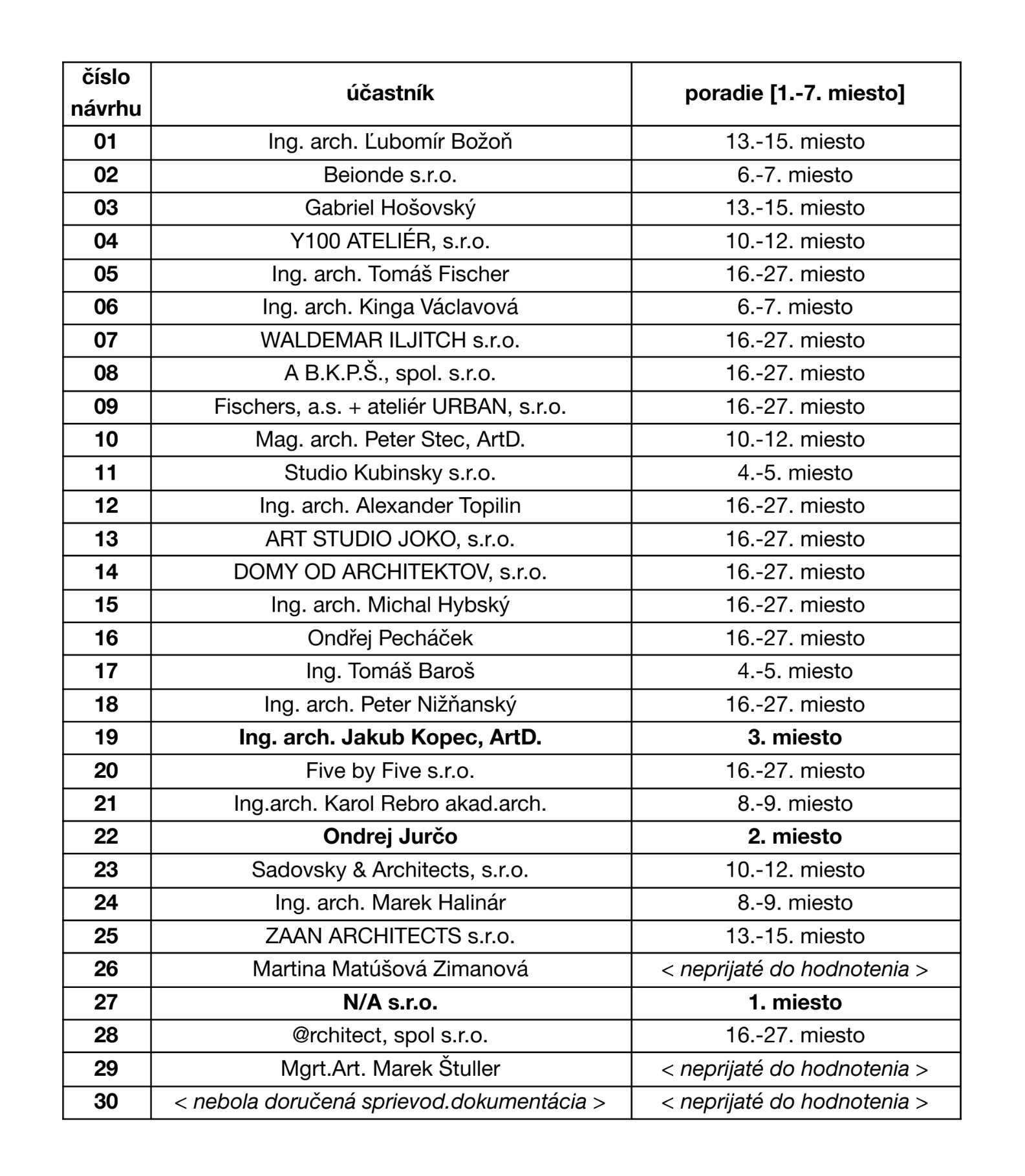 Zoznam účastníkov a celkové poradie návrhov v hodnotení: