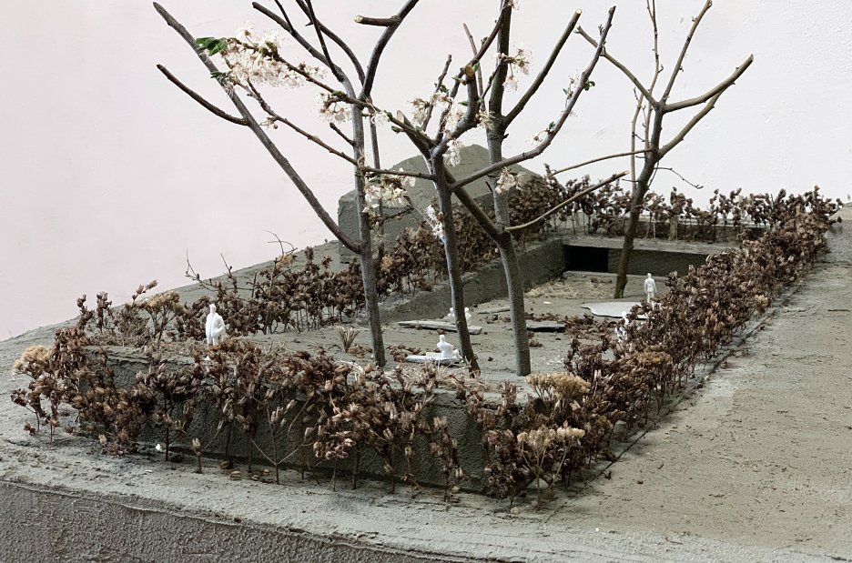 Koncept cudzorodých prvkov, ktoré tvarujú pôvodnú formu zástavby je abstraktným vyjadrením situácie. Názorovo silné stvárnenie hmoty v rastri naznačuje prehľadnosť s potenciálom blúdenia a strácania sa v čase. Do pamätníka sa dá vstúpiť a predsa je kompozícia príliš hustá na plynulý prechod. Opticky klamlivá ľahkosť je v kontraste s momentom prekvapenia, keď návštevník do pamätníka vstúpi. Charakter návrhu je skôr mestský a pôsobí až nehumánne v prostredí dediny. Všadeprítomné tvrdé plochy tmavého štrku a betónu podtrhujú toto nehostinné prostredie, kde je zachovaný len jediný strom. Vysoké oplotenie pozemku so zanechanými odkazmi túto hostilnosť len zvýrazňuje.
