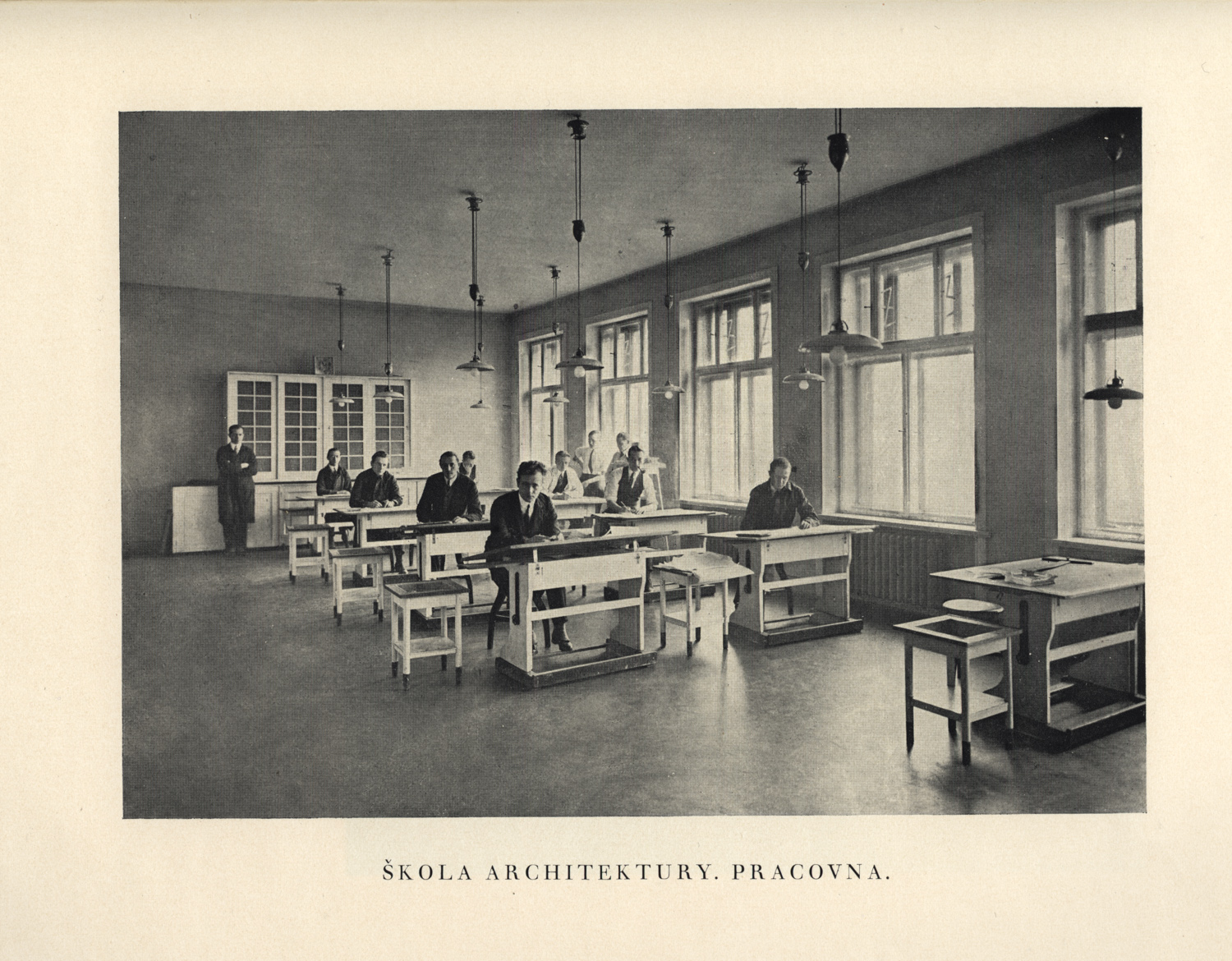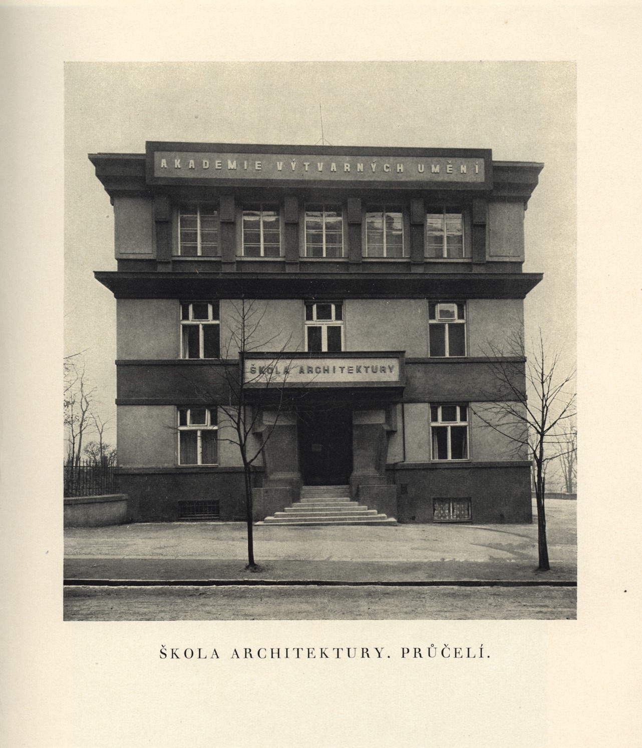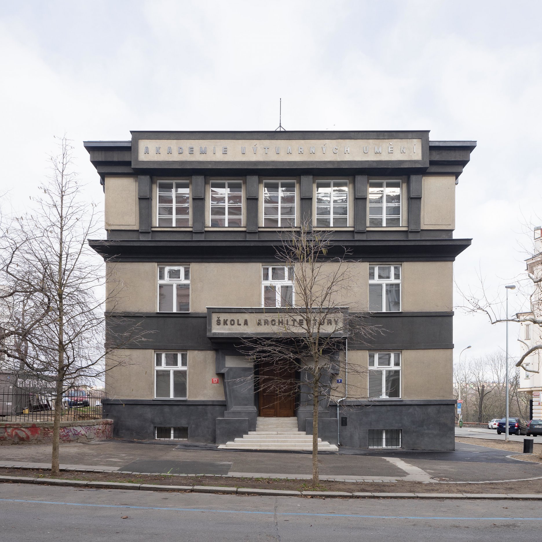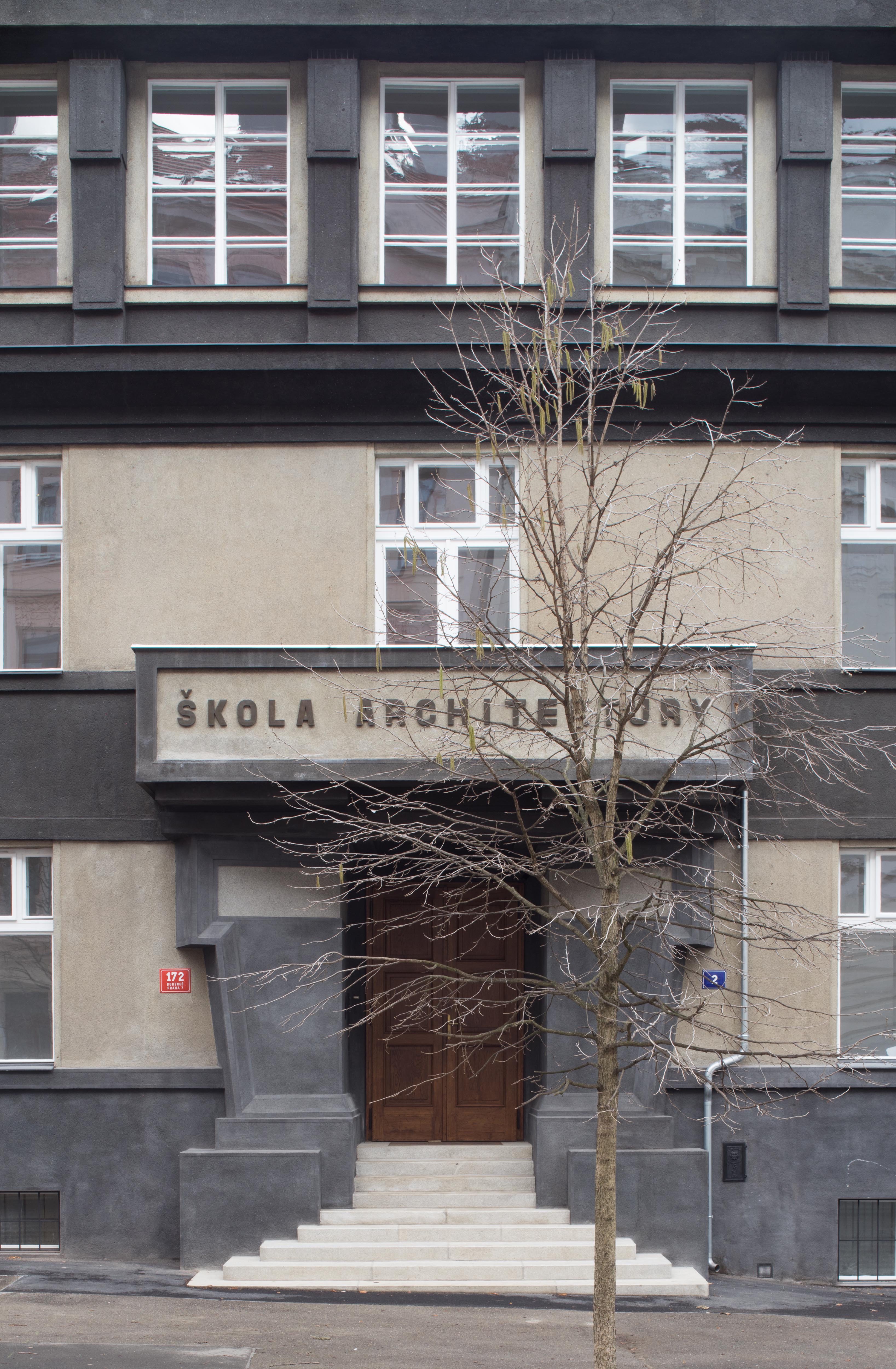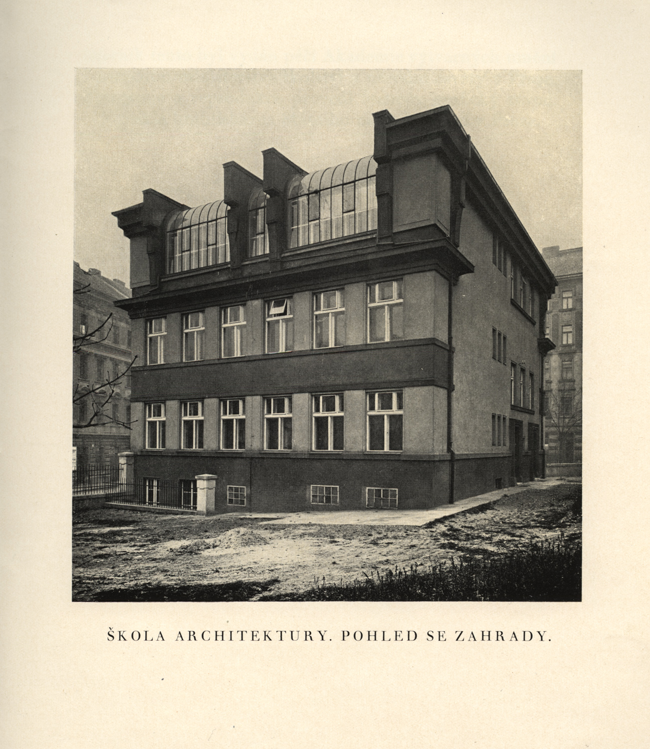 Škola architektury byla založena v roce 1910 architektem Janem Kotěrou (1871 - 1923), který chtěl tímto aktem demonstrovat, že architektura je nejenom technická, ale i umělecká disciplína. Jan Kotěra, žák Otto Wagnera na vídeňské Akademii a poté dlouholetý profesor na Uměleckoprůmyslové škole v Praze, byl zakladatelskou osobností české moderní architektury. Vychoval dlouhou řadu žáků, které v rámci Akademie nejdříve vyučoval ve svém ateliéru v Hradešínské ulici na Vinohradech. V letech 1919 - 1920 vypracoval projekt budovy Školy architektury, respektive dvou paralelních samostatných budov po boku Akademie, určených pro architekturu a grafiku (druhá budova nikdy nebyla postavena). Budova byla projektována jako jednopatrová stavba se stanovou střechou ve stylu rané moderny s prvky doznívajícího kubismu na výrazném portálu. Po Kotěrově smrti se jeho nástupcem stal architekt Josef Gočár (1880 - 1945), který projekt svého učitele využil a rozšířil o patrovou nástavbu s rovnou střechou a funkcionalistickými ateliérovými okny na sever. Budova dokončená v roce 1924 vznikla jako provizorium bez popisného čísla. Za války, kdy byla škola architektury uzavřena, sídlil zde Archeologický ústav. Po válce školu v interiéru upravil architekt Jaroslav Fragner, nové osvětlení navrhoval Jaroslav Fischer. V roce 1947 byla ve druhém patře umístěna restaurátorská škola, později ateliér profesora Oldřicha Oplta a po roce 1990 ateliér architektury prof. Emila Přikryla a nových médií profesora Michaela Bielického. Dnes jsou v budově umístěny ateliéry a knihovna Školy architektury Miroslava Šika, Nová média Tomáše Svobody a nově bude sloužit i pro Digitální laboratoř.
