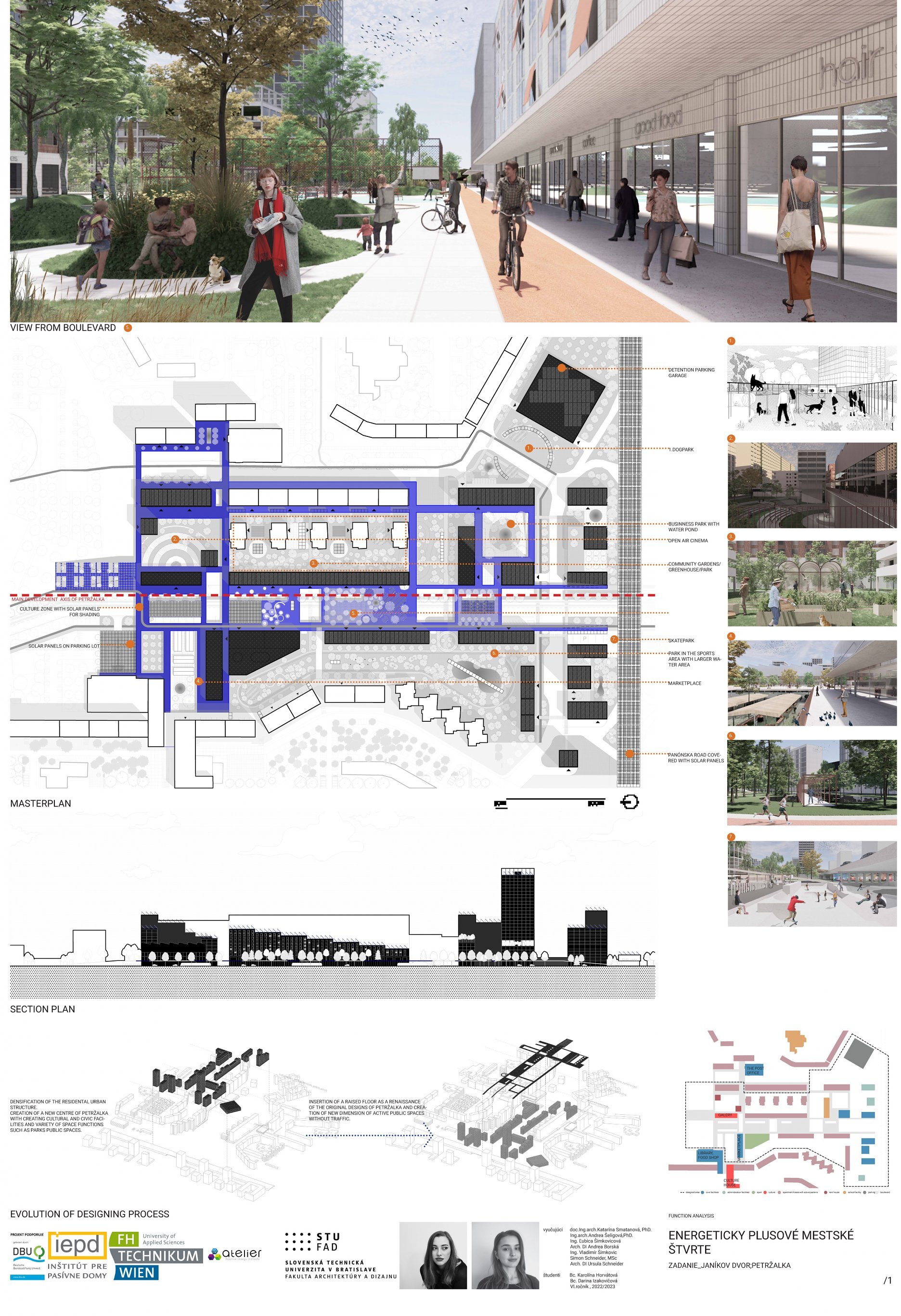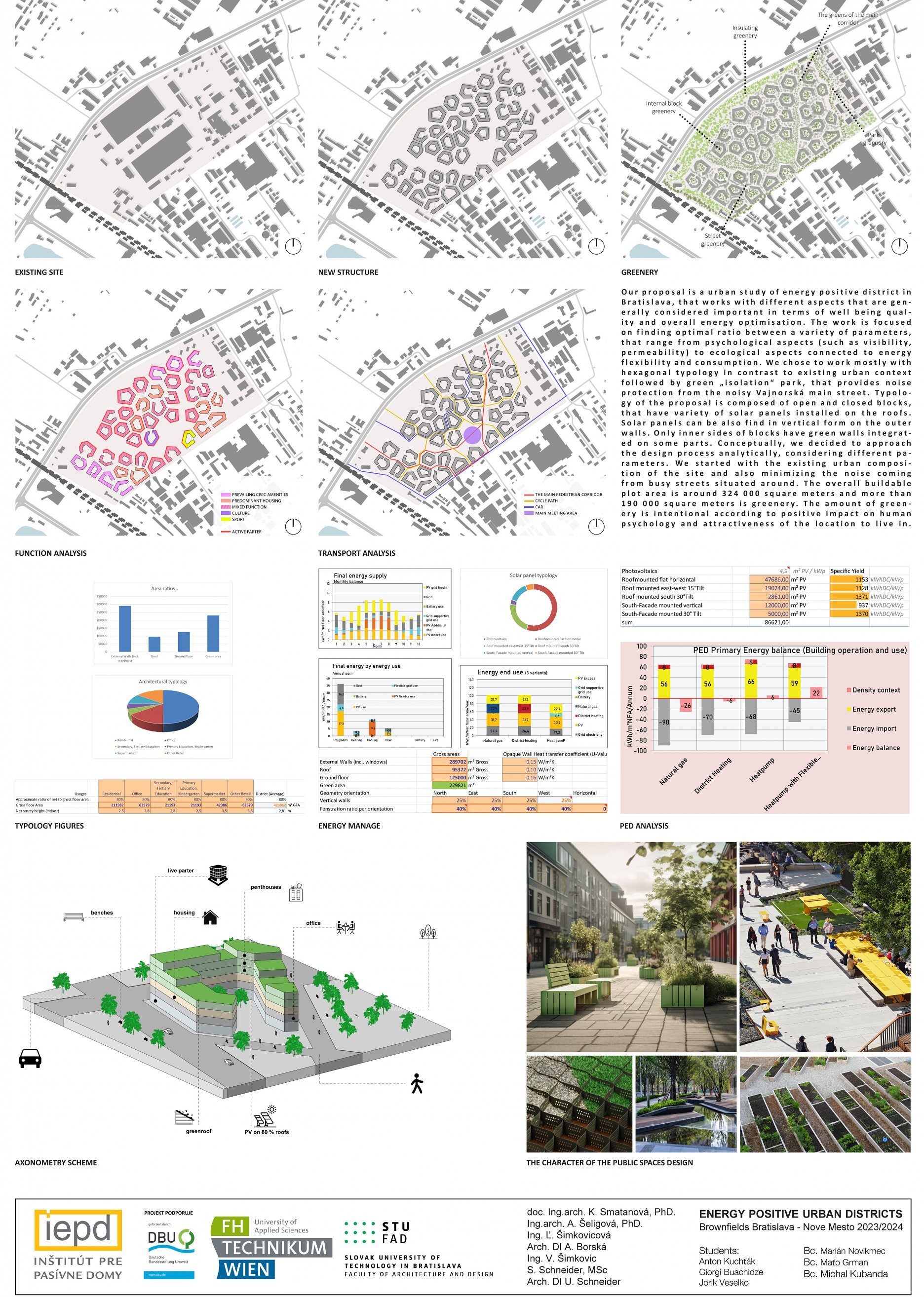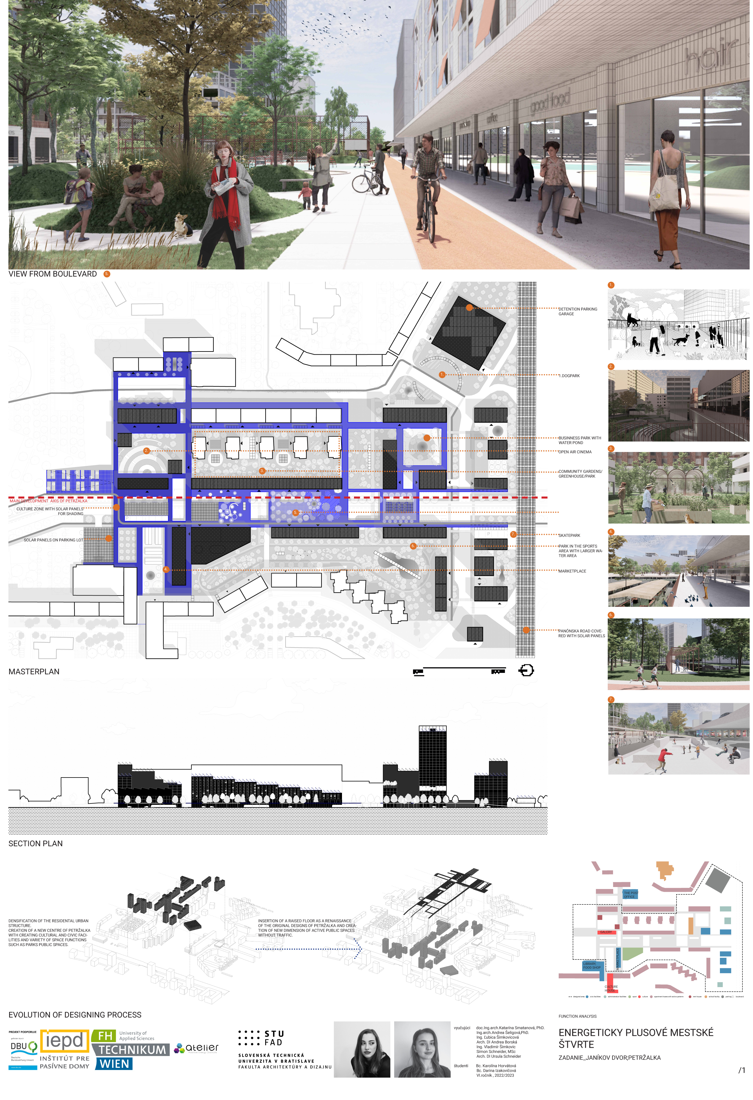 Záverečná prezentácia a hodnotenie študentských projektov ukázali rôznorodosť návrhov a tvorivosť, ktorej sa ani pri navrhovaní energeticky plusových štvrtí medze nekladú. Porotu tvorili pedagógovia predmetu, vedúca Ústavu urbanizmu a územného plánovania FAD STU doc. Ing. arch. Katarína Smatanová, MA, PhD., výskumný pracovník FHT Simon Schneider, MSc., architektka DI Ursula Schneider z POS architekten a odborníci z Inštitútu pre pasívne domy Ing. Ľubica Šimkovicová, DI Andrea Borská a Ing. Vladimír Šimkovic.
