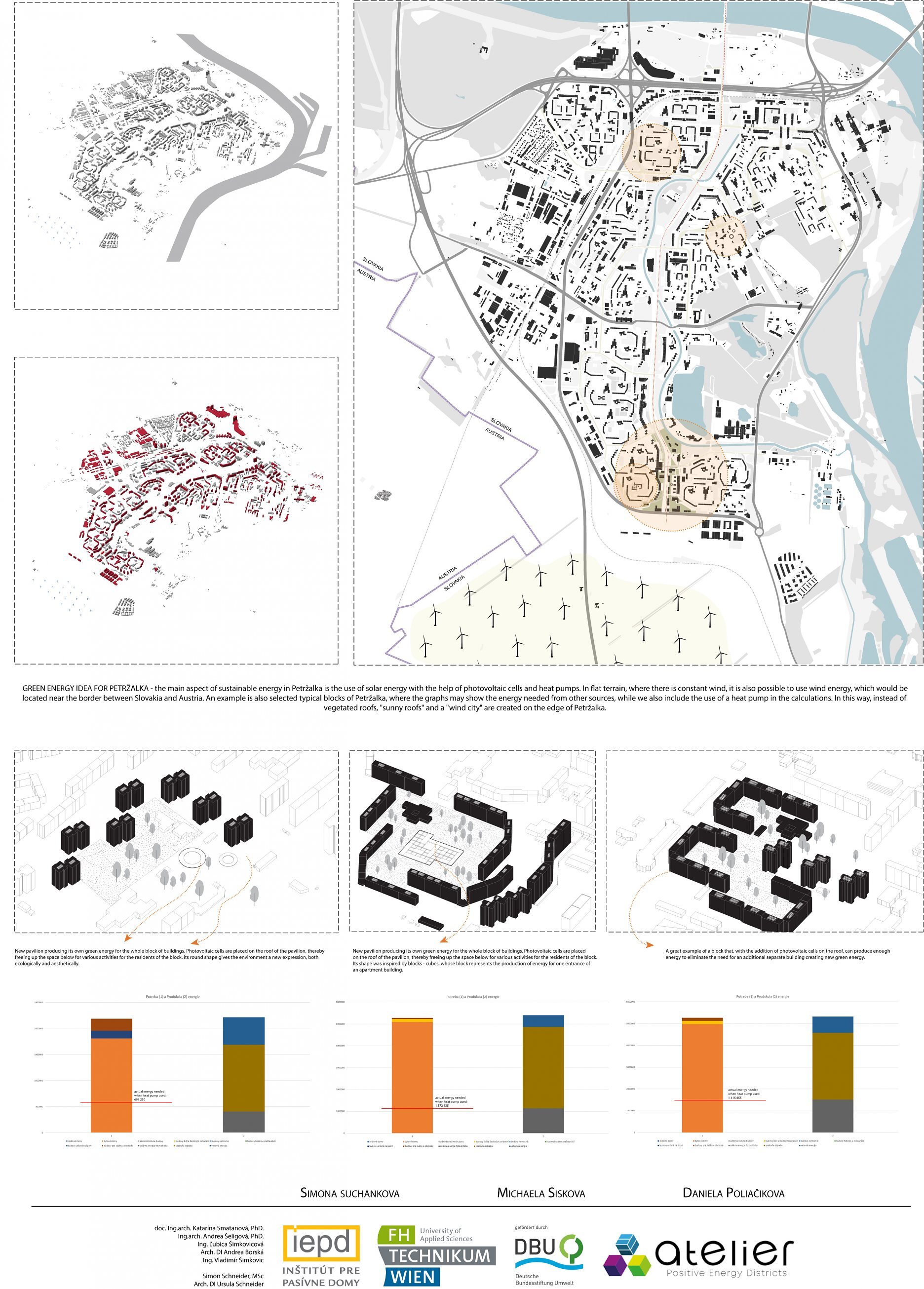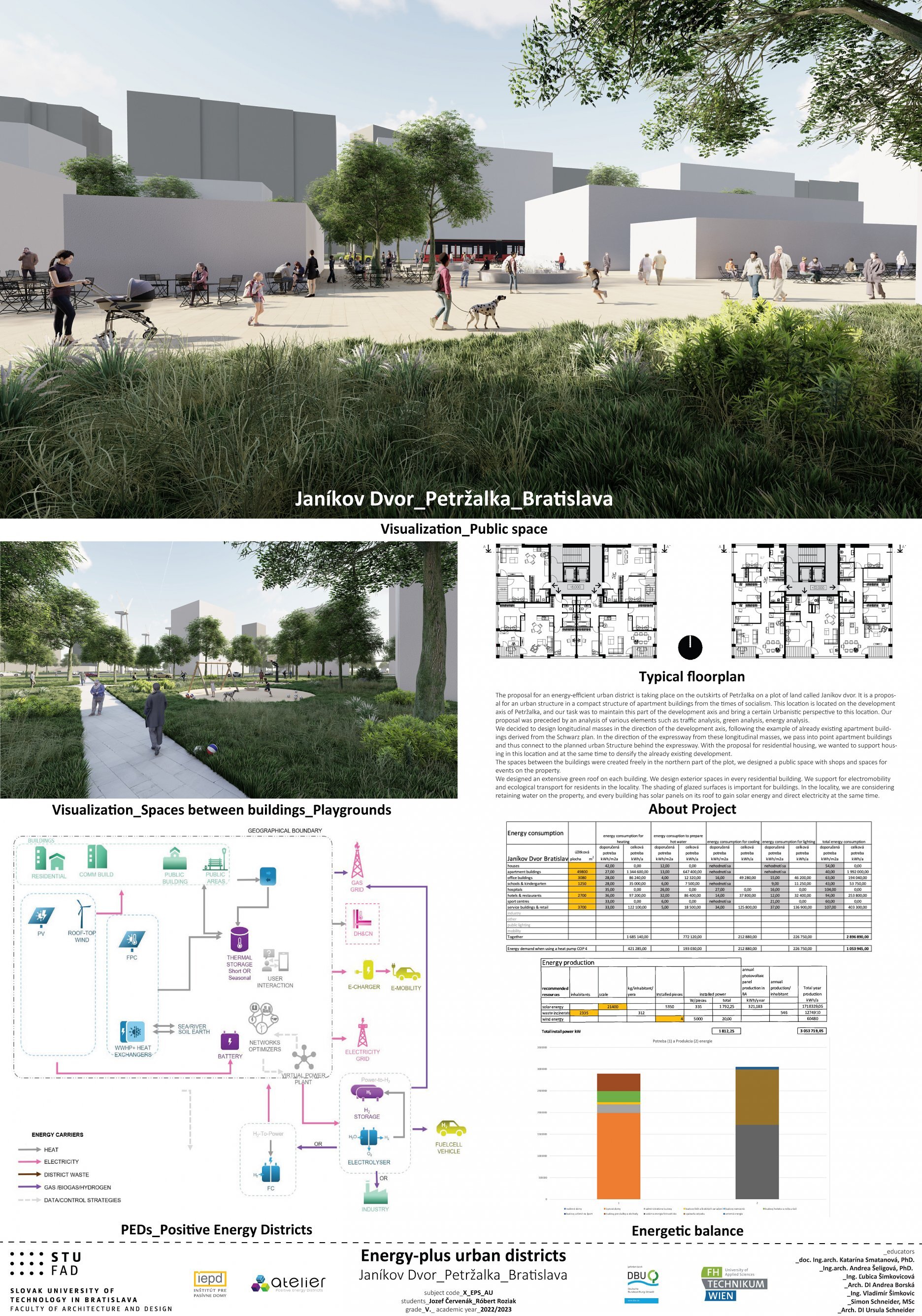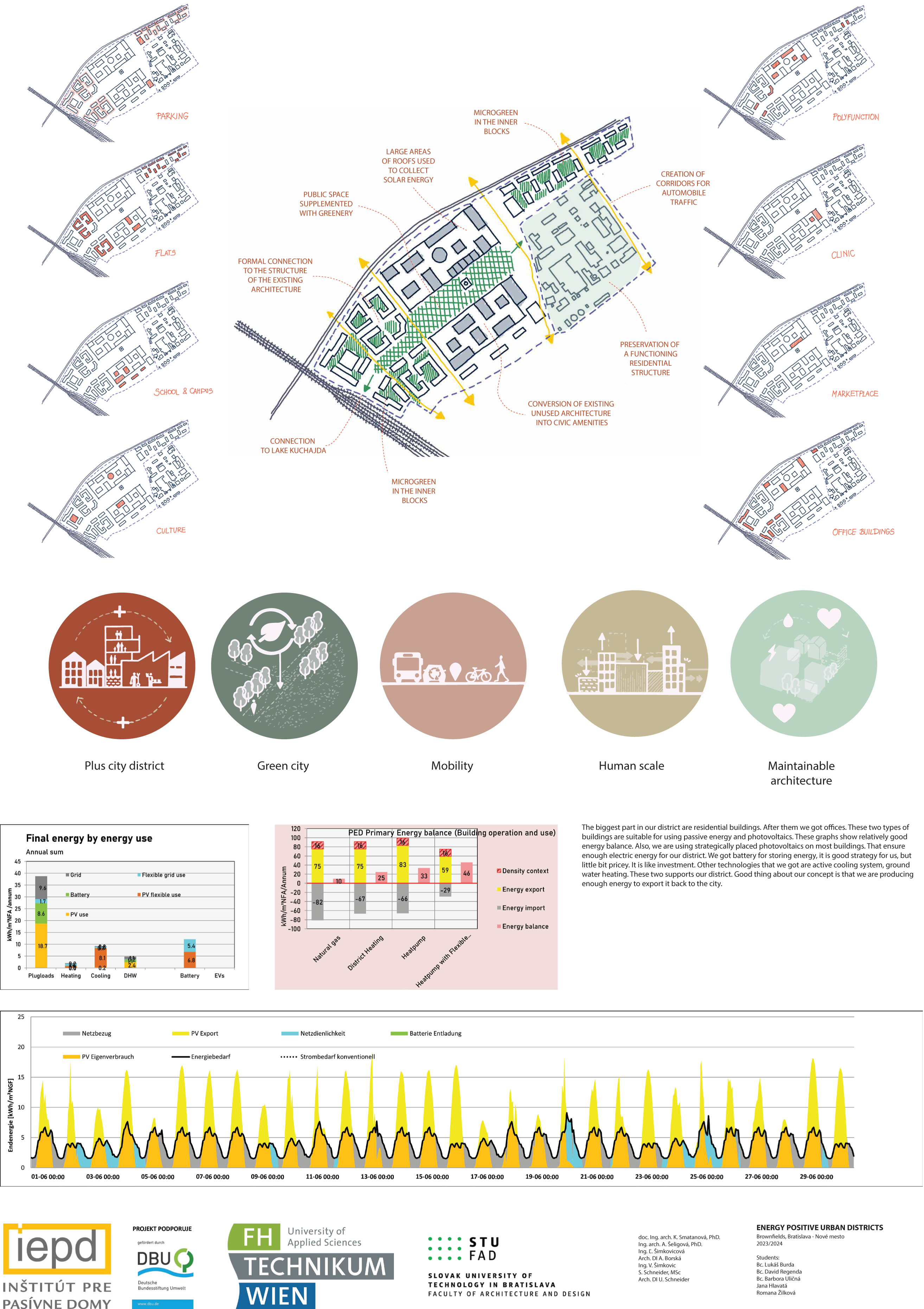 Nový voliteľný predmet, ktorý sme pripravili v spolupráci s Ústavom urbanizmu a územného plánovania Fakulty architektúry a dizajnu STU, s Fachhochschule technikum Wien a renomovaným rakúskym architektonickým ateliérom POS Architekten, prebiehal už 2 zimné semestre. Predmet sa skladá z dvoch častí, teoretickej a praktickej. V rámci úvodnej teoretickej časti študenti absolvovali bloky prednášok a v nasledujúcej praktickej časti mali za úlohu vytvoriť vlastné návrhy energeticky plusových štvrtí (angl. skratka PED Positive Energy District). Tak mohli študentky a študenti aplikovať získané teoretické vedomosti na konkrétnom príklade. V rámci predmetu absolvovali aj exkurzie, navštívili vznikajúcu klimaticky neutrálnu štvrť Seestadt Aspern vo Viedni.