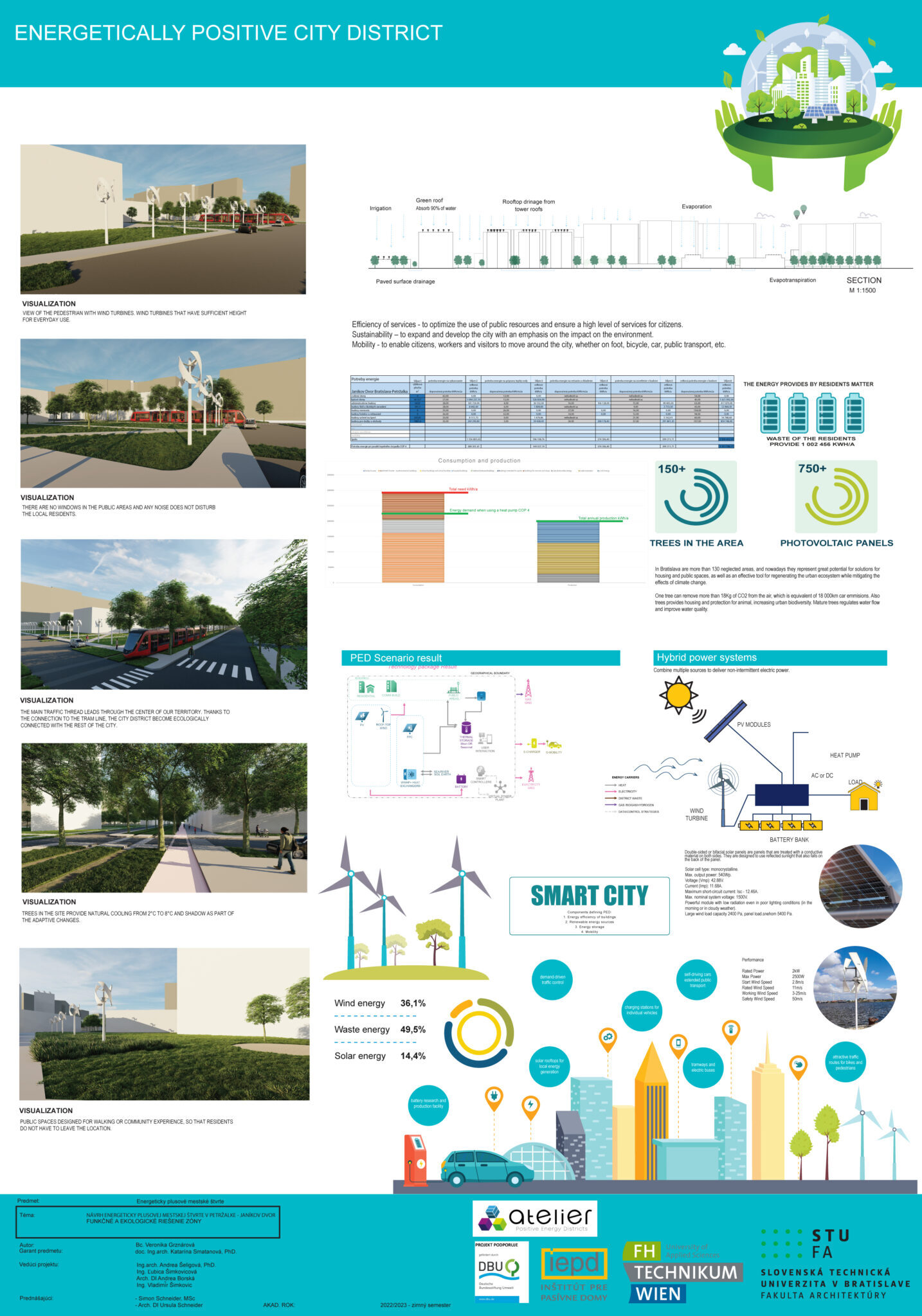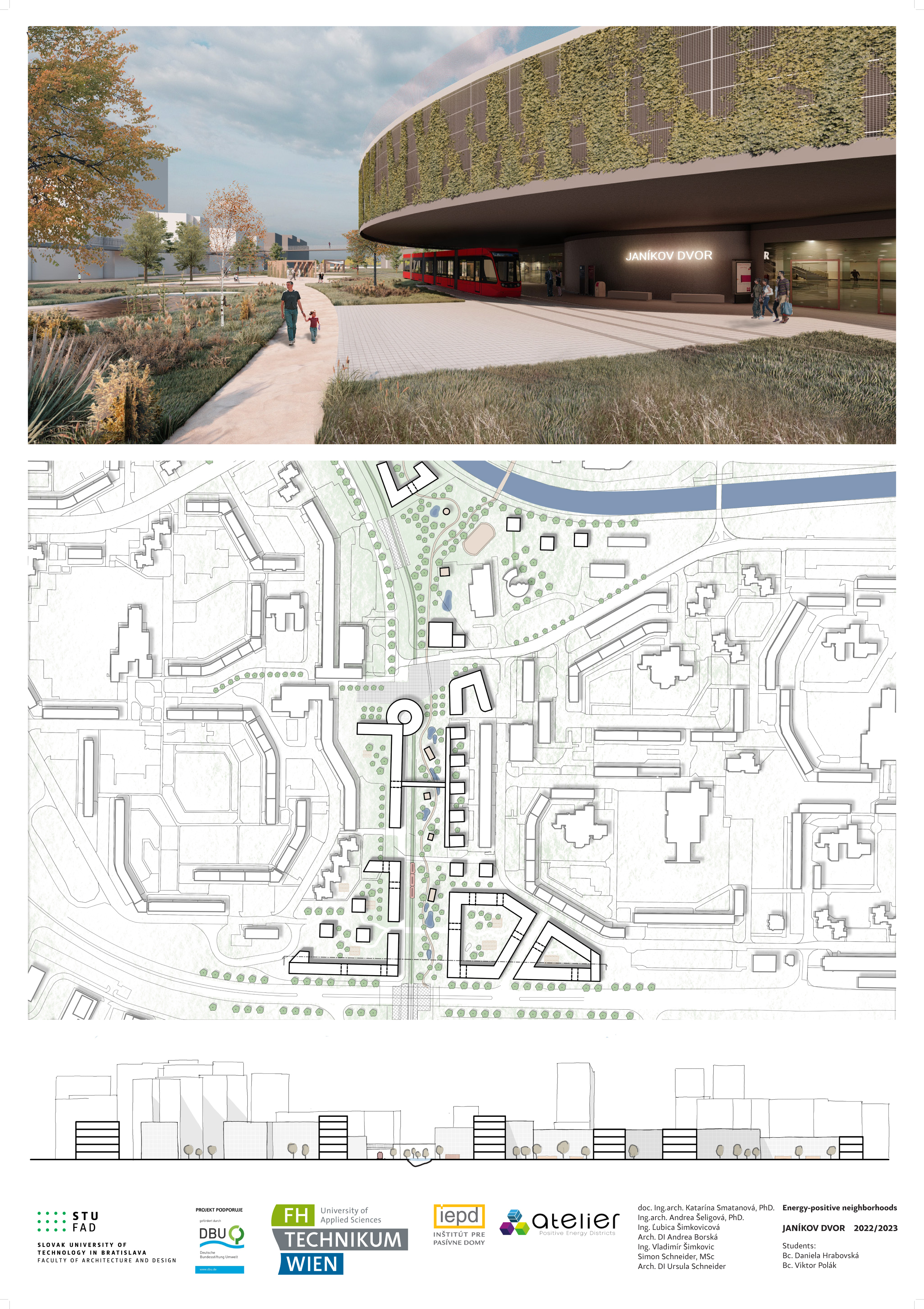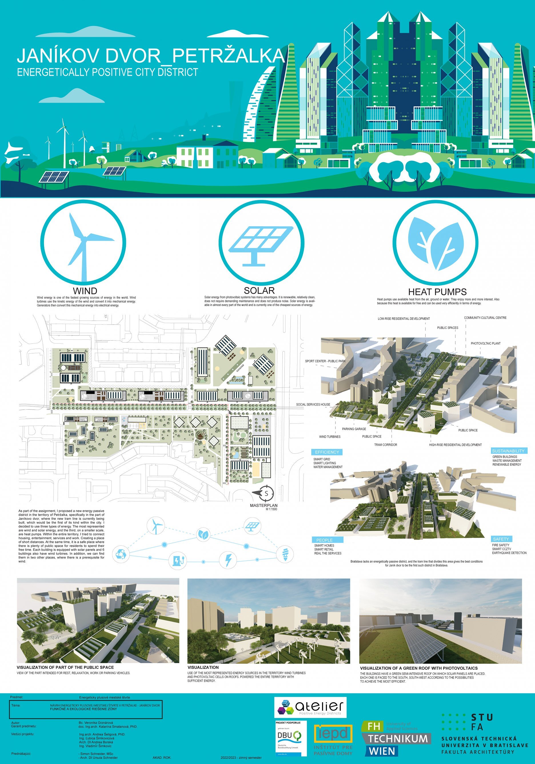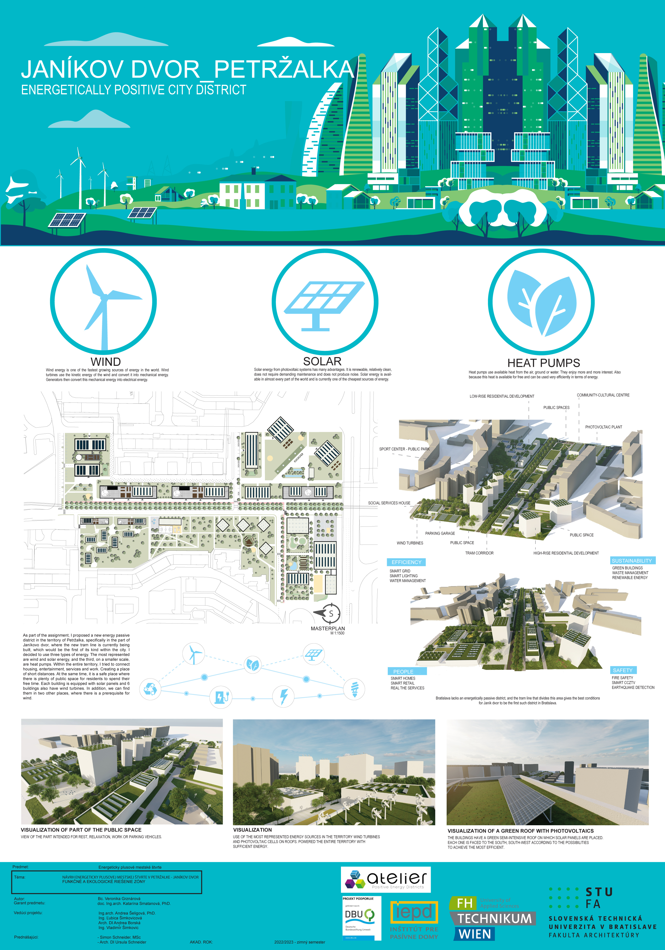 Nový voliteľný predmet, ktorý sme pripravili v spolupráci s Ústavom urbanizmu a územného plánovania Fakulty architektúry a dizajnu STU, s Fachhochschule technikum Wien a renomovaným rakúskym architektonickým ateliérom POS Architekten, prebiehal už 2 zimné semestre. Predmet sa skladá z dvoch častí, teoretickej a praktickej. V rámci úvodnej teoretickej časti študenti absolvovali bloky prednášok a v nasledujúcej praktickej časti mali za úlohu vytvoriť vlastné návrhy energeticky plusových štvrtí (angl. skratka PED Positive Energy District). Tak mohli študentky a študenti aplikovať získané teoretické vedomosti na konkrétnom príklade. V rámci predmetu absolvovali aj exkurzie, navštívili vznikajúcu klimaticky neutrálnu štvrť Seestadt Aspern vo Viedni.