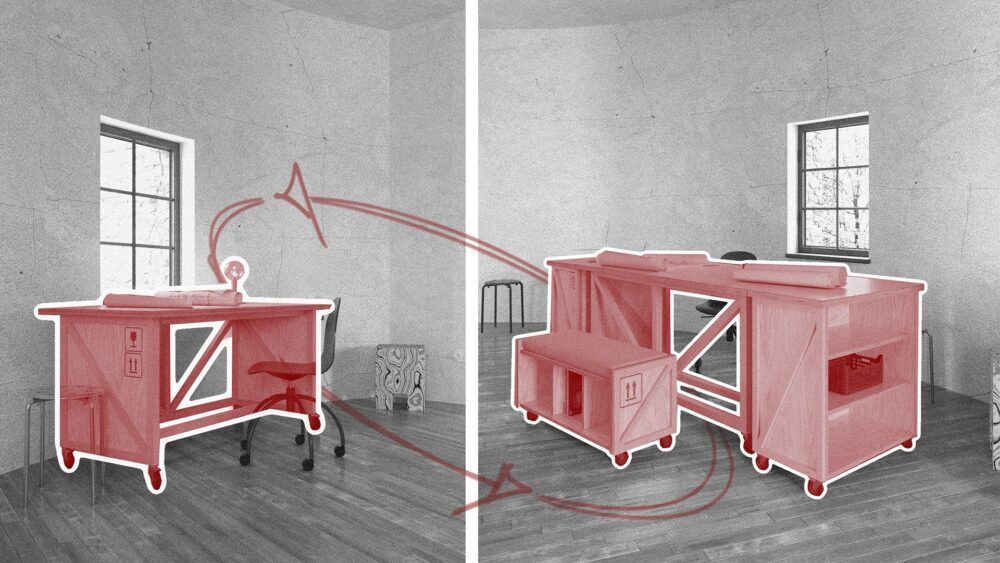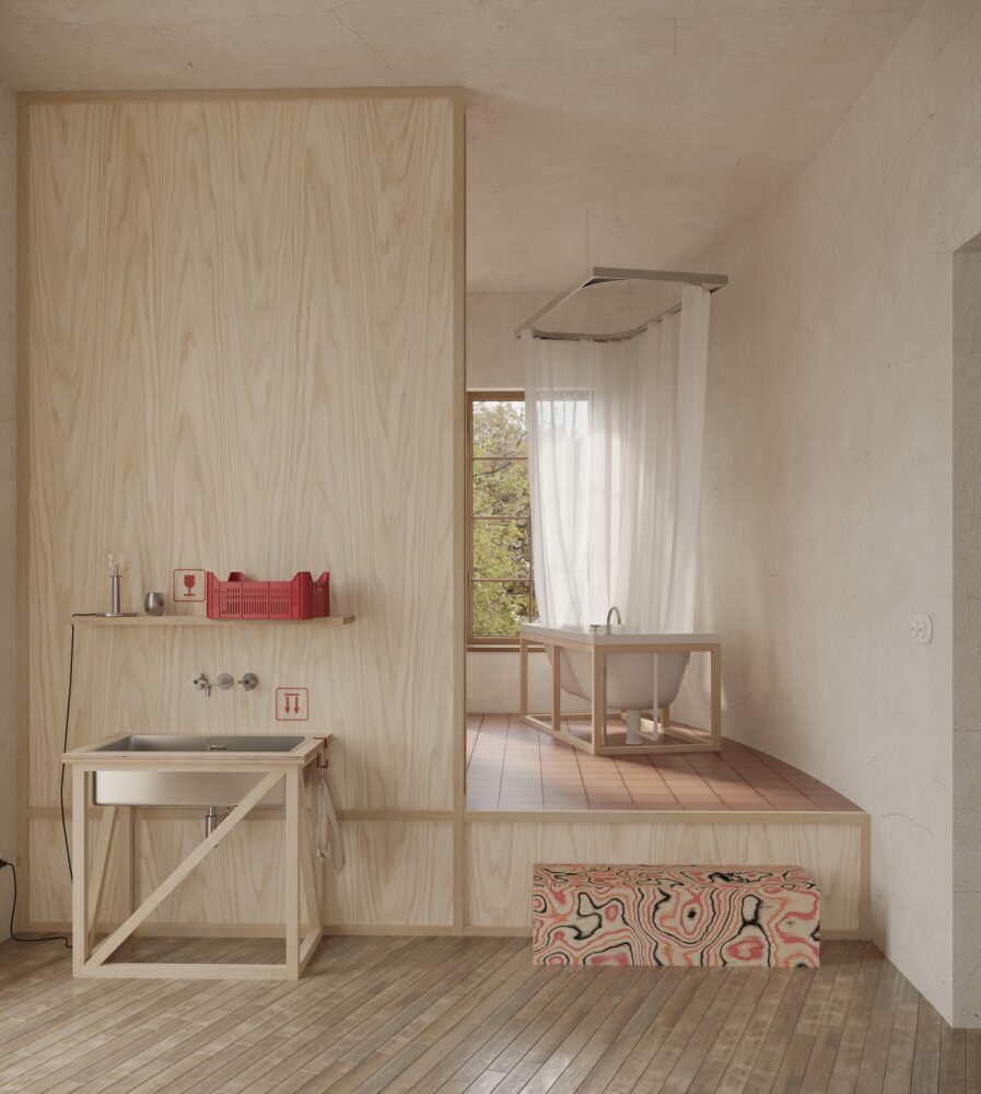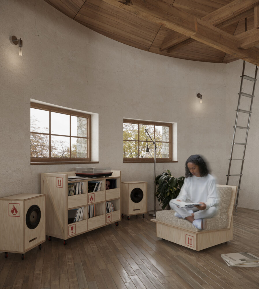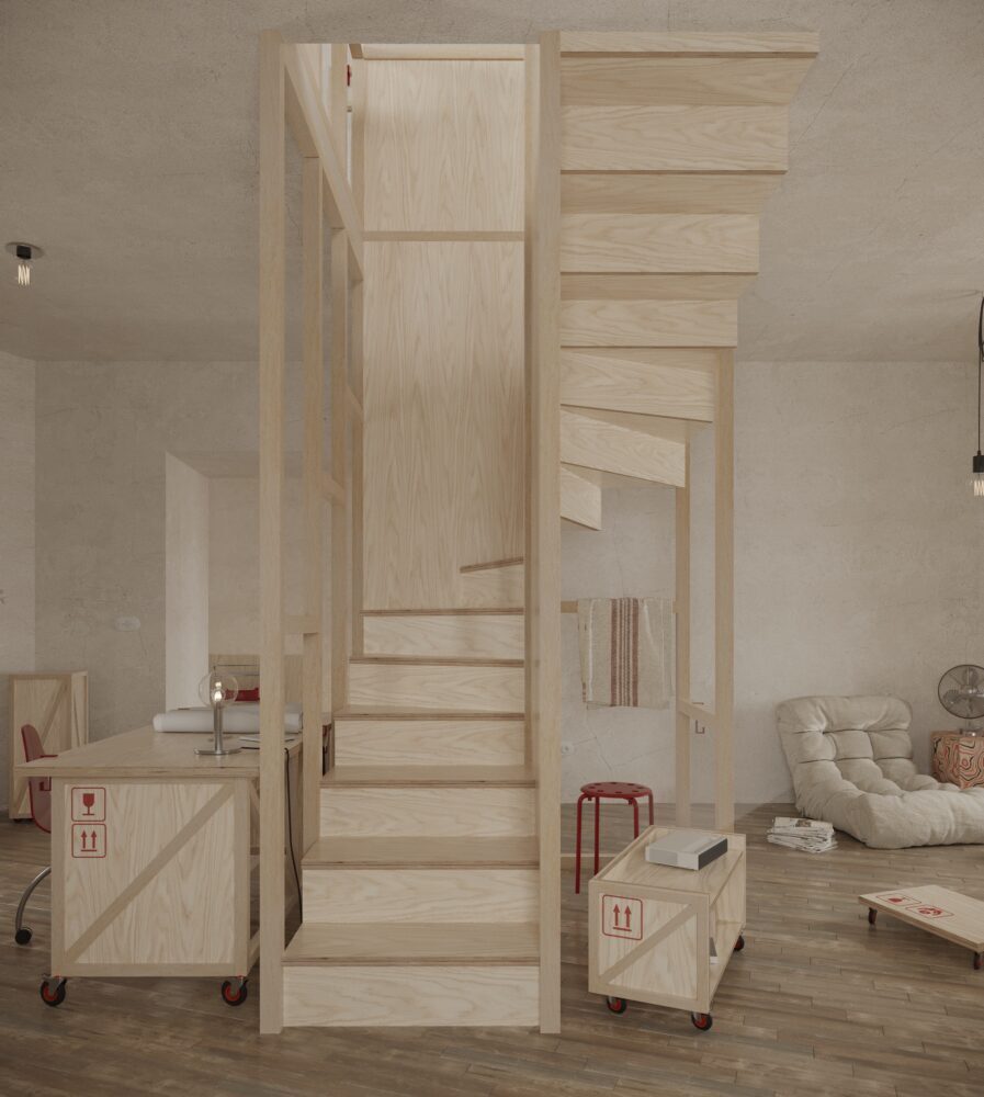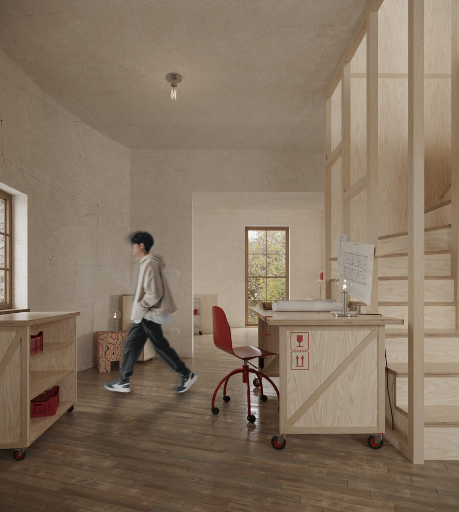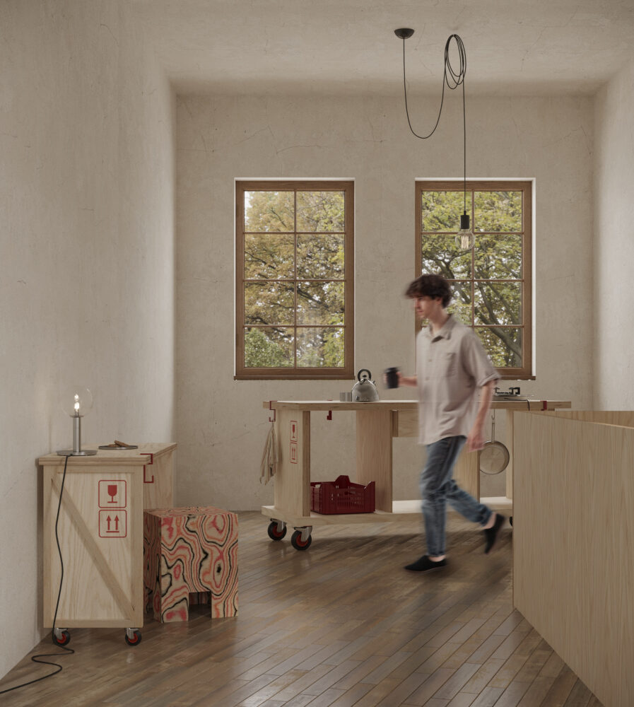 Interiér na túto víziu reaguje prostredníctvom mobilných preglejkových modulov vytvorených z prepravných boxov. Tieto prvky sú kombinovateľné, premiestniteľné a zámerne bez trvalého uchytenia. Ich povrch dopĺňajú grafické ikony, ktoré jemne ironizujú systémové riešenia a zároveň slúžia ako intuitívny orientačný prvok, čím podporujú čitateľnosť priestoru a jazyk dočasnosti.