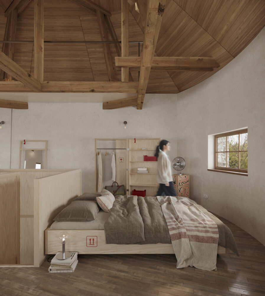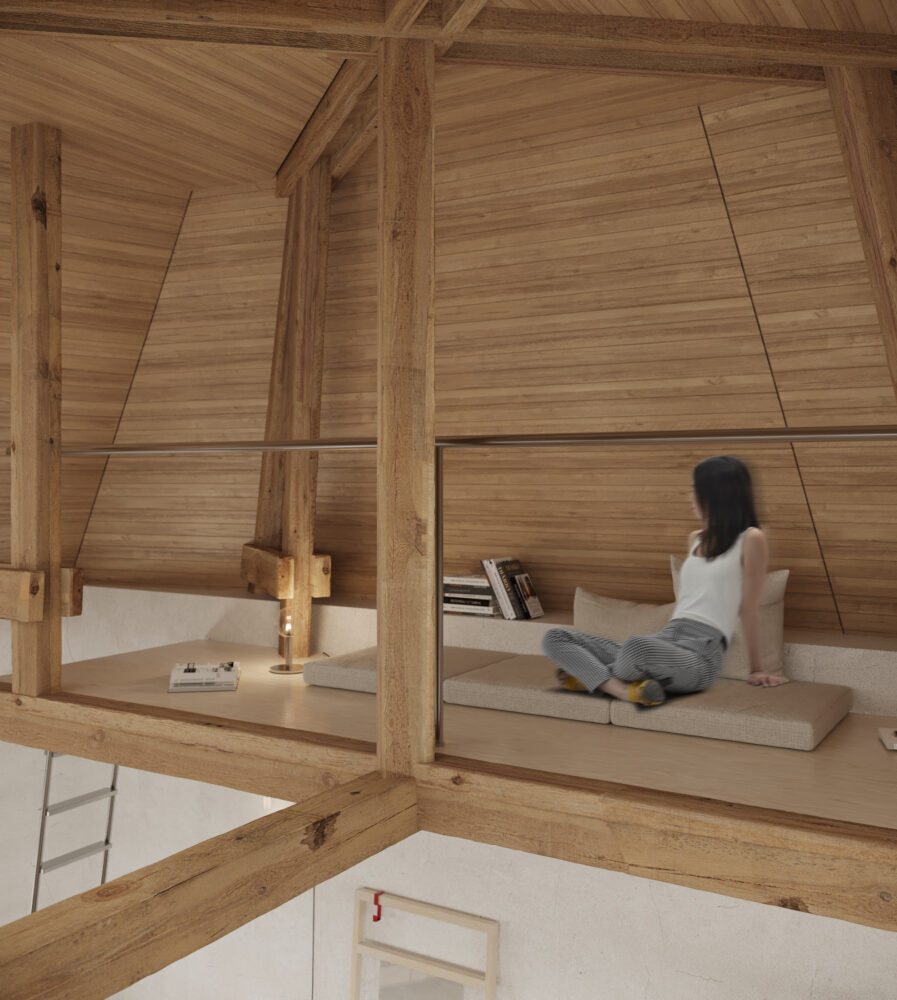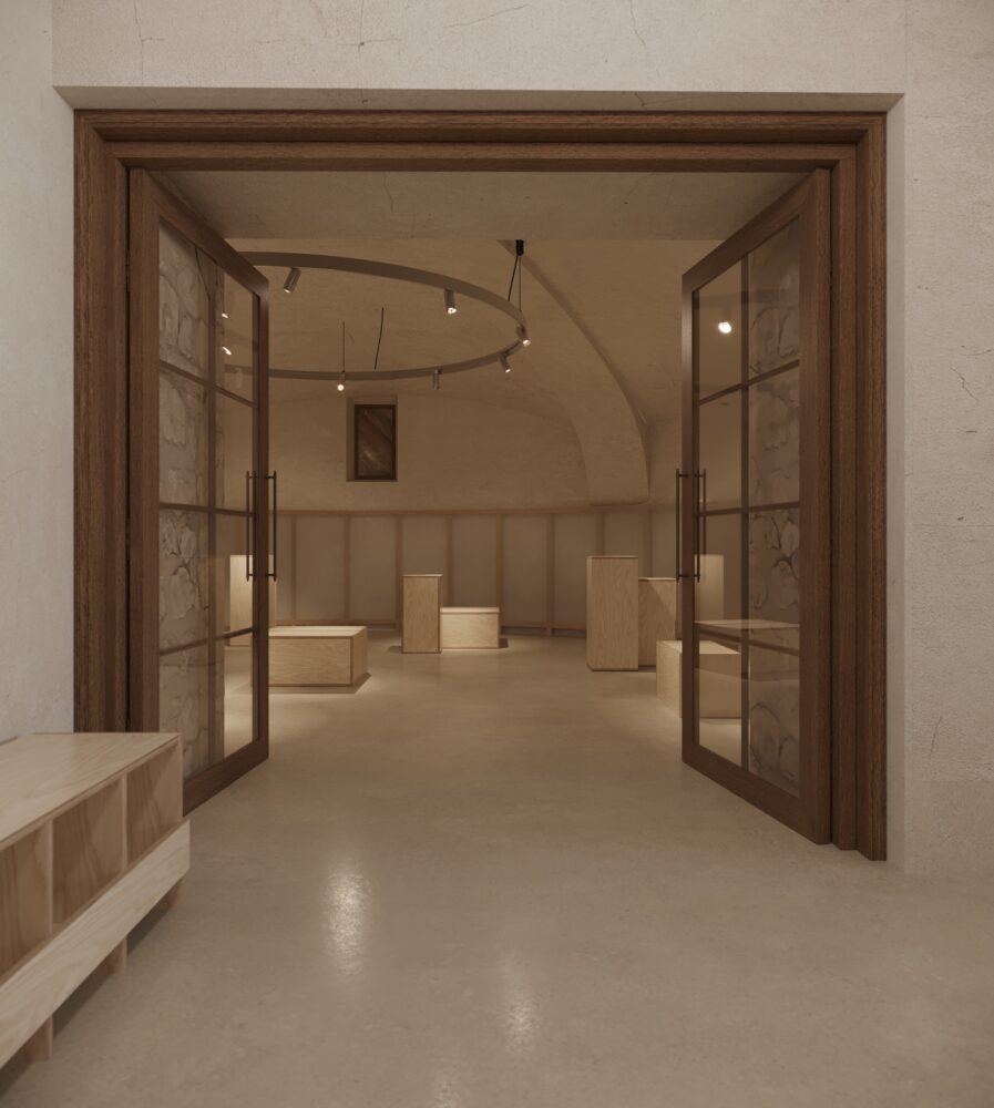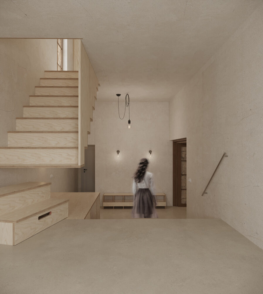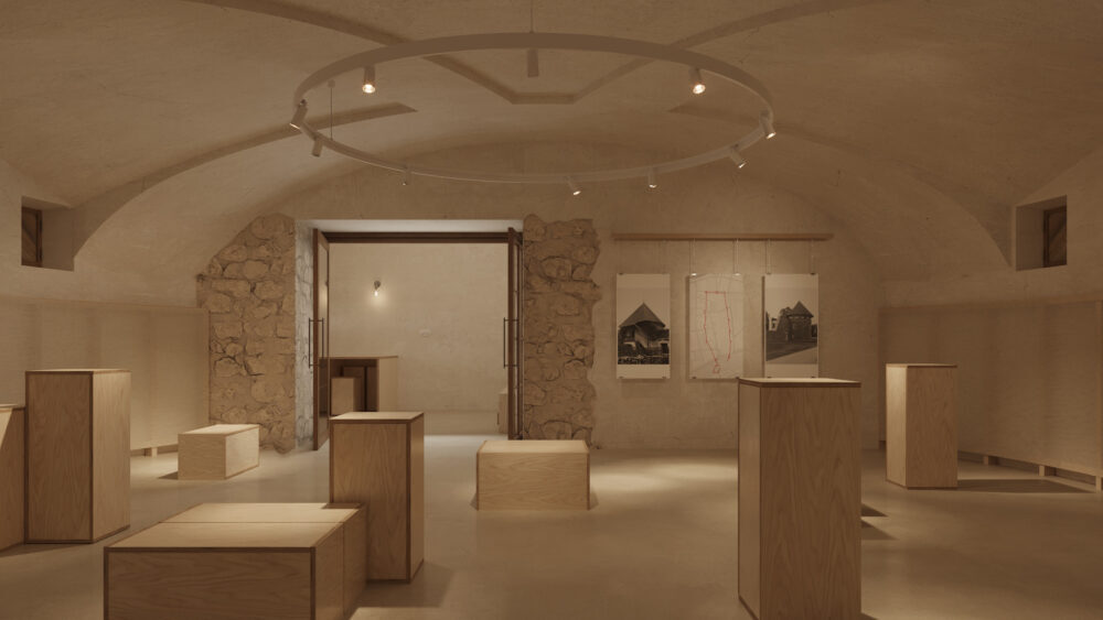 Horné podlažia objektu poskytujú zážitkové bývanie určené na tvorivý únik, zatiaľ čo spodná úroveň funguje ako otvorená scénická plocha – výstavný priestor situovaný v klenbovom podzemí, kde zmena mierky a atmosféry prirodzene zvyšuje mieru sústredenia a vnímania.
