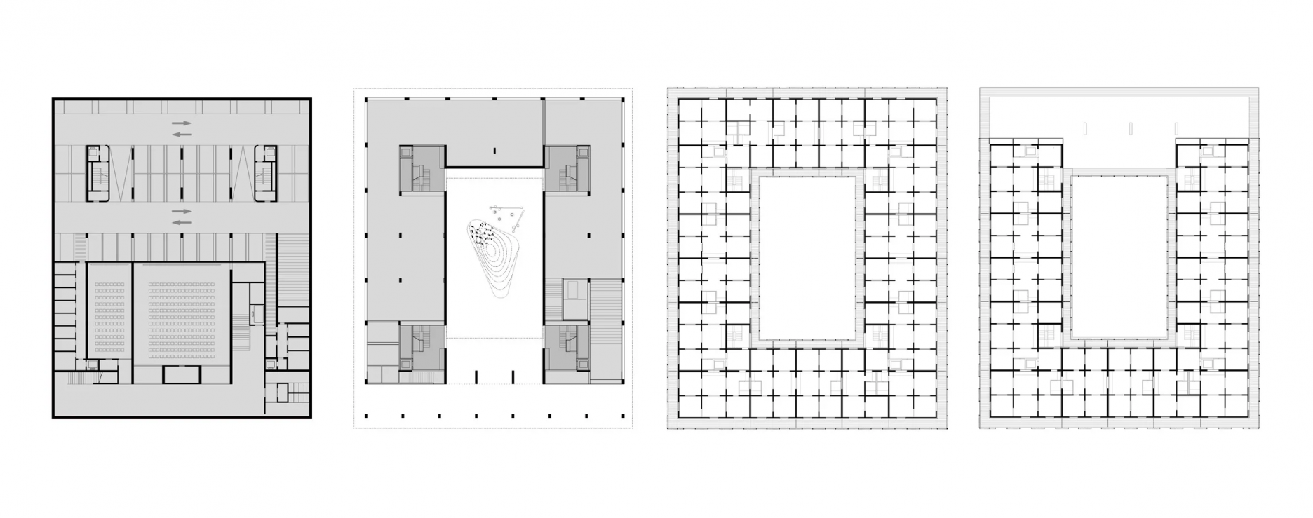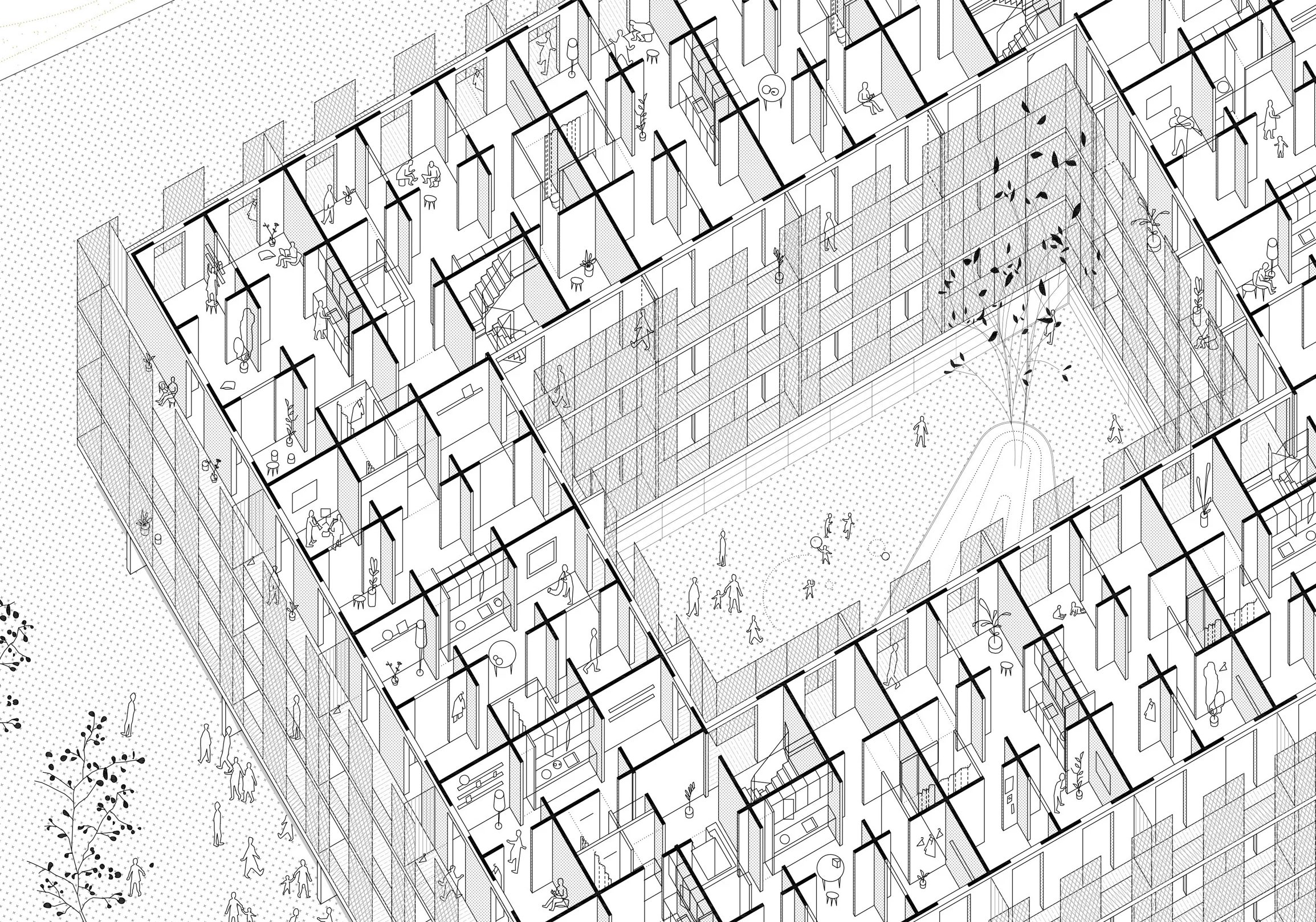 Stavba je usporiadaná okolo centrálneho nádvoria, ktoré slúži ako komunitný priestor pre obyvateľov. Vstupný portikus prepája centrálnu spoločnú zónu s verejným priestorom