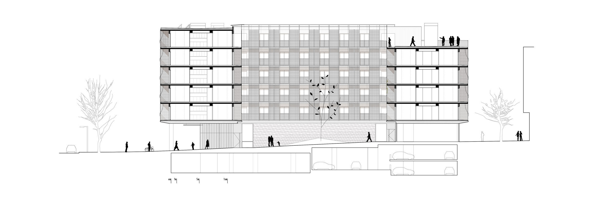 Päť podlaží, realizovaných ako drevostavba z prefabrikovaných CLT modulov, stojí na oceľobetónovej podnoži, ktorá obsiahla obchody a občiansku vybavenosť.