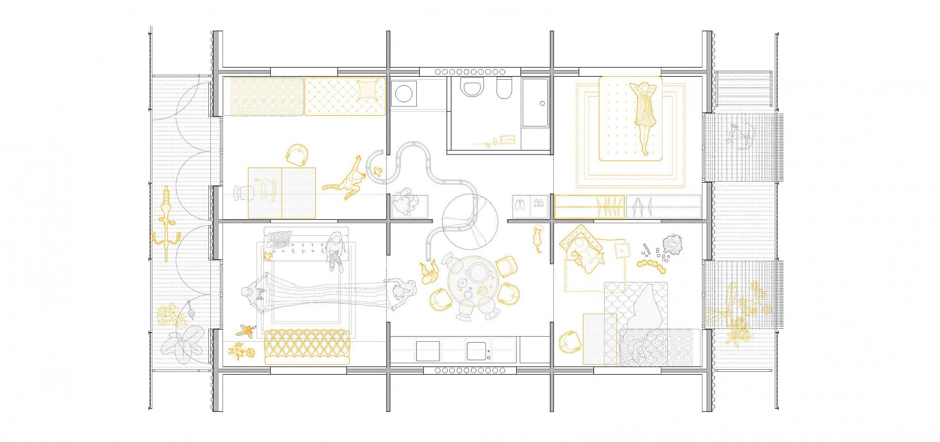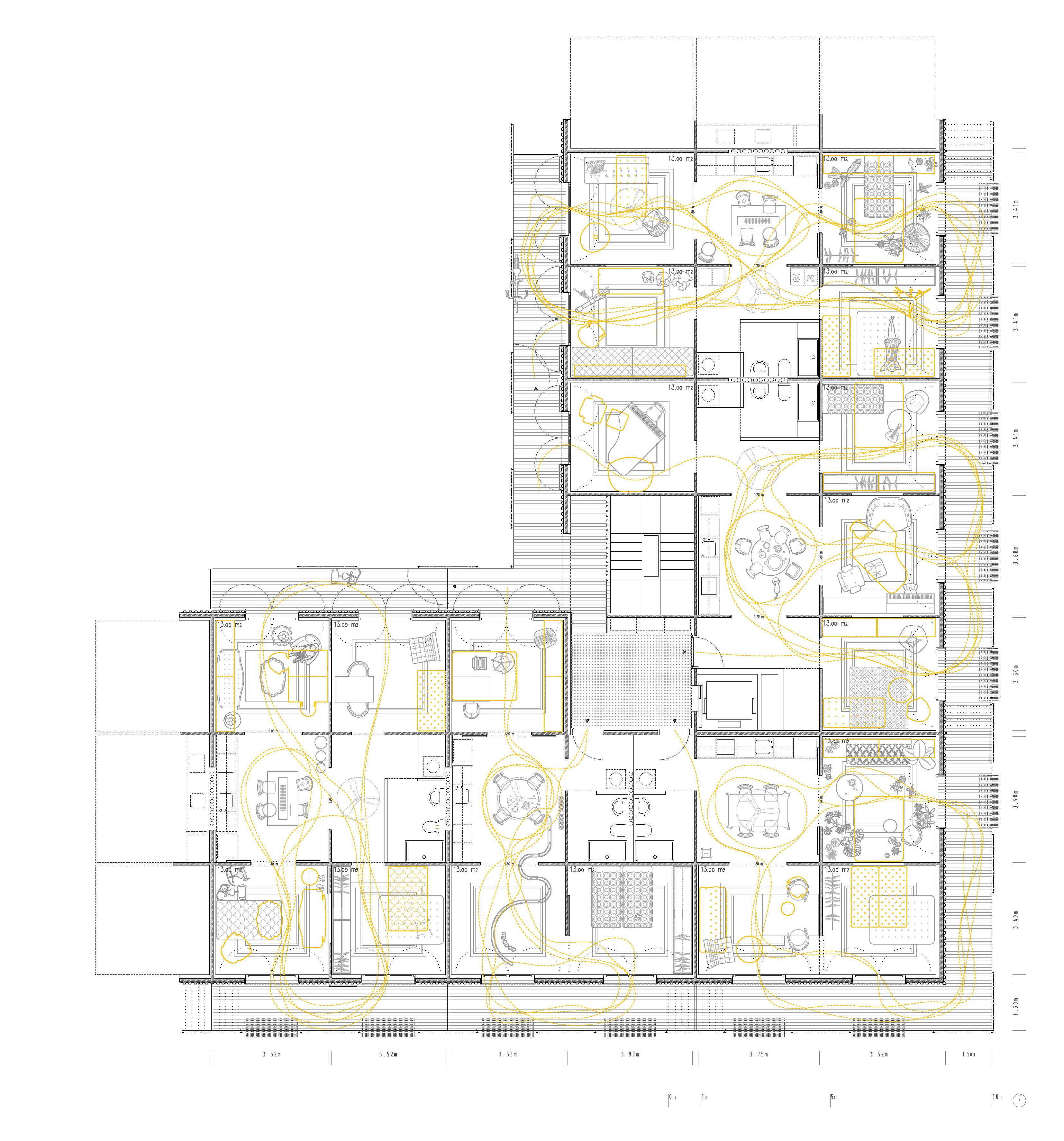 Dispozícia, vychádzajúca z modulového rastra spojených miestností, sústreďuje obslužné priestory (vrátane kúpeľní a kuchýň) na vnútorný obvod pôdorysu. Každý z bytov pozostáva z piatich alebo šiestich modulov, v závislosti od toho, či má dve alebo tri spálne. Otvorené kuchynské moduly nahrádzajú v bytoch štandardné chodby. Ostatné miestnosti, nadväzujúce na centrálne priestory kuchyne, oddeľujú posuvné dvere.