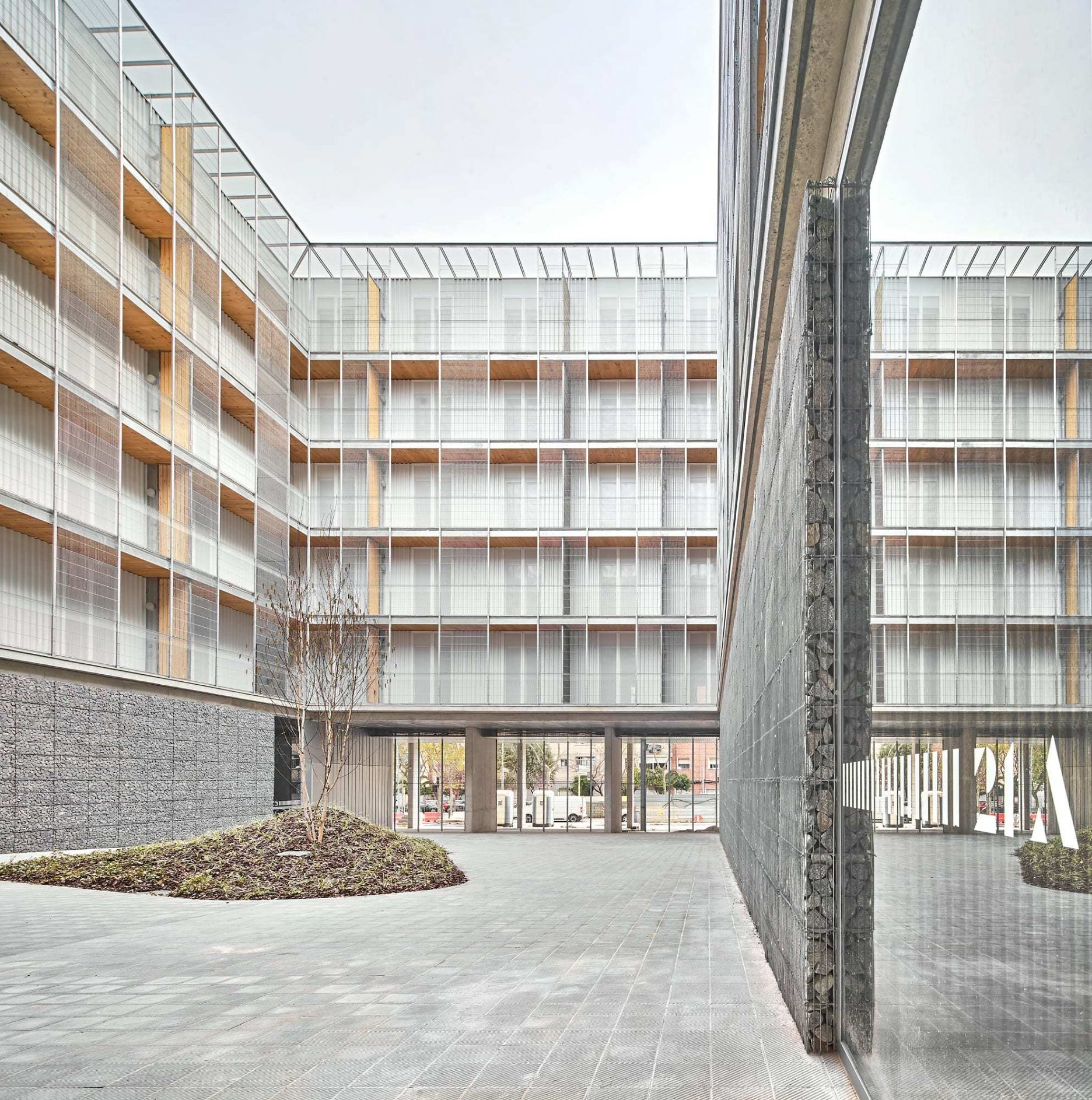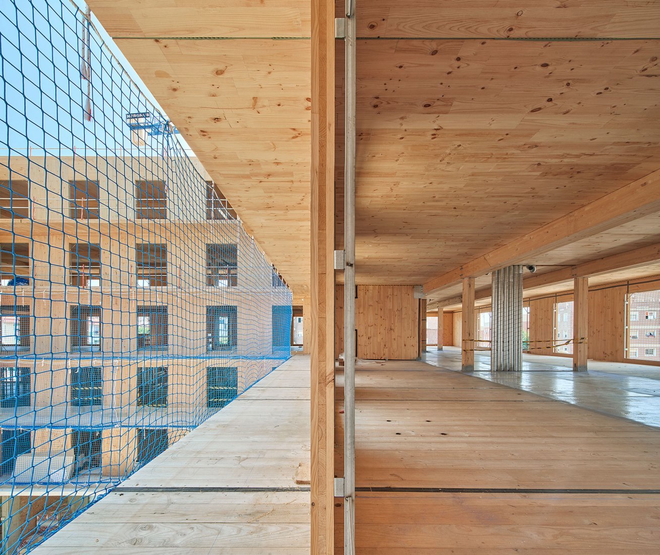 Projekt je podľa slov ateliéru najväčšou obytnou budovou s drevenou konštrukciou v Španielsku, postavenou z 8 300 metrov kubických lokálneho dreva. Využitie 543 miestností s výmerou 13 m2 definuje krátky modul s rozponom 3,60 m. Na oceľobetónovú konštrukciu prízemia nadväzuje prefabrikovaný systém z CLT panelov, vďaka ktorému sa podarilo optimalizovať objem drevených konštrukcií na 0,24 m3/m a náklady na 950 €/m2 podlahovej plochy.