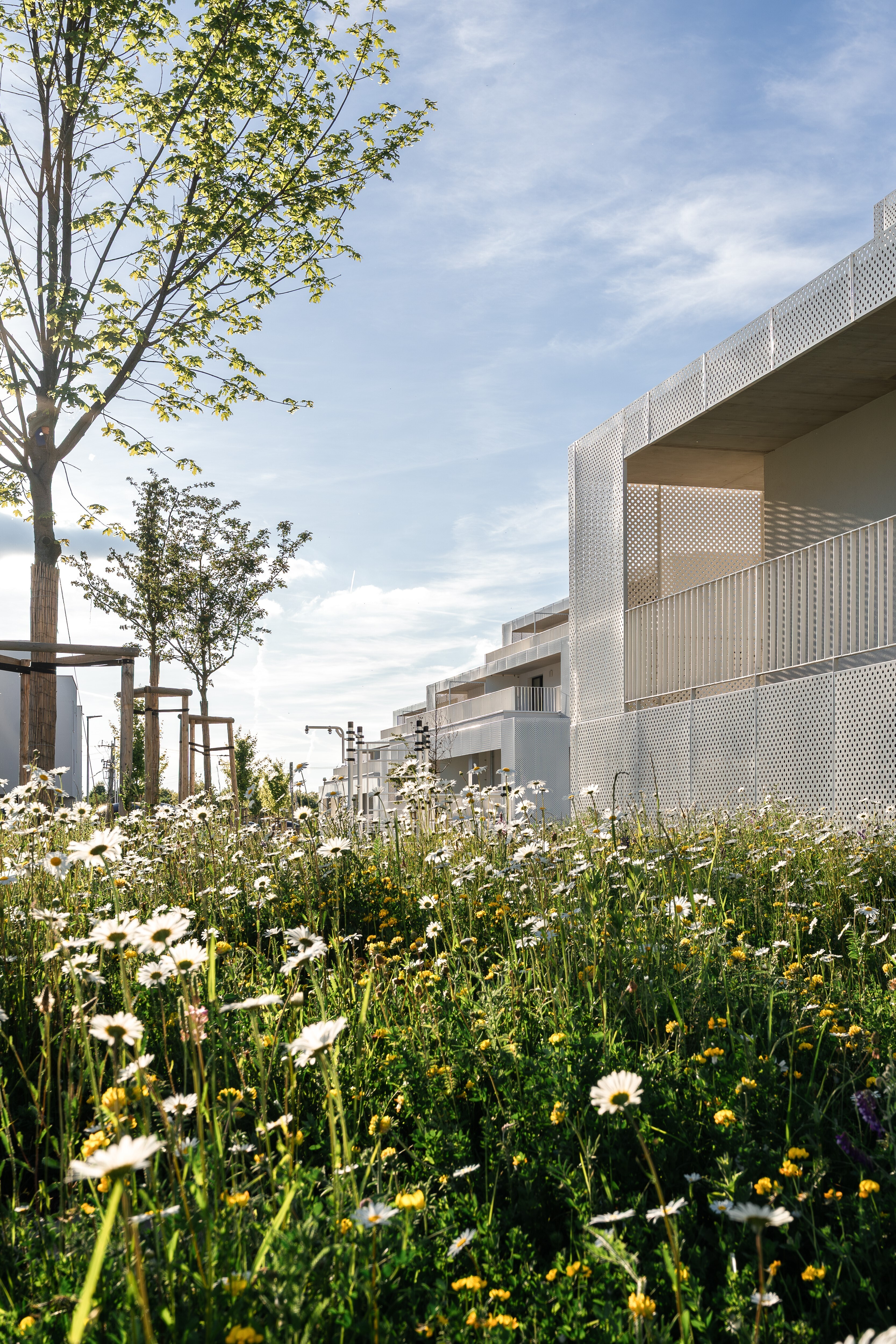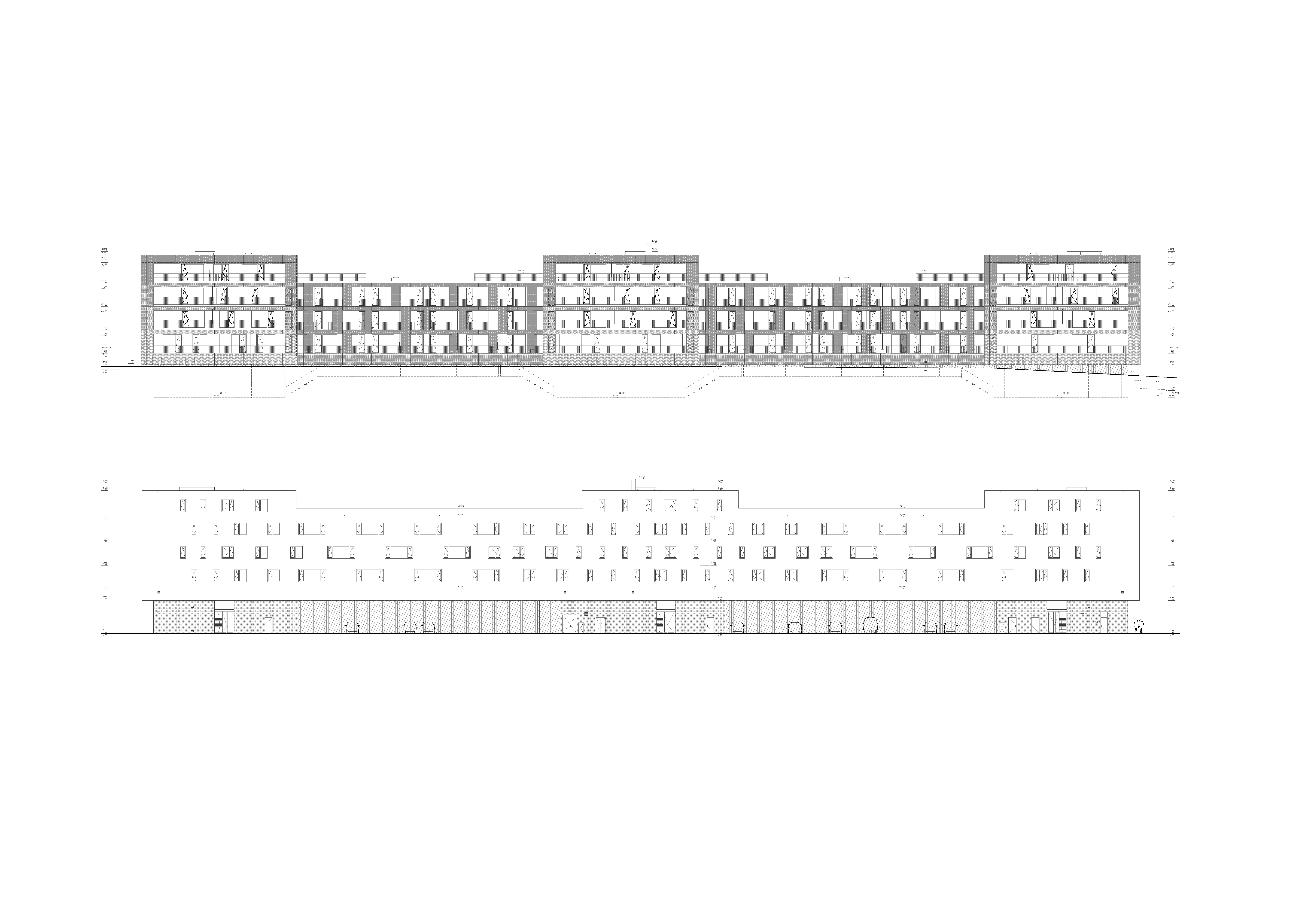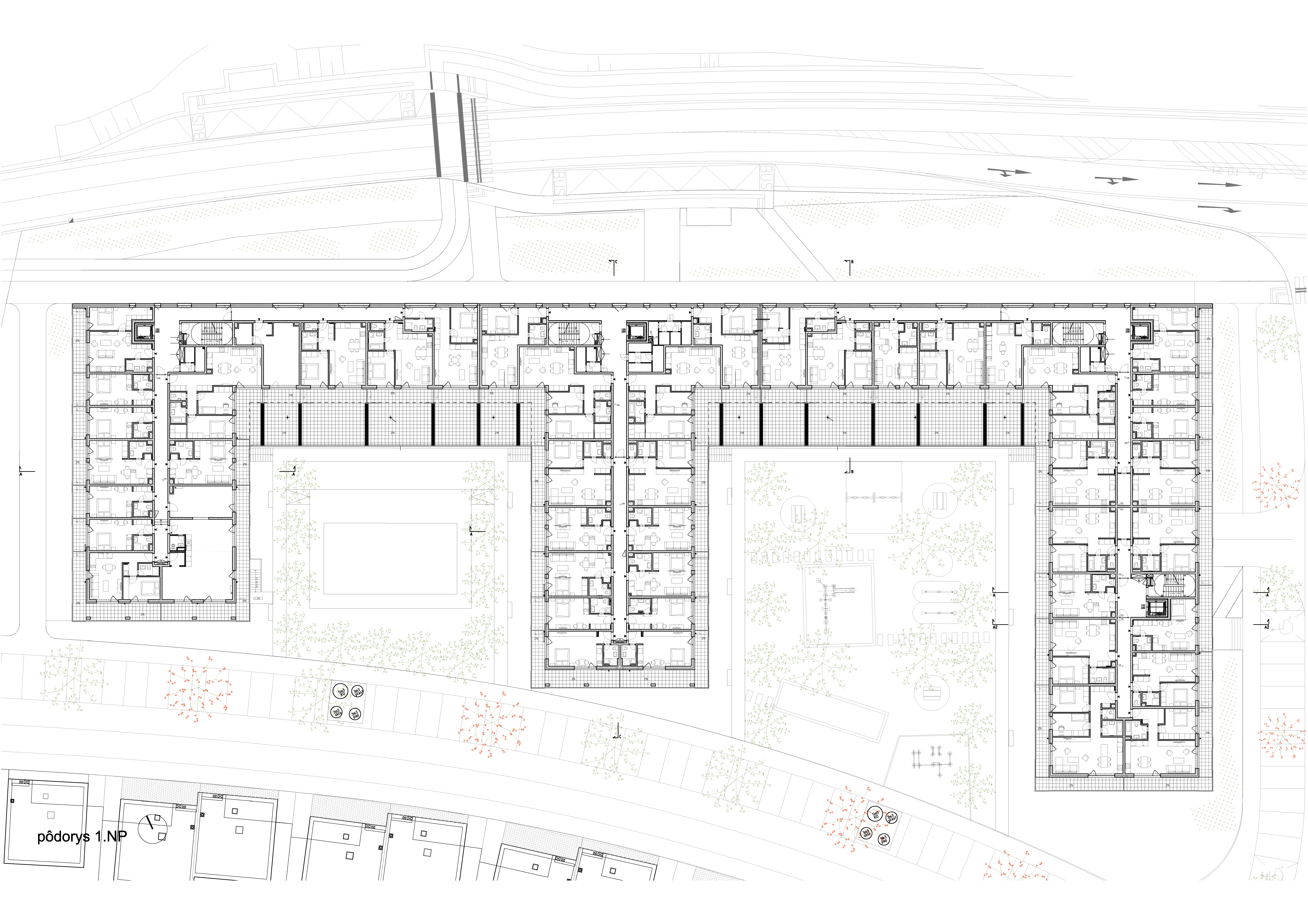 K Agátovej ulici smeruje lineárny objekt s vystúpeniami orientovanými do lesa, ktorý vytvára akustickú bariéru proti hluku zo železnice a dopravy na Agátovej ulici.