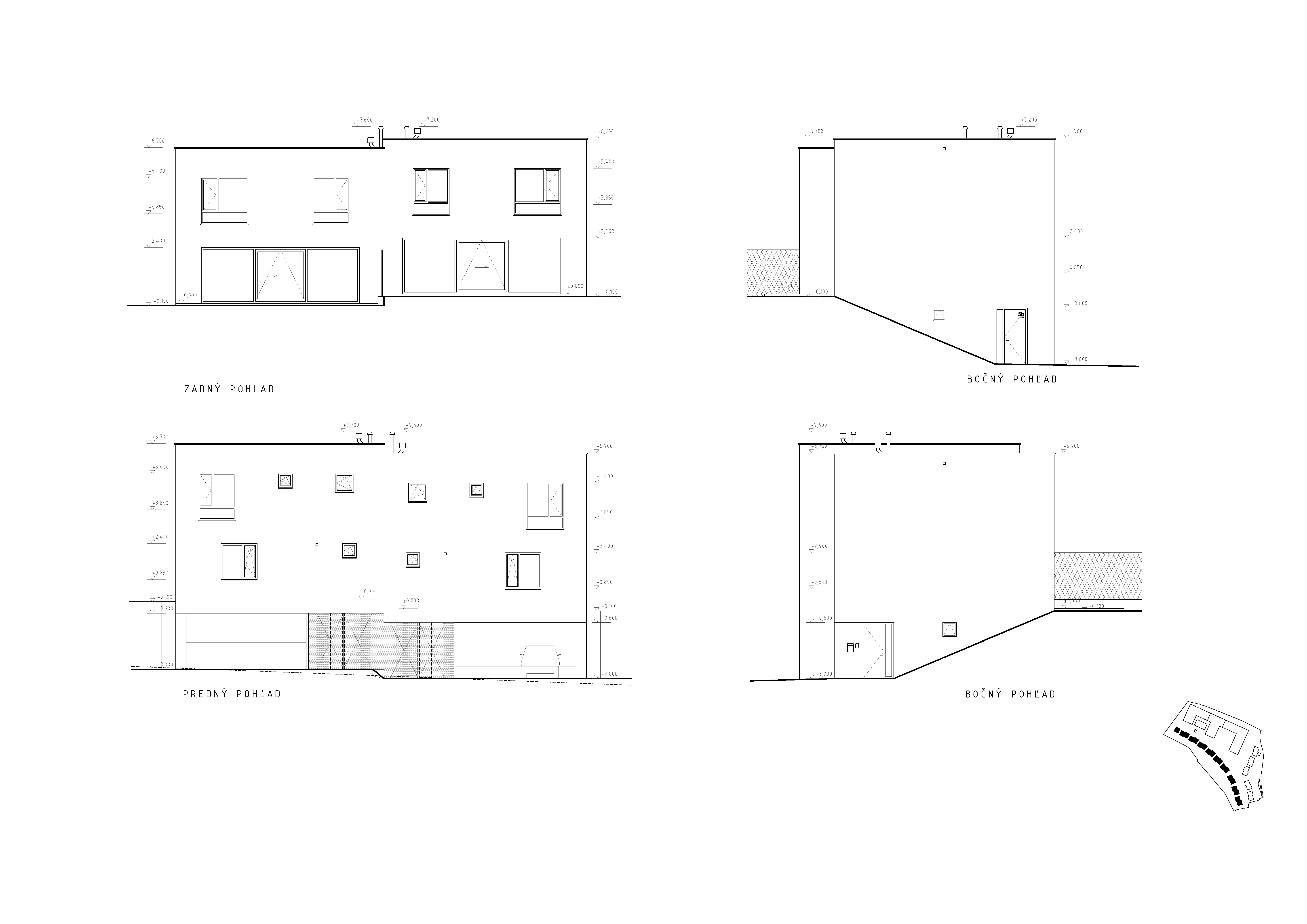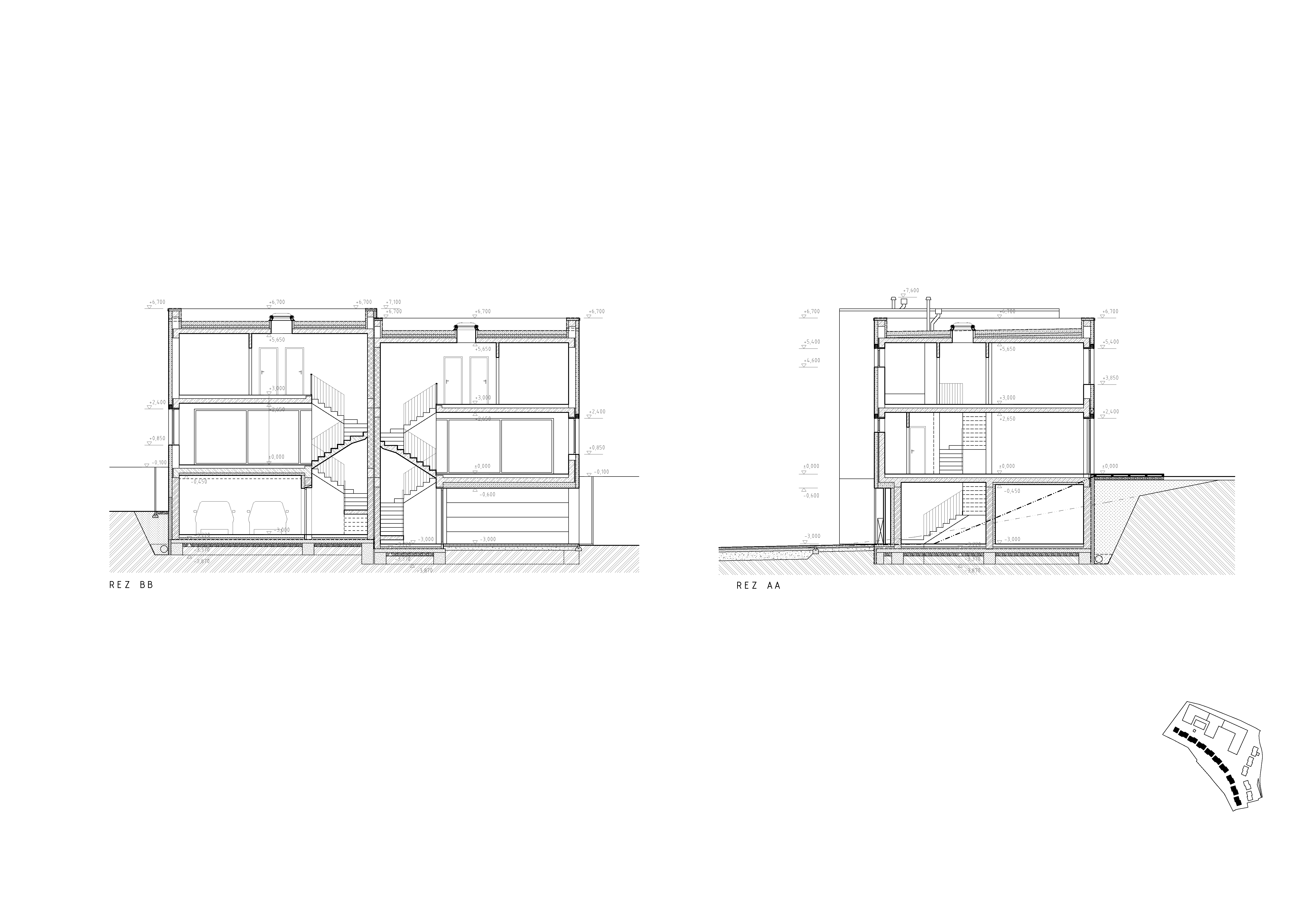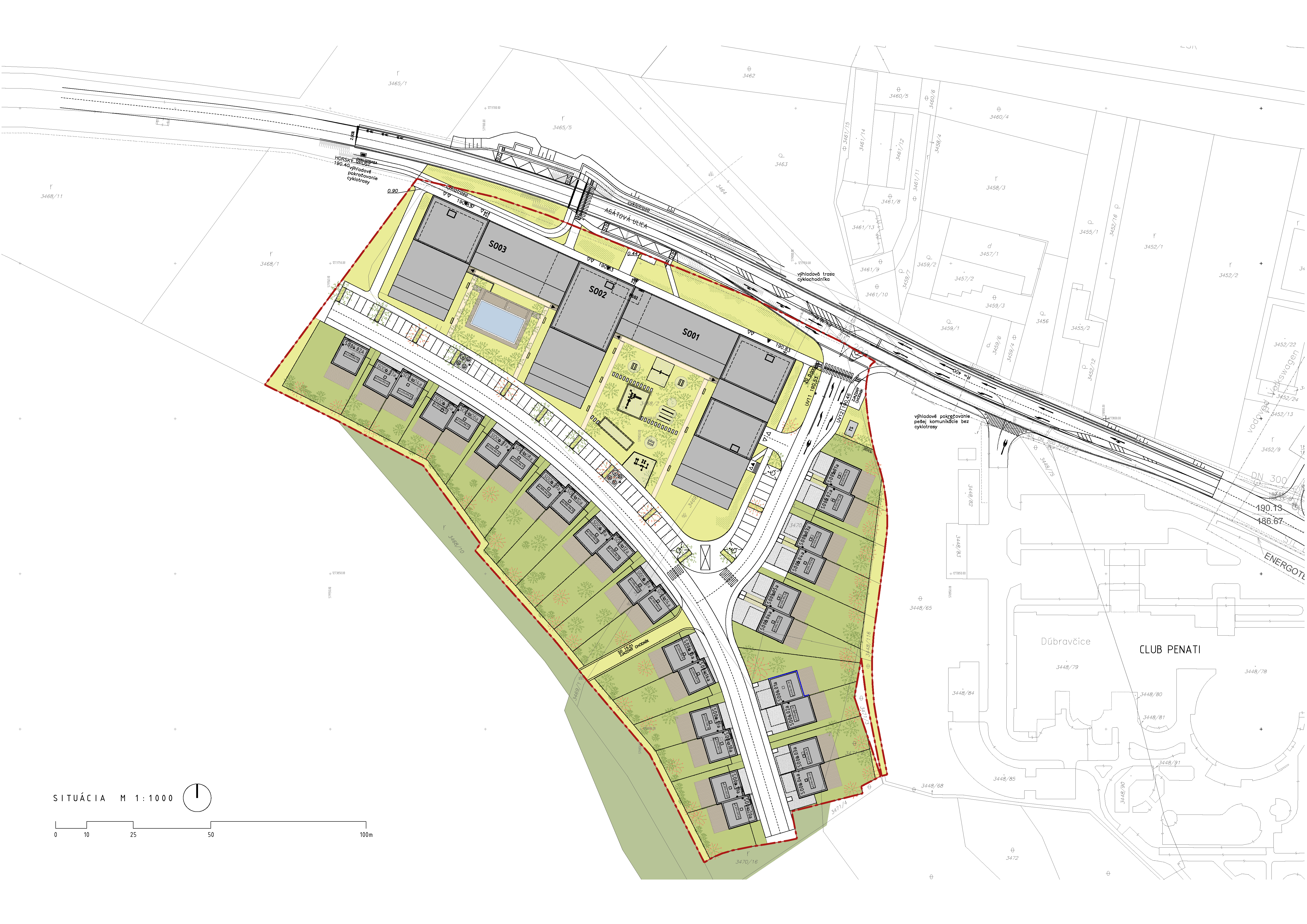 Pozdĺž južnej hranice pozemku sú situované trojpodlažné rodinné domy A, ktoré majú parkovanie riešené na úrovni prvého podzemného podlažia, rovnako ako prvý spomínaný objekt. Rodinné domy B a C, umiestnené pozdĺž východnej hranice pozemku, sú dvojpodlažné a parkovanie majú riešené na povrchu pred domom.