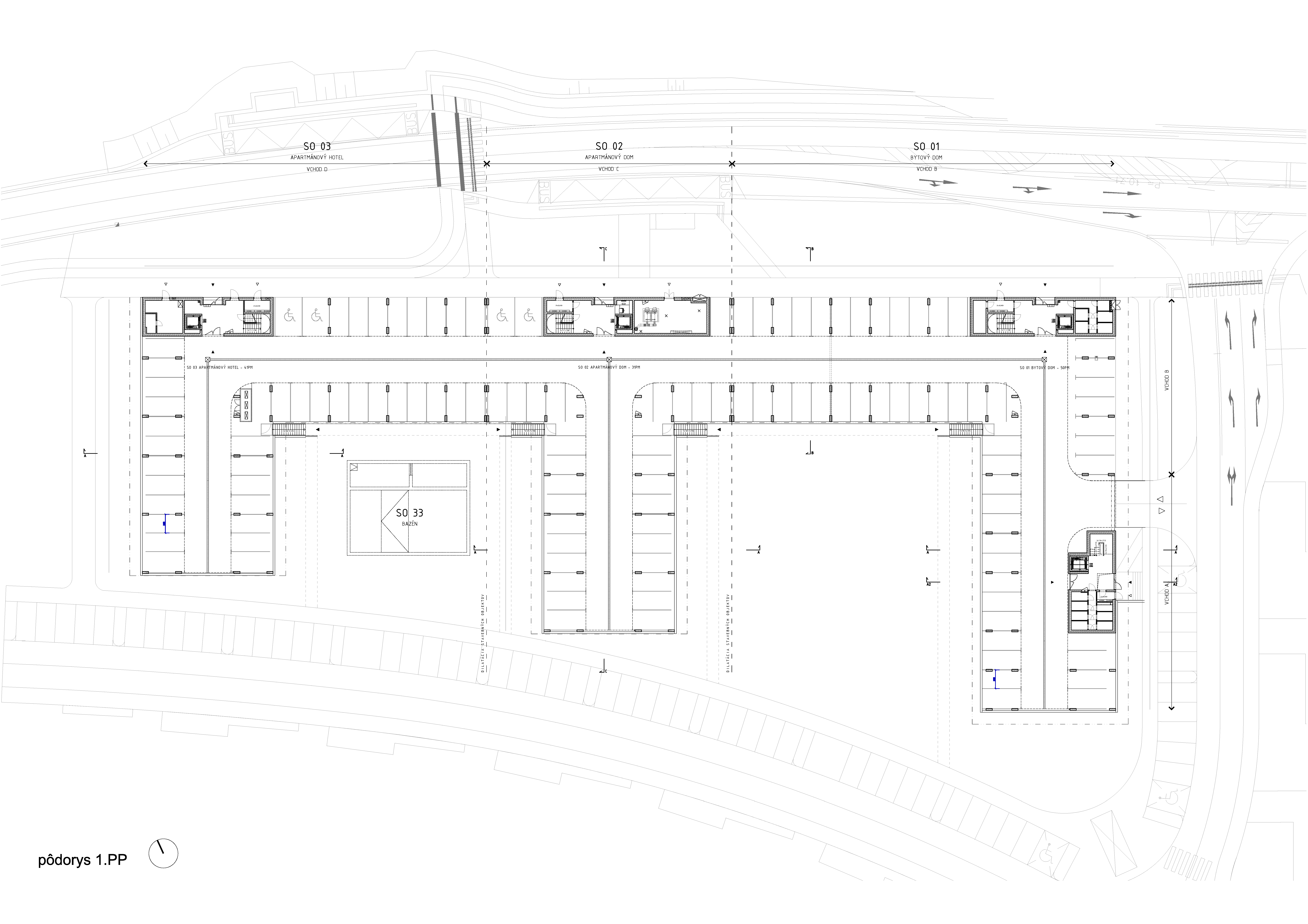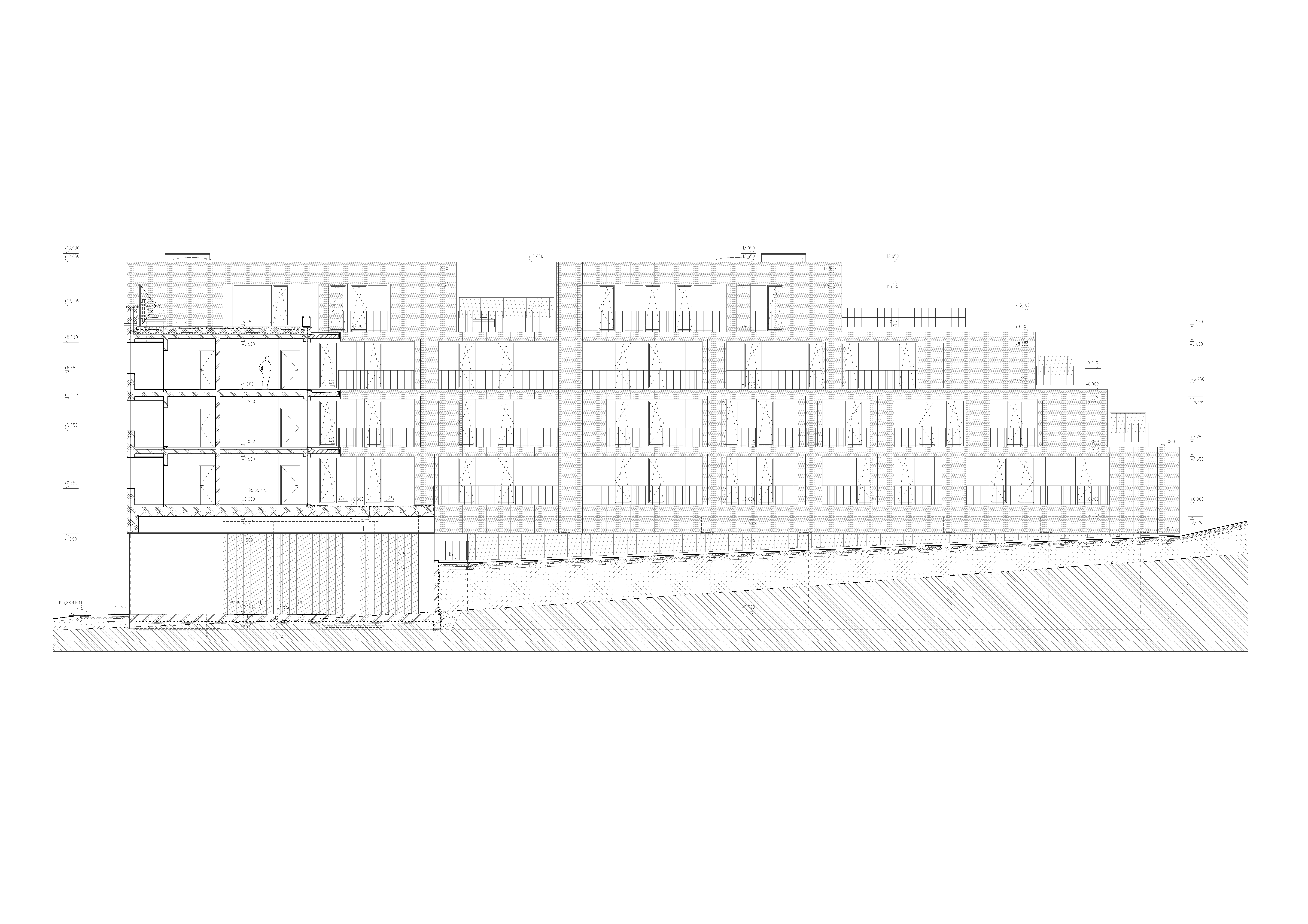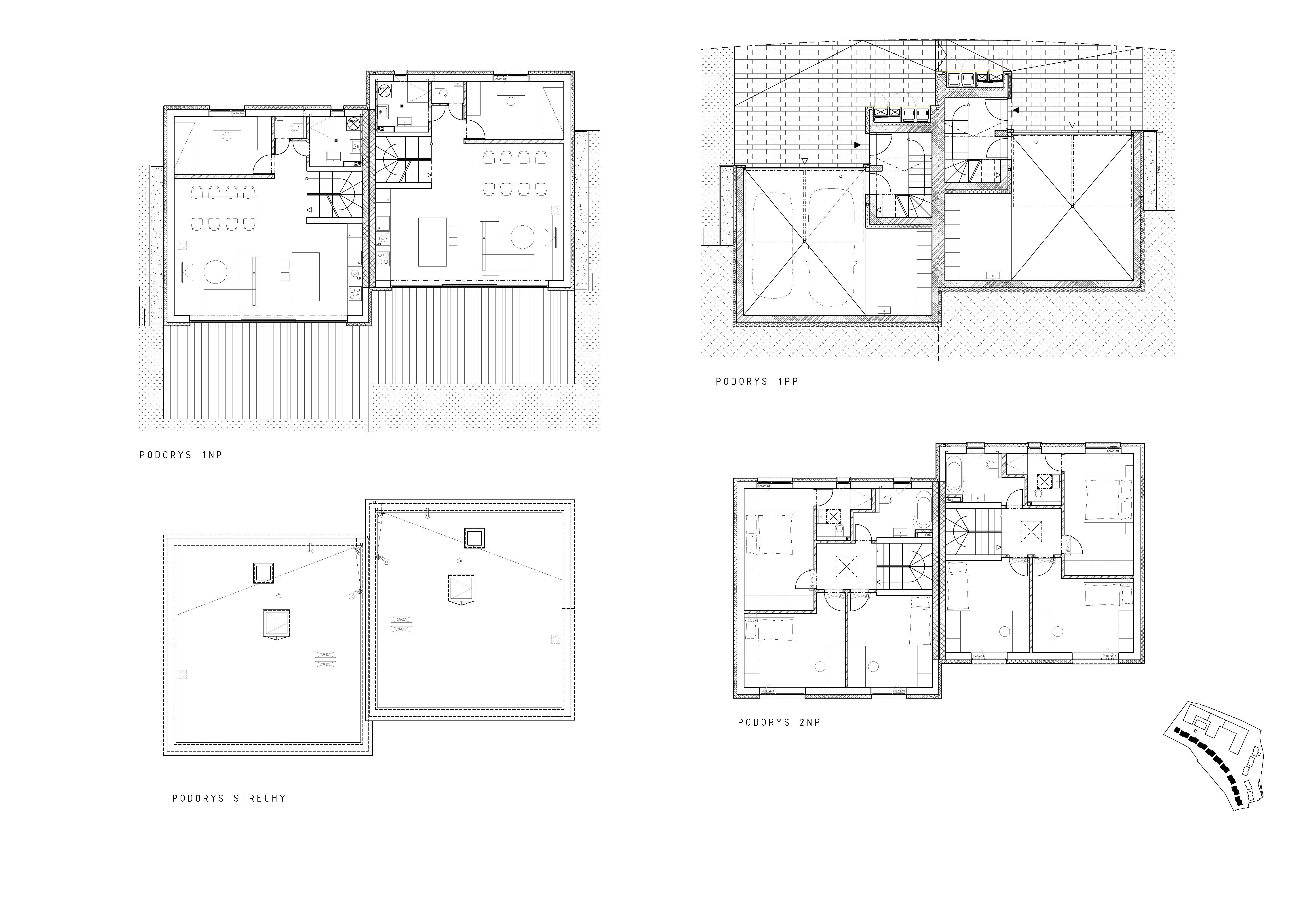 Pozdĺž južnej hranice pozemku sú situované trojpodlažné rodinné domy A, ktoré majú parkovanie riešené na úrovni prvého podzemného podlažia, rovnako ako prvý spomínaný objekt. Rodinné domy B a C, umiestnené pozdĺž východnej hranice pozemku, sú dvojpodlažné a parkovanie majú riešené na povrchu pred domom.