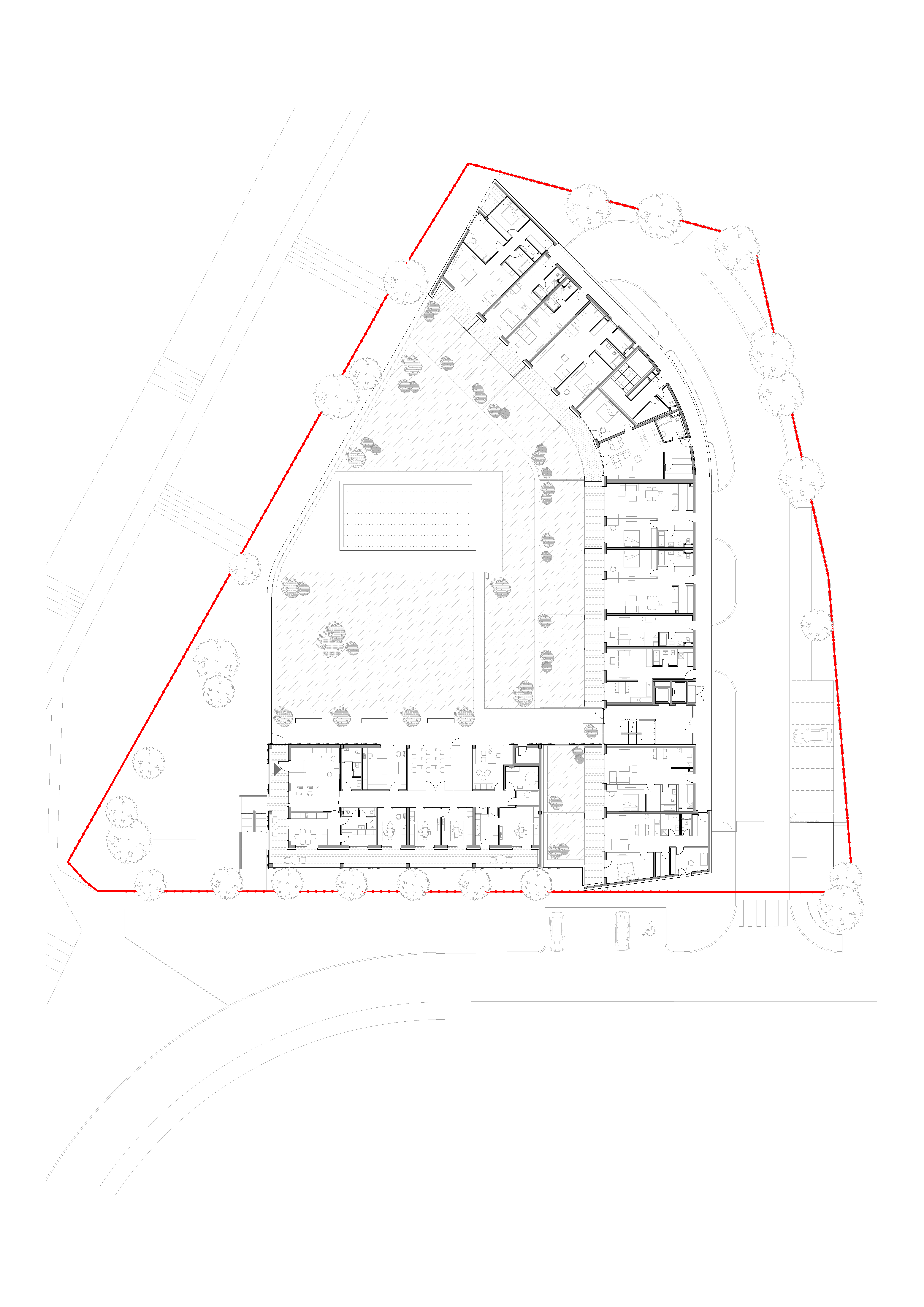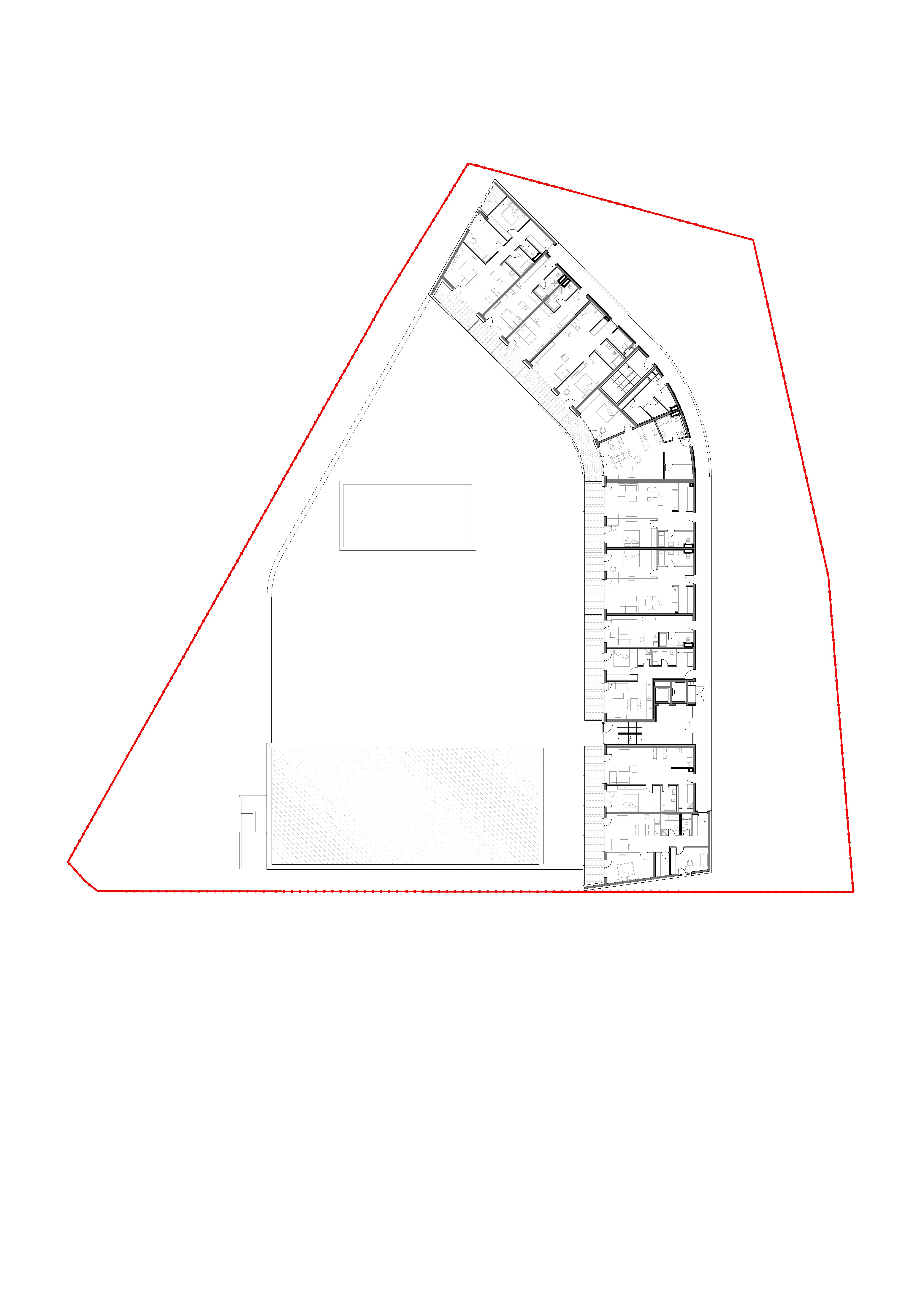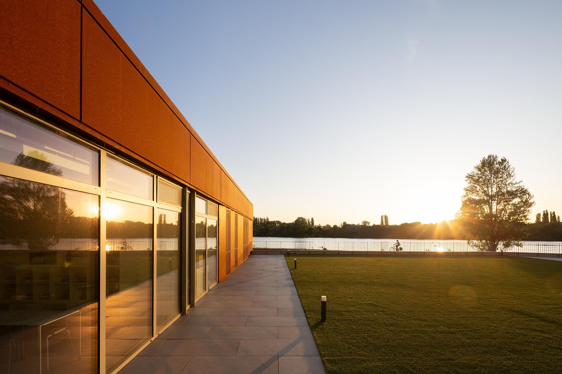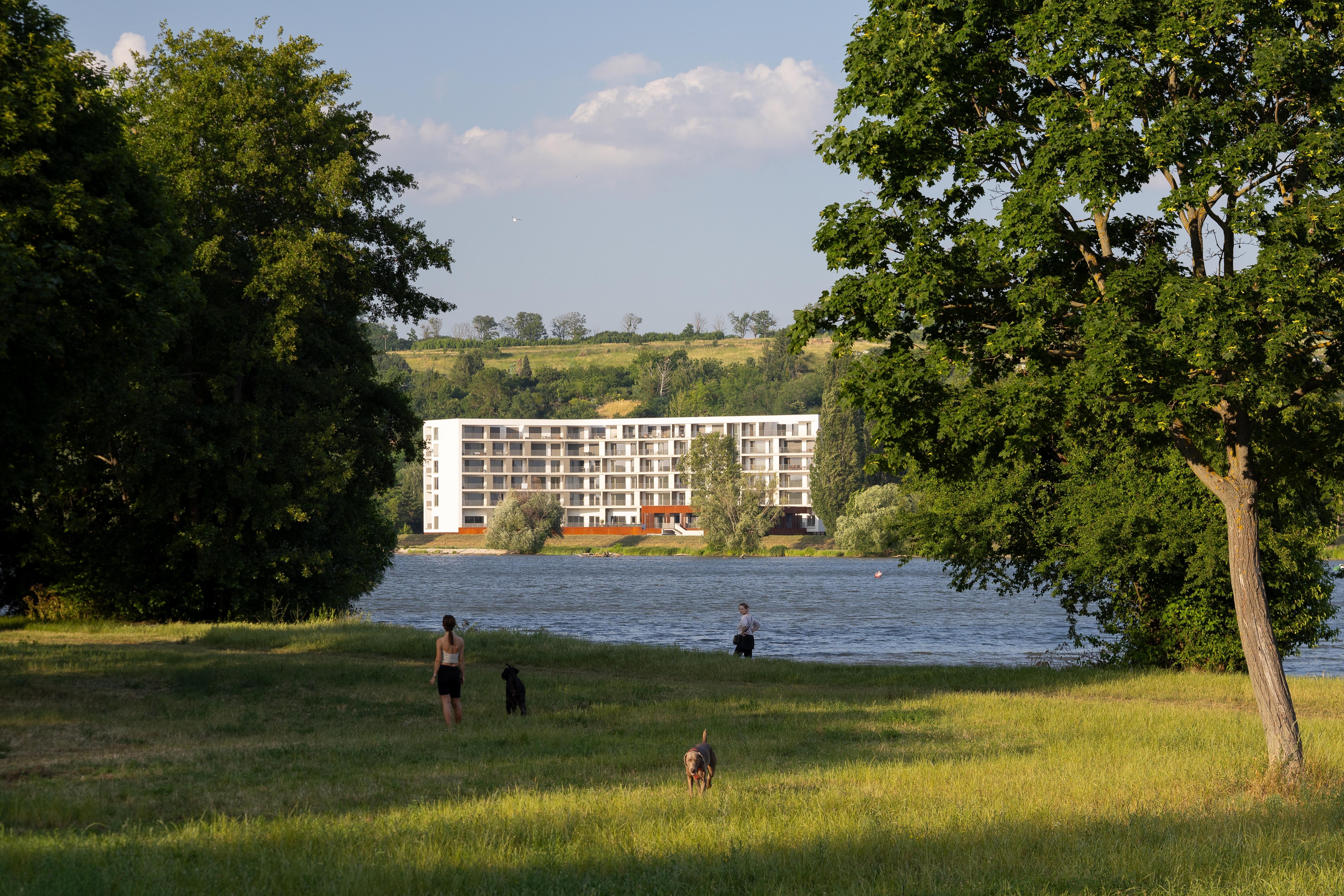 Vnútrobloková zelená terasa s bazénom funguje ako spoločný dvor a prirodzené rozšírenie súkromných priestorov. Zároveň prepája objekt s krajinným rámcom hrádze a líniou nábrežia.