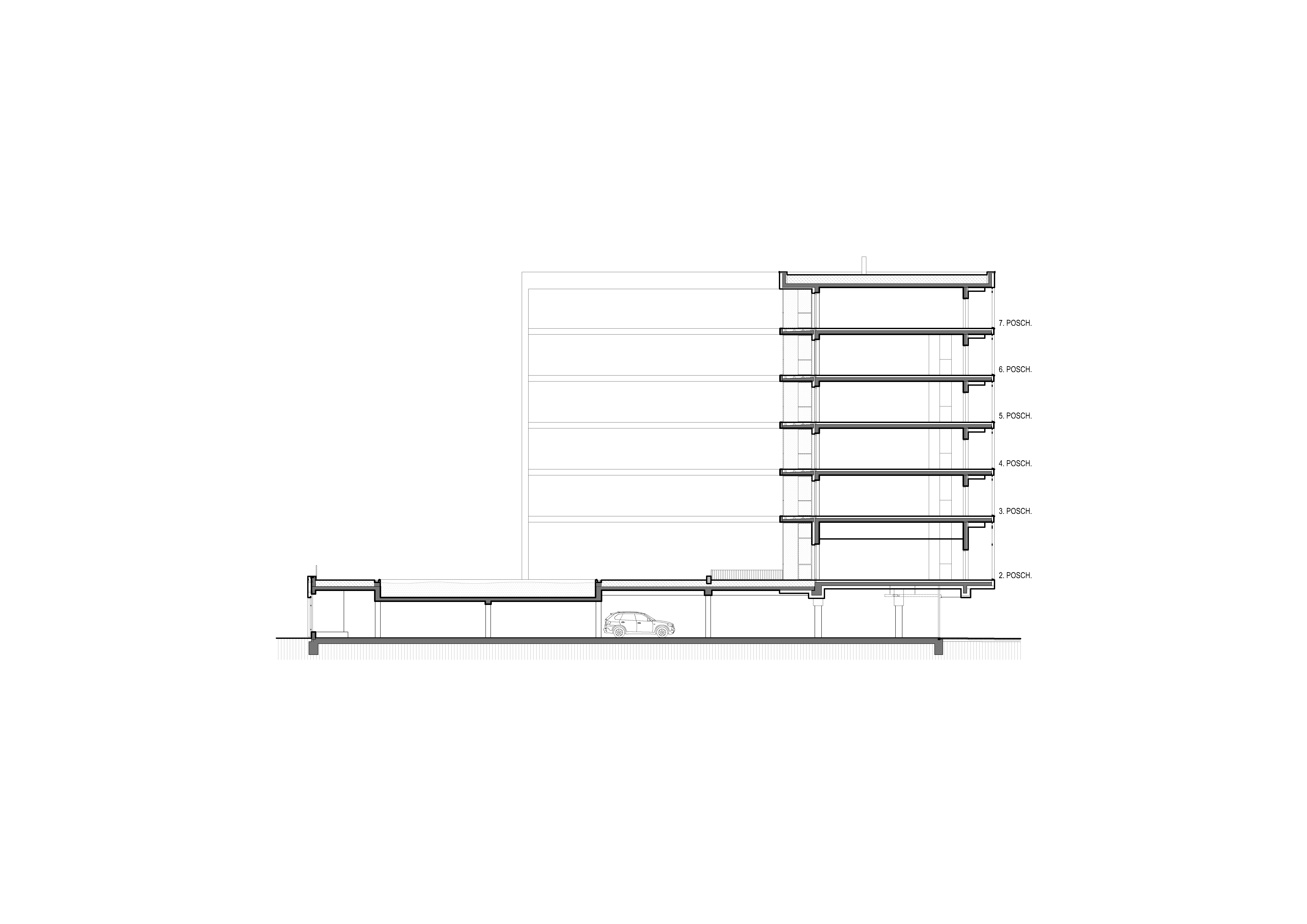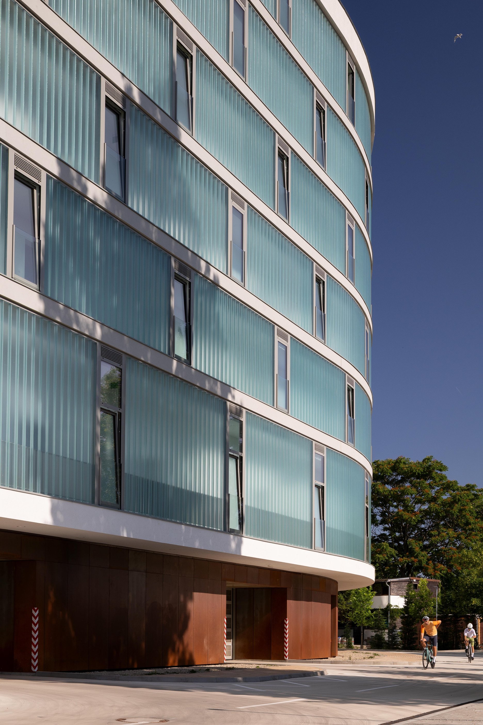 Byty v kontakte so zelenou terasou sú navrhnuté s predzáhradkami. Pohľadový betón a biela omietka sú kombinované s Cor-Tenovou fasádou v parteri a kompozitnými bronzovými doskami predeľujúcimi jednotlivé loggie.