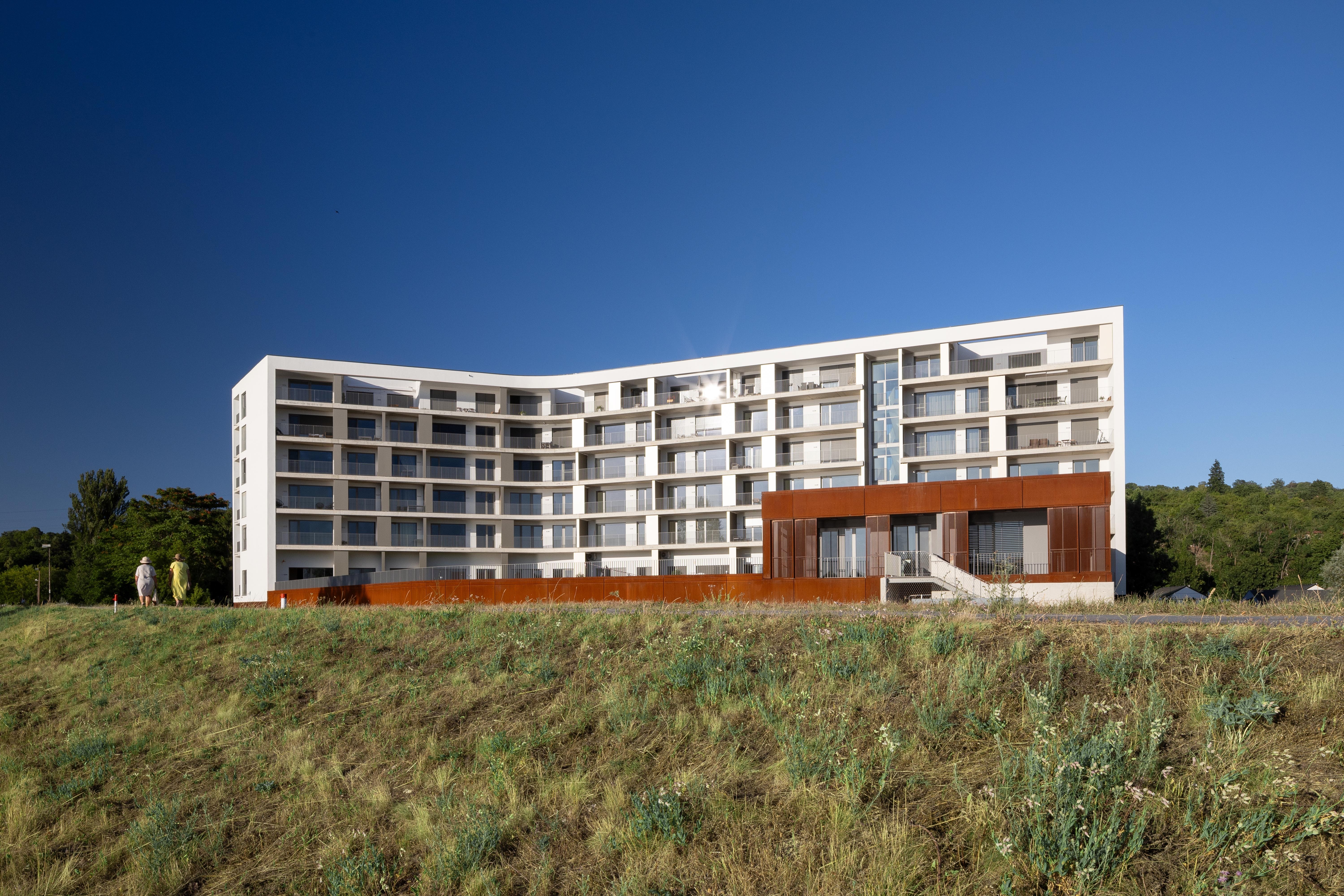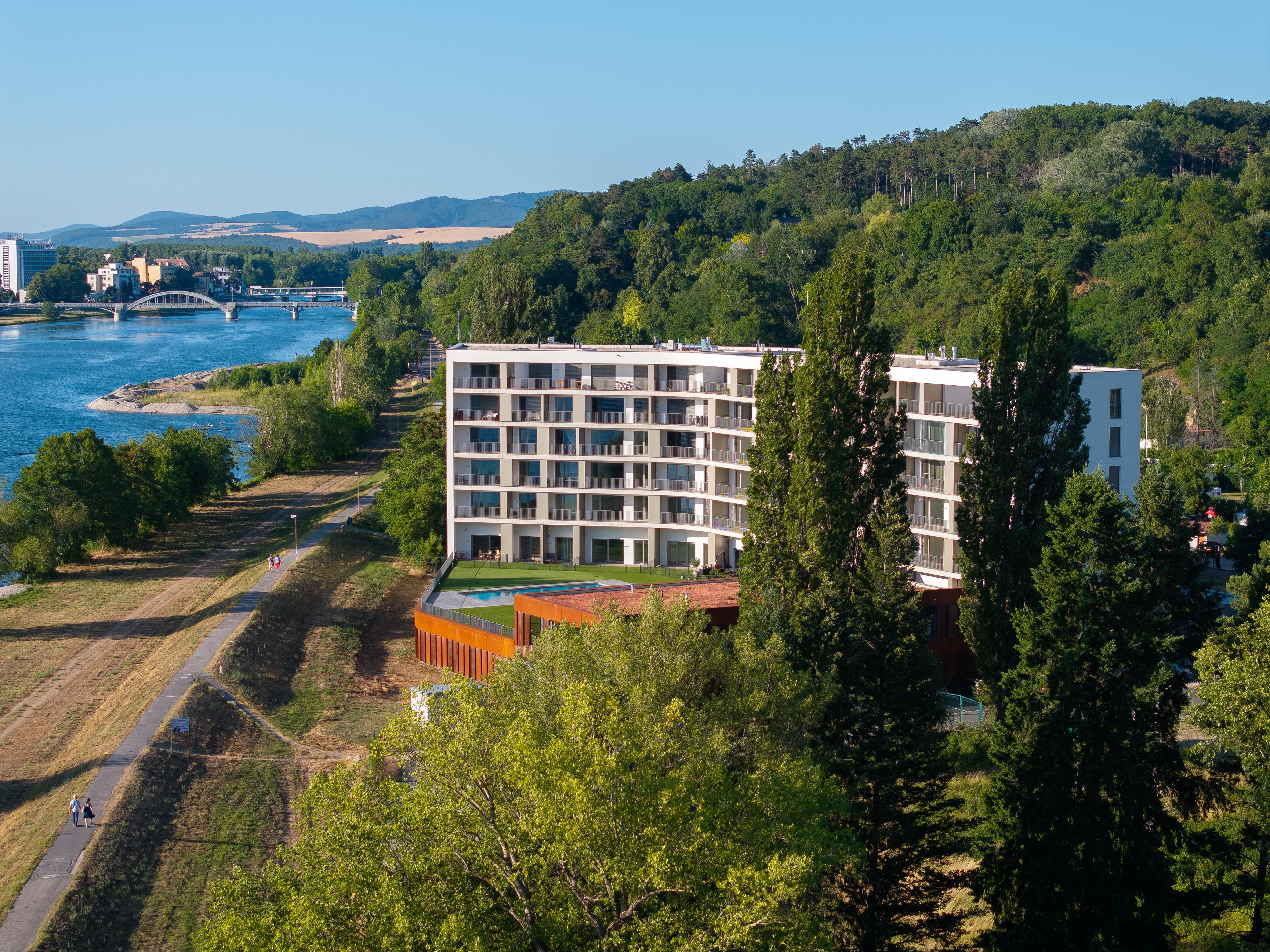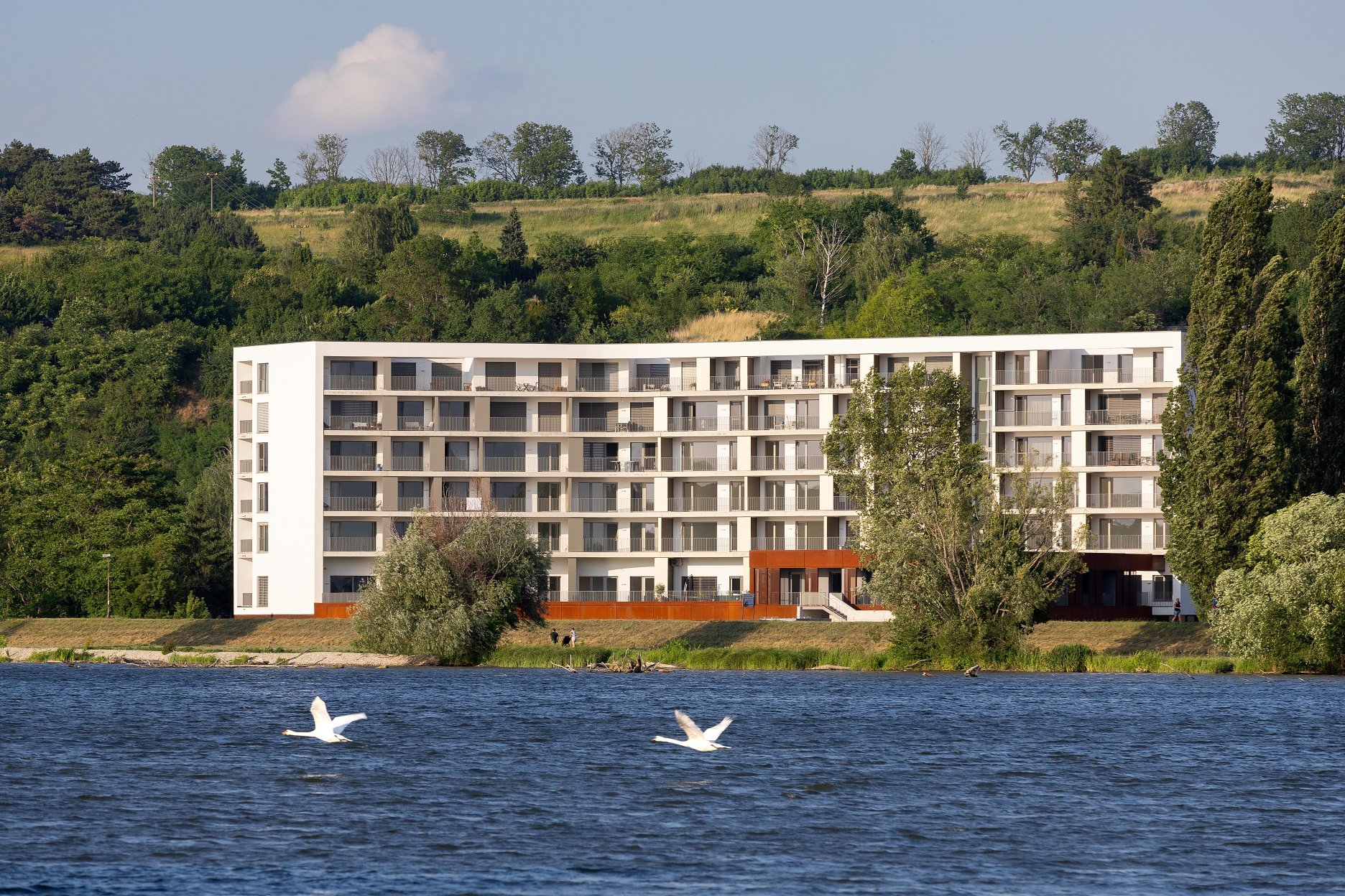 Architektonické riešenie z dielne architekti SPDe definuje subtílne prehnutá hmota sedempodlažného krídla, ktorá sa sa opiera o líniu hrádze a otvára sa smerom k vode. Dvojica horizontálnych vrstiev – tmavšia podnož s verejnými a poloverejnými funkciami a nad ňou uložená bledá obytná časť – vytvára čitateľnú kompozíciu, ktorú rytmizujú súvislé pásy lodžií a horizontálne atiky.
