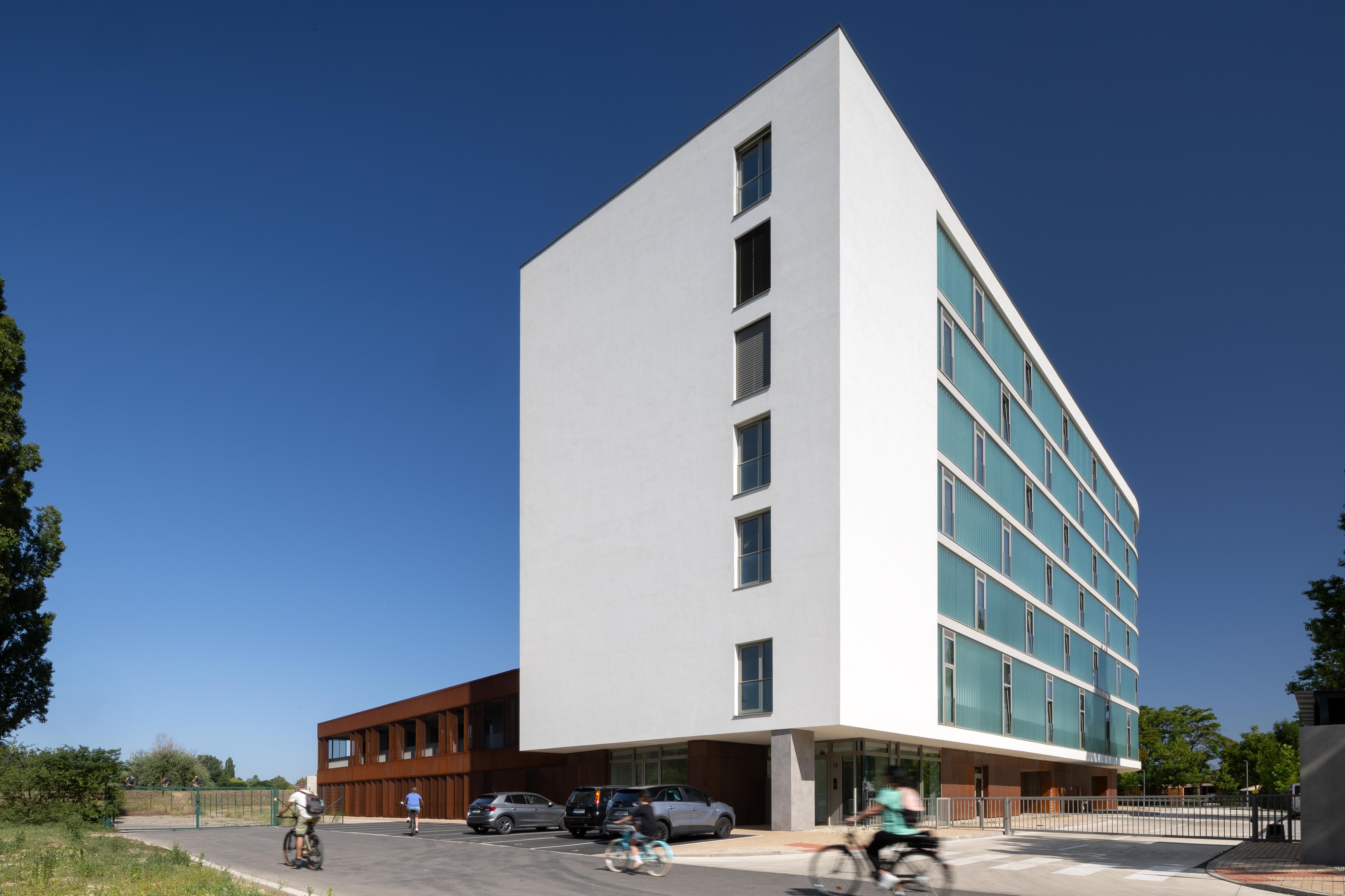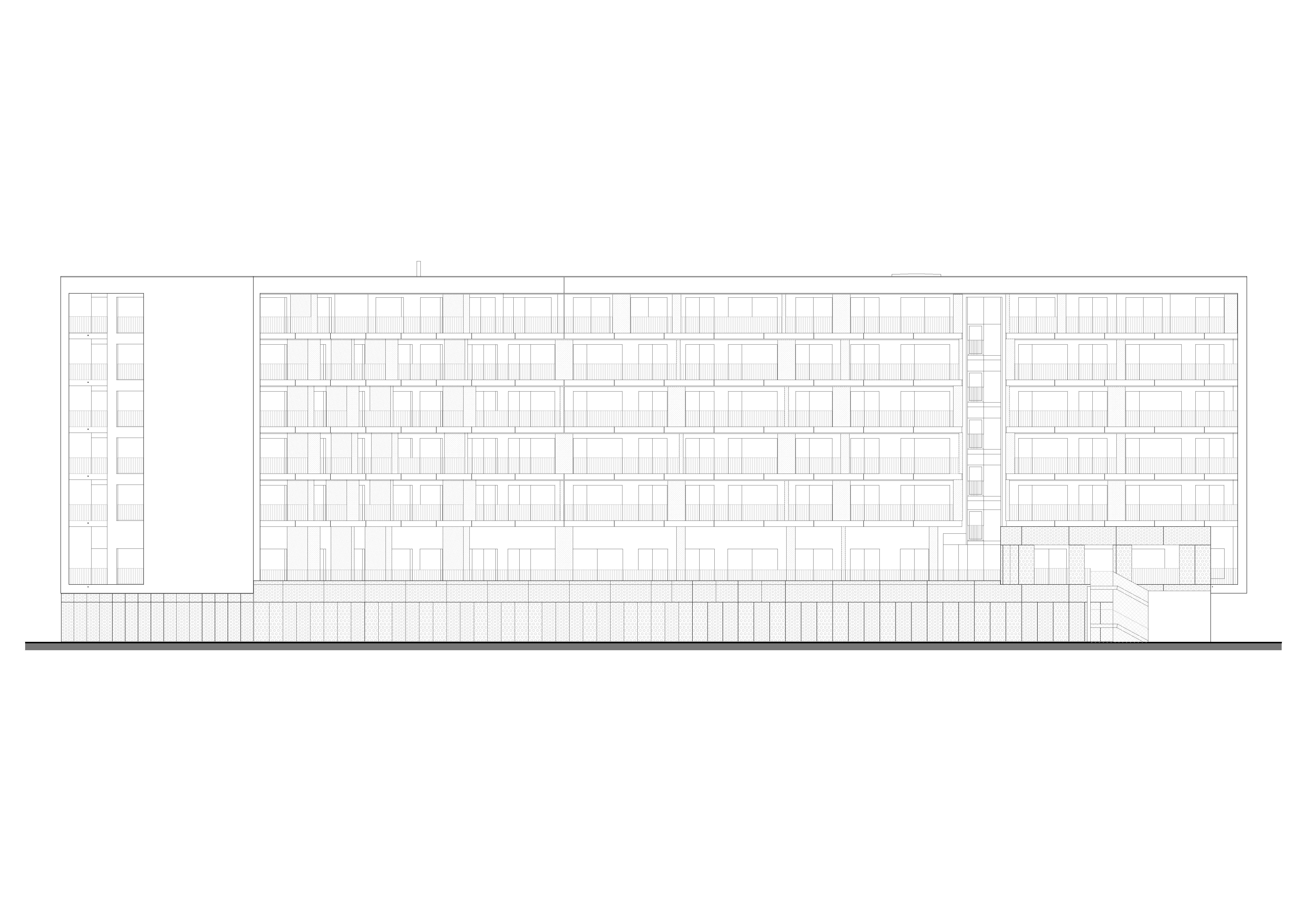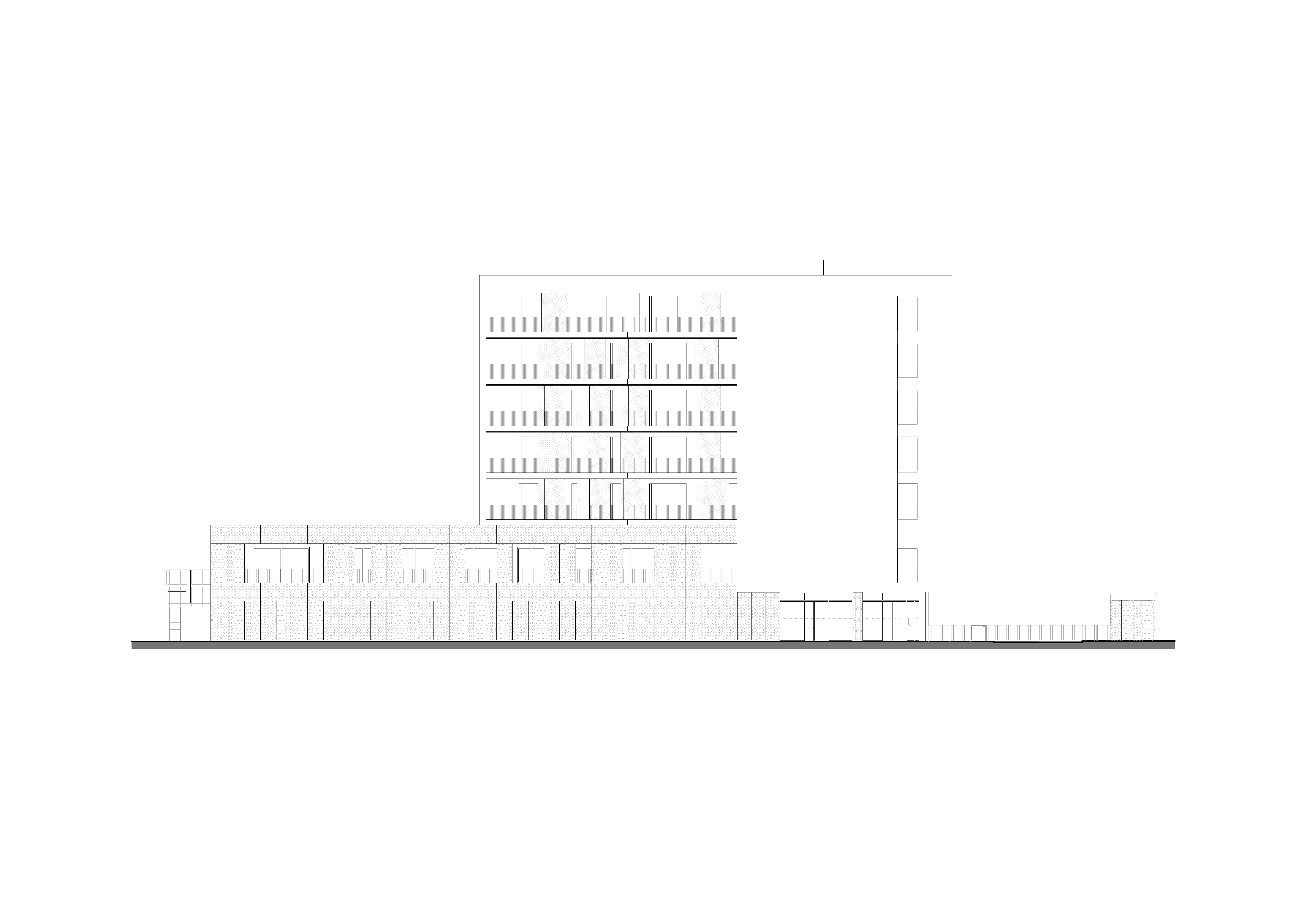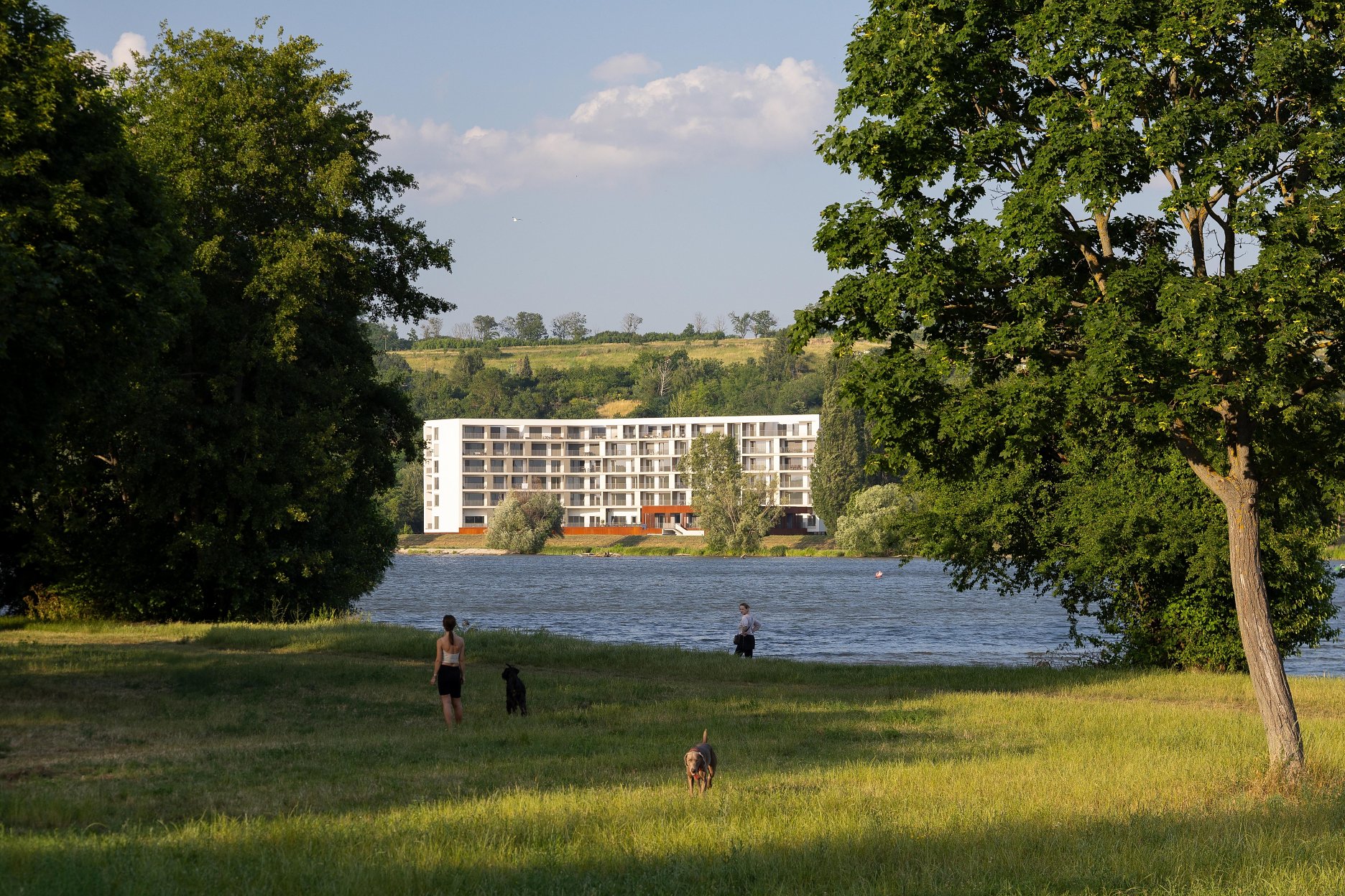 Architektonické riešenie z dielne architekti SPDe definuje subtílne prehnutá hmota sedempodlažného krídla, ktorá sa sa opiera o líniu hrádze a otvára sa smerom k vode. Dvojica horizontálnych vrstiev – tmavšia podnož s verejnými a poloverejnými funkciami a nad ňou uložená bledá obytná časť – vytvára čitateľnú kompozíciu, ktorú rytmizujú súvislé pásy lodžií a horizontálne atiky.