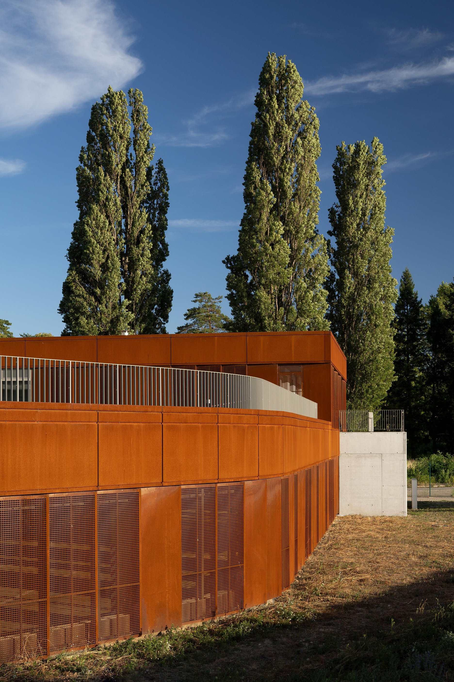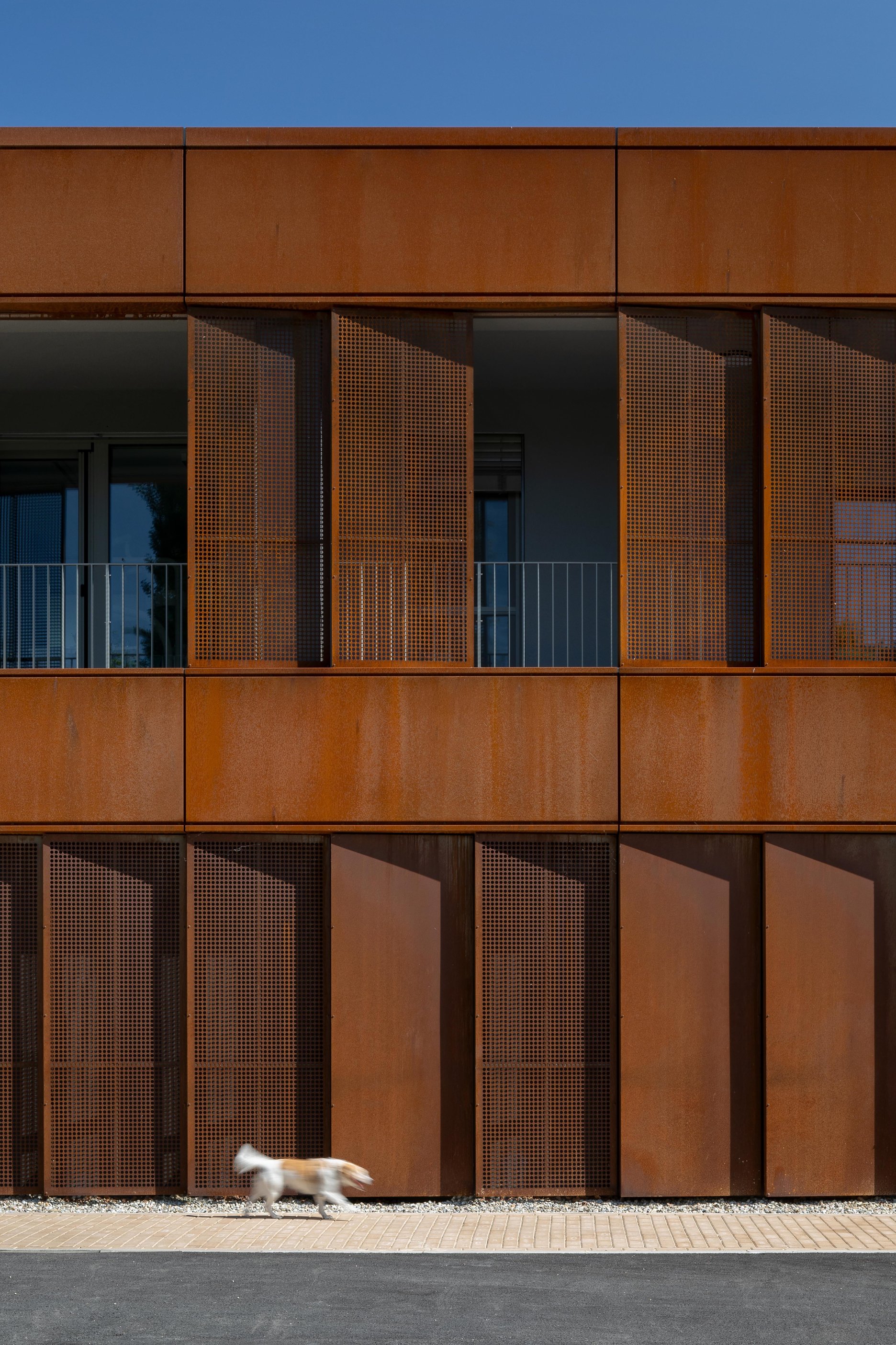 Dizajnové fasádne obklady od spoločnosti Ruukki: Ruukki Liberta® Cor-Ten 600, Ruukki Liberta® Cor-Ten 800, Lamella Cor-Ten s art perforom a bez perforu vyrobená na mieru a použitá na parkovaciu časť, hladký Cor-Ten a kompozitný panel Ruukki Primo Plana 10 v bronzovej metalickej farbe lakovaný z oboch strán na predel lodžií.