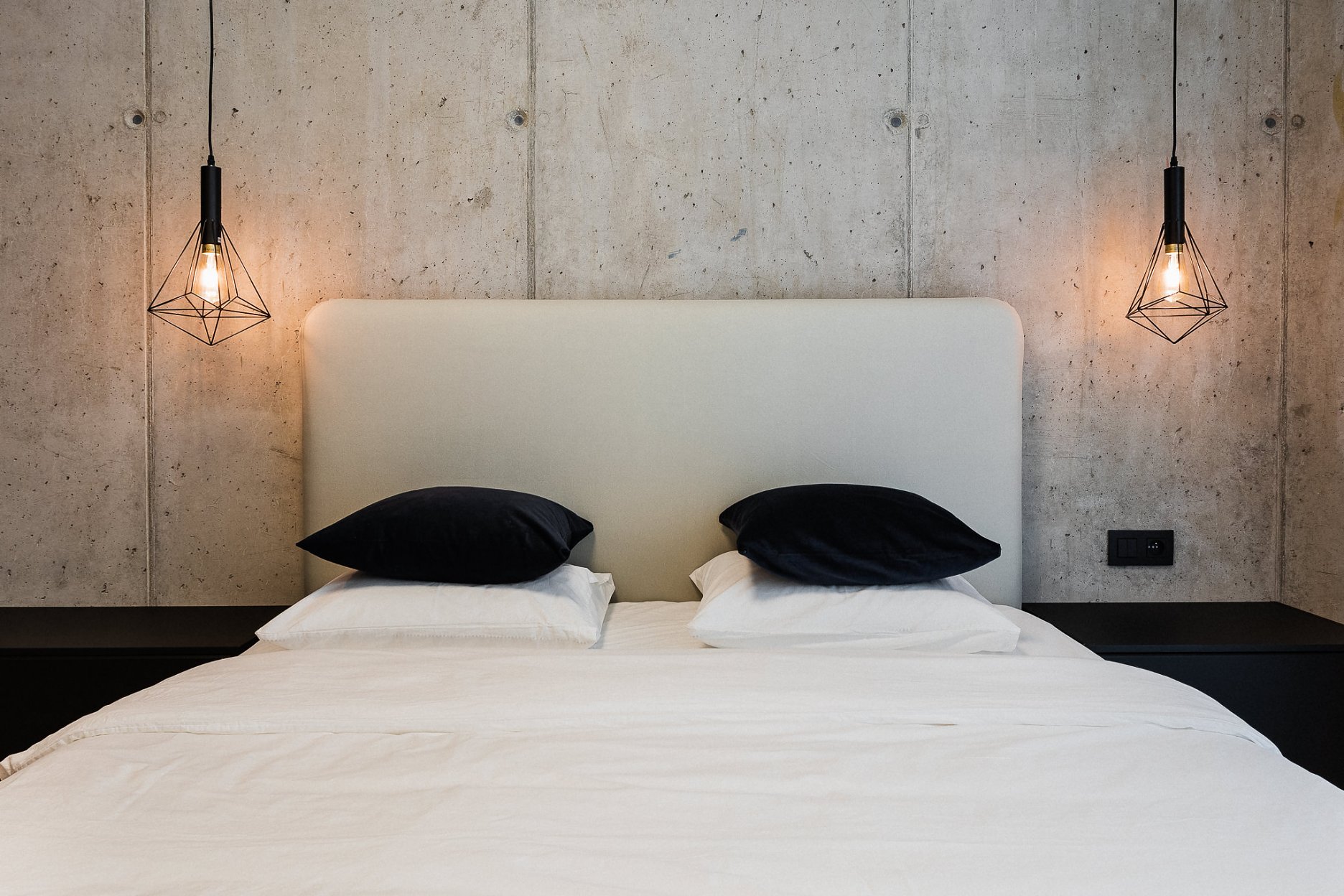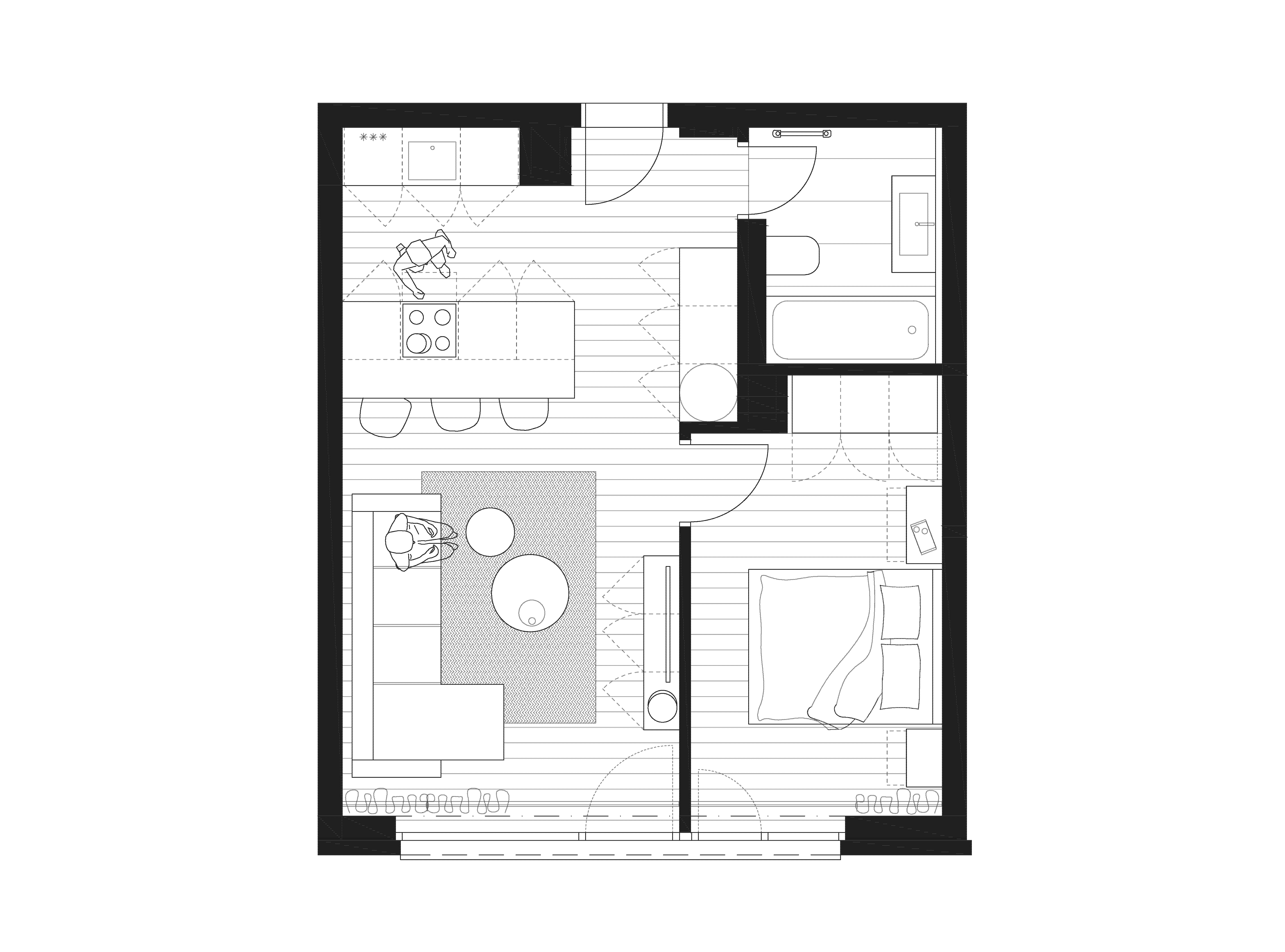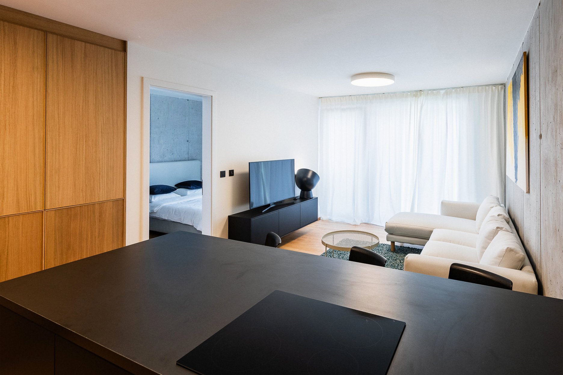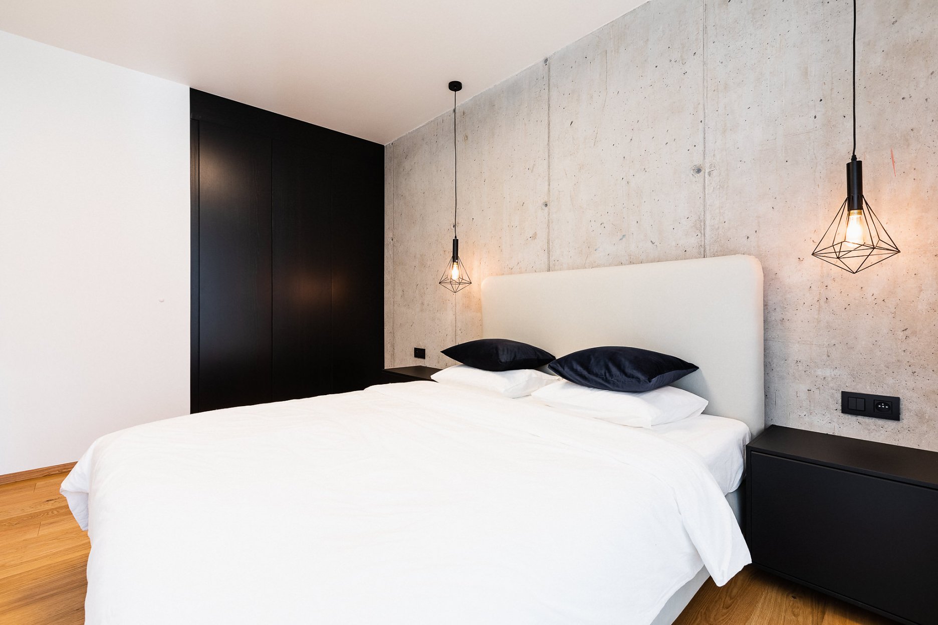 Byt je rozdelený na dennú a nočnú zónu. Vstupná časť s rozsiahlym zabudovaným šatníkom plynulo prechádza do hlavného obytného priestoru. Miestnosť predeľuje tmavý kuchynský ostrov, ktorý zároveň slúži ako jedálenský stôl s vyšším sedením. Zo zádveria je prístupná stroho zariadená kúpeľňa obložená kamenným obkladom s vaňou a zrkadlom prechádzajúcim celou miestnosťou. Spálňa s dvojposteľou s látkovým čelom a zabudovanou šatníkovou skriňou poskytuje nerušený výhľad na centrum mesta.
