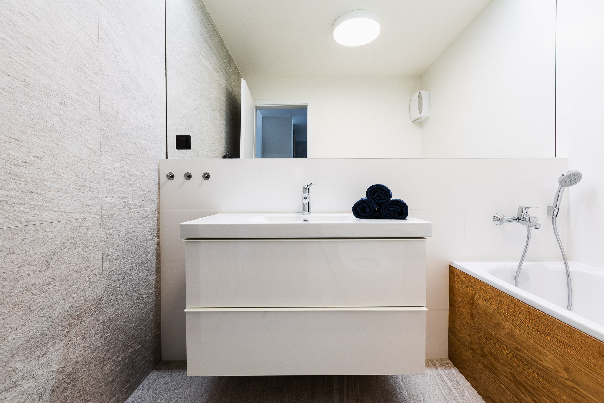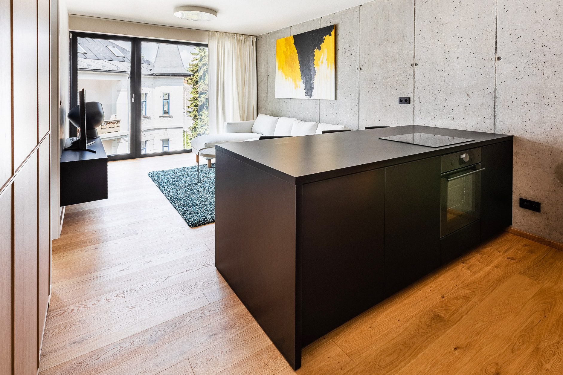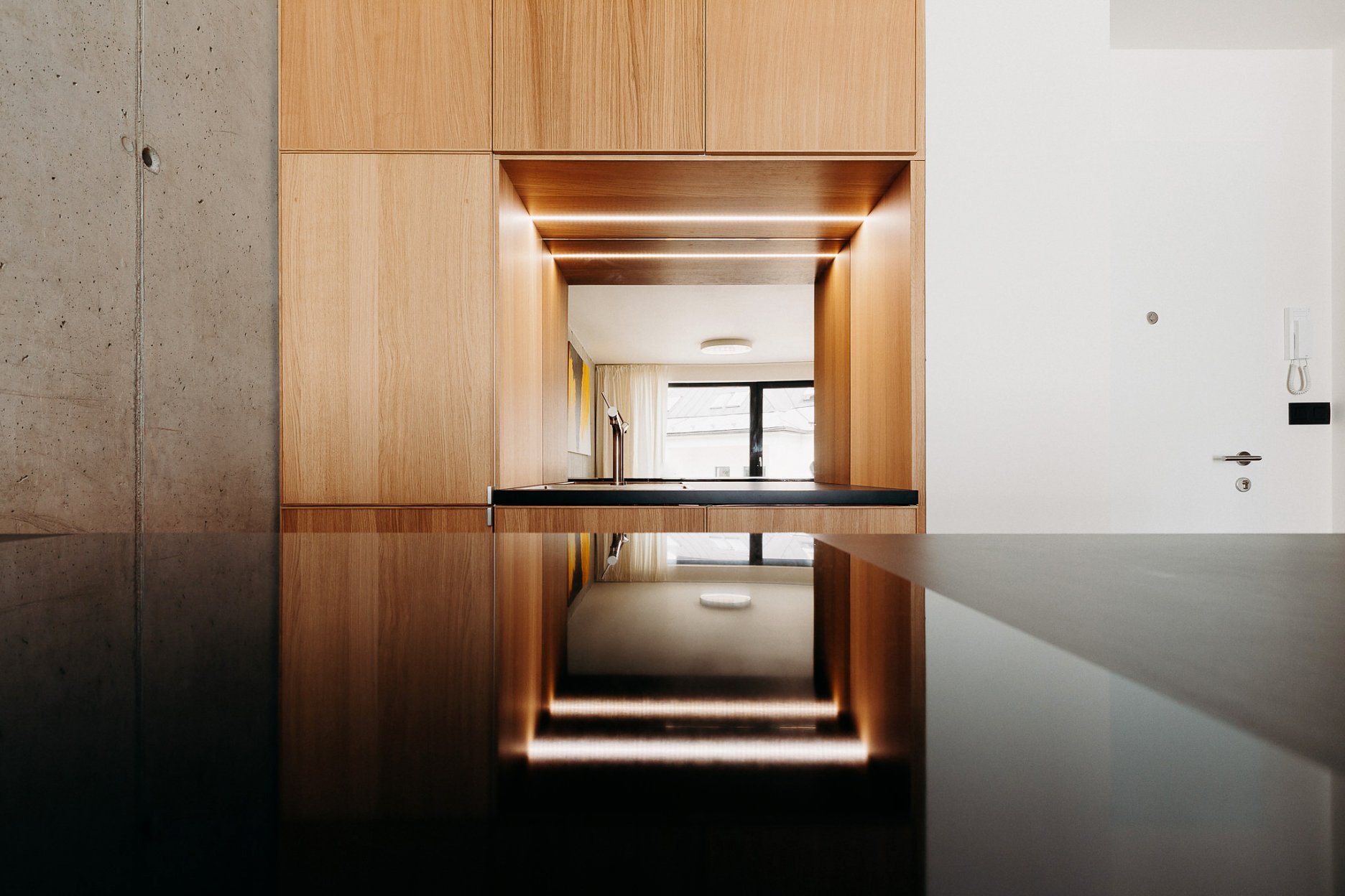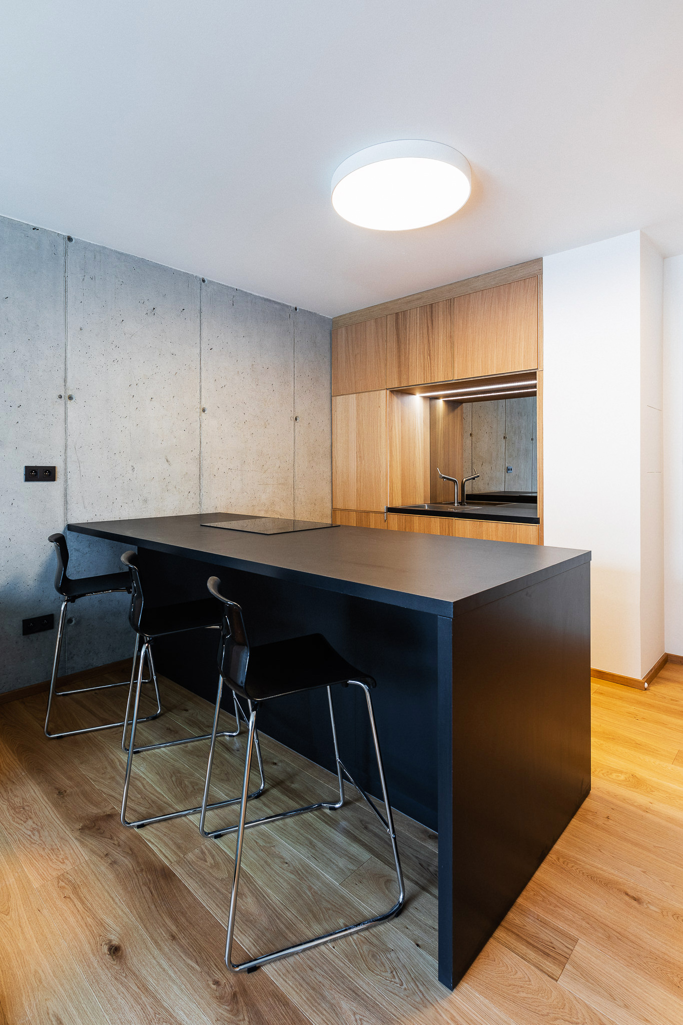 Betón, drevo a hladkú omietku dopĺňajú čierne nábytkové boxy a výrazná zrkadlová zástena. Žiadne luxusné materiály, drahé atypické detaily či zariadenie, zato však využiteľný a funkčný byt s potenciálom pre plnohodnotné bývanie v centre mesta.