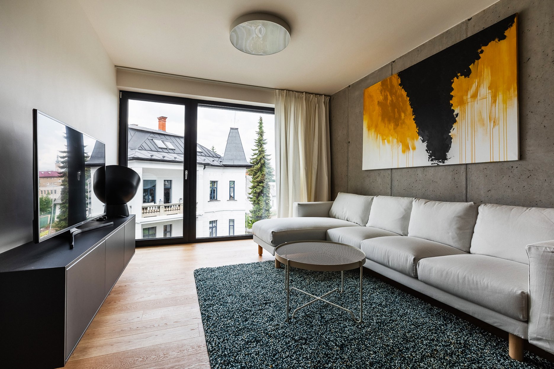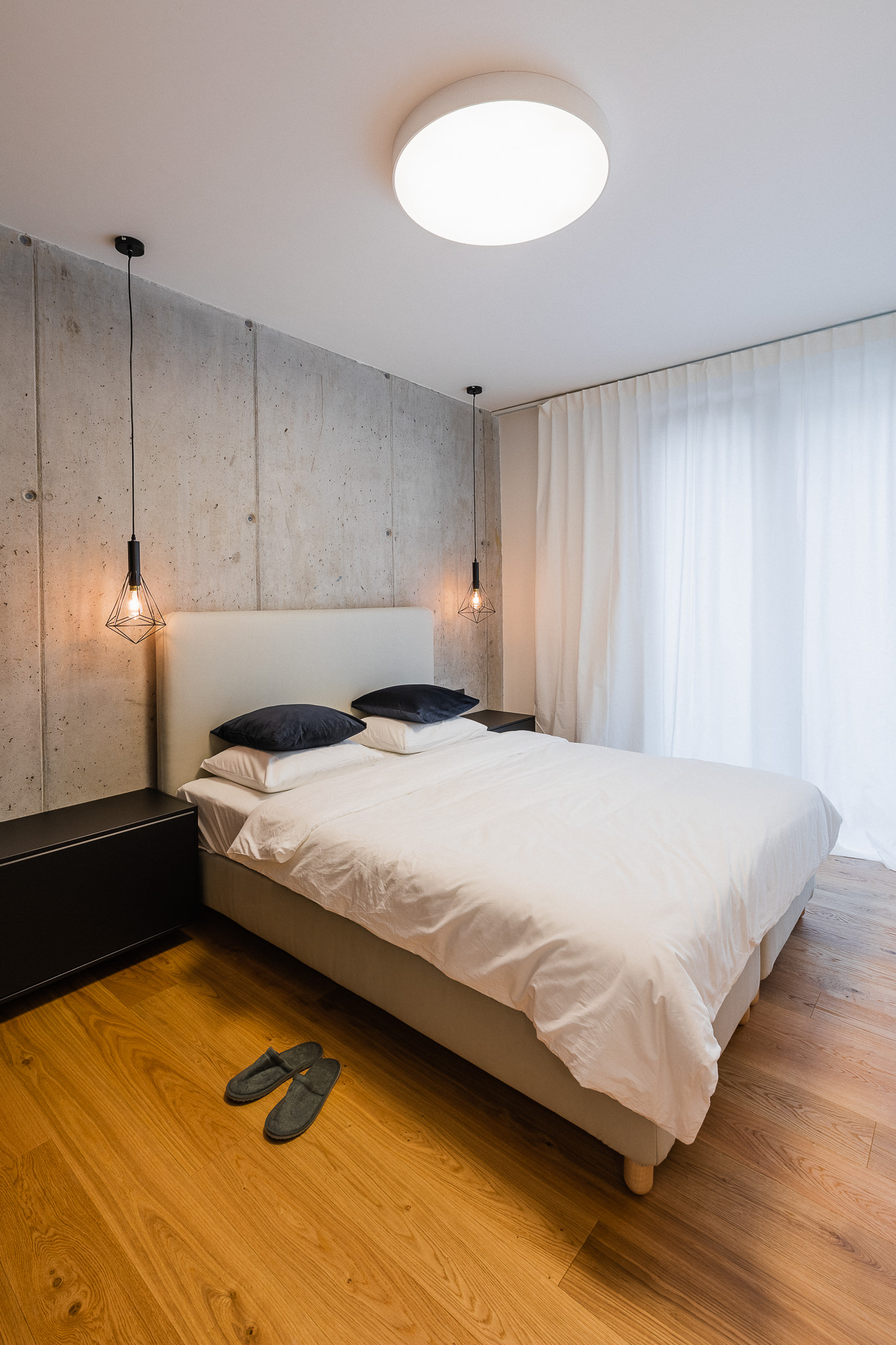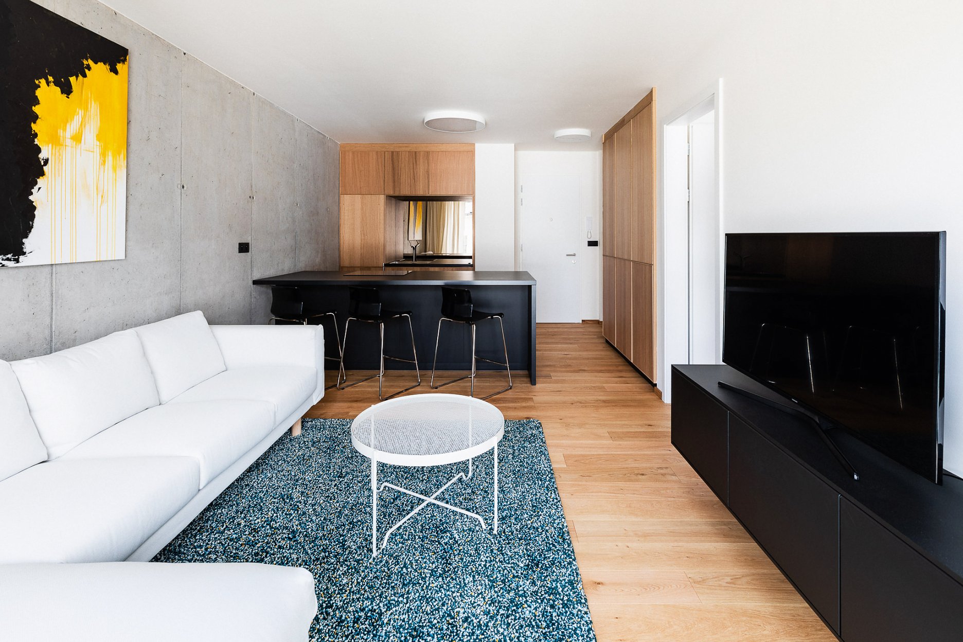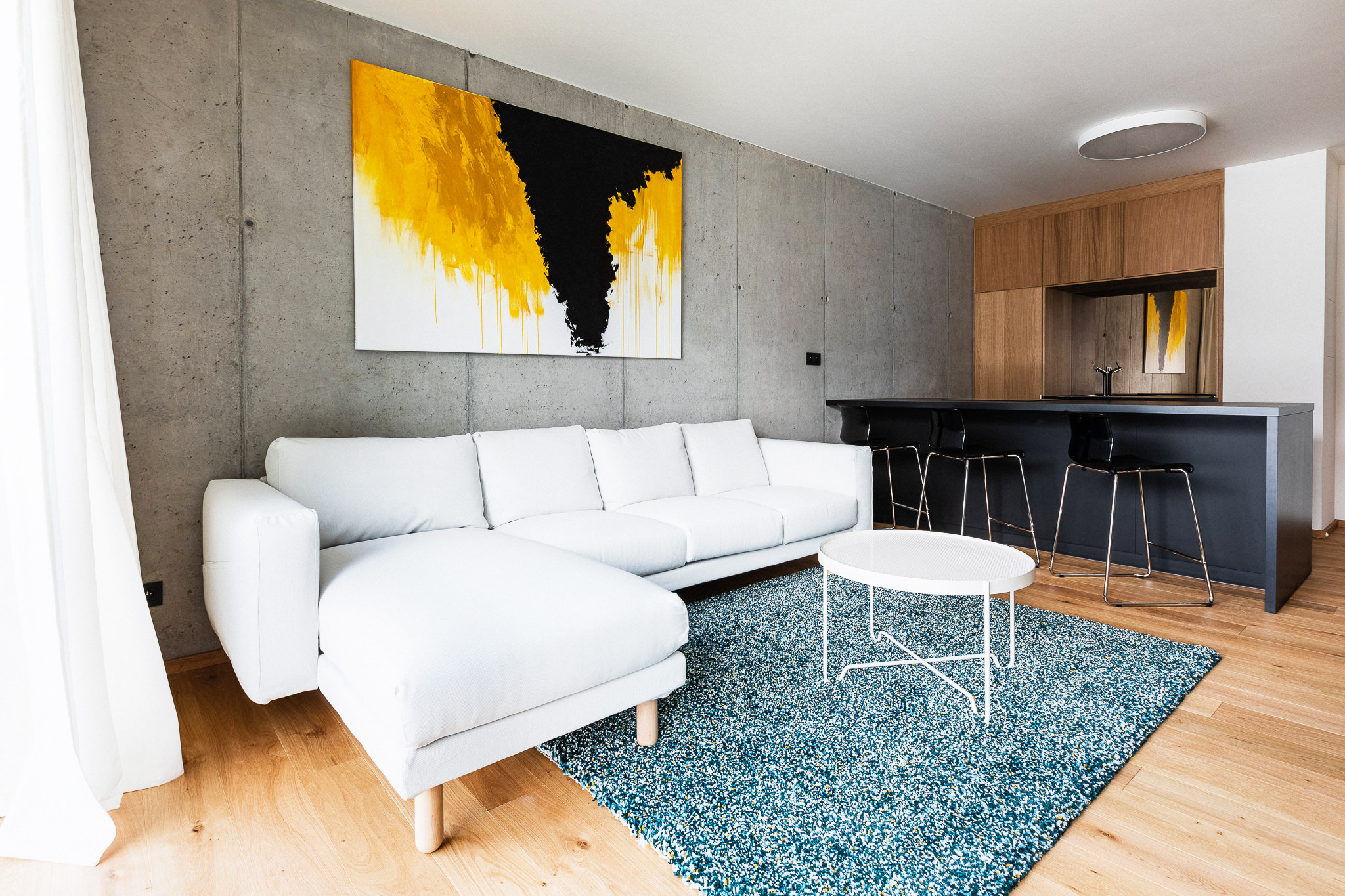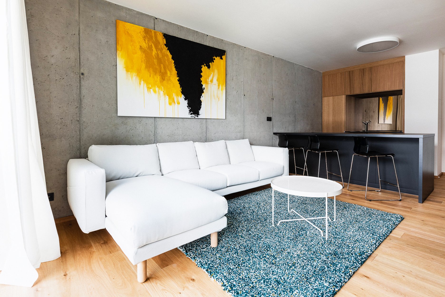 Pri obhliadke nás pri vstupe do bytu zaujal nerušený výhľad cez rozsiahle zasklenie, prebiehajúce cez celé čelo bytu orientované na severovýchod. Architekt počítal s návrhom interiéru bytu už počas prípravnej fázy projektu. To mu umožnilo ponechanie betónových stien v surovej, priznanej forme. Riešenie, ktoré nie je pre každého, v tomto prípade zapadá do celkového konceptu návrhu a v kombinácii s dubovými parketami a použitými materiálmi vytvára veľmi príjemnú atmosféru.