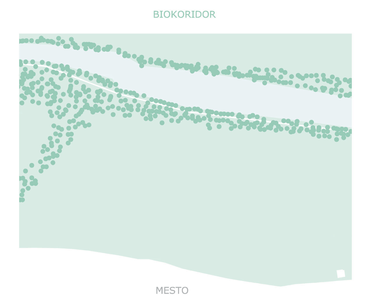 Tieto zelené priestory bez áut prepájajú existujúce Kamence s riekou a ponúkajú široké spektrum situácií a aktivít pre nových aj súčasných obyvateľov tak, aby nová zástavba nebola bariérou, ale spájajúcim elementom medzi mestom a riekou. Územie je organizované do pruhov, ktoré sú napojené na existujúcu štruktúru ulicami so vstupmi, spoločnými priestormi, vybavenosťou a parkovaním.