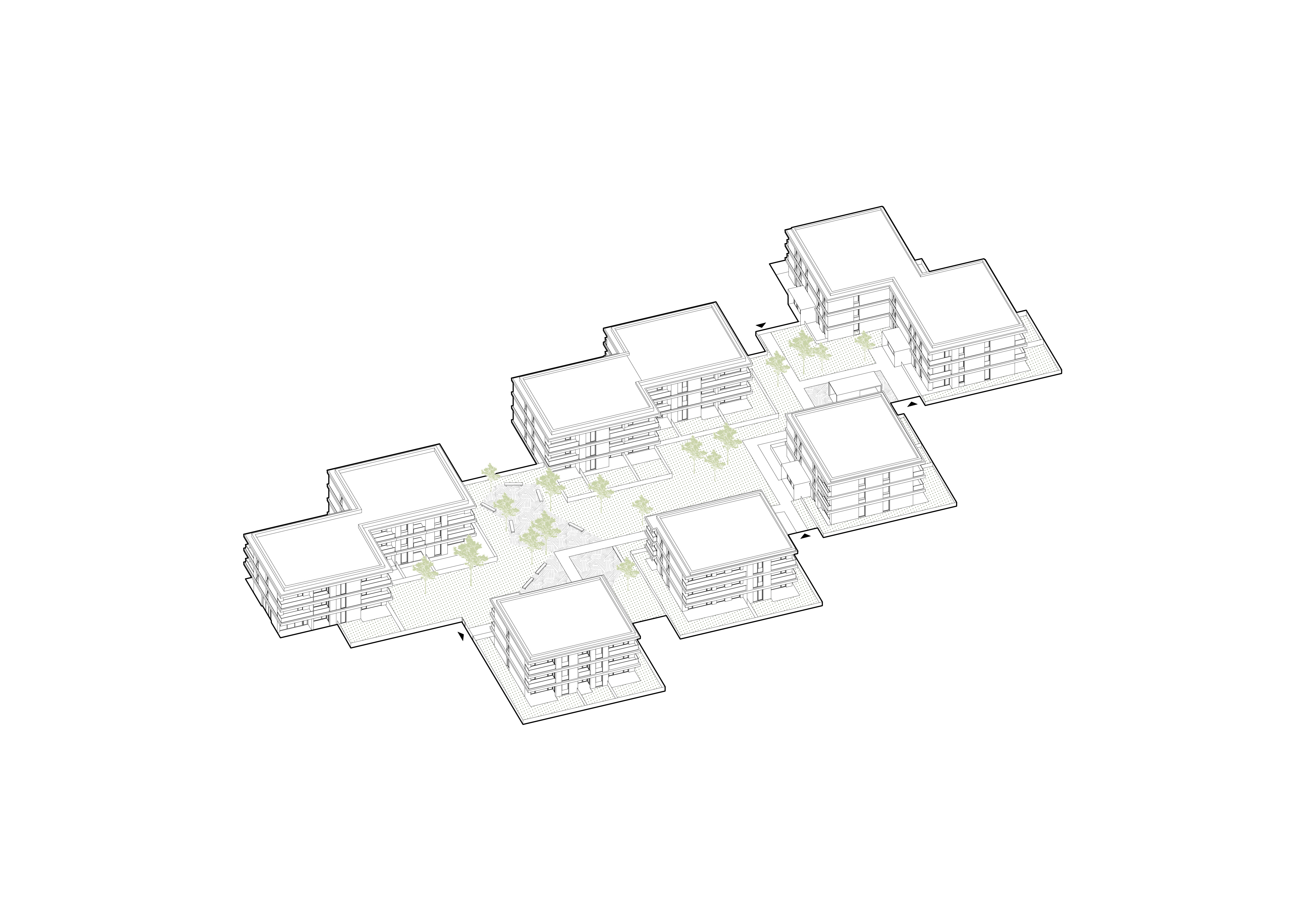 Priestorový koncept plánovaného súboru s celkovým počtom 336 bytov, ktorý vo finále zaberie plochu piatich hektárov, je založený na spojení piatich blokov usporiadaných okolo centrálneho verejného parku. Zelená plocha bude pri vstupe do územia doplnená o obchodné prevádzky v parteri domov a novú zastávku MHD.