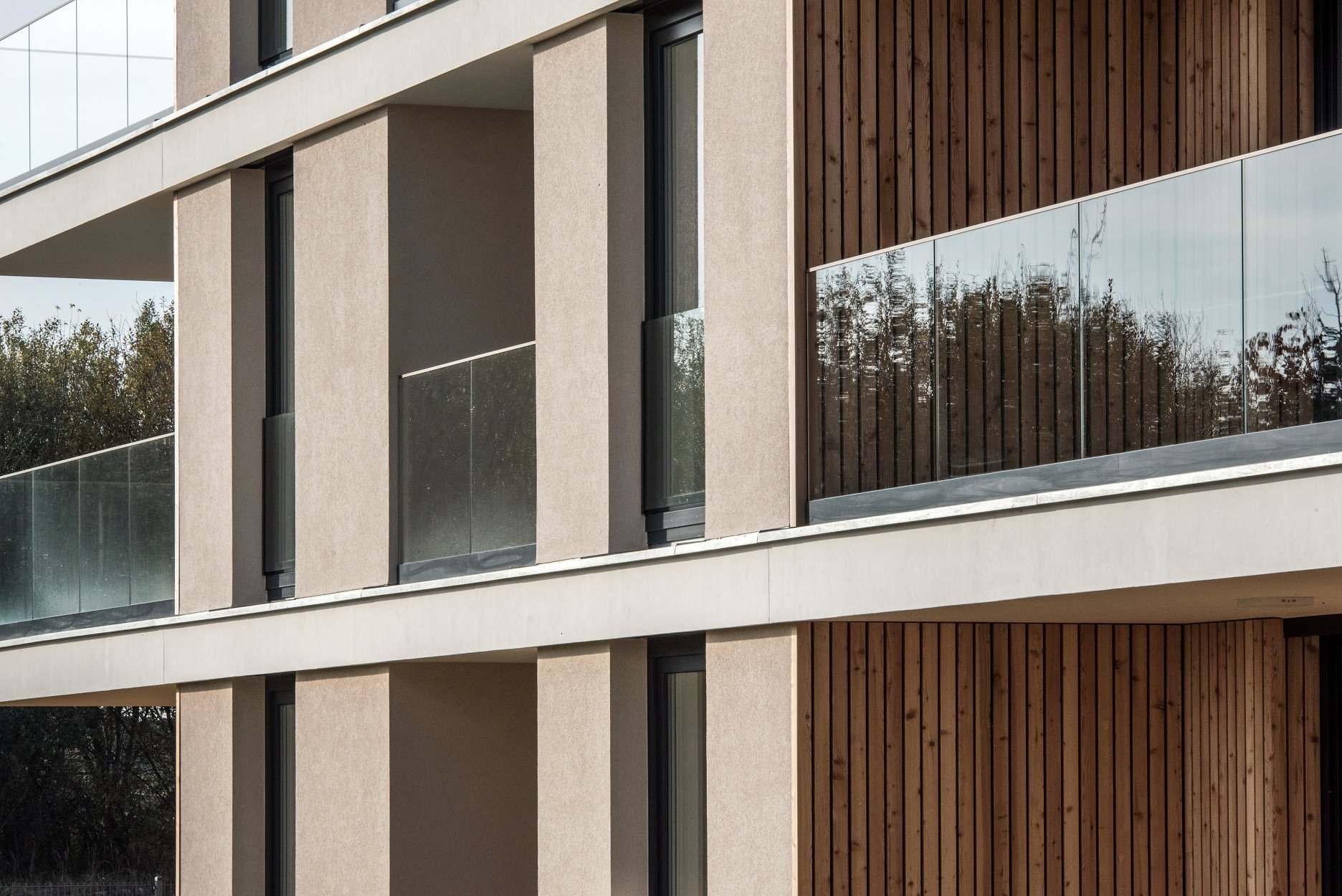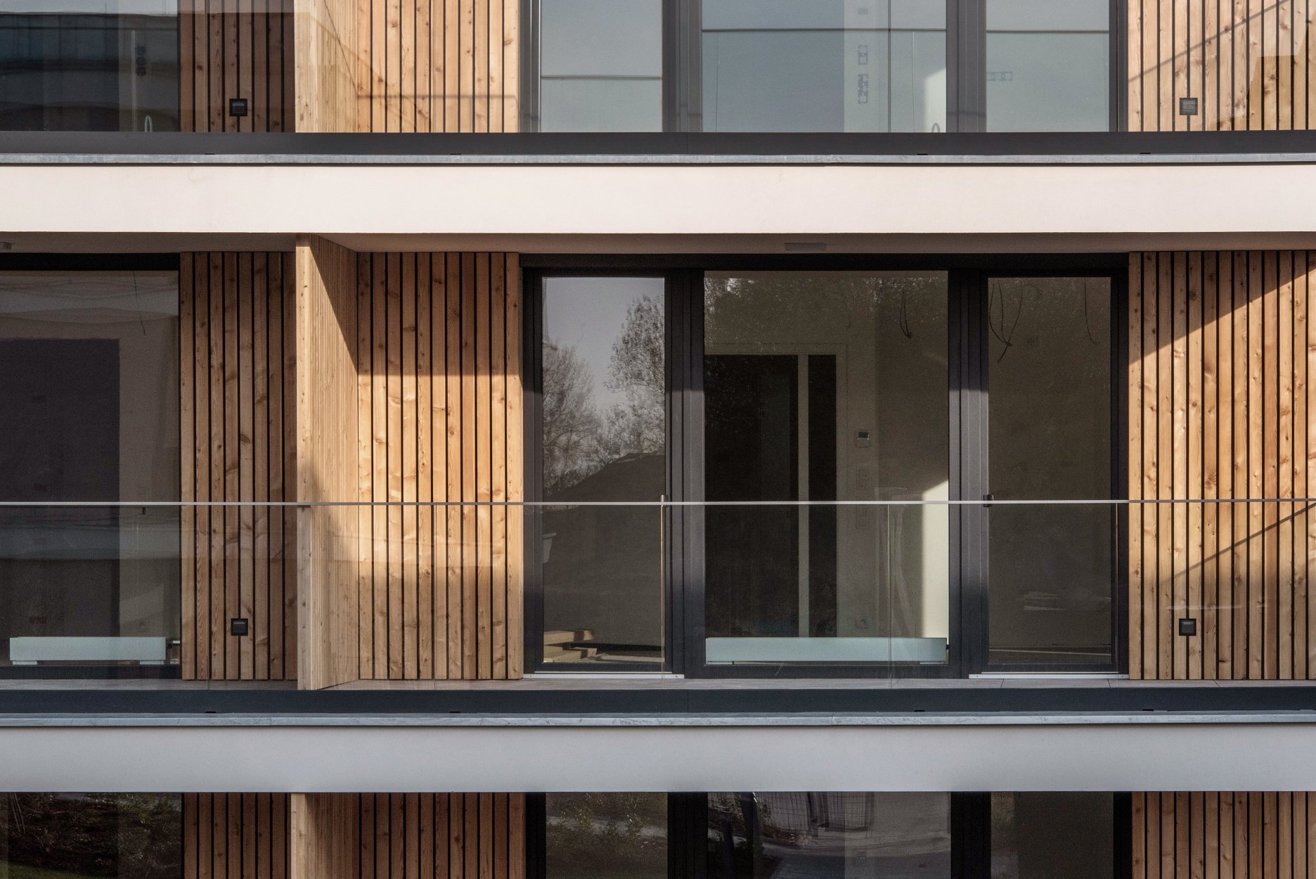 "Prírodný charakter bývania je ďalej rozvíjaný na architektonickej úrovni návrhu, a to predovšetkým voľbou materiálov, kedy je ako hlavný výrazový prvok domov použitý obklad lodžií smrekovcovým drevom bez povrchovej úpravy," dopĺňajú architekti.