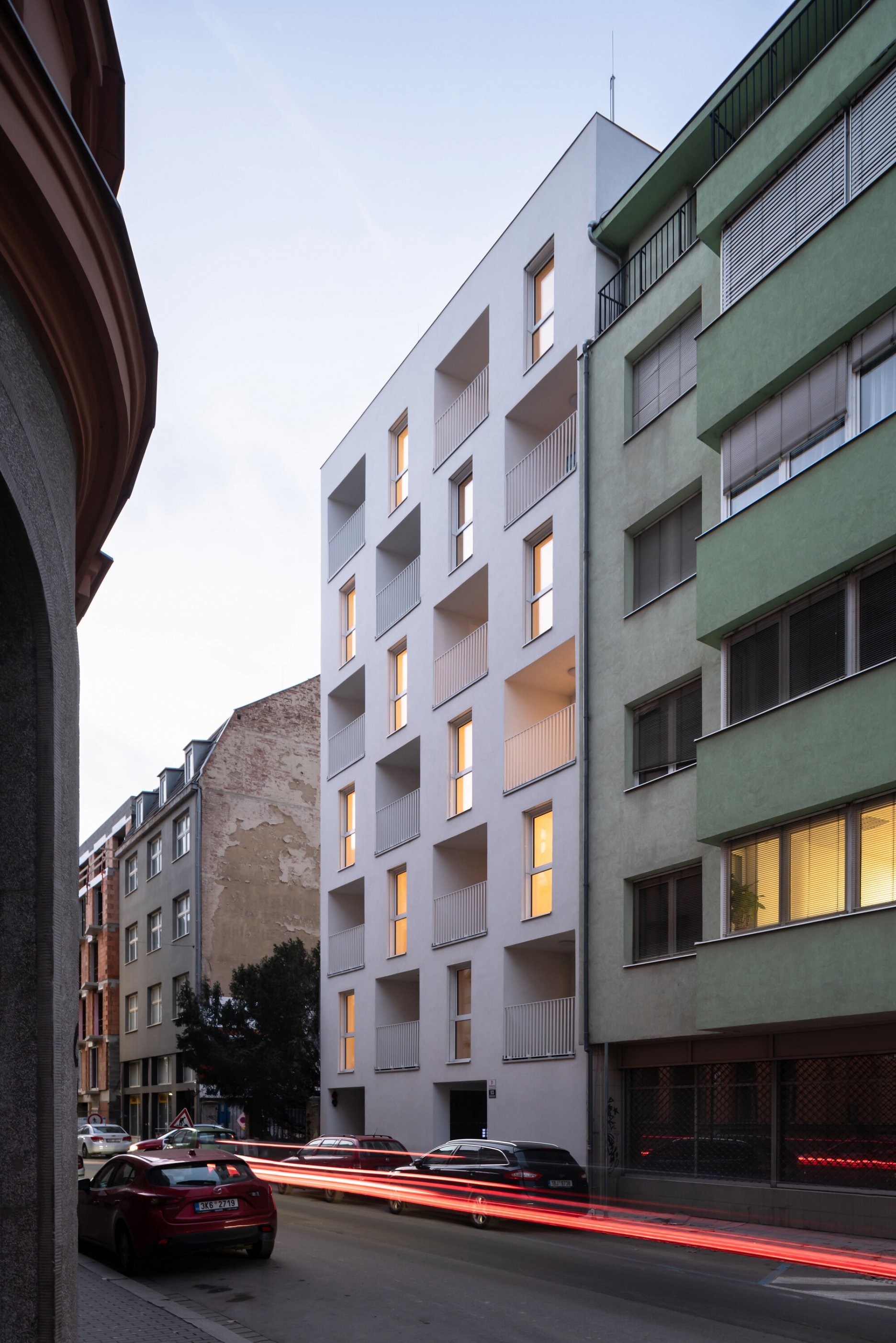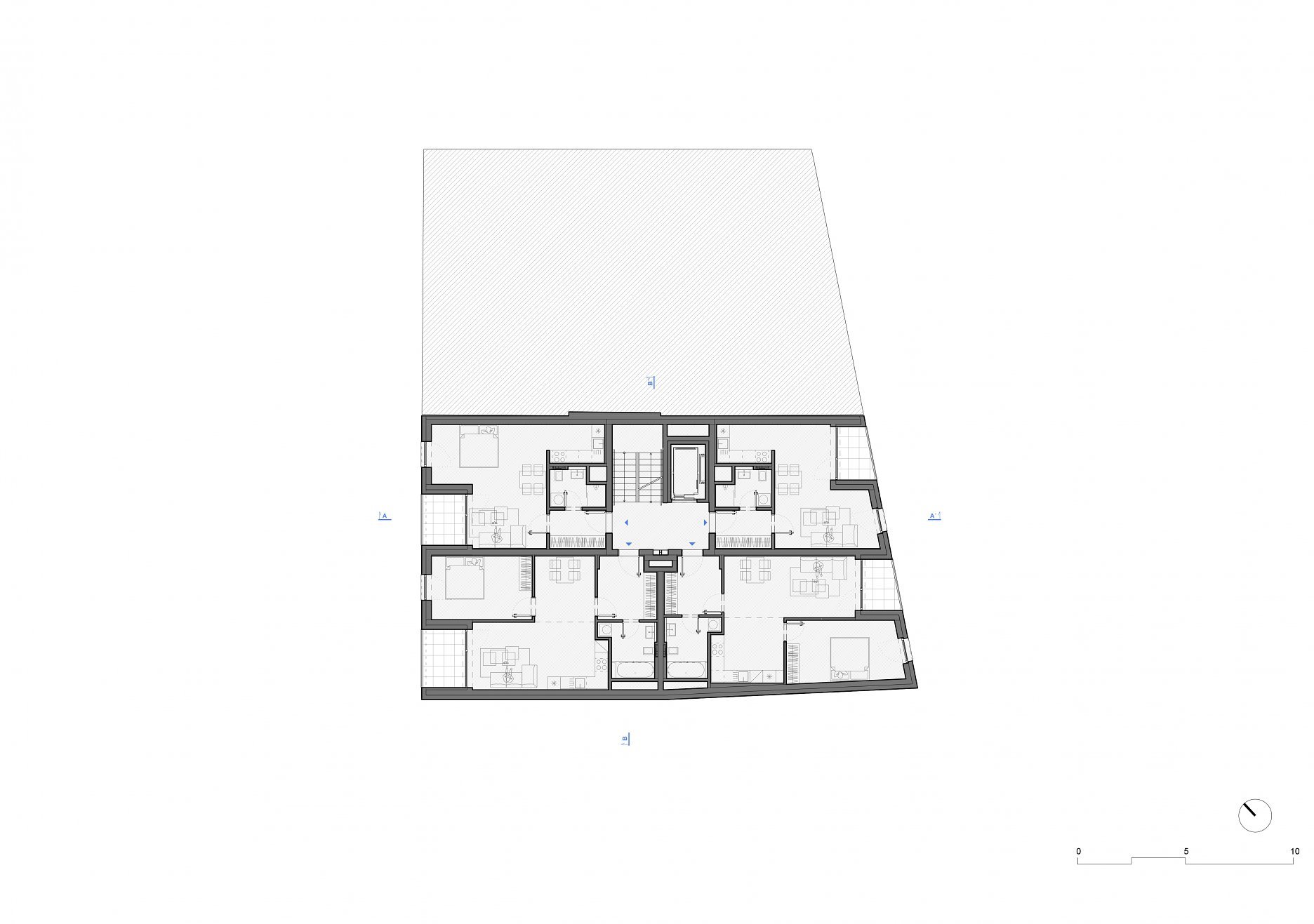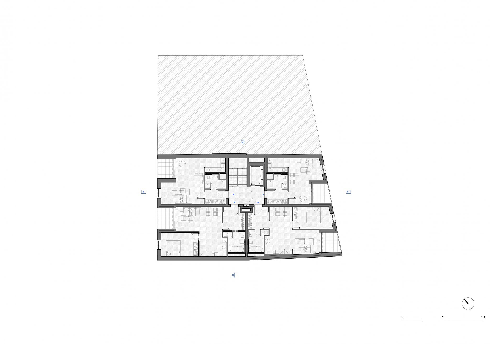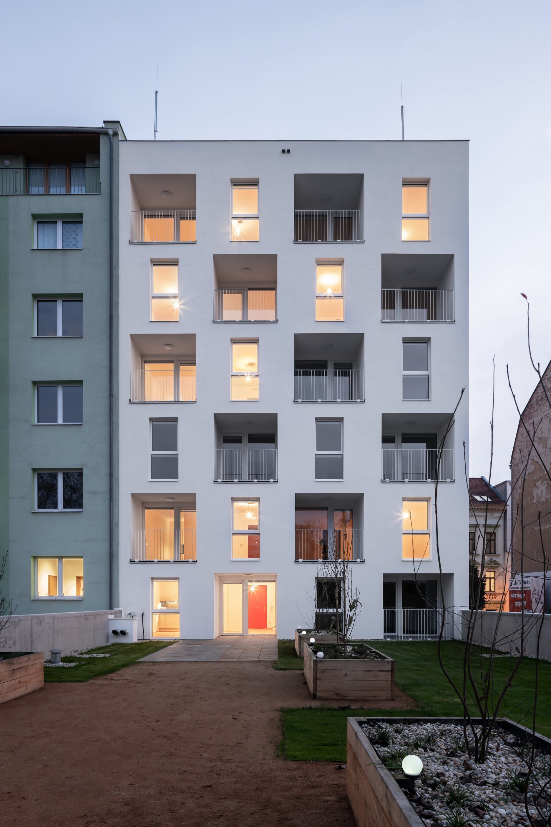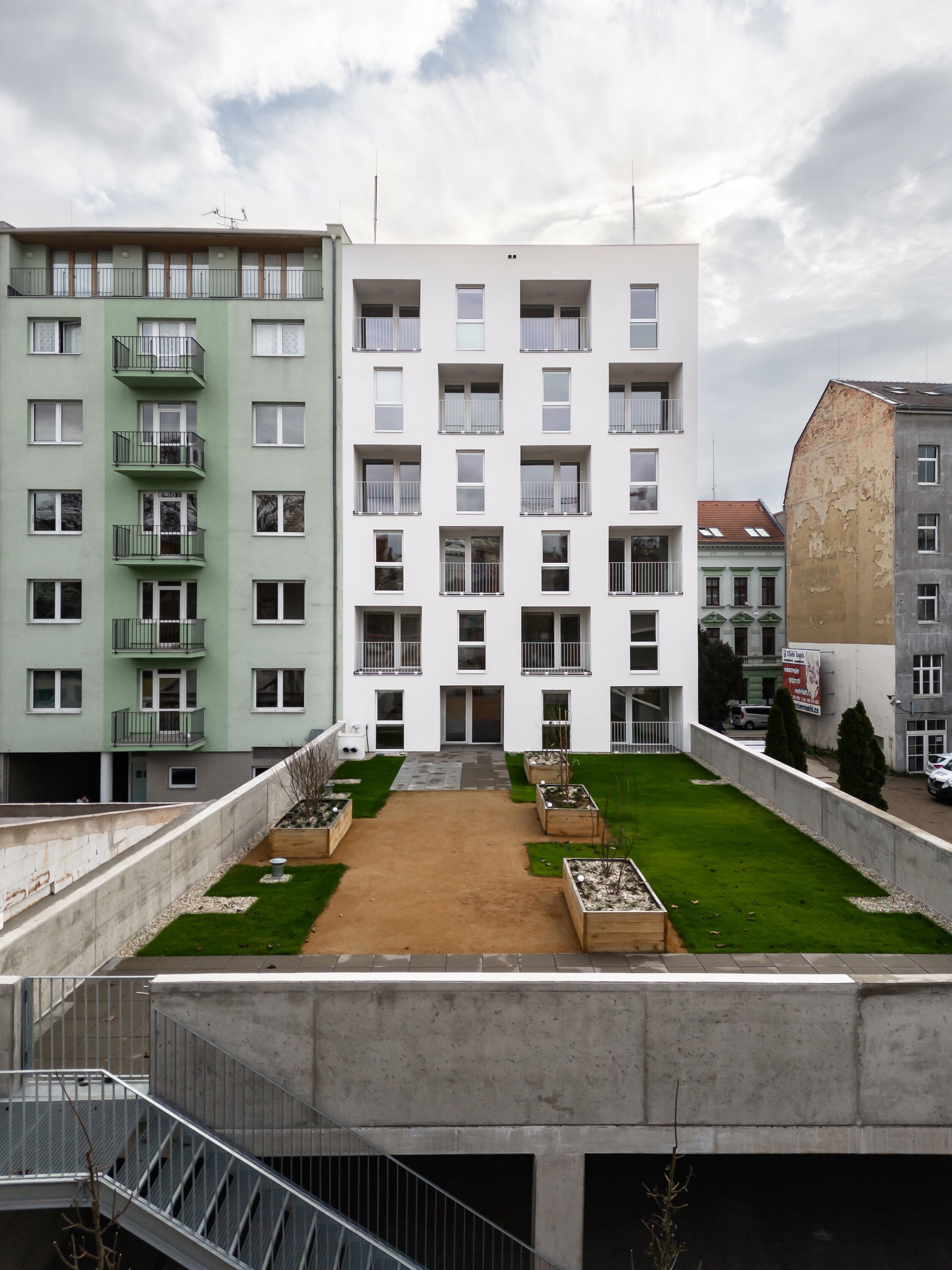 V ďalších piatich podlažiach sa nachádzajú bytové jednotky a veľkosťou 1kk a 2kk. Najväčšie jednotky, orientované do dvora, sú upravené na používanie osôb s obmedzenou možnosťou pohybu a orientácie.