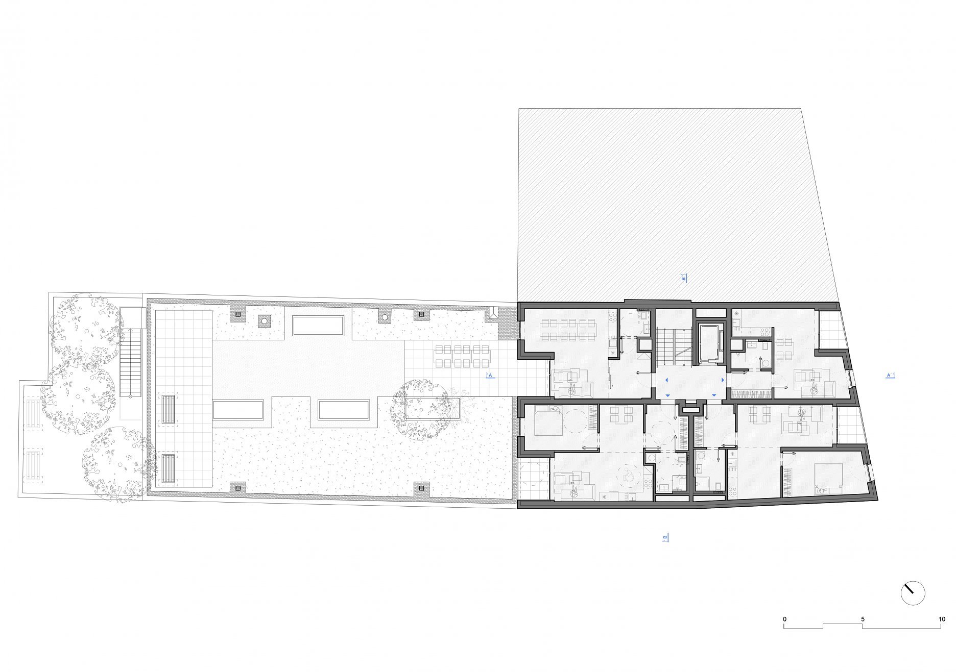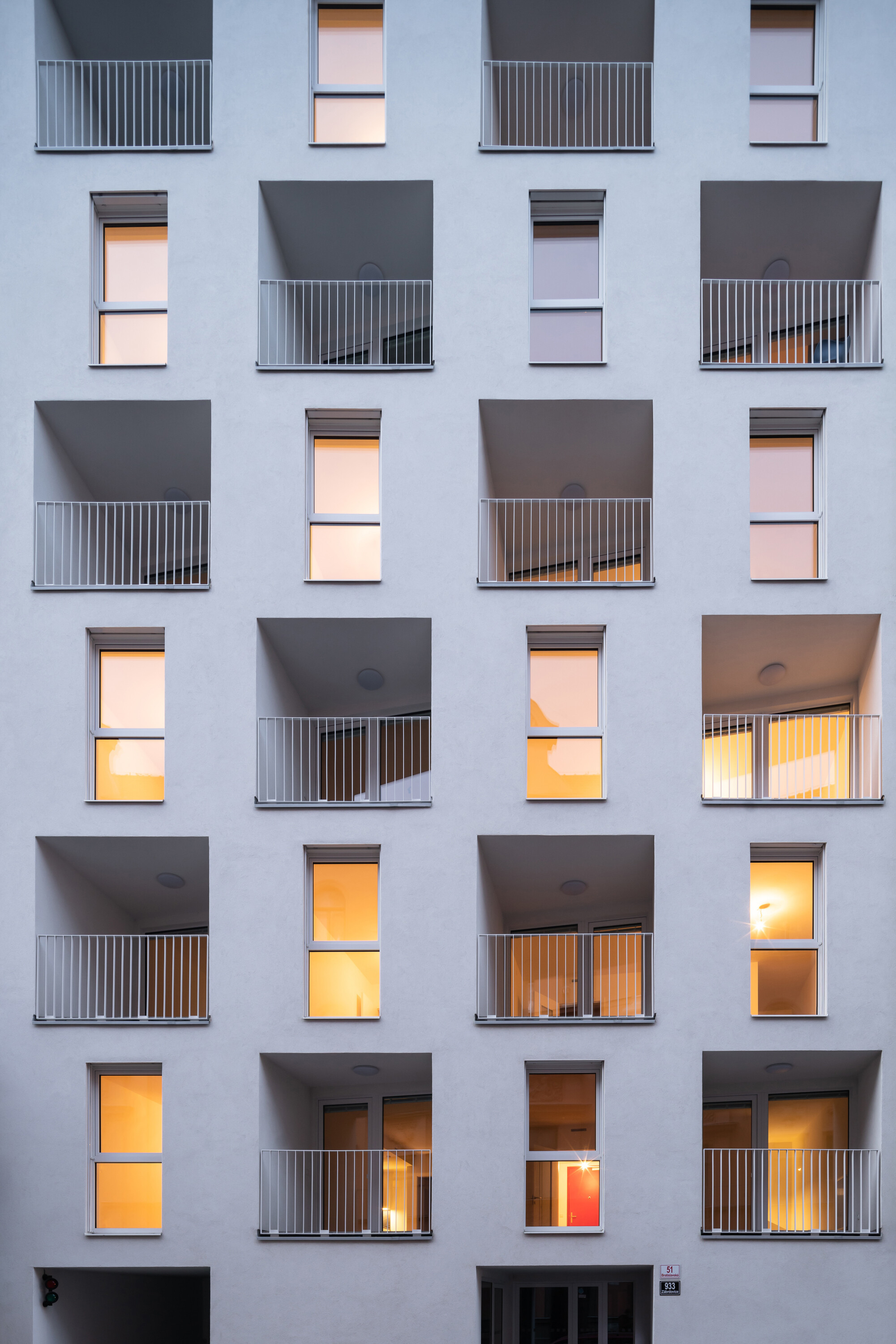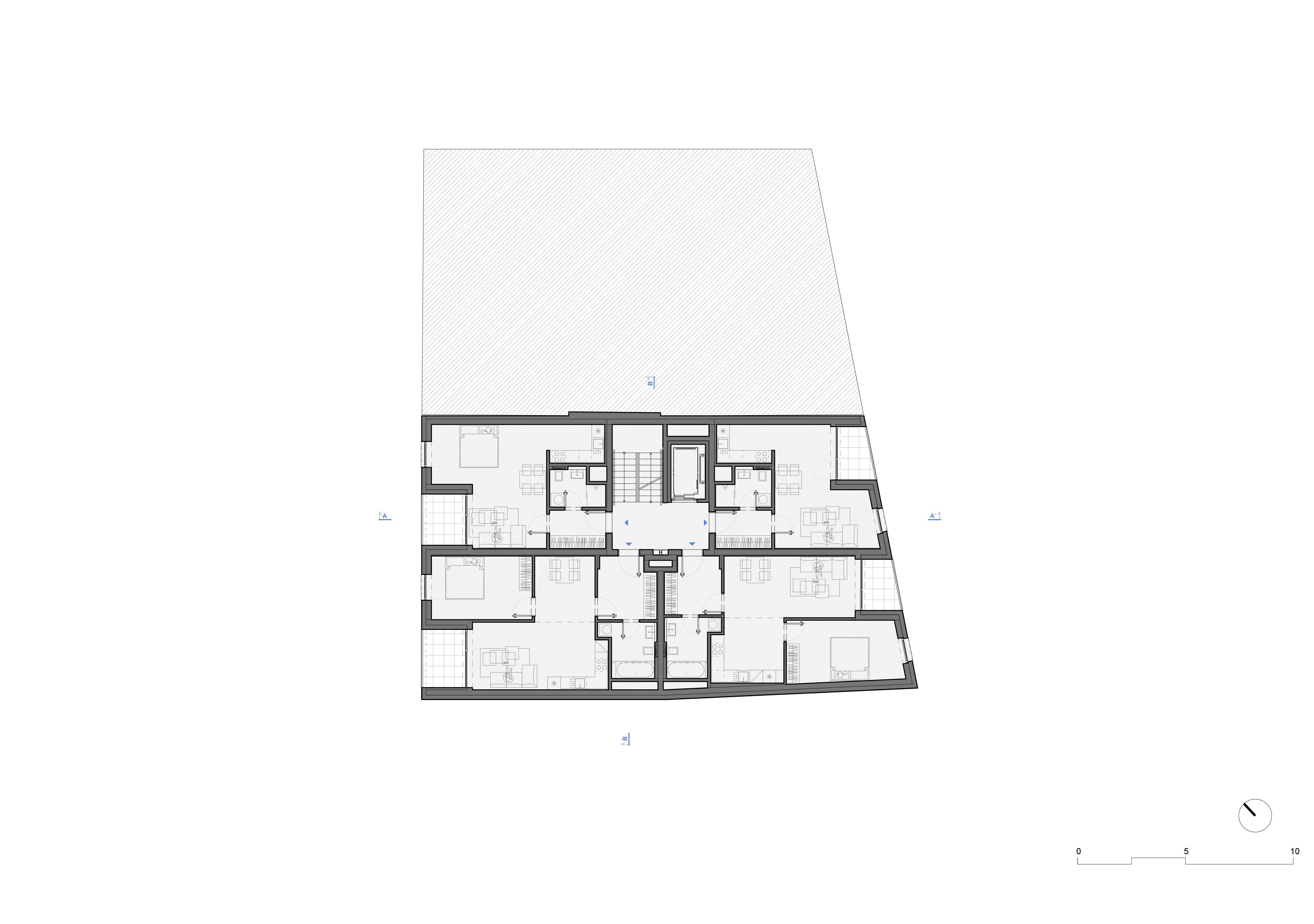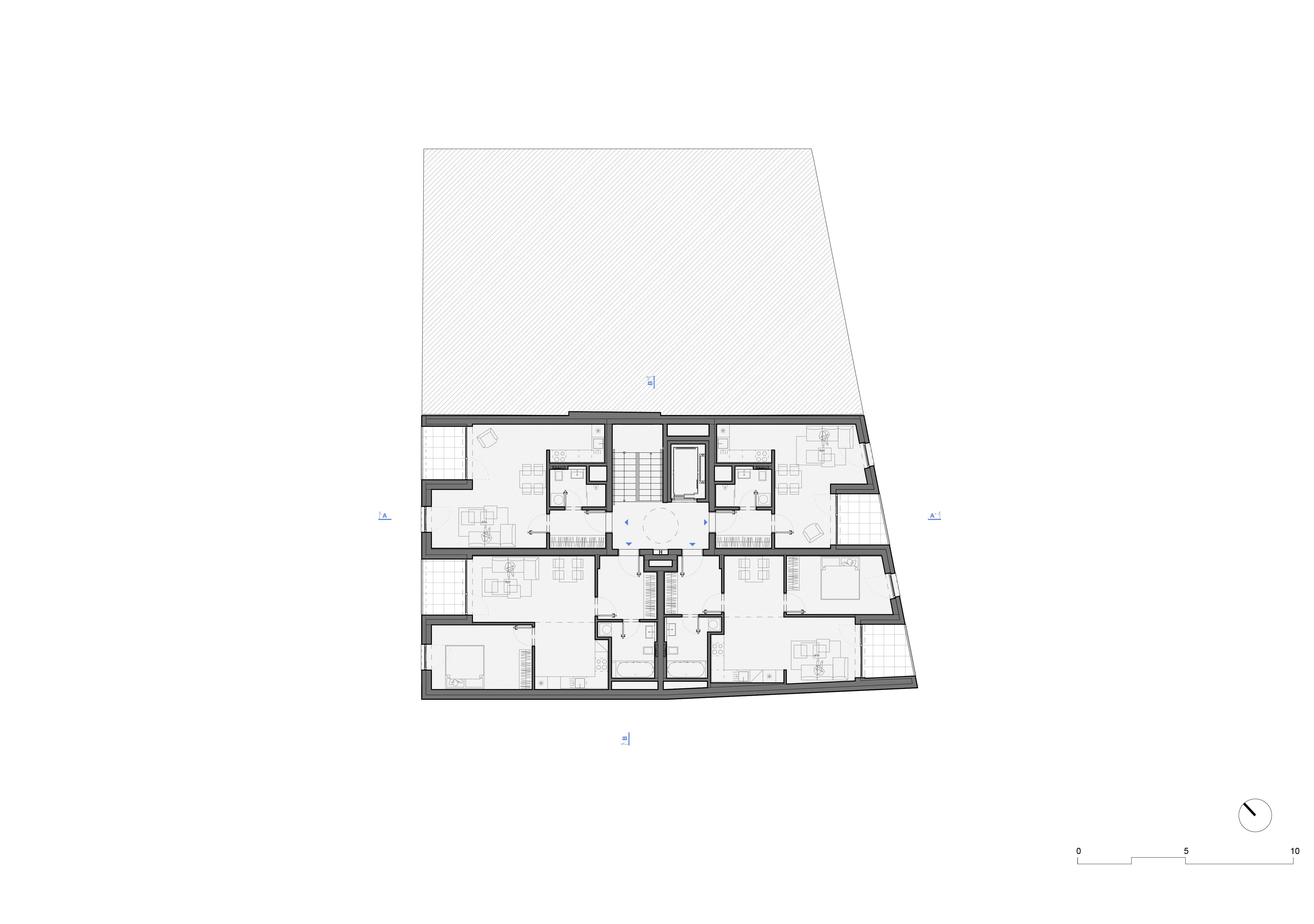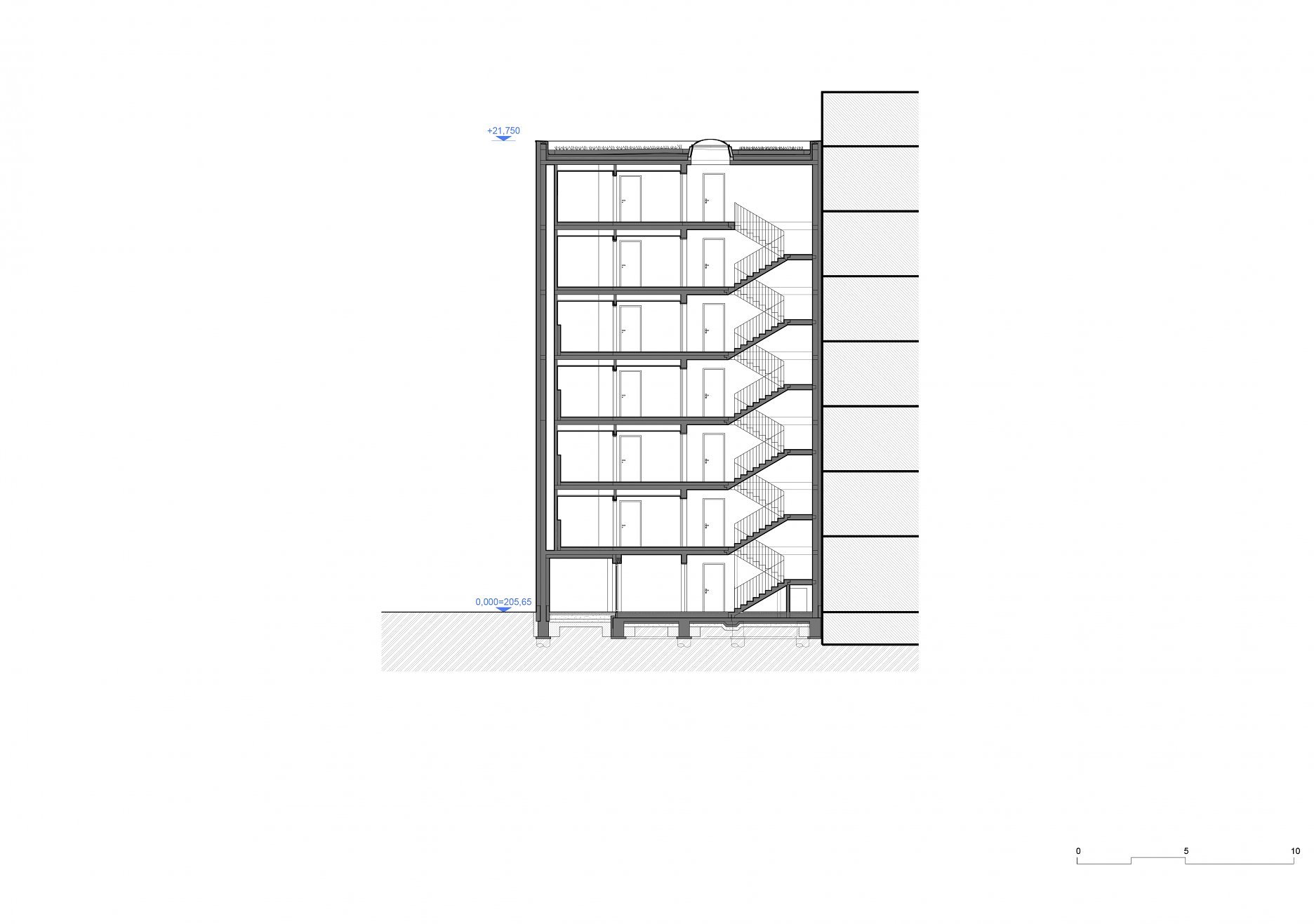 V ďalších piatich podlažiach sa nachádzajú bytové jednotky a veľkosťou 1kk a 2kk. Najväčšie jednotky, orientované do dvora, sú upravené na používanie osôb s obmedzenou možnosťou pohybu a orientácie.