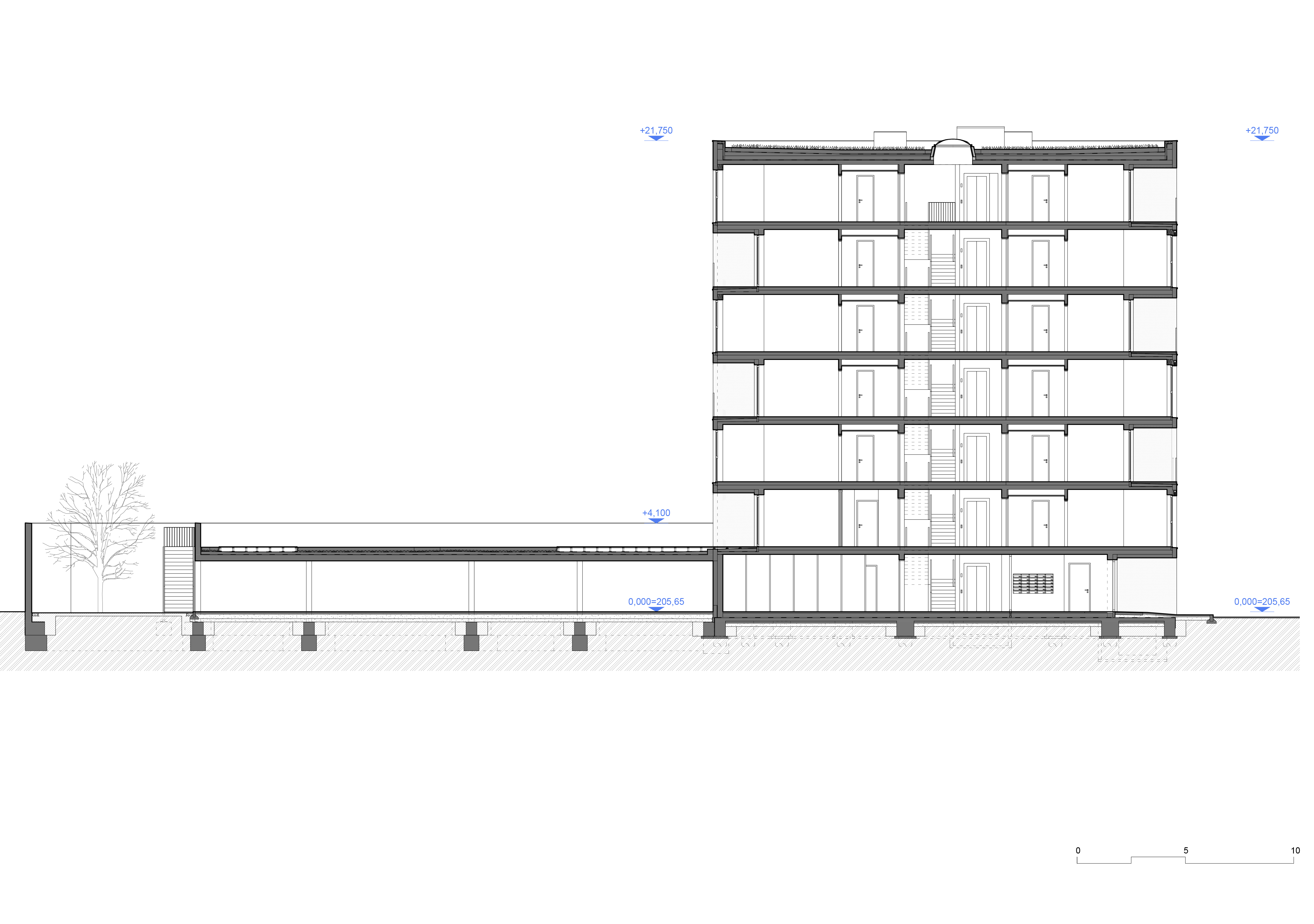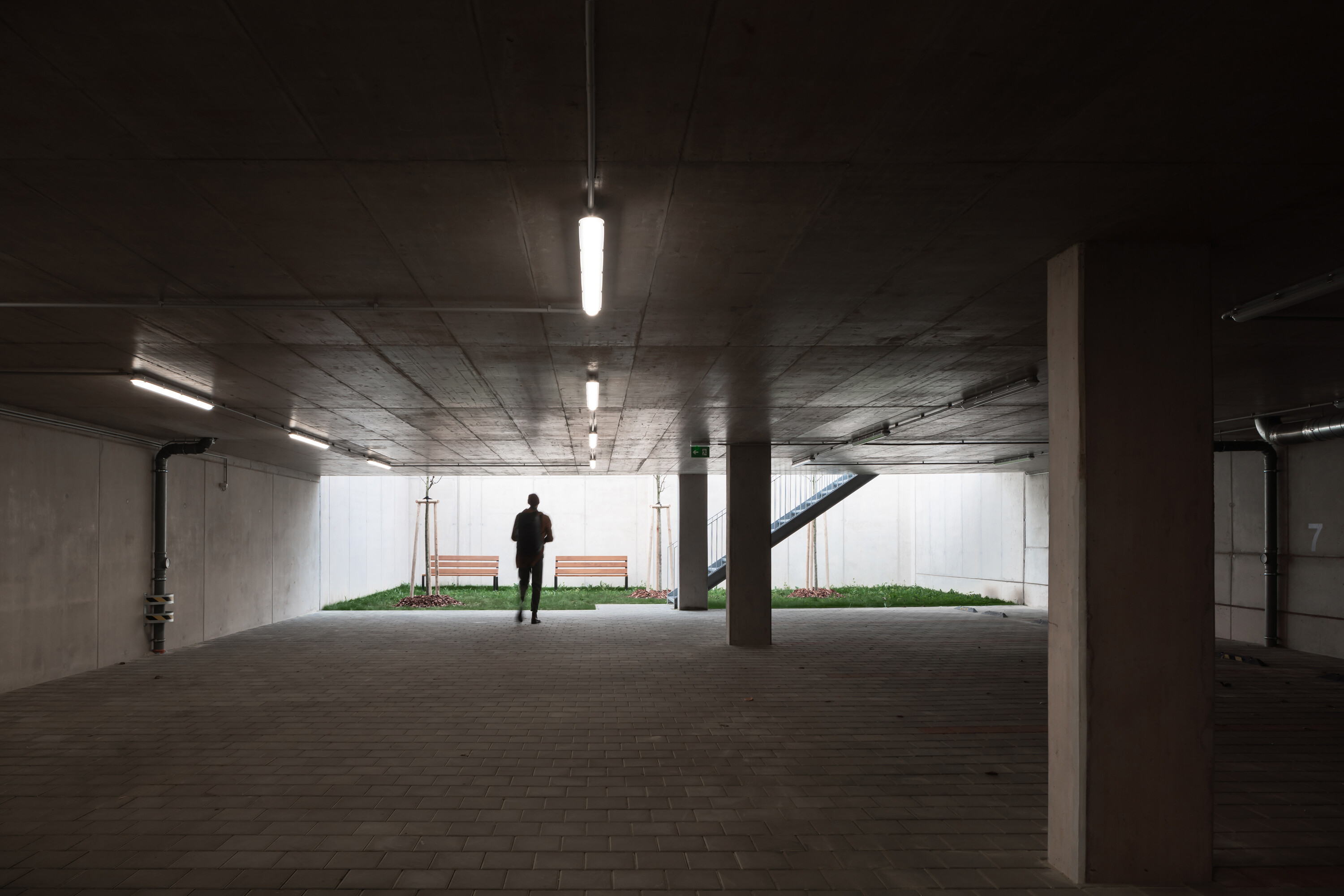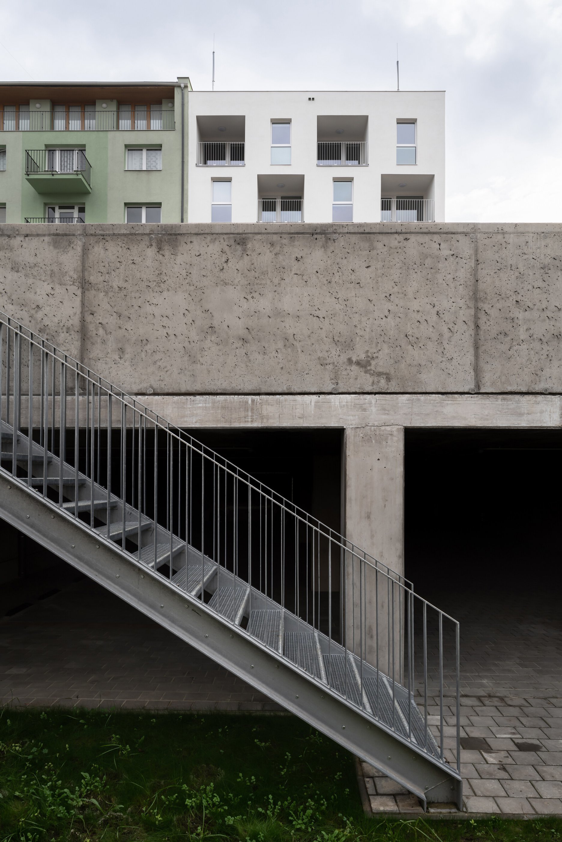 Na prízemí budovy, s hlavným vstupom orientovaným do ulice Bratislavská, je navrhnuté technické zázemie domu, kobky a nebytový priestor s hygienickým zázemím a dennou miestnosťou personálu. Dvorová časť na prízemí pojala garáž pre potreby obyvateľov domu s deviatimi parkovacími miestami.