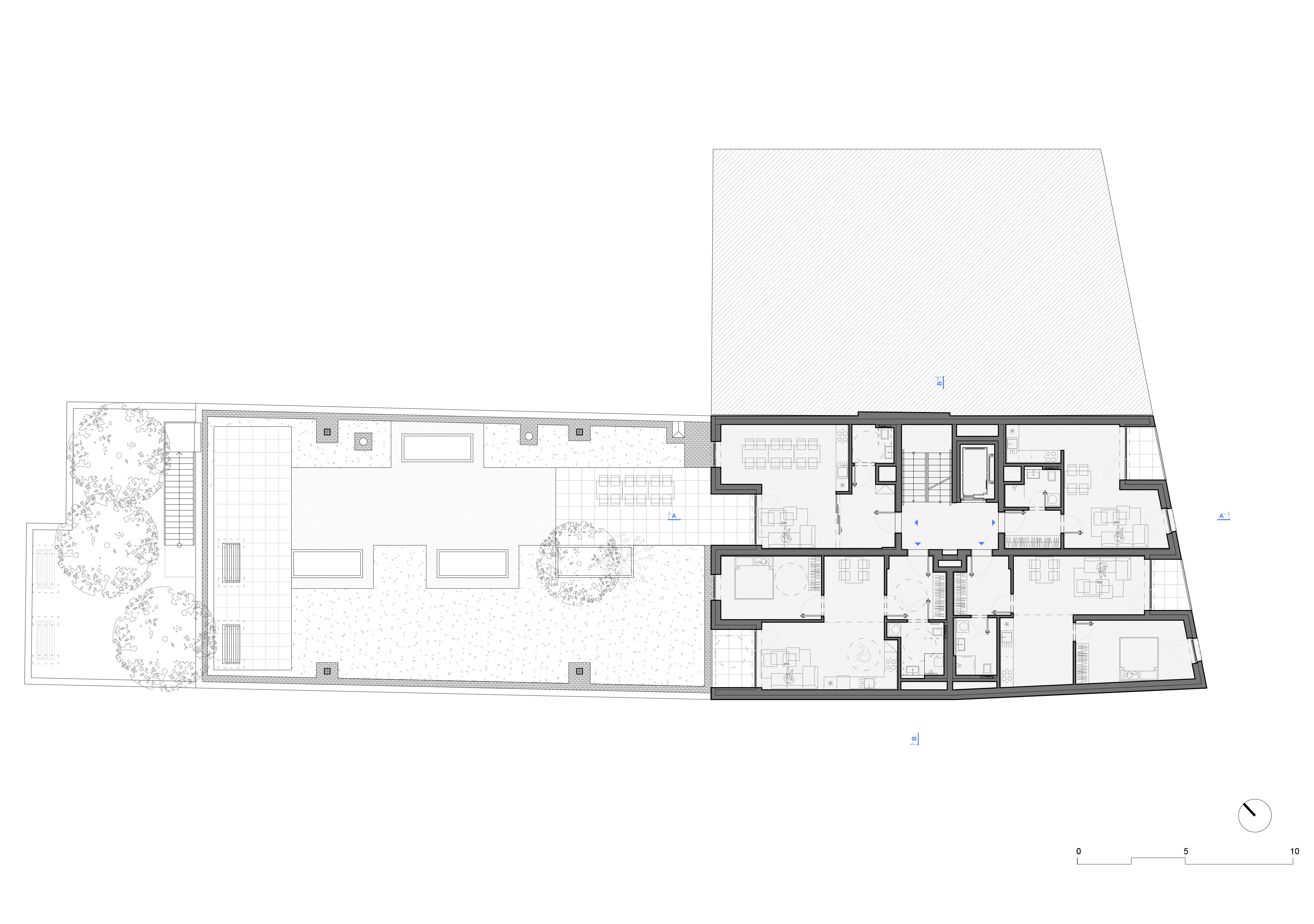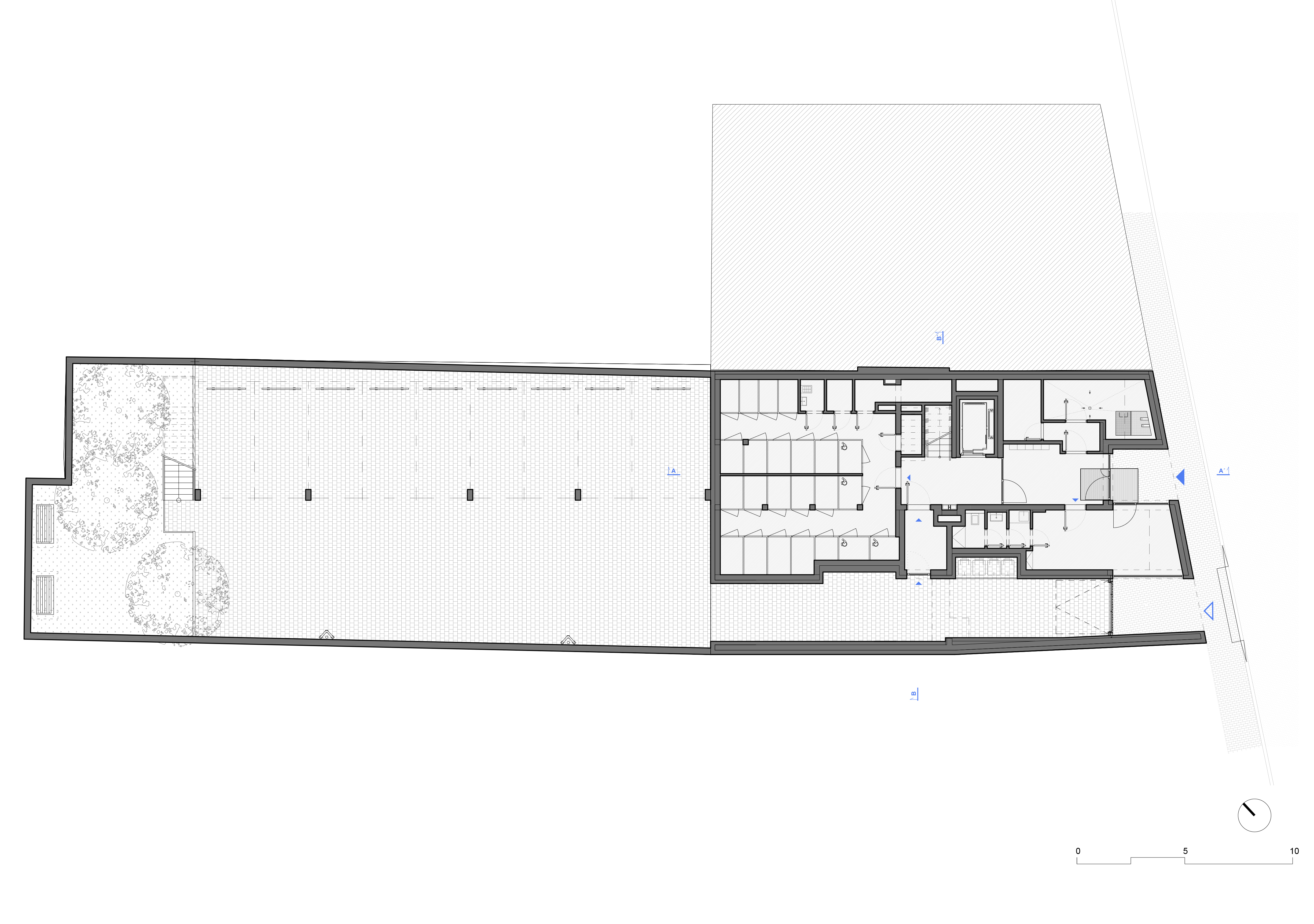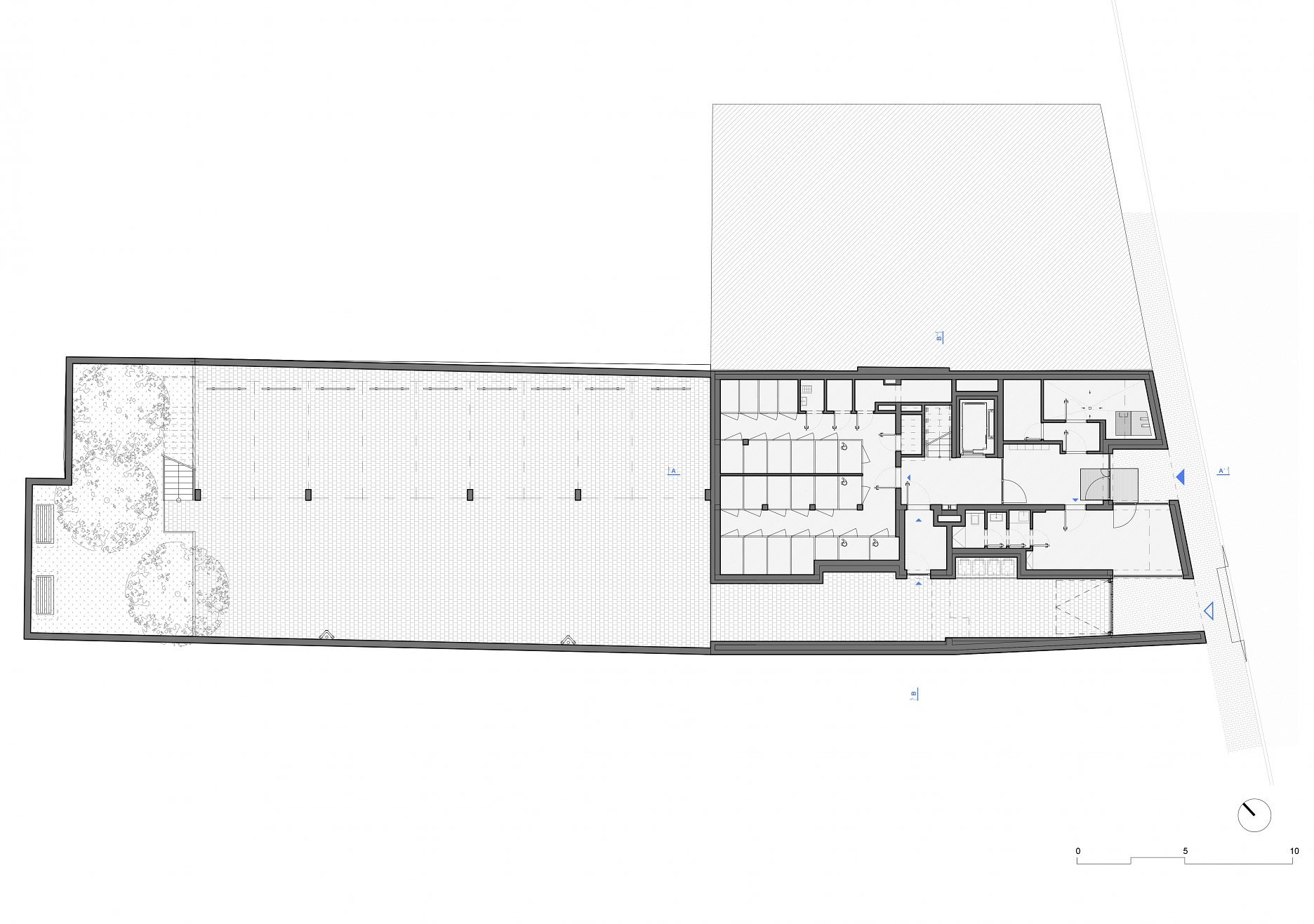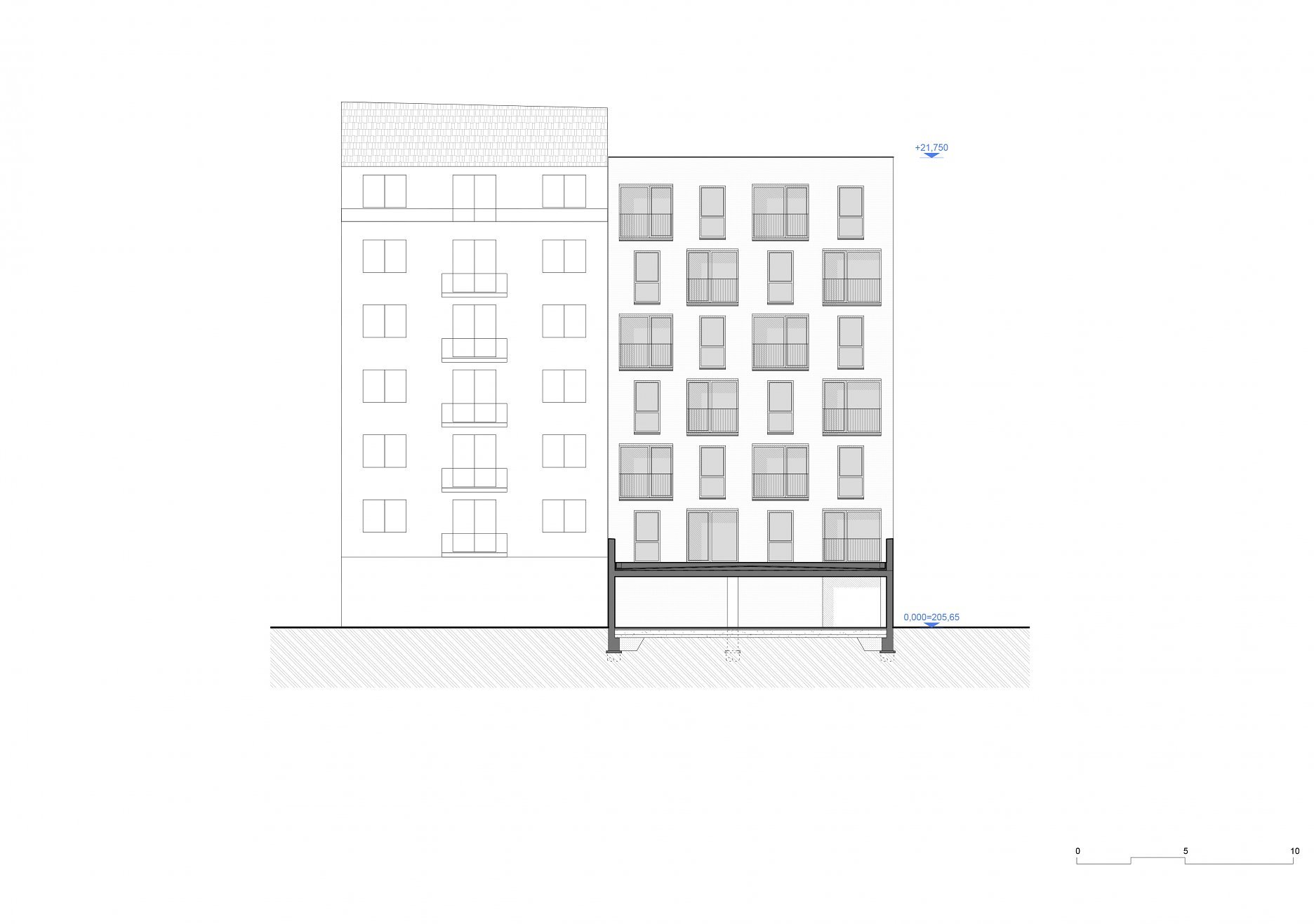 Na prízemí budovy, s hlavným vstupom orientovaným do ulice Bratislavská, je navrhnuté technické zázemie domu, kobky a nebytový priestor s hygienickým zázemím a dennou miestnosťou personálu. Dvorová časť na prízemí pojala garáž pre potreby obyvateľov domu s deviatimi parkovacími miestami.